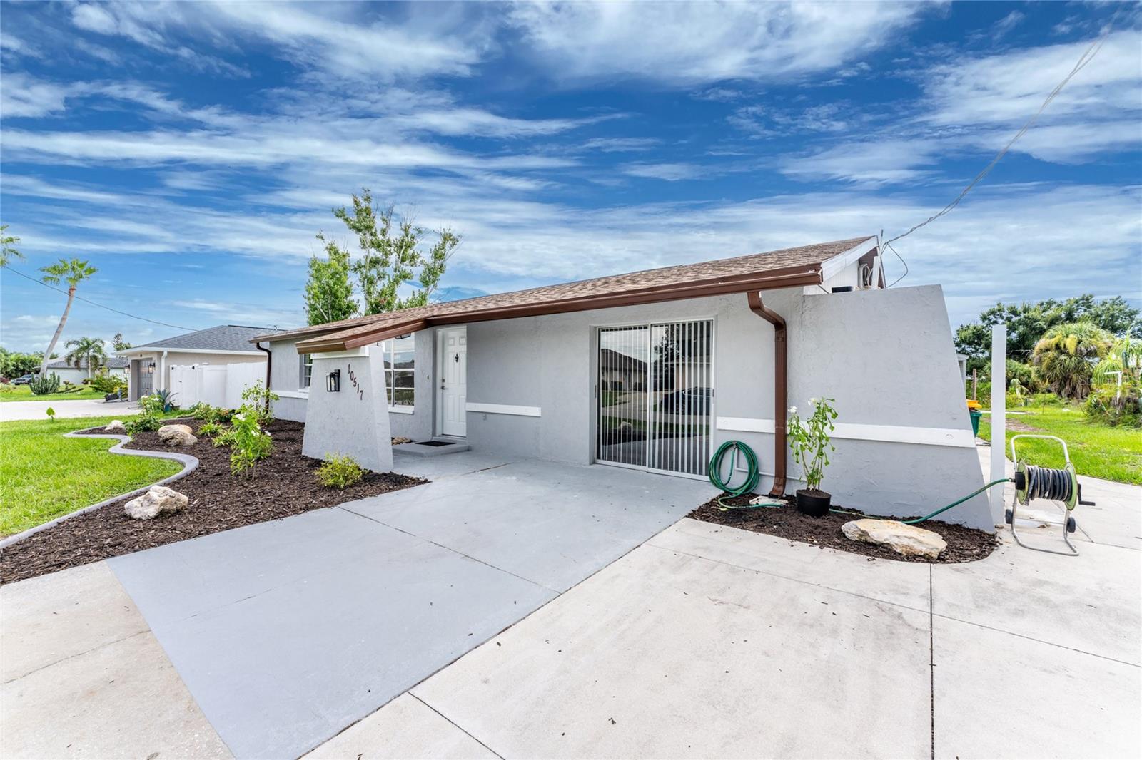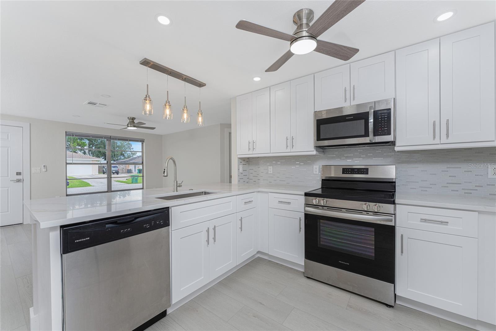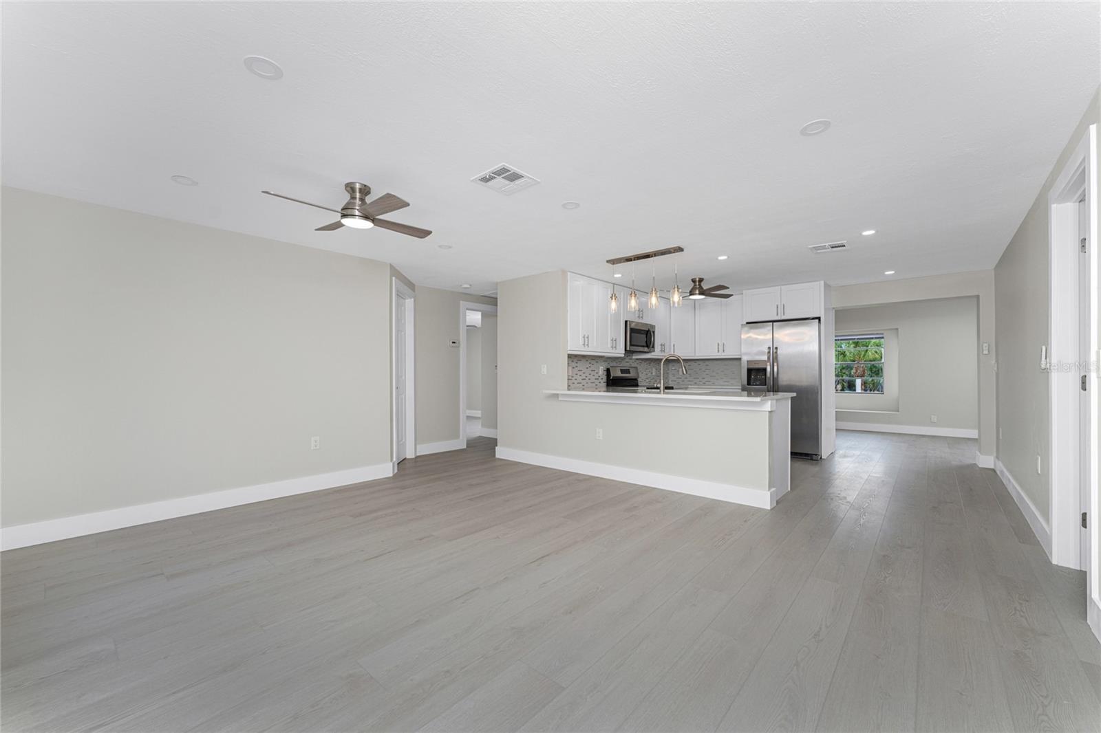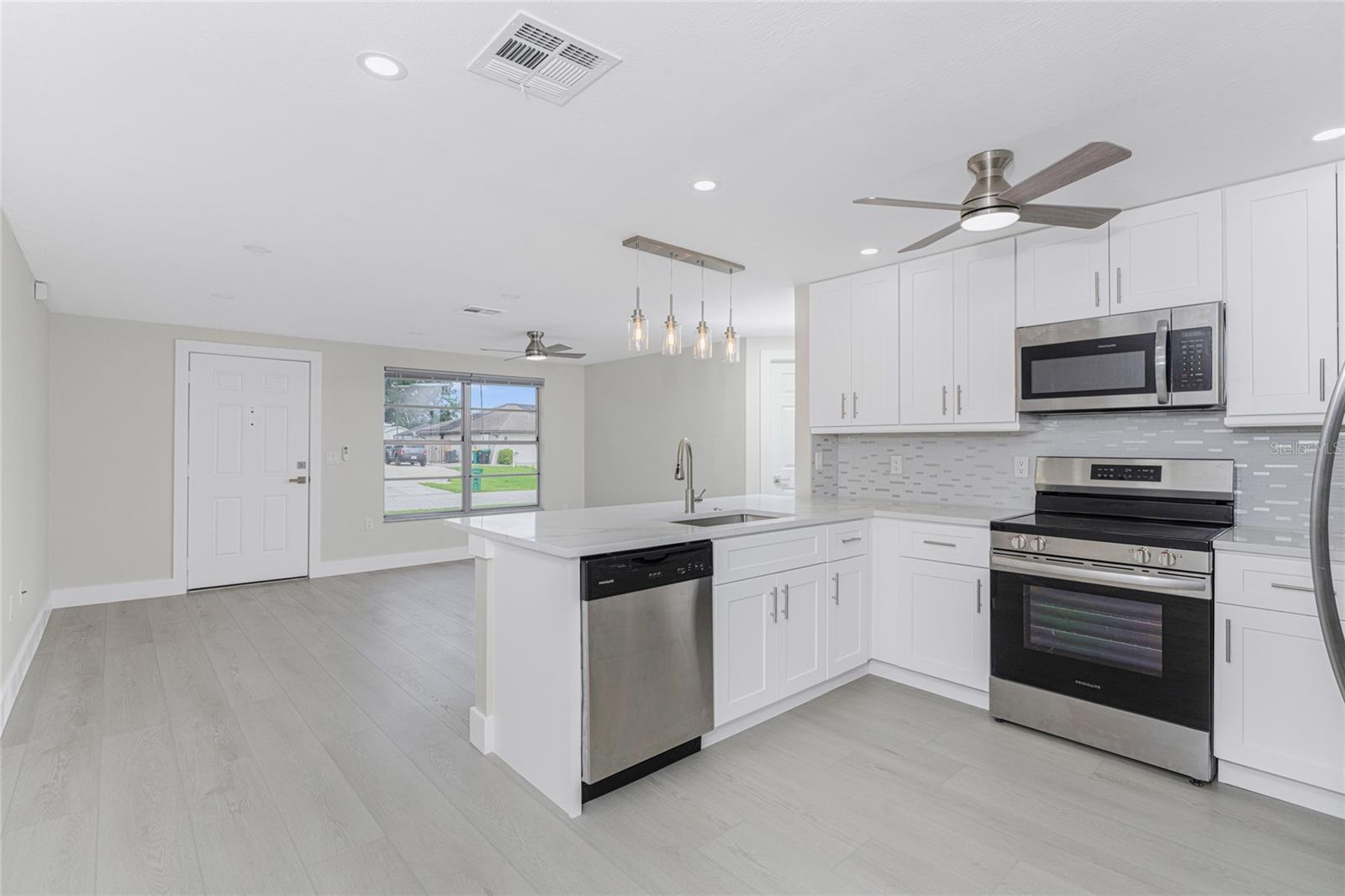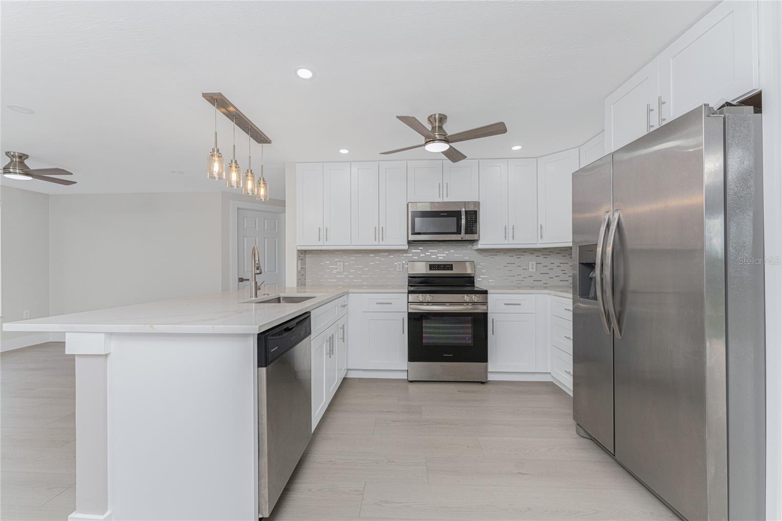 One or more photo(s) has been virtually staged. Beautifully remodeled 3bed/2bath home with split floor plan and dedicated owners suite that is NOT IN A FLOOD ZONE! This home has been completely renovated; new shaker kitchen cabinets, appliances and gorgeous quartz counter tops. Both bathrooms remodeled with new vanities, quartz countertops, porcelain tile and plenty of lighting. Inside laudry room with washer and dryer. Pull down stairs with attic storage. Entire home has freshly installed luxury vinyl flooring, paint, baseboards and recessed lighting. Large bonus room leads out to your expansive backyard where you can enjoy a gazebo and huge shed. Walk out to your new dock overlooking a freshwater canal where you can launch a kayak, fish or just relax and take in the peace and quiet. New exterior paint and vinyl siding complete the lushly landscaped yard. Plenty of parking for 4 vehicles. This home is turnkey ready. Come and experience the finest in florida living!