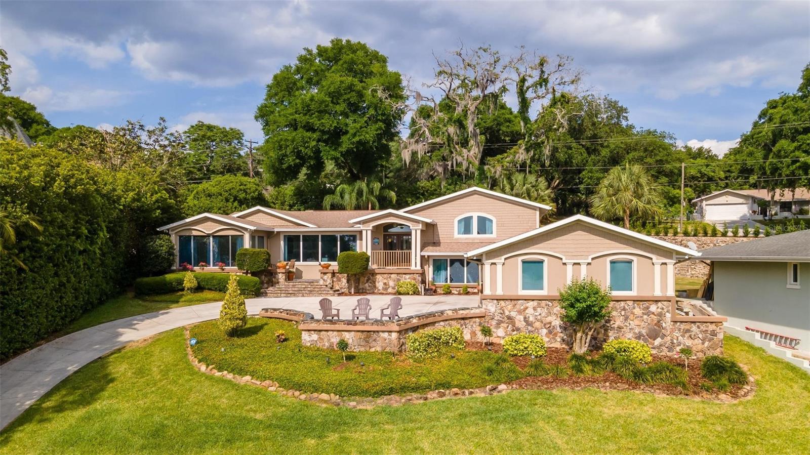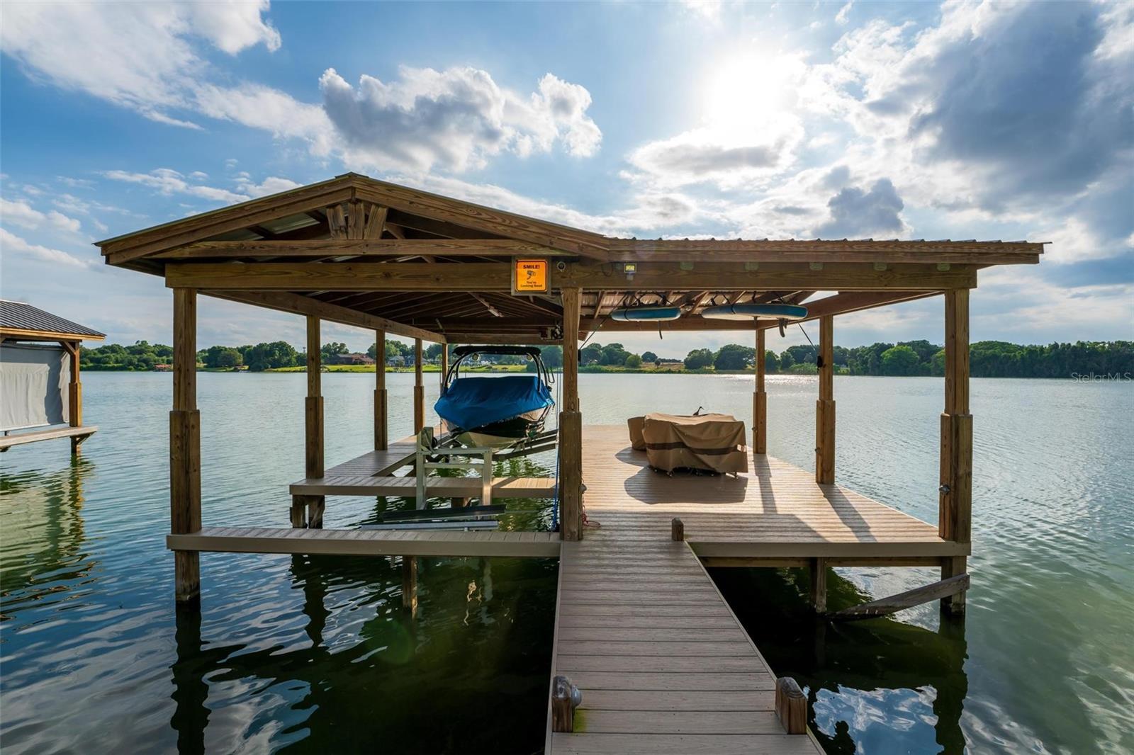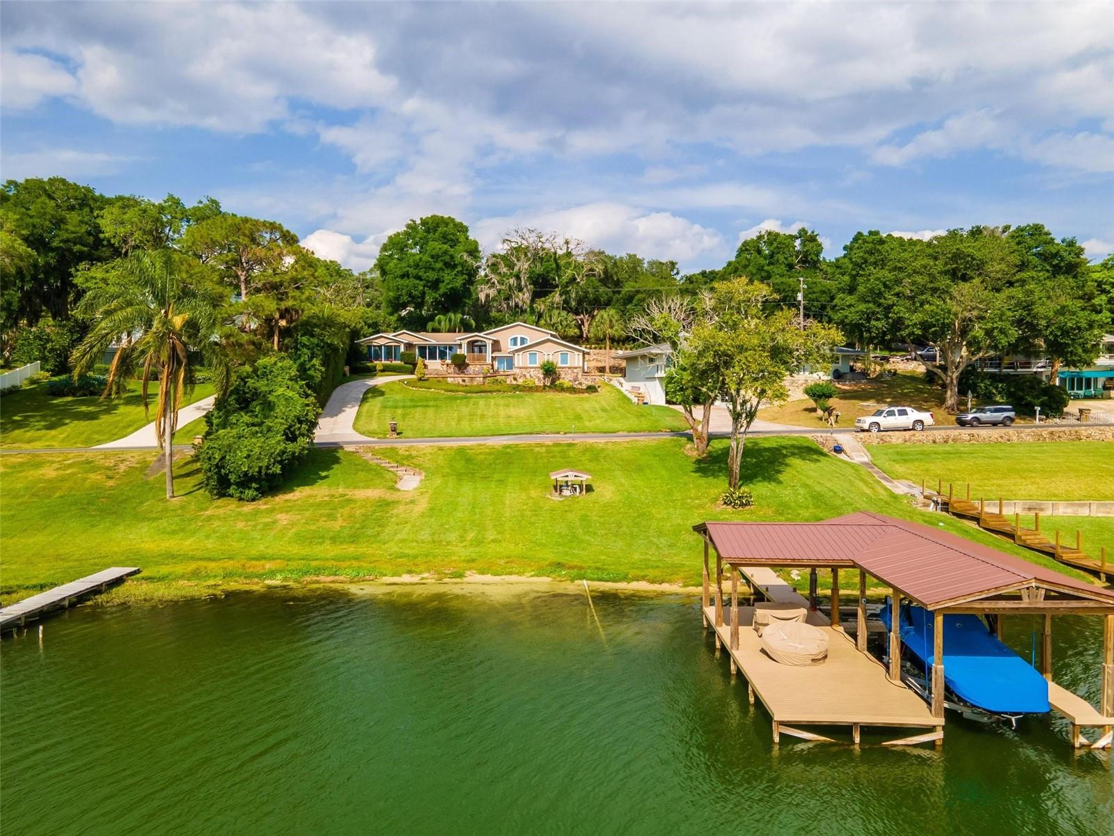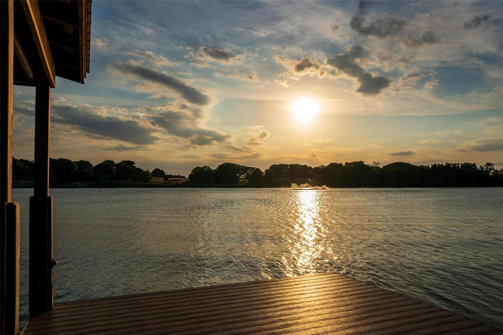 Indulge in the ultimate lakefront lifestyle with this exquisite home featuring private access to the spring-fed East Crooked Lake, known for its pristine waters and breathtaking sunsets. A newer, expansive dock built with the premium WearDeck product and equipped with boat and jet ski lifts invites you to fully enjoy all that East Crooked Lake has to offer. Step onto the patio with breathtaking lake views, perfect for gatherings and soaking in the natural beauty that surrounds you. Inside, the primary suite offers a large sitting room with stunning lake views, a custom walk-in closet with expansive built in storage, and a spacious bathroom with a jetted garden tub. Additionally, this home features 3 more bedrooms complete with on-suite bathrooms. The main floor welcomes you with an open layout, showcasing a spacious living room adorned with large windows to capture the lake views, and a well-equipped kitchen featuring wood cabinets, granite countertops, and modern appliances. Adjacent, a cozy breakfast room and den, warmed by a wood-burning fireplace, offer a serene retreat. Downstairs, level with the garage and offering a private entrance, discover a generous den, convenient kitchen, and a private bedroom with its own en-suite bathroom, perfectly suited for guests or multi-generational living. Additional highlights include a spacious laundry room and ample storage throughout. The roomy 3-car garage includes a "hidden" 13 x 8 air-conditioned storage room, perfect for storing belongings in a climate-controlled environment. Situated in a sought after neighborhood, you'll be just minutes away from downtown Eustis and Mount Dora, providing numerous shopping, dining, and entertainment choices. This home not only promises luxurious living but also offers practicality and comfort in every detail, making it a perfect retreat for enjoying lakefront living at its best.