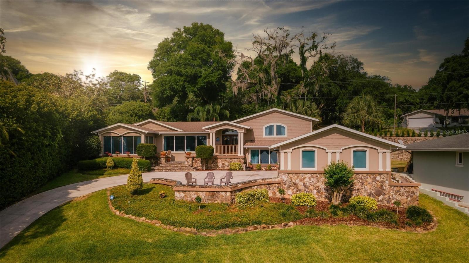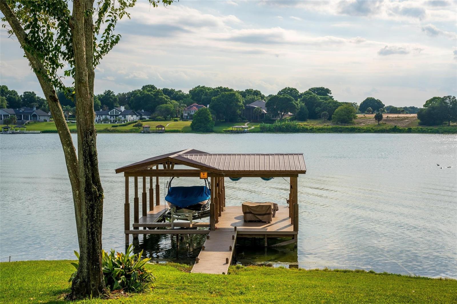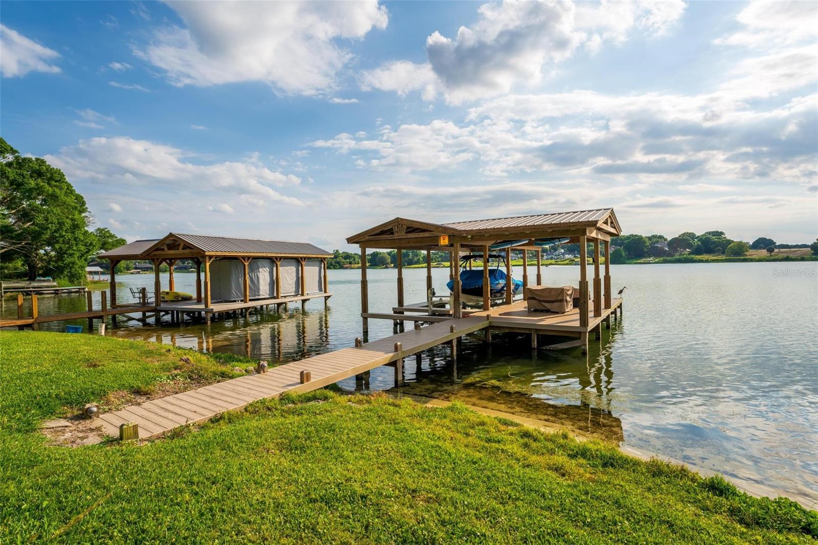 Indulge in the ultimate lakefront lifestyle with this exquisite home featuring private access to the spring-fed East Crooked Lake, known for its pristine waters and breathtaking sunsets. A newer, expansive dock built with the premium WearDeck product and equipped with boat and jet ski lifts invites you to fully enjoy all that East Crooked Lake has to offer. Step onto the patio with breathtaking lake views, perfect for gatherings and soaking in the natural beauty that surrounds you. Inside, the primary suite offers a large sitting room with stunning lake views, a custom walk-in closet with expansive built in storage, and a spacious bathroom with a jetted garden tub. Additionally, this home features 3 more bedrooms complete with on-suite bathrooms. The main floor welcomes you with an open layout, showcasing a spacious living room adorned with large windows to capture the lake views, and a well-equipped kitchen featuring wood cabinets, granite countertops, and modern appliances. Adjacent, a cozy breakfast room and den, warmed by a wood-burning fireplace, offer a serene retreat. Downstairs, level with the garage and offering a private entrance, discover a generous den, convenient kitchen, and a private bedroom with its own en-suite bathroom, perfectly suited for guests or multi-generational living. Additional highlights include a spacious laundry room and ample storage throughout. The roomy 3-car garage includes a "hidden" 13 x 8 air-conditioned storage room, perfect for storing belongings in a climate-controlled environment. Situated in a sought after neighborhood, you'll be just minutes away from downtown Eustis and Mount Dora, providing numerous shopping, dining, and entertainment choices. This home not only promises luxurious living but also offers practicality and comfort in every detail, making it a perfect retreat for enjoying lakefront living at its best.