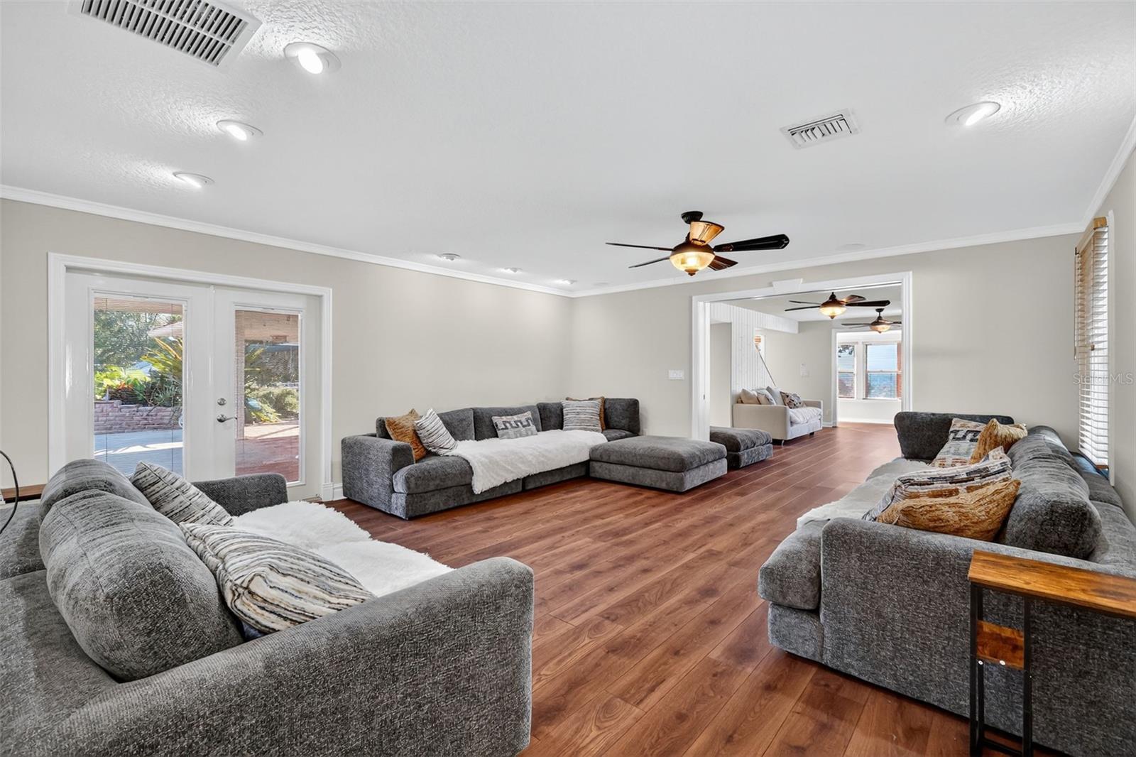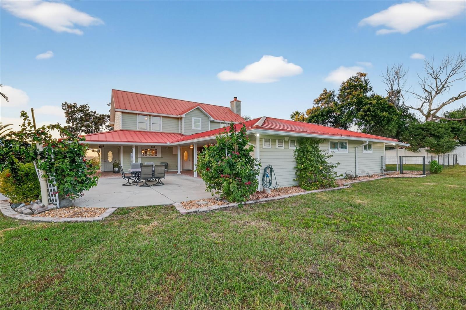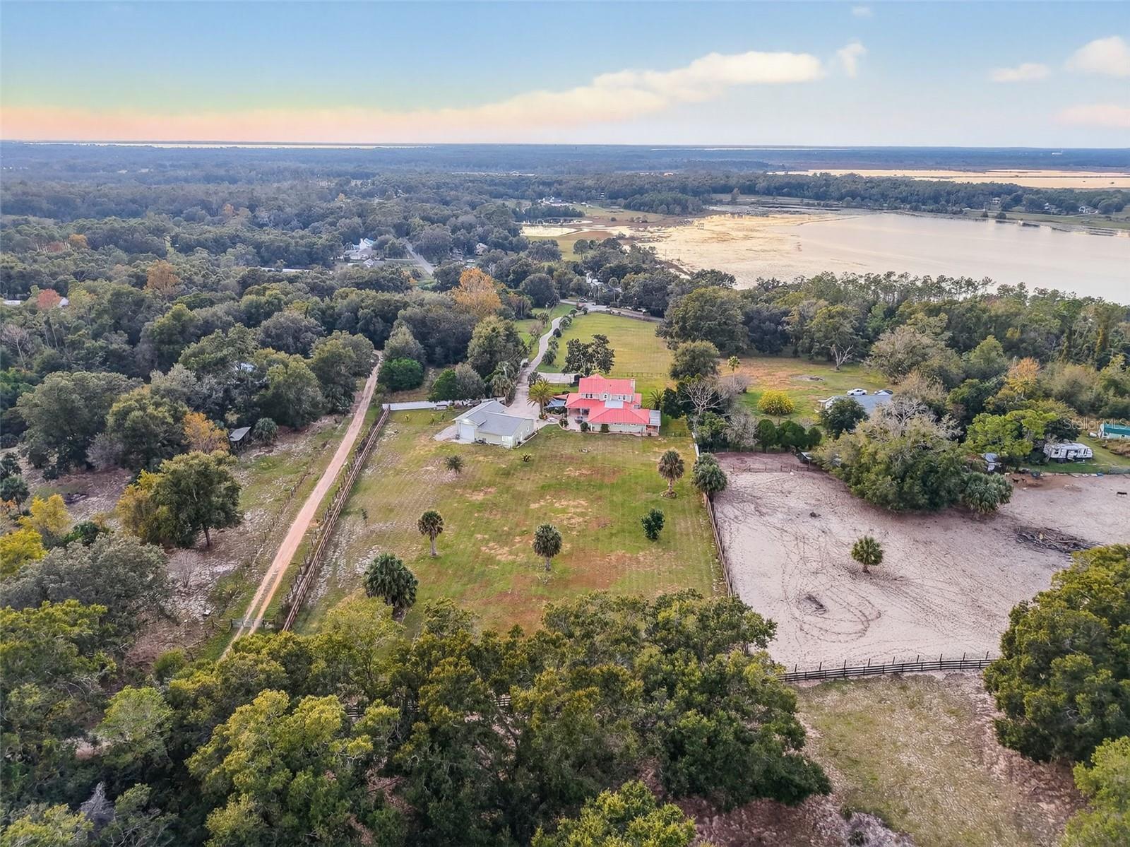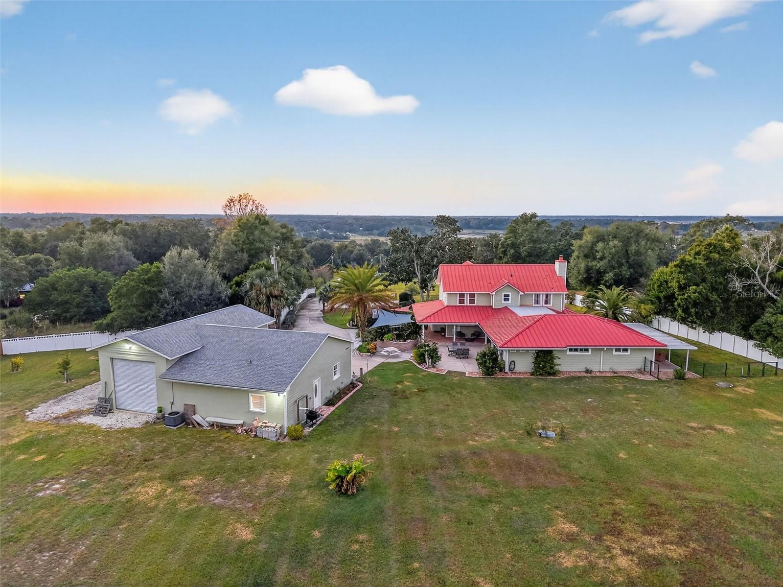 Nestled on 4+ fully fenced & cross-fenced acres, this custom-built retreat offers over 3,460 sq ft of refined living. Five spacious bedrooms and 3.5 baths provide a flexible floor plan tailored for multigenerational living. This is a tranquil estate where every detail has been thoughtfully designed for lifestyle, comfort, and versatility. As you enter the property, you’re greeted by a charming, covered garden bench and a private drive that winds its way toward the home. A quaint walkway lined with lush landscaping and a bubbling fountain creates a warm, inviting path to the front door. Brick-lined covered porches overlook the private yard and a storybook footbridge that crosses a beautiful koi pond. The outdoor space is ideal for entertaining, featuring a well-appointed kitchenette and BBQ area with commercial-grade venting—perfect for enjoying the very best of outdoor cooking. Step inside this thoughtfully designed home featuring luxury vinyl flooring and light-filled rooms, including a living room with a wood-burning fireplace. The front sitting area is perfect for watching sunsets or enjoying views of the beautiful grounds. The well-equipped kitchen boasts Corian countertops, stainless steel appliances, a built-in oven, ceramic cooktop, breakfast bar, walk-in pantry and a pass-through window to porch- great for entertaining. The dining area features bay windows overlooking the front yard. The cozy family room connects to the primary suite and offers French doors leading to the porch, creating a seamless indoor-outdoor living experience. The spacious primary suite is a private haven, featuring French doors that open to the porch. The luxurious primary bathroom boasts a clawfoot tub, double vanity, a large glass enclosed no-step walk-in shower, a private water closet, a walk-in closet, and a door leading to a private patio with a fenced dog run. The main floor also provides a half bath, laundry room with lots of cabinets space, utility sink, extra refrigerator, washer and dryer with door leading to side porch. Upstairs, four additional bedrooms and two nicely appointed baths- one of them ensuite- provide ample room for family or guests. The 1672 sq foot detached garage is a true standout. A portion is sectioned off with commercial grade floor to ceiling storage shelves, 12×10 roll-up doors on both ends for easy drive through access, exterior RV parking pad with a 208 volt / 50 amp power hookup! Nearly 1000 square feet of the garage is a climate controlled versatile space with full bathroom and kitchenette. It could also be converted back to a traditional garage as the roll up doors on the inside are still in place. There is plumbing in place for outdoor shower, and the side yard offers a mini orchard with fruit trees. (Myer Lemon, Minneola Tangelo, Lime & Avocado). Situated on a gentle hill, this property captures gorgeous sunsets over Lake Eldorado and a peaceful ambiance. With 4 fenced acres there is plenty of room for additional buildings, vehicles, animals and gardens. There is also an additional rear entrance off County Road 44A for convenience. Located just minutes from downtown Eustis, Mount Dora, and Tavares, you're close to boutique shopping, lakeside dining, and Florida’s charming small-town culture. And you're less than an hour from Orlando International Airport, Winter Park, airports and major attractions. County taxes, well and septic save you money!