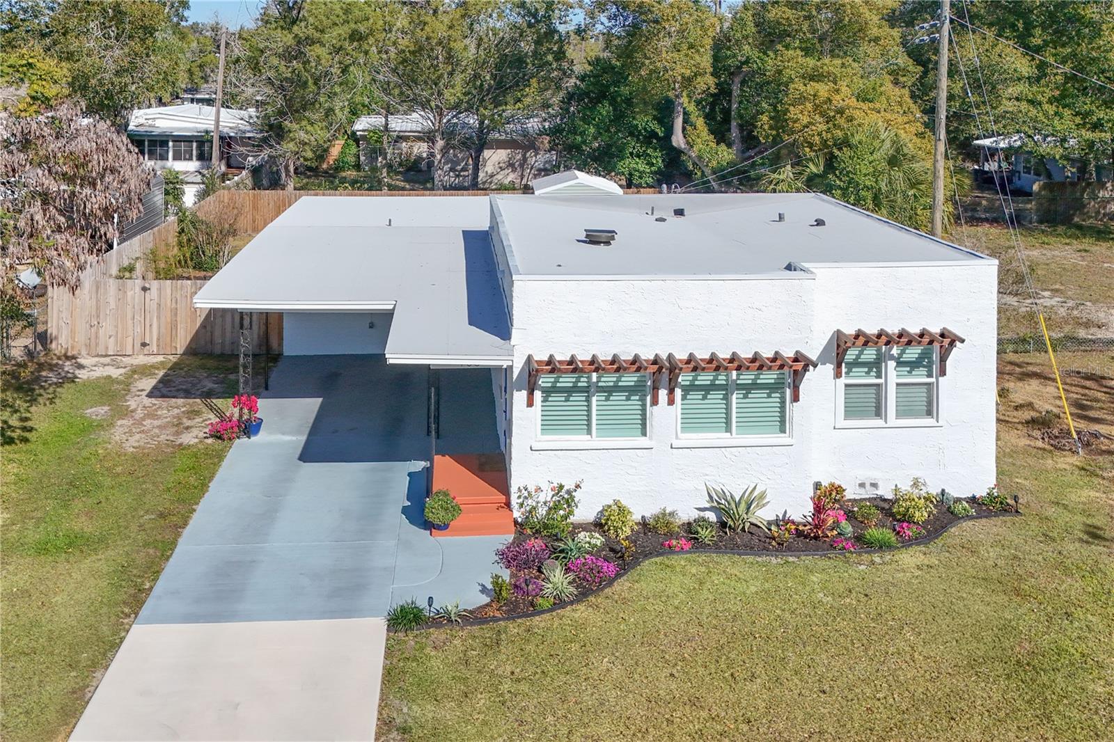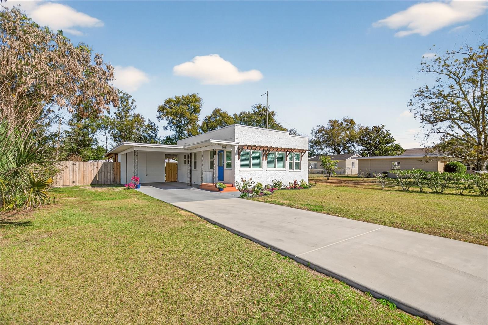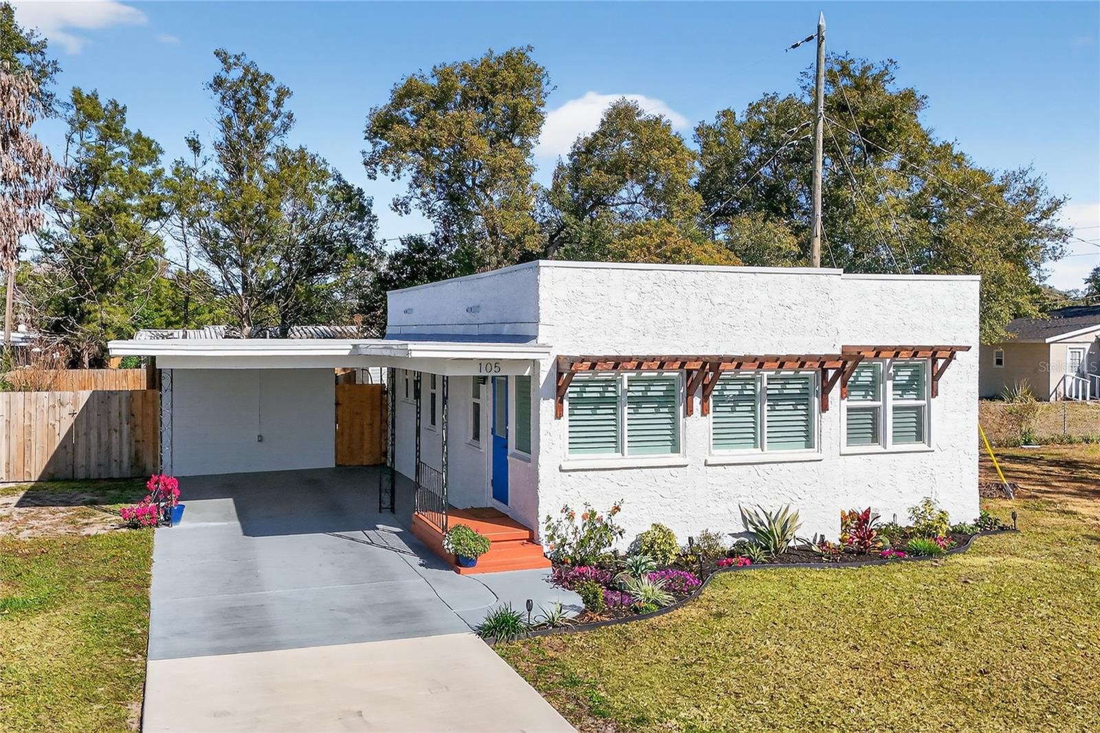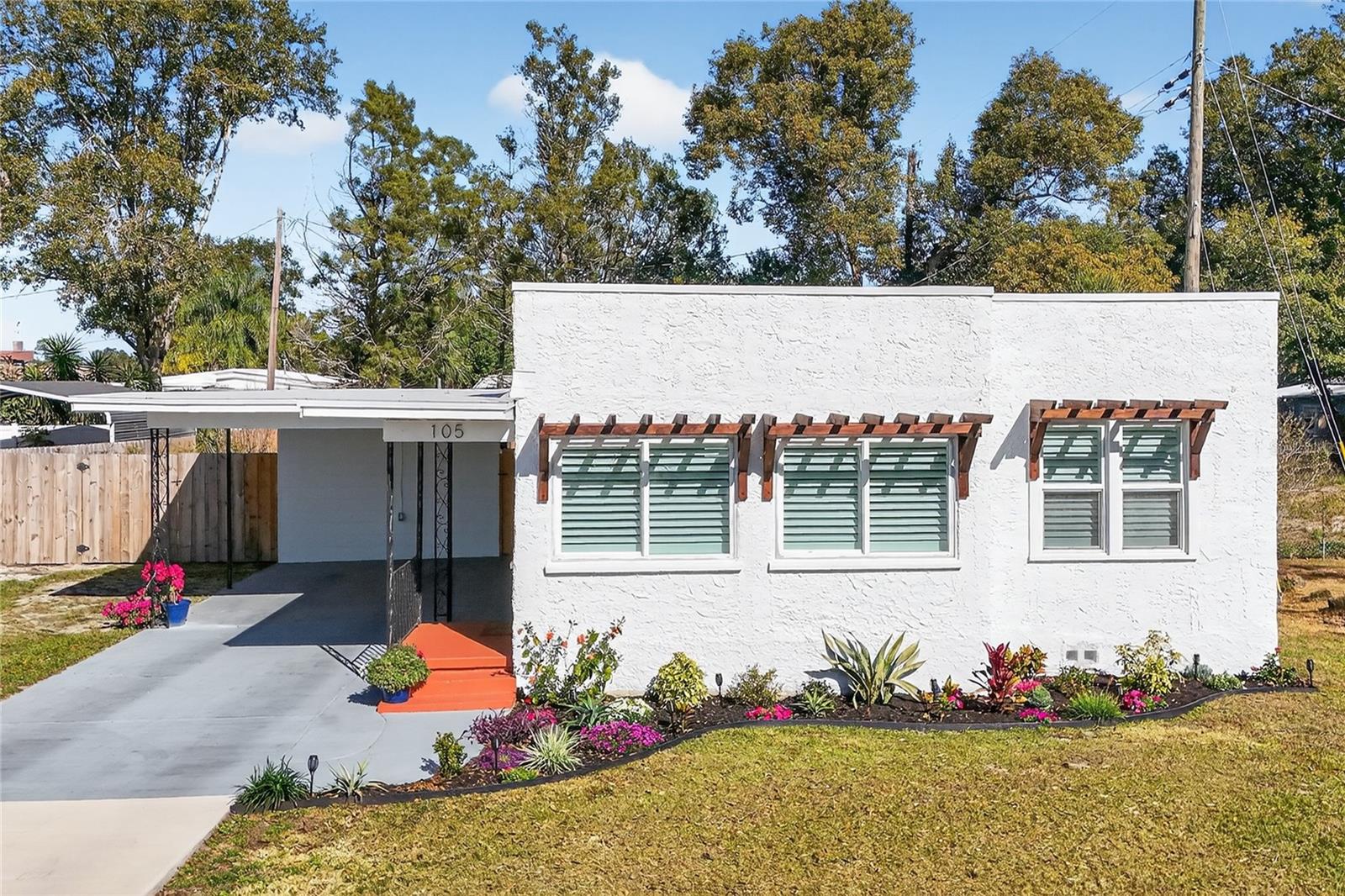 Nestled in the heart of Eustis, Florida, this charming 1935-built home beautifully blends historic character with thoughtful, modern renovations. Though modest in size, the home feels warm and refined, with every detail carefully updated to honor its original charm while offering today’s comforts. Inside, the renovation is evident throughout, complemented by elegant plantation shutters that add both style and light control while enhancing the home’s classic Florida appeal. Step outside to an impressive, fully covered 450-square-foot patio—an ideal extension of the living space. Designed for both relaxation and entertaining, the patio features a custom-built cypress wood table and bar. Crafted from durable cypress, these pieces are made to withstand the Florida climate and provide a timeless gathering place for years to come. The fenced backyard offers added versatility with a newly constructed 10 x 12-foot outbuilding, fully equipped with electricity—perfect for a workshop, studio, or extra storage. Out front, the charming, pristine landscaping adds the curb appeal that takes this property to the next level. Newly poured concrete enhances the beauty and functionality, while an additional concrete slab provides a convenient, dedicated area for discreet trash bin storage. Located in a peaceful, quiet neighborhood, the home offers a sense of calm and privacy while remaining just minutes from shopping, dining, medical facilities, and everyday conveniences. Altogether, this renovated 1935 home delivers historic charm, modern upgrades, exceptional outdoor living, and an ideal location in Eustis. Hurry to make your appointment because this one is really a sight to see. ROOF, HVAC, WATER HEATER, ELECTRICAL, GRANITE COUNTERTOPS and many more upgrades, all completed in 2024 and 2025.