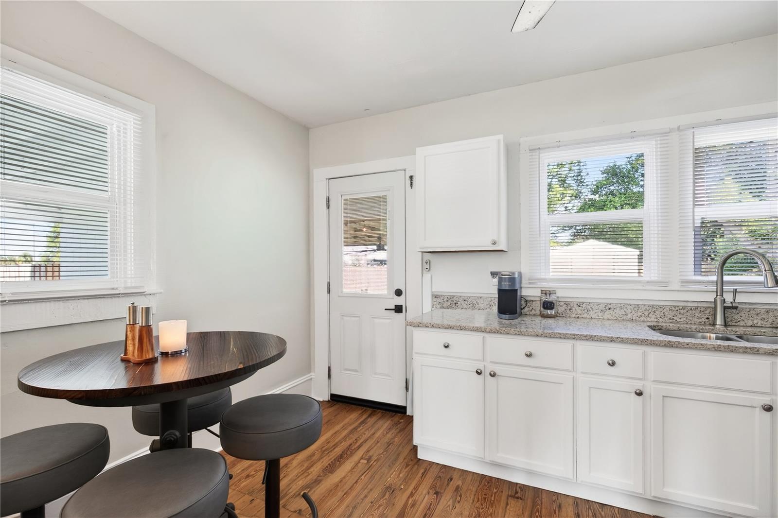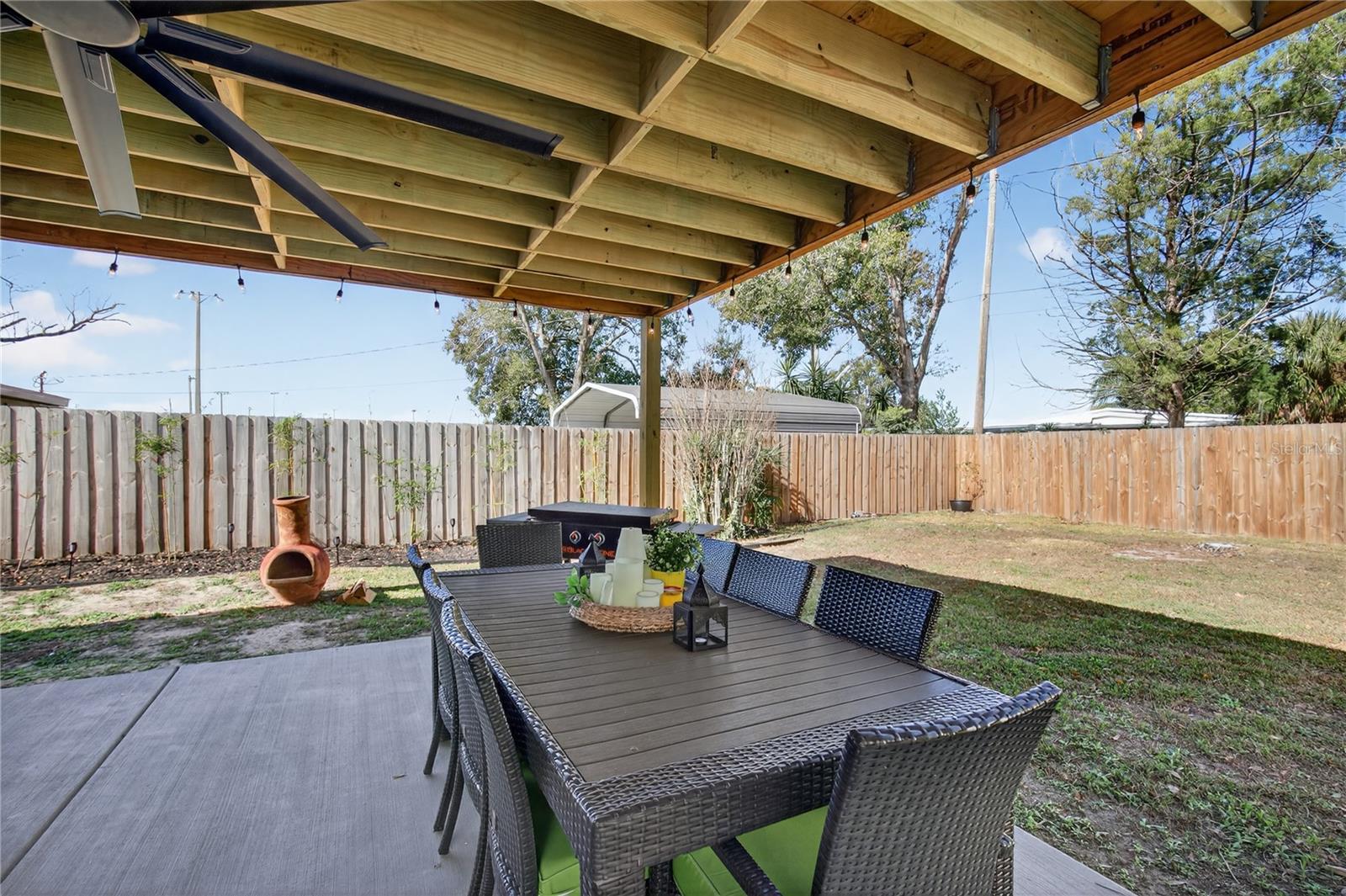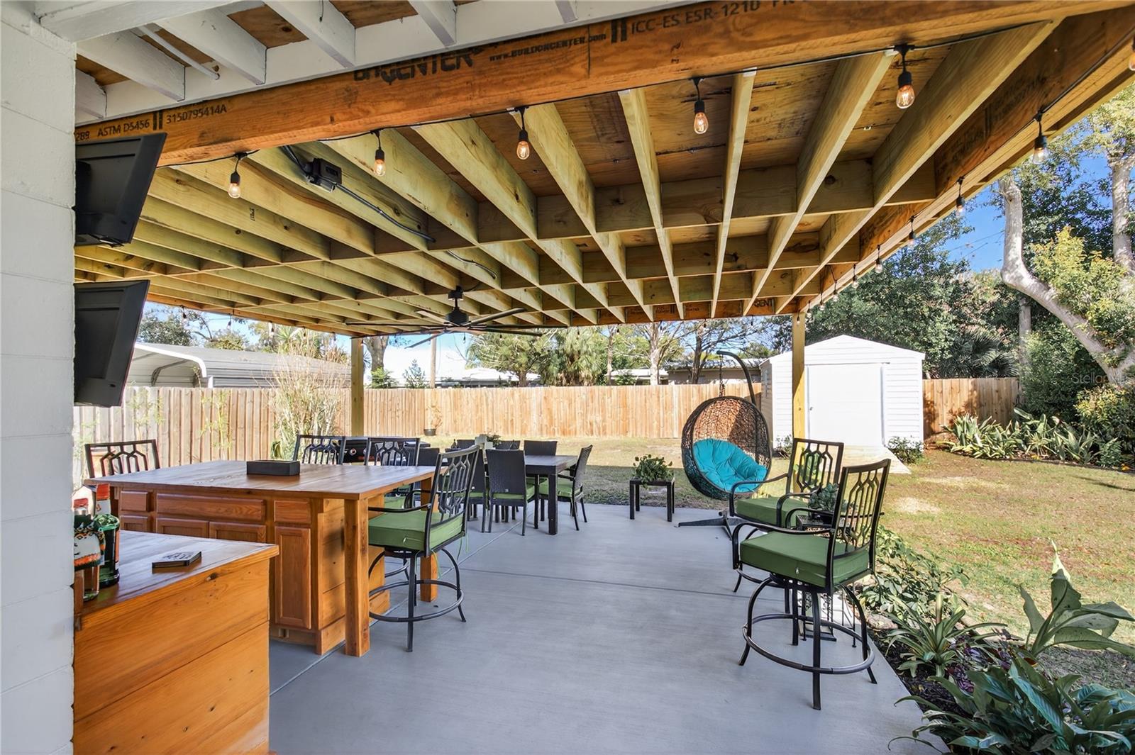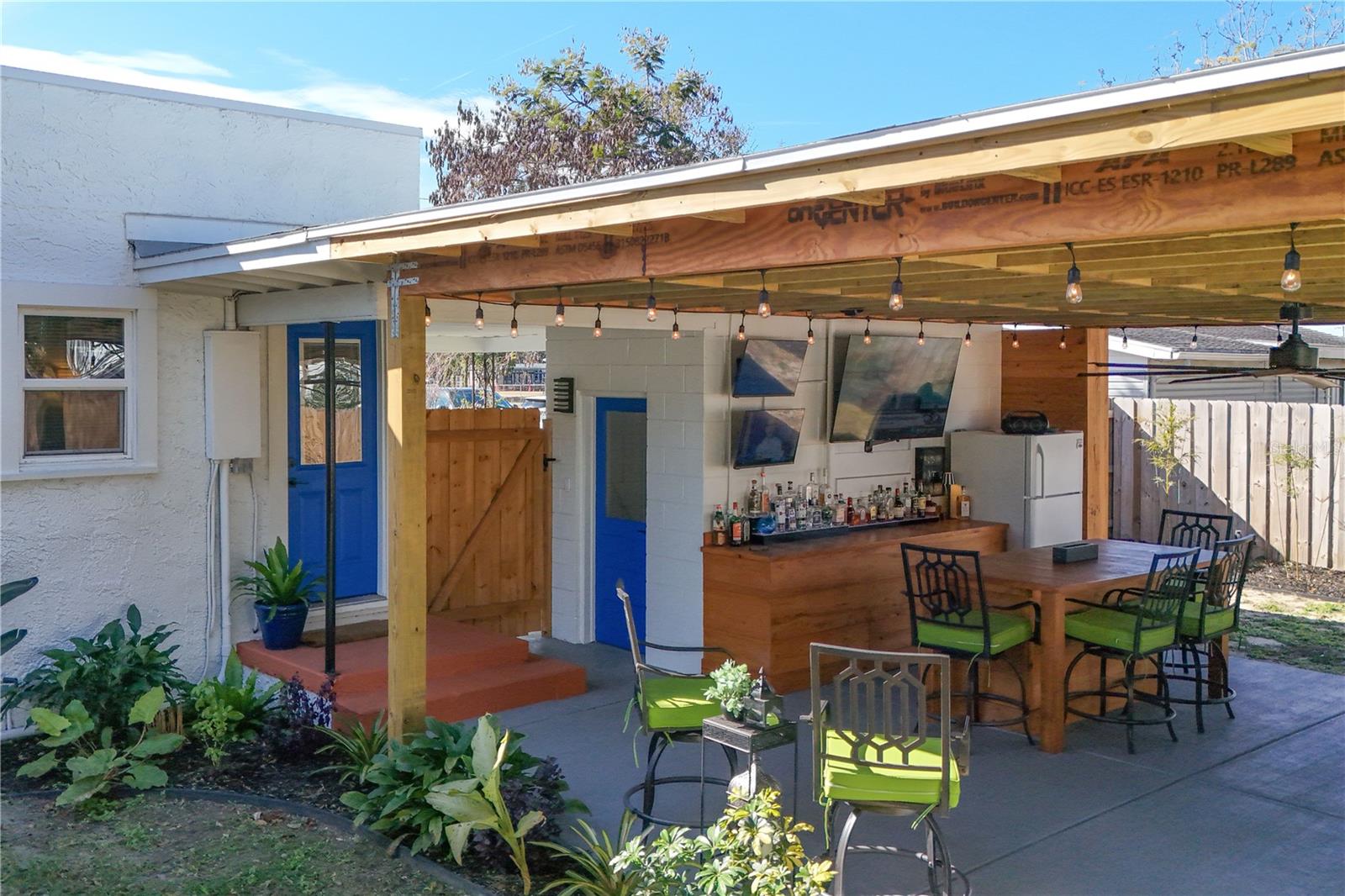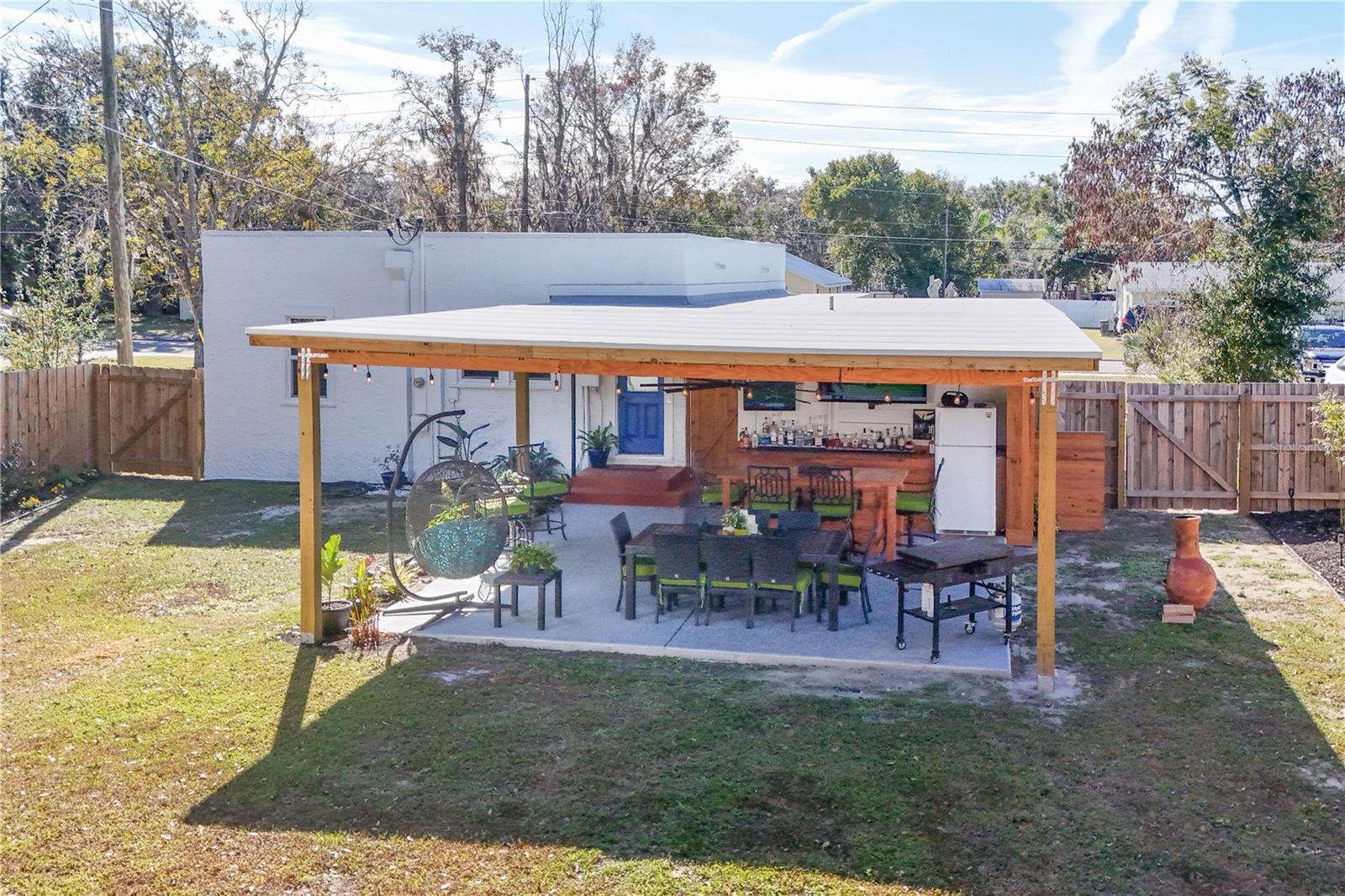 Nestled in the heart of Eustis, Florida, this charming 1935-built home beautifully blends historic character with thoughtful, modern renovations. Though modest in size, the home feels warm and refined, with every detail carefully updated to honor its original charm while offering today’s comforts. Inside, the renovation is evident throughout, complemented by elegant plantation shutters that add both style and light control while enhancing the home’s classic Florida appeal. Step outside to an impressive, fully covered 450-square-foot patio—an ideal extension of the living space. Designed for both relaxation and entertaining, the patio features a custom-built cypress wood table and bar. Crafted from durable cypress, these pieces are made to withstand the Florida climate and provide a timeless gathering place for years to come. The fenced backyard offers added versatility with a newly constructed 10 x 12-foot outbuilding, fully equipped with electricity—perfect for a workshop, studio, or extra storage. Out front, the charming, pristine landscaping adds the curb appeal that takes this property to the next level. Newly poured concrete enhances the beauty and functionality, while an additional concrete slab provides a convenient, dedicated area for discreet trash bin storage. Located in a peaceful, quiet neighborhood, the home offers a sense of calm and privacy while remaining just minutes from shopping, dining, medical facilities, and everyday conveniences. Altogether, this renovated 1935 home delivers historic charm, modern upgrades, exceptional outdoor living, and an ideal location in Eustis. Hurry to make your appointment because this one is really a sight to see. ROOF, HVAC, WATER HEATER, ELECTRICAL, GRANITE COUNTERTOPS and many more upgrades, all completed in 2024 and 2025.