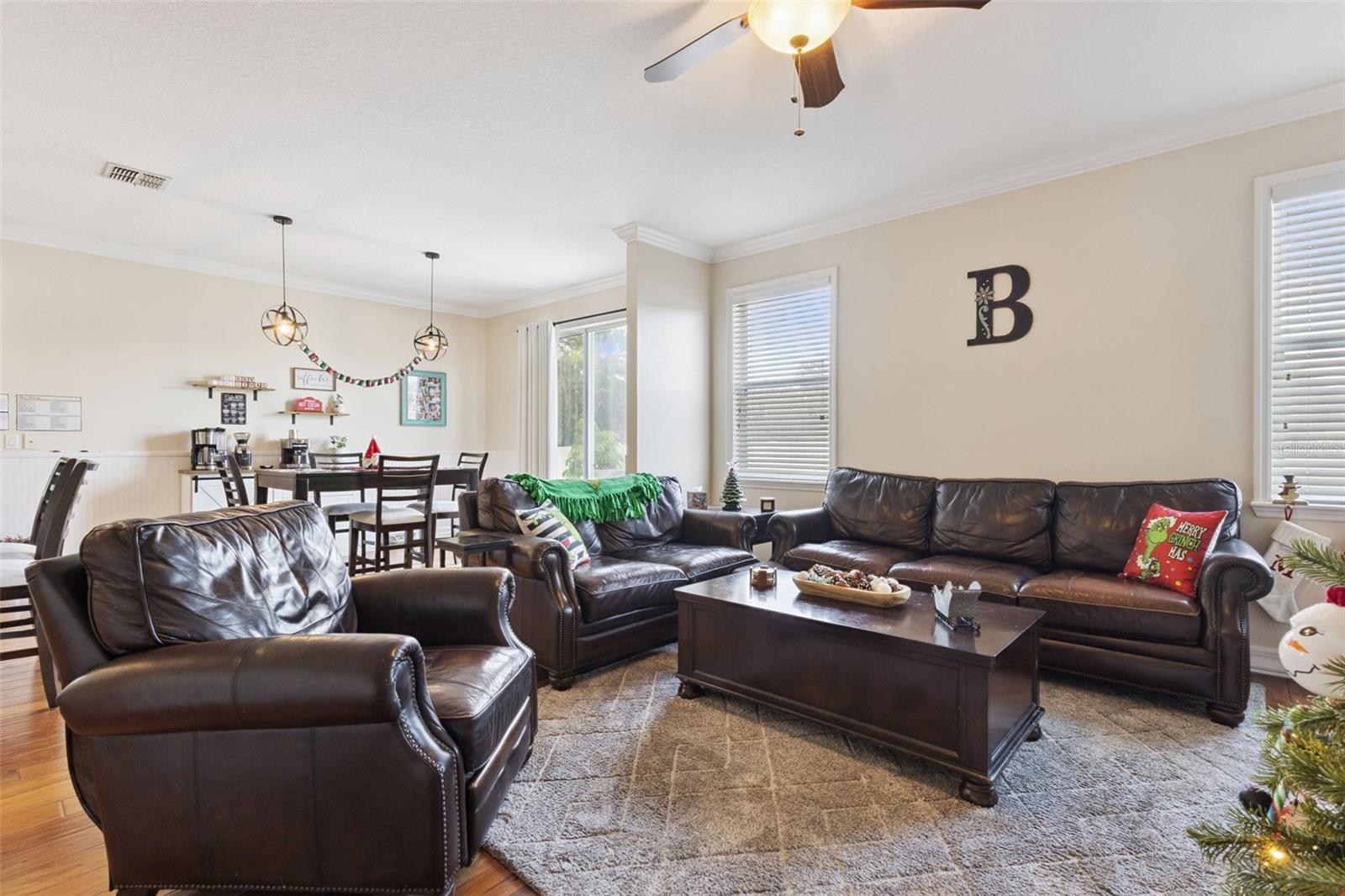 **PRICE IMPROVEMENT**. Welcome to your dream home in a highly sought-after cul-de-sac location in Eustis! This magnificent two-story residence boasts over 2,500 square feet of meticulously maintained and updated living space, featuring the ultimate in privacy with no rear neighbors. Enjoy an open, airy feel with soaring 9-foot ceilings throughout the first floor, accented by crown molding for a touch of sophistication. This home offers TWO Primary Suites, including a luxurious first-floor suite with cozy carpeting and beautiful accent features. The entire first floor (excluding the primary suite) shines with gorgeous hardwood floors. The dedicated office space features double doors and stylish new flooring, perfect for remote work, den or a library. The heart of the home is an updated kitchen featuring elegant quartz countertops, a sleek new backsplash, and a functional center island. Storage abounds with TWO pantries, including an oversized, custom-made pantry offering incredible organization and space. The second floor features 3 additional bedrooms, 2 with walk-in closets and plush carpeting, ceiling fans, and abundant storage. The expansive loft area is a blank canvas, ready to be utilized as a game room, den, gym, or media center. Step outside to a large, newly fenced-in yard, which backs up to a lush green area for unparalleled privacy—no rear neighbors! Enjoy easy access to the community pool, playground, and basketball court. This home is a prime location in Eustis. Experience the best of Central Florida living! Downtown Charm: Only 5 minutes from historic downtown Eustis, offering beautiful lakes, walking trails, and diverse restaurants. Mount Dora Magic: Just 10 minutes from the renowned historic downtown Mount Dora, famous for its brick-paved streets, boutique shops, cozy cafés, and year-round holiday festivities! Nature Awaits: Explore the beautiful outdoors at nearby gems like the Trout Lake Nature Center (230 acres of trails and wildlife) and the Hidden Waters Preserve (90 acres of hiking trails and native habitat), or enjoy a relaxing stroll at Ferran Park along Lake Eustis.This is more than a home; it's a lifestyle upgrade. Contact me for a private showing!