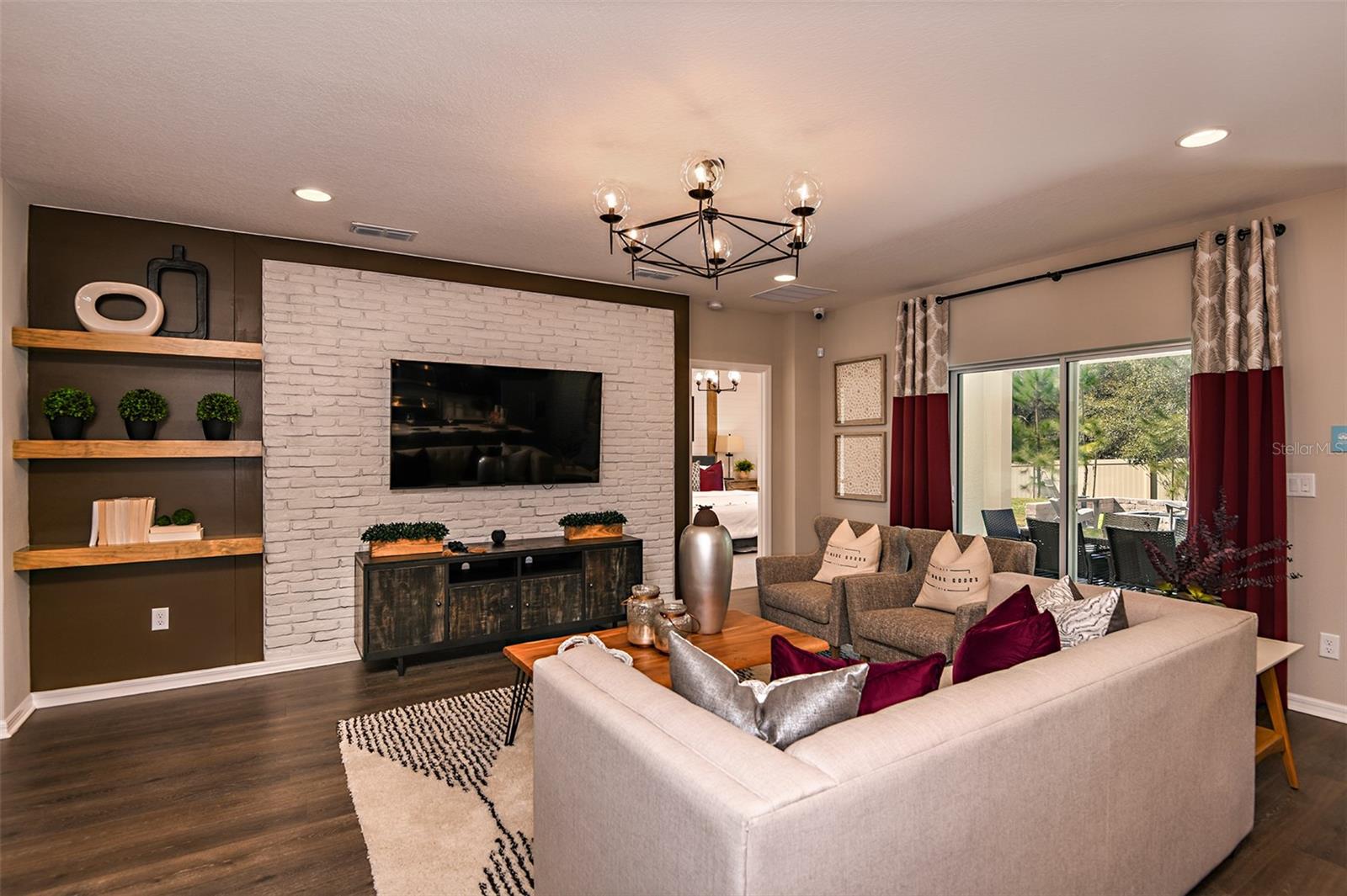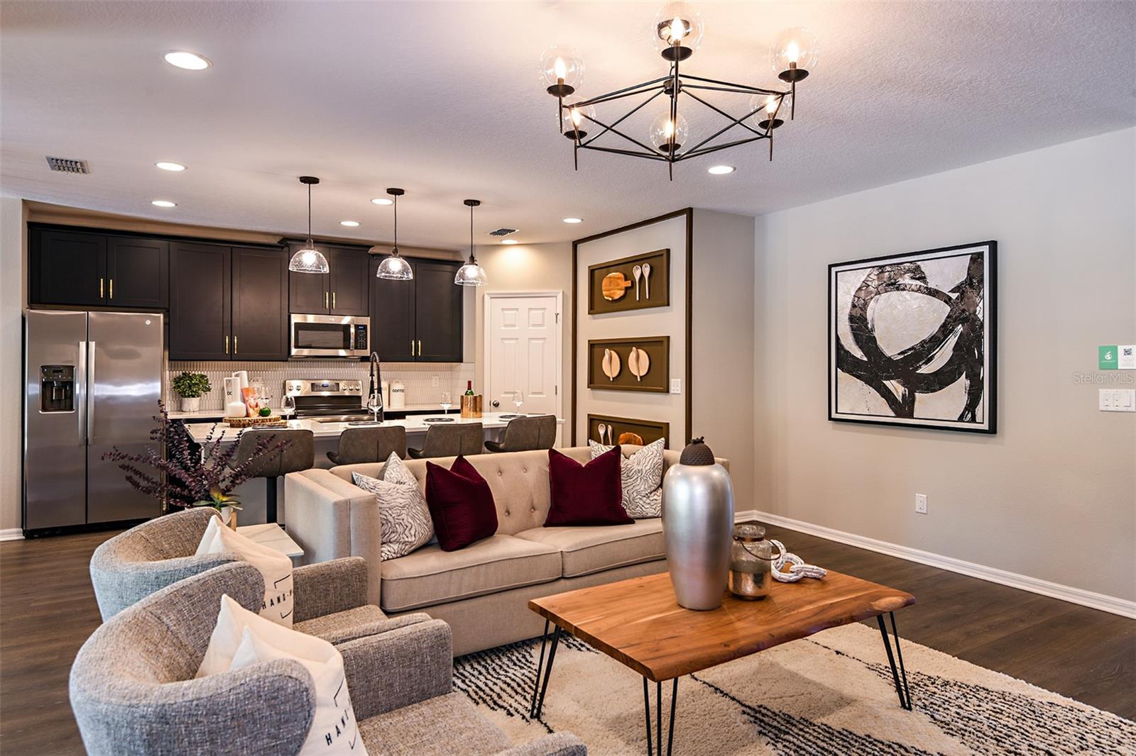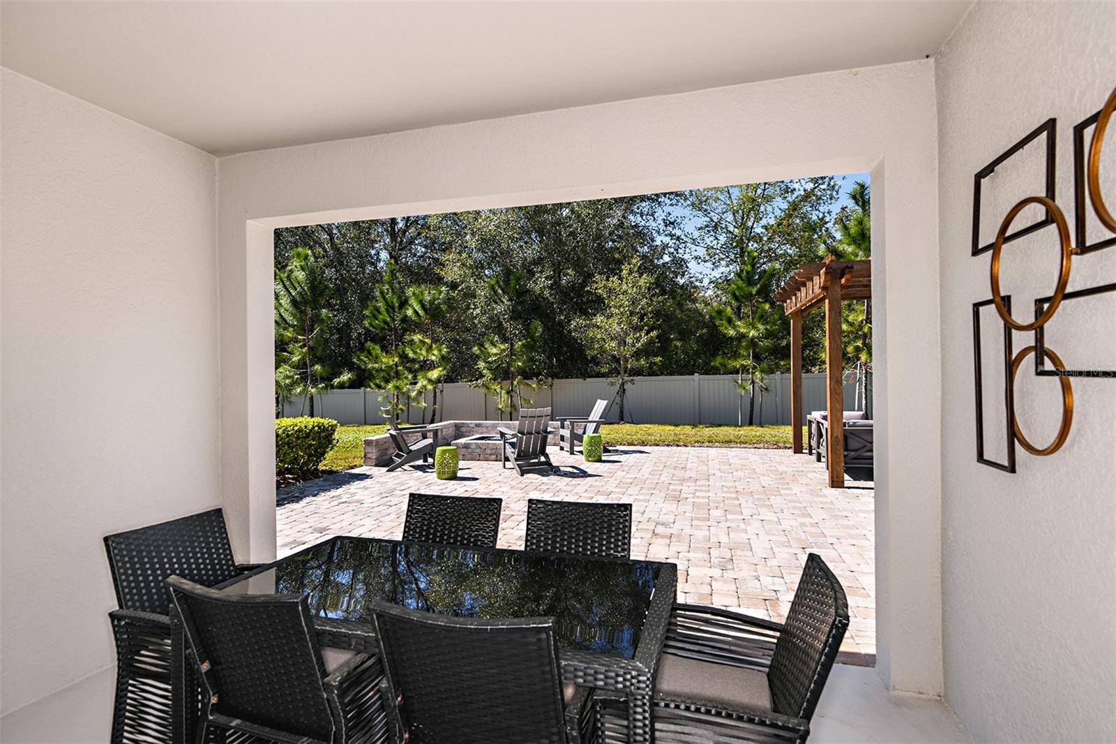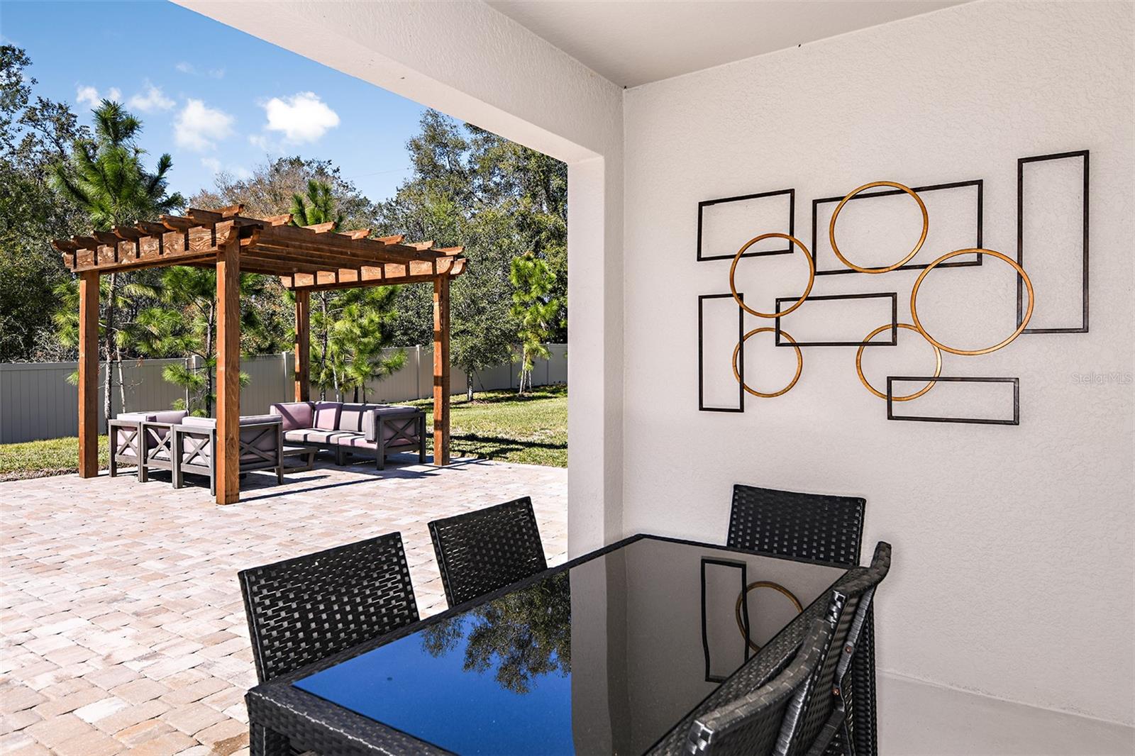 This former model home showcases an array of upgrades and designer touches throughout. Featuring a spacious open floor plan with 4 bedrooms and 2 bathrooms, this home is perfect for both everyday living and entertaining. The great room layout seamlessly connects the living room, kitchen, and dining area, creating an inviting space for gatherings. The kitchen is a chef’s delight, complete with stainless steel appliances, breakfast bar, pantry, and decorative backsplash. Retreat to the primary suite is thoughtfully designed with crown molding for added designer touch and includes an ensuite bathroom with dual sinks, upgraded tile in the frameless glass shower, and a walk-in closet. Three additional generously sized bedrooms offer flexibility for guests or a home office. Additional features include a convenient interior laundry room. Step outside to enjoy the covered back patio, which opens to an extended paver patio with a fire pit and pergola—perfect for relaxing or entertaining outdoors. Located in the Lake Lincoln community, residents enjoy access to walking trails, dog park, and shaded playground. Conveniently situated near, shopping, dining, and major roadways, this home truly has it all.