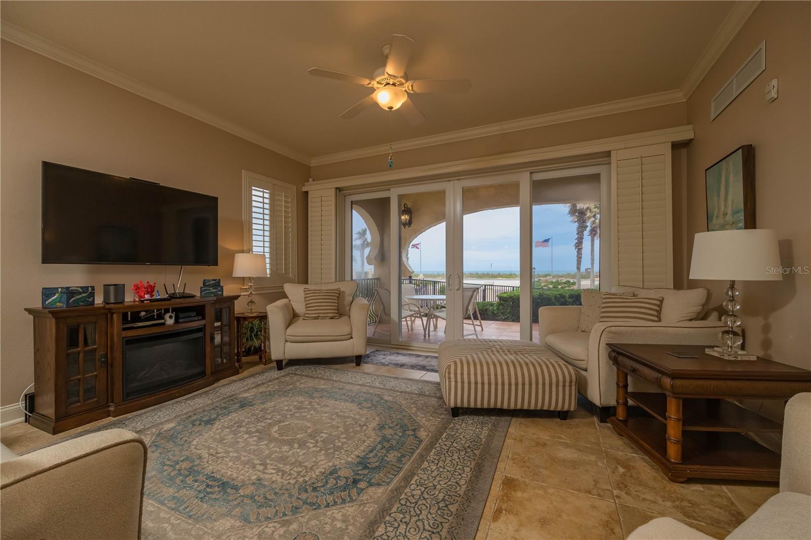 Your dream coastal retreat awaits in this FULLY FURNISHED, OCEAN VIEW condo! Perfectly situated between the sandy shores of the Atlantic Ocean and the Intracoastal Waterway in Oceanside at Beverly Beach Condominiums, this ground-level, corner condo features breathtaking ocean views from the living room, kitchen, and master bedroom. Stylish furnishings and decor create the perfect environment to relax and unwind, and the open layout seamlessly connects the dining, kitchen, and living areas for entertaining guests. Generous 10’ ceilings enhance the airy feel of the home, while crown molding throughout and tray ceilings in the master suite add a touch of sophistication. Other features include laminate flooring in bedrooms, custom plantation shutters on impact windows and doors, wet bar with wine refrigerator, stainless steel appliances, solid wood cabinetry, and granite countertops. Retreat to the master suite, complete with a lavish ensuite bathroom with a spa tub, dual sinks, and a spacious walk-in closet. A split floor plan offers two additional bedrooms, each with a full bath, providing comfort and privacy for family and visitors. Wake to the sound of waves breaking on the shore and enjoy your coffee watching the sunrise from your private lanai. A deeded beach access is just steps from your back door, so spend your days strolling leisurely down the shore hunting for treasures or make a splash surfing or paddleboarding in the sparkling water. Lounge poolside, or take a dip in the pool, or soak in the jacuzzi. An evening kayak trip down the Intracoastal is the perfect way to end the day and enjoy the sunset, and a private kayak launch for residents makes launching a breeze! Comfort and security are paramount in Oceanside at Beverly Beach Condominiums, and the community is gated, and each unit is provided 2 designated parking spaces in the underground garage, as well as a secure storage area. Being sold FULLY FURNISHED (excluding artwork and owner’s personal belongings in storage area). Located 2 miles north of Flagler Pier. Whether you're seeking a permanent residence, vacation getaway, or an investment property, this ocean view condo offers the ultimate in coastal living- move right in and start living the salt life!