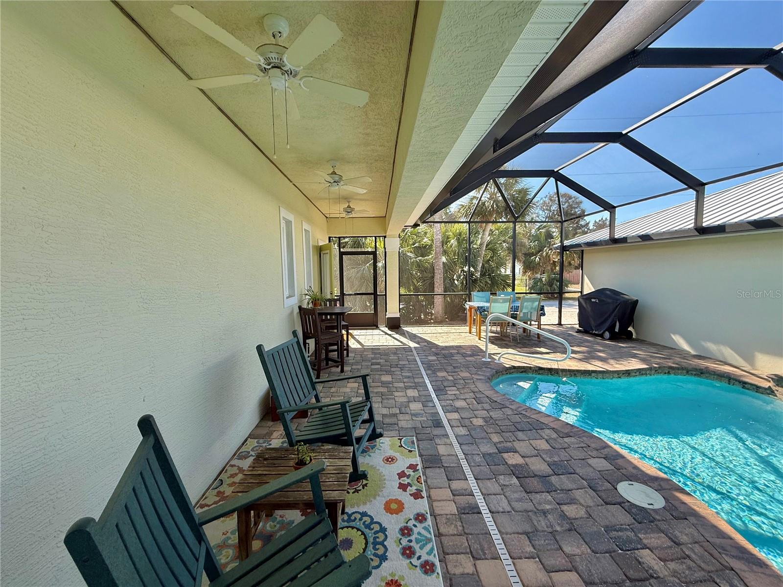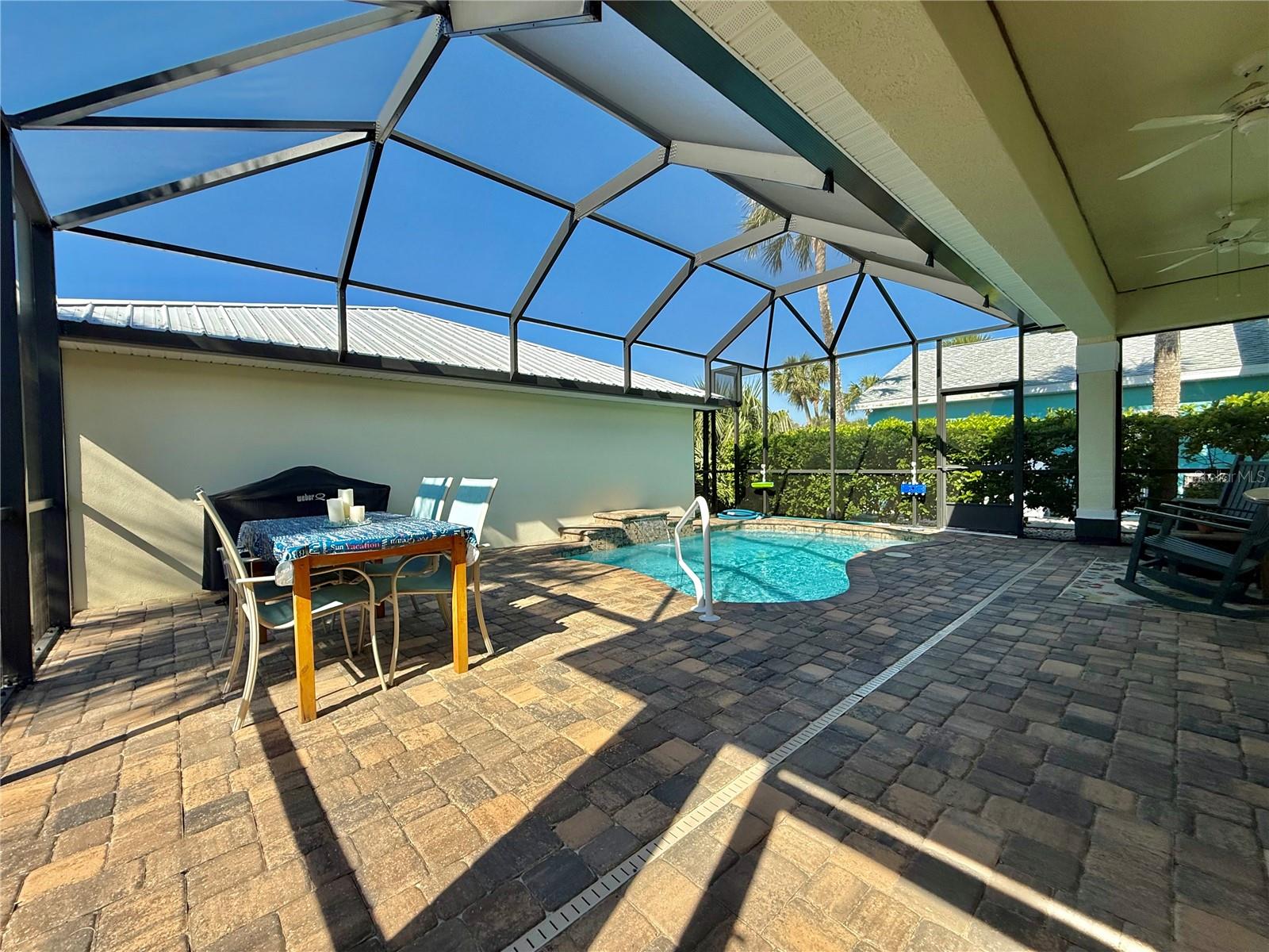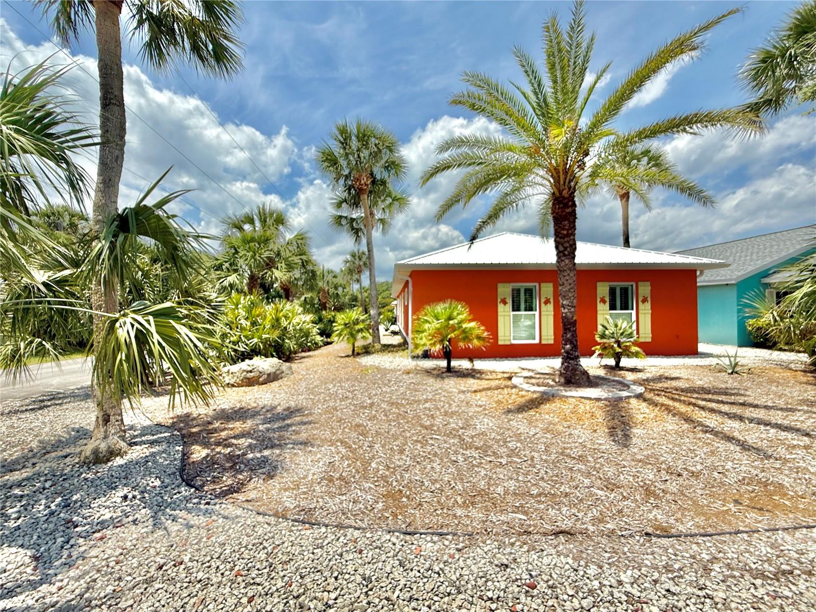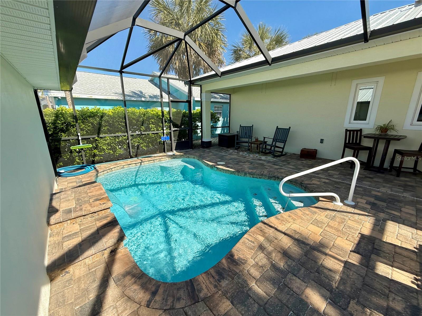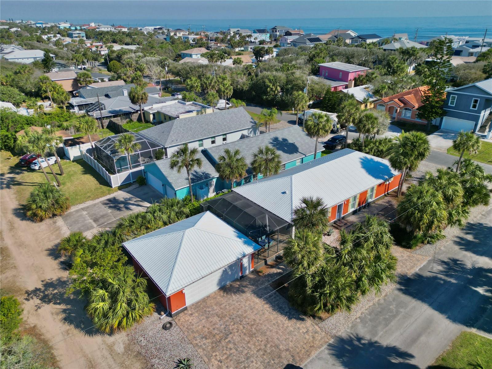 Immaculate Custom Paul Culver Beachside Pool Home – Just 4 Houses from the Beach! Located on a large corner lot, this beautifully maintained concrete block home offers exceptional beachside living with 3 bedrooms, 2.5 bathrooms, office/bonus room, and a split floorplan with 9’ ceilings throughout. Enjoy the Florida lifestyle in your private screened lanai featuring a heated saltwater pool with waterfall, thoughtfully positioned between the home and detached garage for privacy. The spacious chef’s kitchen includes Blue Bahia granite countertops, GE Profile stainless steel appliances, double ovens, gas cooktop, wet bar, and cabinet lighting behind crown molding. A large pantry includes a second refrigerator, sink, and laundry hookups for both gas and electric. The primary suite features a tray ceiling, modern en-suite bathroom, walk-in closet, and two additional 4x9 closets. Bathrooms are finished with granite and quartz countertops and ceramic tile flooring. Built to hurricane-rated codes, the home offers impact windows and doors, metal hip roof, and no flood insurance required. Additional highlights include: Luxury vinyl plank flooring throughout, Central vacuum system, Lots of storage space, Tankless water heater with 3 instant hot water stations, Oversized garage with Shark floor coating, Whole-house GE Advantapure water purification, Buried propane tank & generator hookup,Plantation shutters & ceiling fans throughout, Lush landscaping with pavers, rock, and mulch. Low insurance costs due to solid construction—current premium is under $2,000/year. Don’t miss this rare opportunity to own a move-in ready beachside home with resort-style features! Schedule your private showing today!