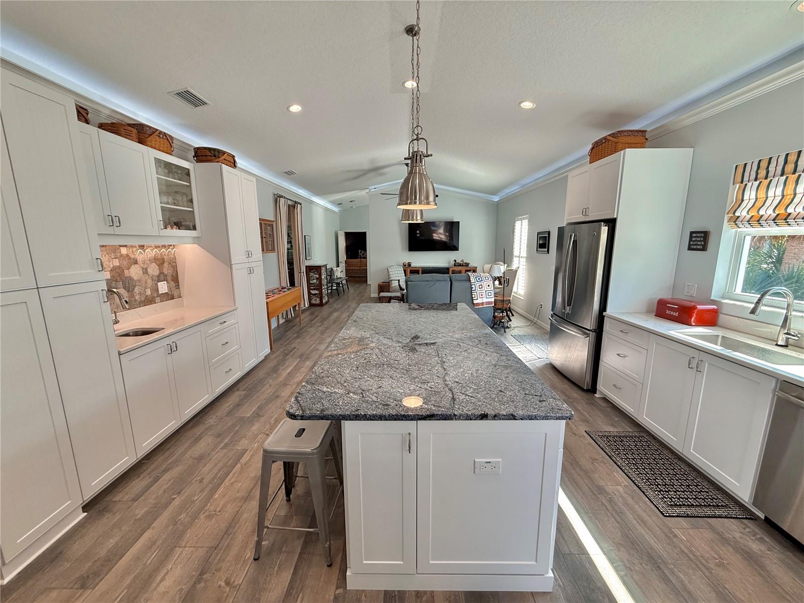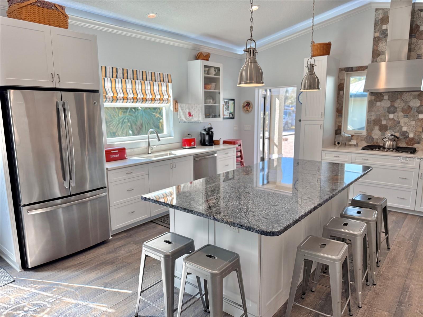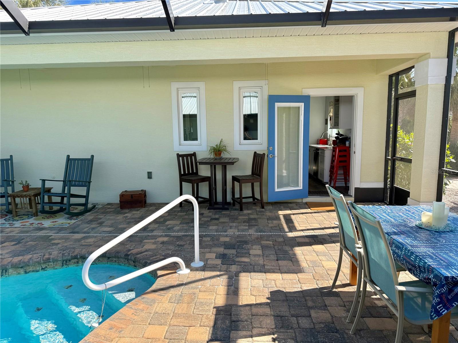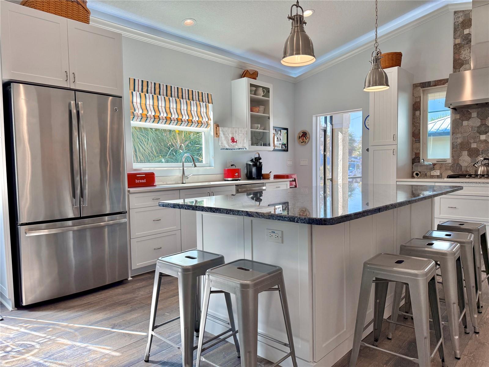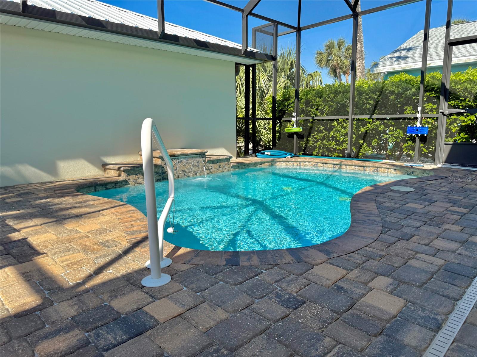 Immaculate Custom Paul Culver Beachside Pool Home – Just 4 Houses from the Beach! Located on a large corner lot, this beautifully maintained concrete block home offers exceptional beachside living with 3 bedrooms, 2.5 bathrooms, office/bonus room, and a split floorplan with 9’ ceilings throughout. Enjoy the Florida lifestyle in your private screened lanai featuring a heated saltwater pool with waterfall, thoughtfully positioned between the home and detached garage for privacy. The spacious chef’s kitchen includes Blue Bahia granite countertops, GE Profile stainless steel appliances, double ovens, gas cooktop, wet bar, and cabinet lighting behind crown molding. A large pantry includes a second refrigerator, sink, and laundry hookups for both gas and electric. The primary suite features a tray ceiling, modern en-suite bathroom, walk-in closet, and two additional 4x9 closets. Bathrooms are finished with granite and quartz countertops and ceramic tile flooring. Built to hurricane-rated codes, the home offers impact windows and doors, metal hip roof, and no flood insurance required. Additional highlights include: Luxury vinyl plank flooring throughout, Central vacuum system, Lots of storage space, Tankless water heater with 3 instant hot water stations, Oversized garage with Shark floor coating, Whole-house GE Advantapure water purification, Buried propane tank & generator hookup,Plantation shutters & ceiling fans throughout, Lush landscaping with pavers, rock, and mulch. Low insurance costs due to solid construction—current premium is under $2,000/year. Don’t miss this rare opportunity to own a move-in ready beachside home with resort-style features! Schedule your private showing today!