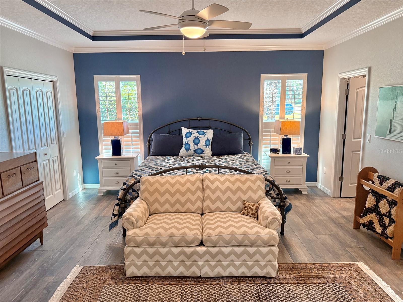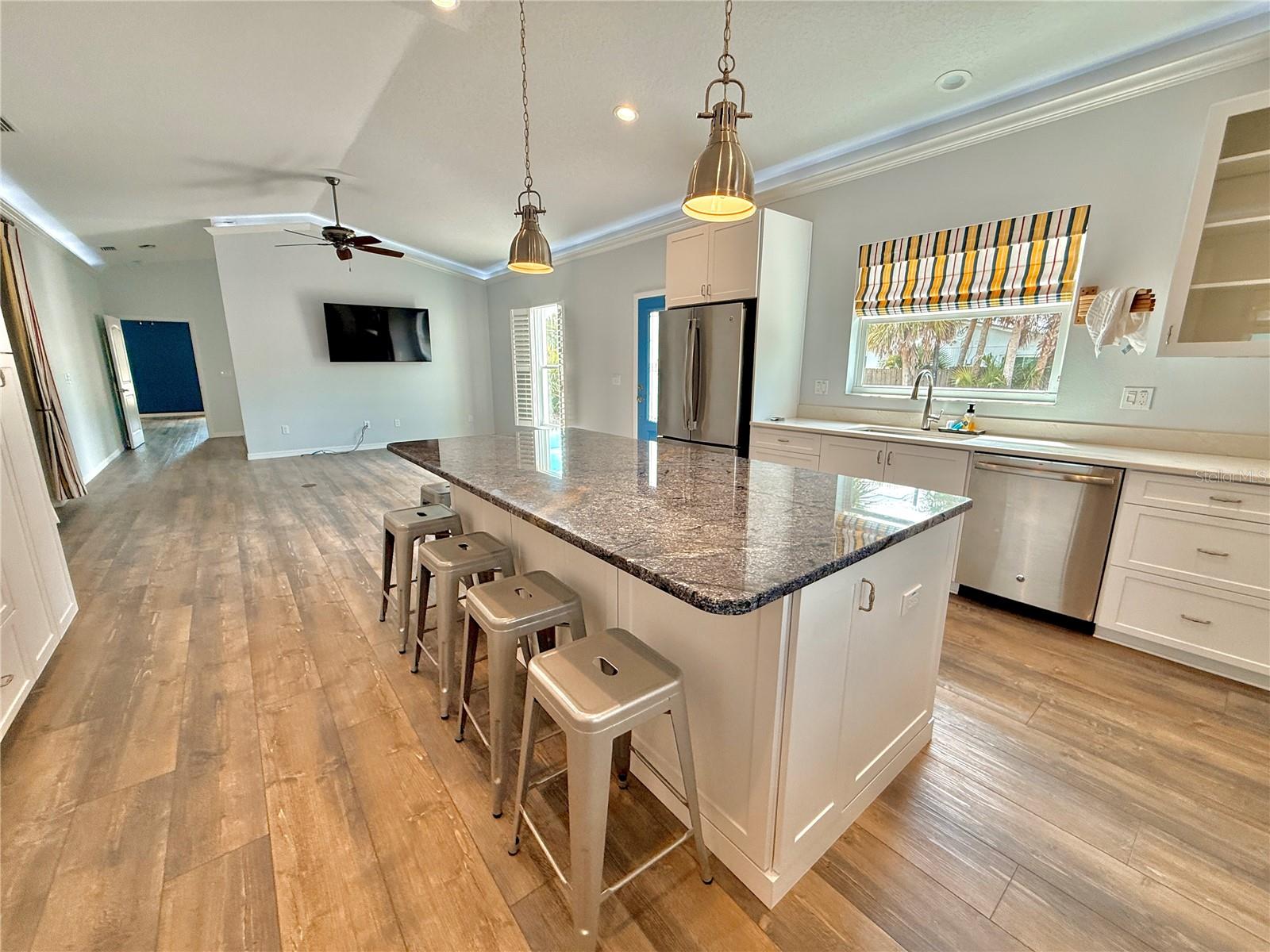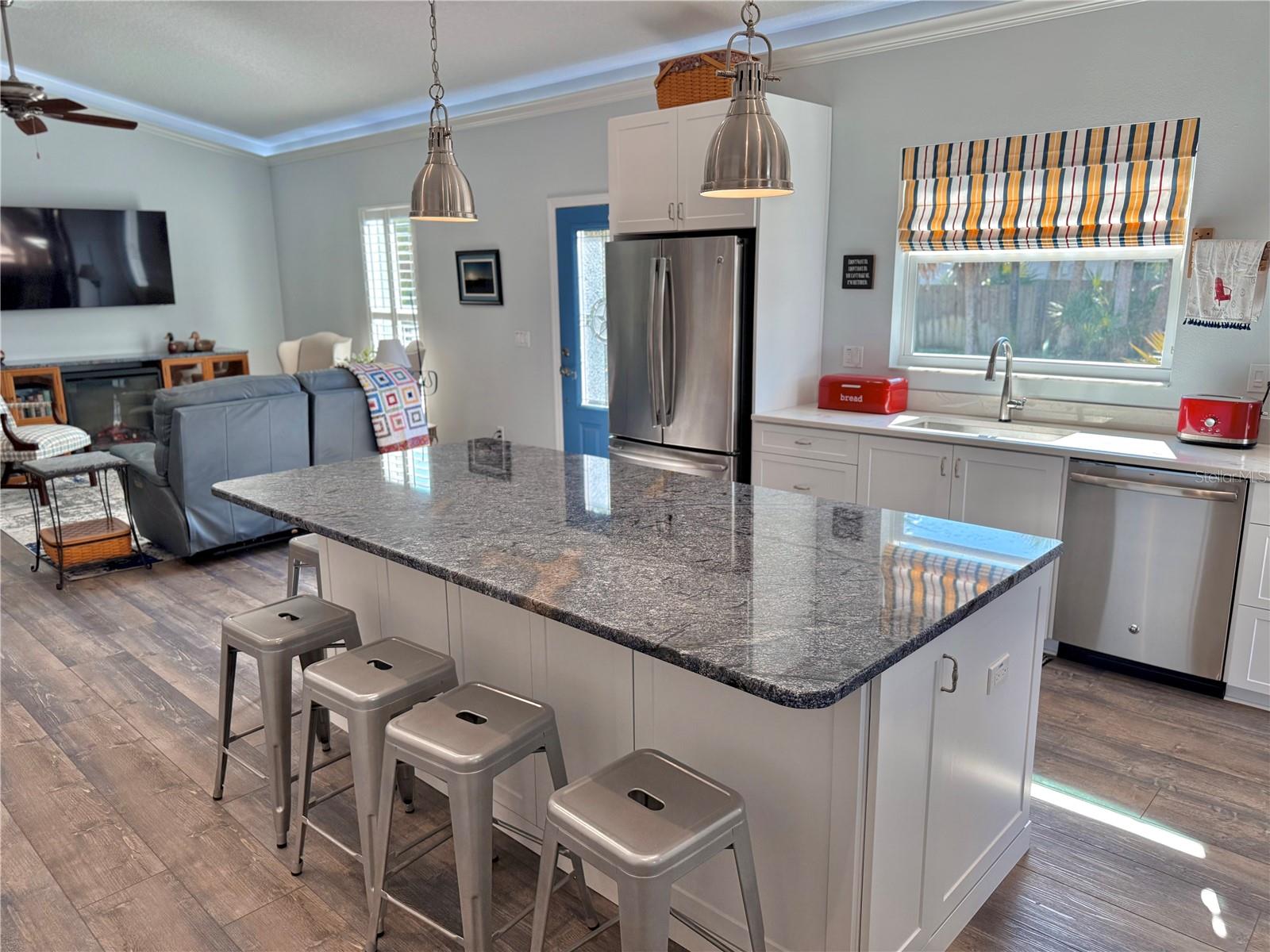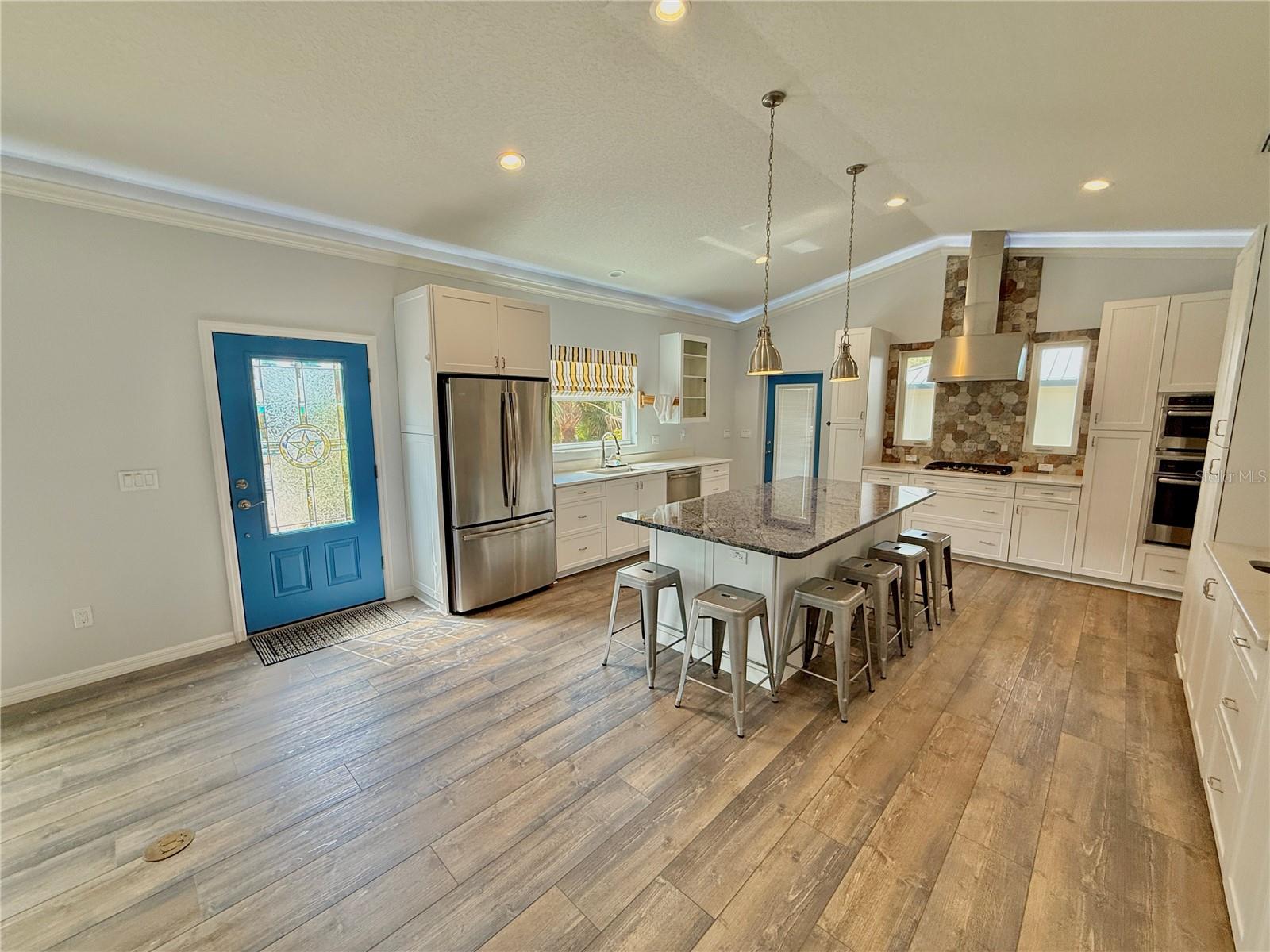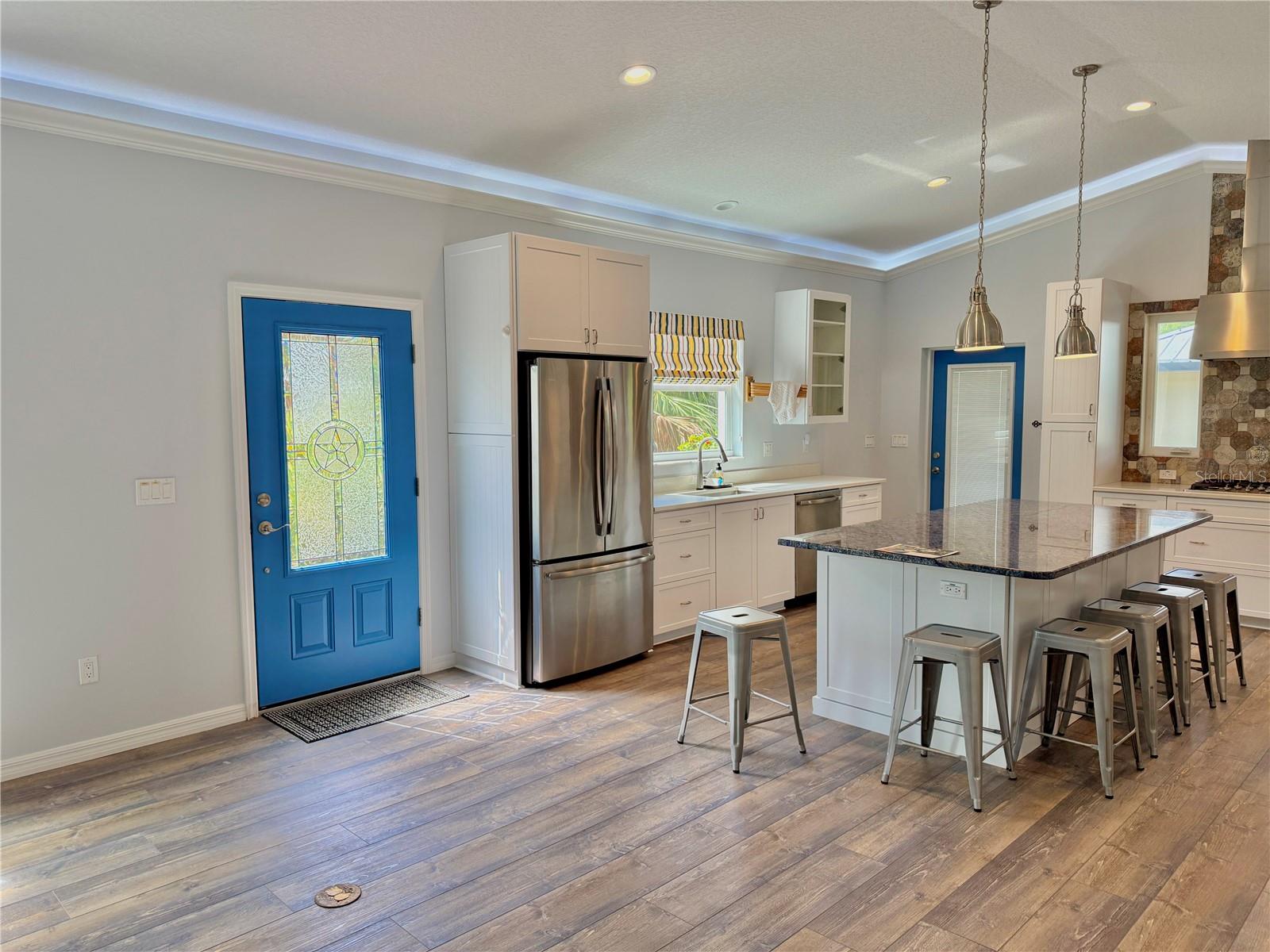 Immaculate Custom Paul Culver Beachside Pool Home – Just 4 Houses from the Beach! Located on a large corner lot, this beautifully maintained concrete block home offers exceptional beachside living with 3 bedrooms, 2.5 bathrooms, office/bonus room, and a split floorplan with 9’ ceilings throughout. Enjoy the Florida lifestyle in your private screened lanai featuring a heated saltwater pool with waterfall, thoughtfully positioned between the home and detached garage for privacy. The spacious chef’s kitchen includes Blue Bahia granite countertops, GE Profile stainless steel appliances, double ovens, gas cooktop, wet bar, and cabinet lighting behind crown molding. A large pantry includes a second refrigerator, sink, and laundry hookups for both gas and electric. The primary suite features a tray ceiling, modern en-suite bathroom, walk-in closet, and two additional 4x9 closets. Bathrooms are finished with granite and quartz countertops and ceramic tile flooring. Built to hurricane-rated codes, the home offers impact windows and doors, metal hip roof, and no flood insurance required. Additional highlights include: Luxury vinyl plank flooring throughout, Central vacuum system, Lots of storage space, Tankless water heater with 3 instant hot water stations, Oversized garage with Shark floor coating, Whole-house GE Advantapure water purification, Buried propane tank & generator hookup,Plantation shutters & ceiling fans throughout, Lush landscaping with pavers, rock, and mulch. Low insurance costs due to solid construction—current premium is under $2,000/year. Don’t miss this rare opportunity to own a move-in ready beachside home with resort-style features! Schedule your private showing today!