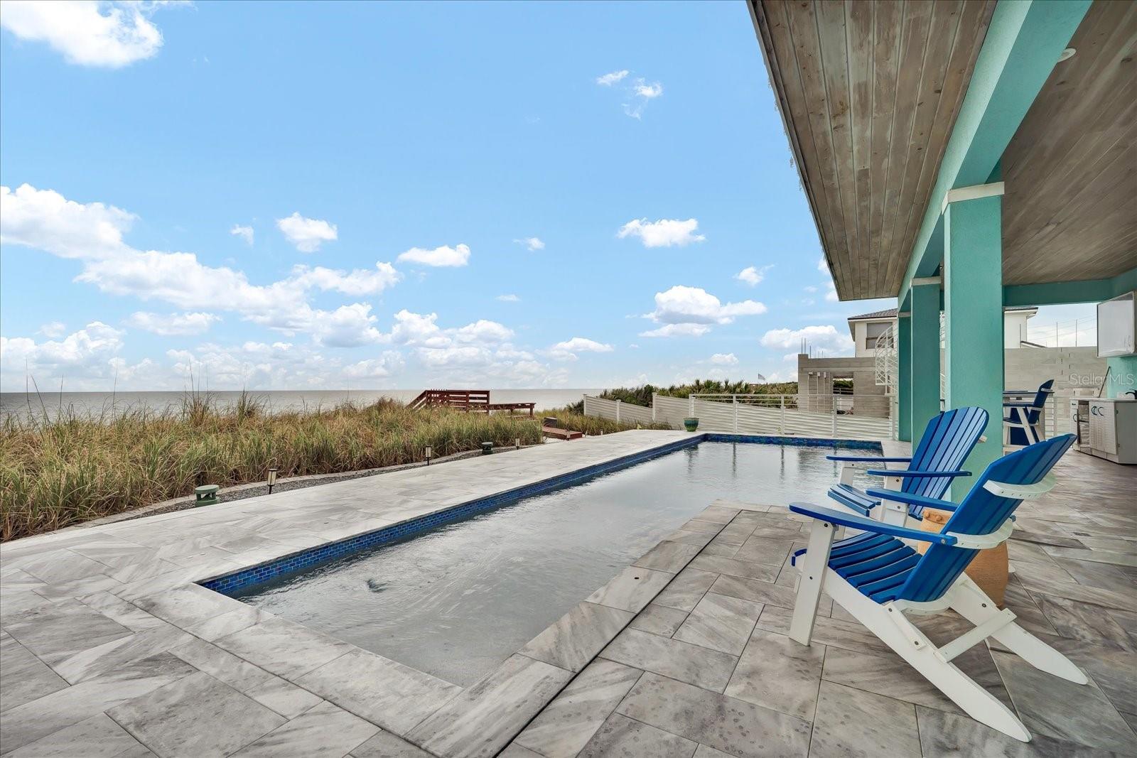 PRICE IMPROVEMENT!! EXCEPTIONAL OCEANFRONT VALUE!! Now offered at a newly improved price, this stunning three-story oceanfront residence delivers luxury coastal living at an exceptional value. Designed for both elevated everyday living and unforgettable entertaining, this custom-built 2017 home features a private beach walkover and breathtaking views that stretch from the Atlantic Ocean to the Intracoastal Waterway. Offering four spacious bedrooms and three full baths, the open-concept design is anchored by elegant marble flooring that flows seamlessly from the interior living space to the outdoor saltwater pool patio, creating a true indoor-outdoor experience. Expansive 8-foot, four-panel sliders frame uninterrupted ocean views and open the home to sea breezes and natural light. The chef’s kitchen is beautifully appointed with double ovens and generous prep space, all overlooking panoramic ocean vistas. Bamboo flooring spans the second and third levels, where front and rear balconies provide the perfect setting for sunrise coffee, sunset cocktails, and Intracoastal sunsets. A residential elevator offers convenient access to all floors. Outdoor living is exceptional, featuring a gas fireplace, outdoor kitchen with new refrigerator, exterior Bose speaker system, putting green with sand trap, outdoor shower, and a dedicated dog run, all within a fully fenced, professionally landscaped yard with turf and rock accents. Additional highlights include an oversized three-car garage, Tesla EV charger, RV hookup accommodating up to a 30-foot RV, impact windows and doors with additional hurricane shutters on select entries, a tankless gas water heater, and a new 2024 A/C system. Laundry rooms on both the first and third floors, ample parking, and stunning views from nearly every room complete the offering.This is more than a home. It is a rare oceanfront lifestyle opportunity, now available at an improved price. Schedule your private tour and experience beachfront living at its absolute best.