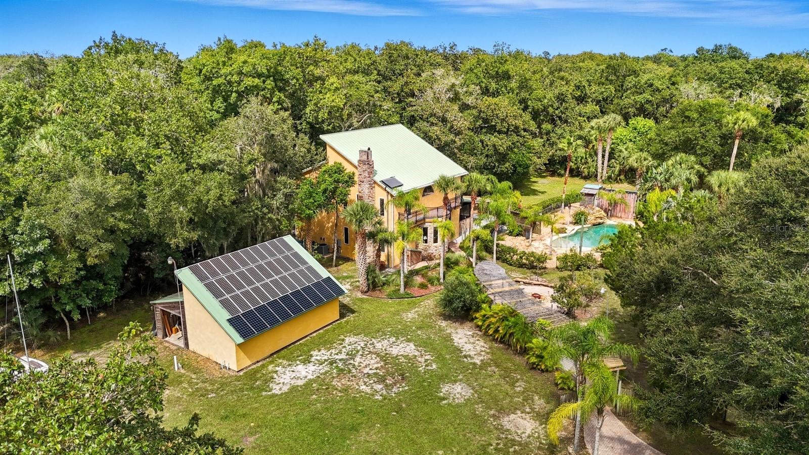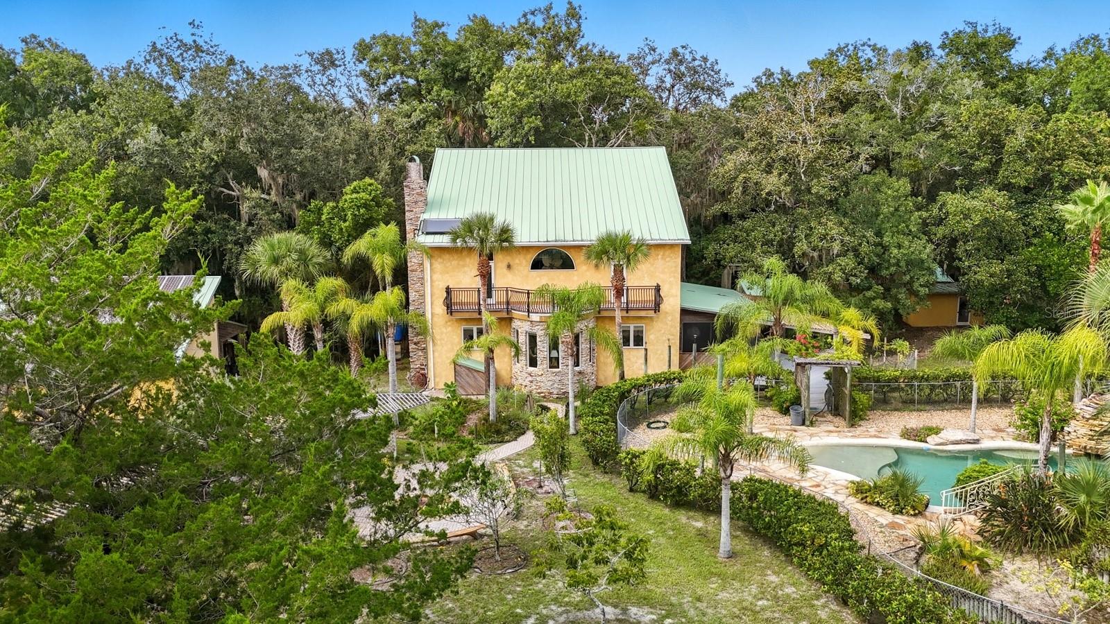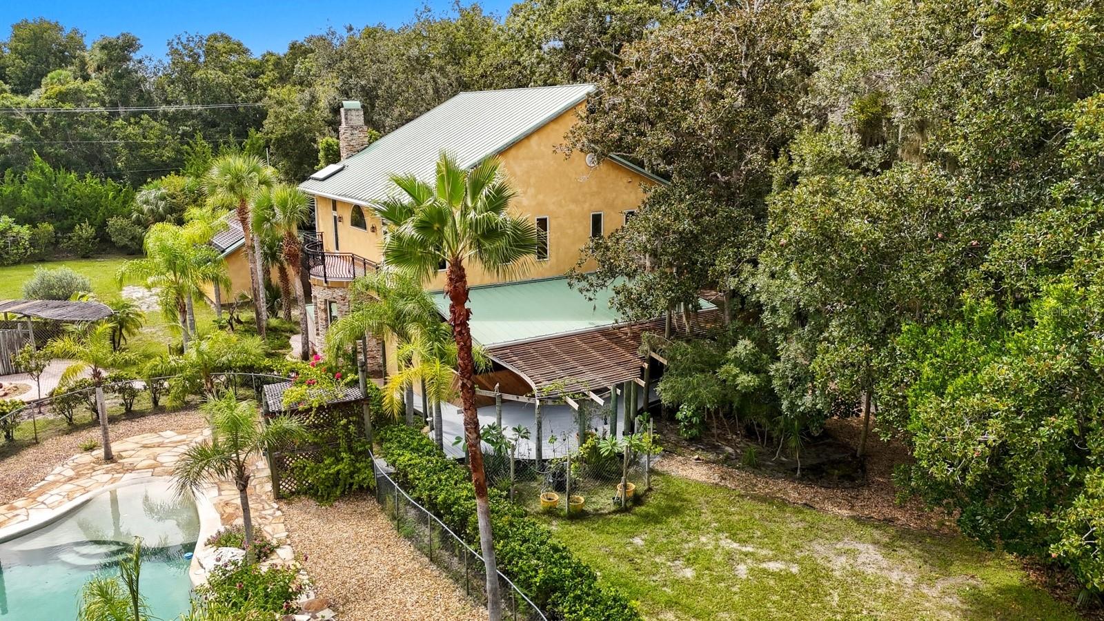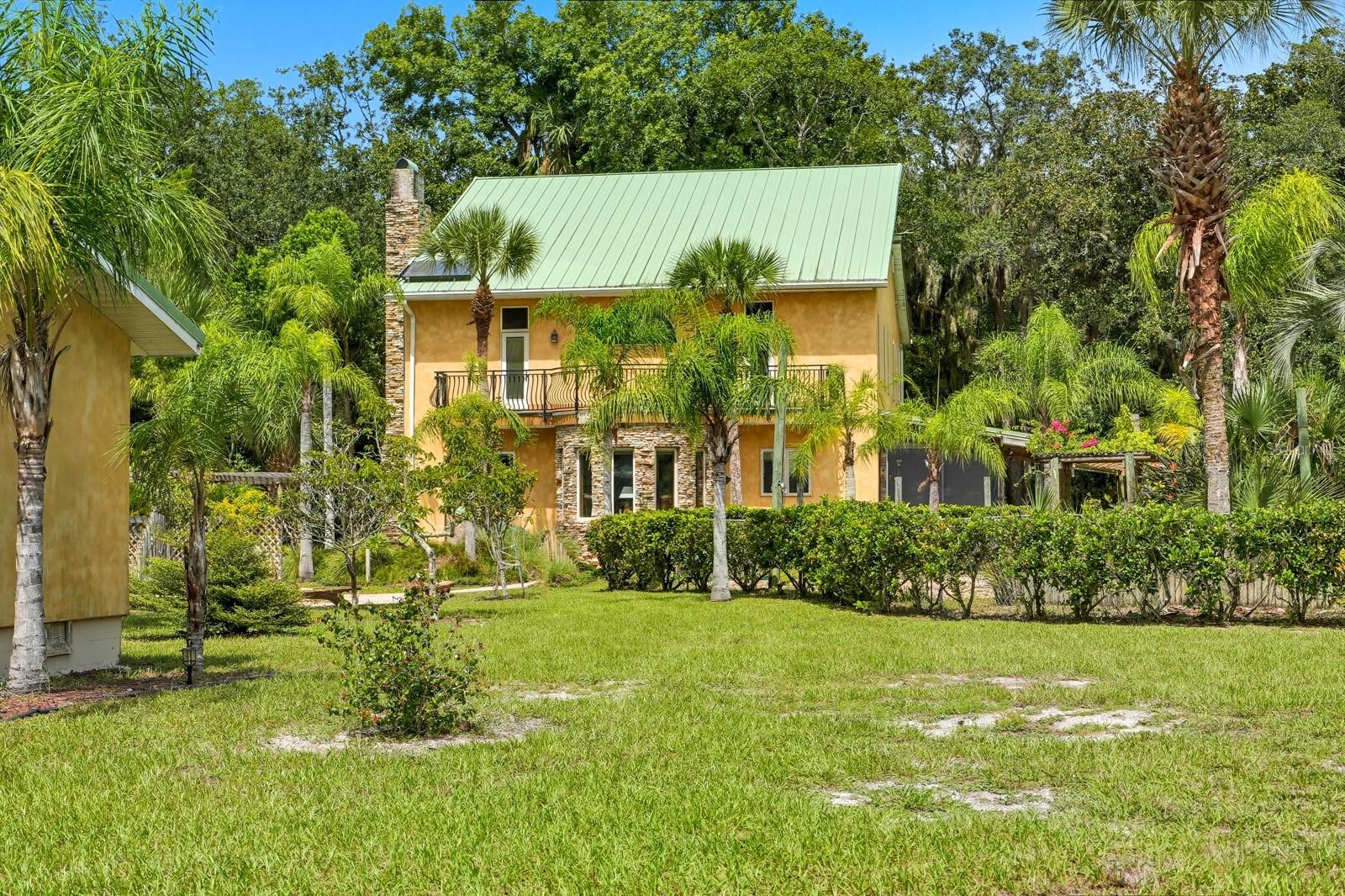 A rare Intracoastal Retreat on 7.38 Acres in Flagler Beach. Welcome to 5911 John Anderson Highway—where Old Florida charm meets lodge-style retreat. Priced almost $100,000 below appraisal this wonderfully unique home is set on 7.38 acres, including 4 acres of protected conservation, this custom-built estate offers the rare luxury of private Intracoastal Waterway access and a lifestyle unlike any other. From the moment you arrive, the setting feels like a sanctuary. Meandering paver walkways shaded by trellises, lush tropical landscaping, and thoughtful sustainability features create an environment that is as serene as it is inspiring. Whether you’re enjoying the greenhouse, tending the gardens, or slipping into the canoe to reach your private moor and sailboat connection, every detail speaks to a life well-lived close to nature. The Main Residence...Crafted by the owner with remarkable attention to detail, the 5-bedroom, 4-bath home is a showcase of artistry and craftsmanship. Highlights include: A dramatic two-story opening with wonderfully designed architectural details. Travertine and bamboo flooring paired with custom woodwork and tongue-and-groove ceilings Wrought iron railings overlooking open living spaces, blending elegance with rustic warmth A metal roof and dual-zone air conditioning for comfort and durability Sustainable Living The estate is solar-assisted with FPL connection. Three wells—two for the homes and one dedicated to irrigation—along with rainwater harvesting barrels support a self-sufficient lifestyle. Even the irrigation system is thoughtfully designed to conserve resources. Resort-Style Amenities The outdoor spaces echo a retreat-like feel: Sparkling inground pool with spa with adjacent shower and composting toilet. Greenhouse for year-round gardening Pottery workshop fully stocked and ready for creativity Storage for tractors, vehicles, and equipment The Guest House (ADU) Perfect for visitors or as an income-producing opportunity, the 2-bedroom, 2-bath guest home offers its own enclosed porch, carport, and private comforts—seamlessly blending into the property’s natural flow. A Lifestyle, Not Just a Home This estate offers more than space and beauty—it offers a way of living. From sunset sails on the Intracoastal to mornings spent in the workshop or gardens, life here is an experience that blends luxury, sustainability, and adventure.