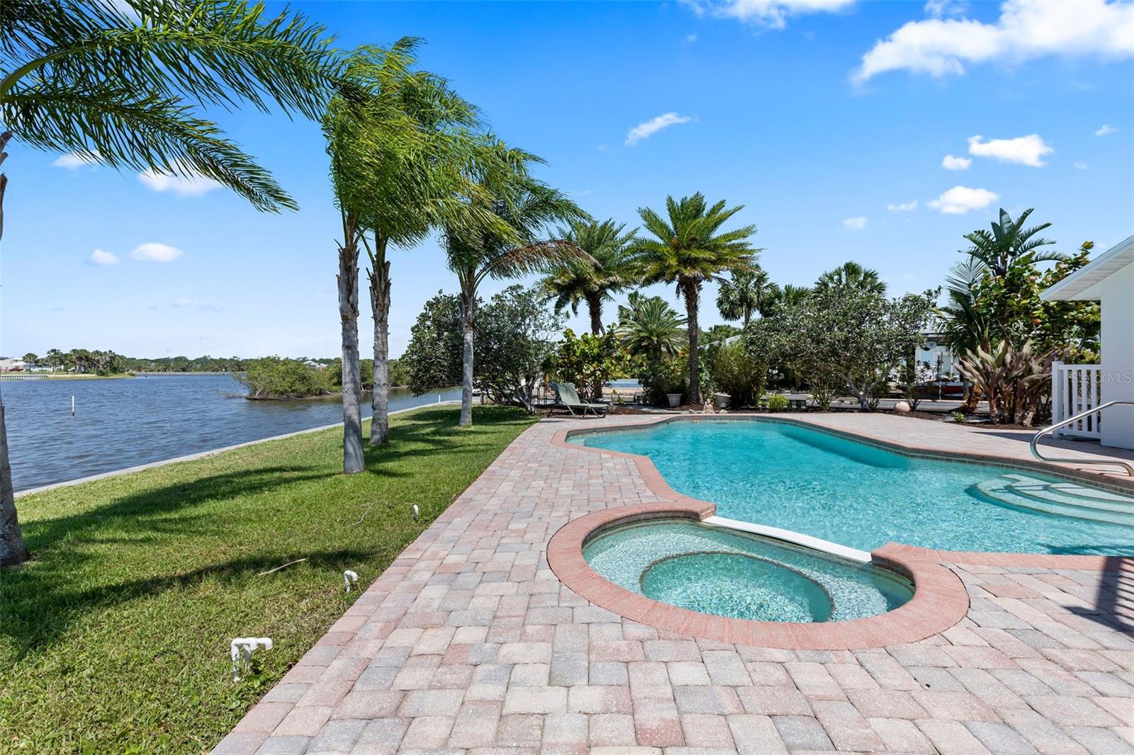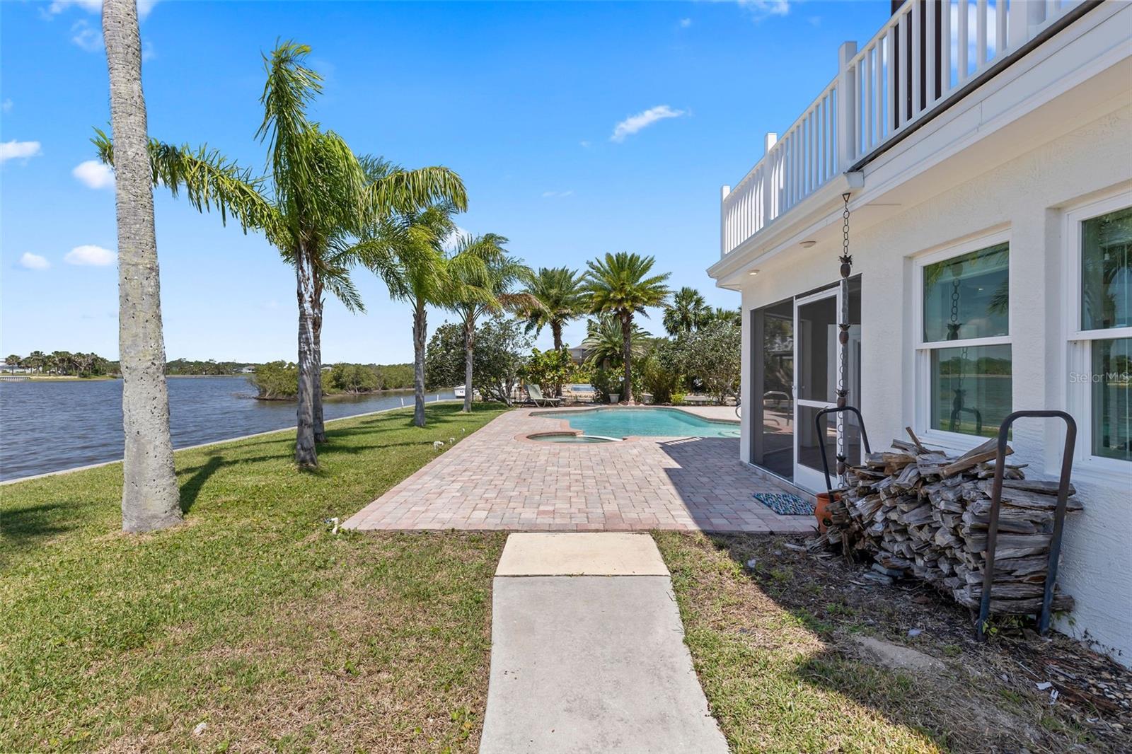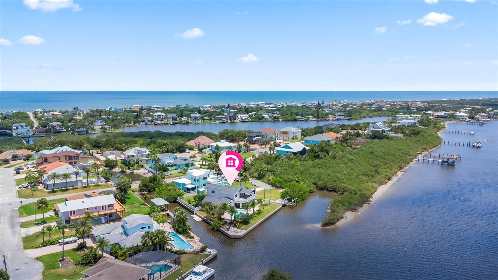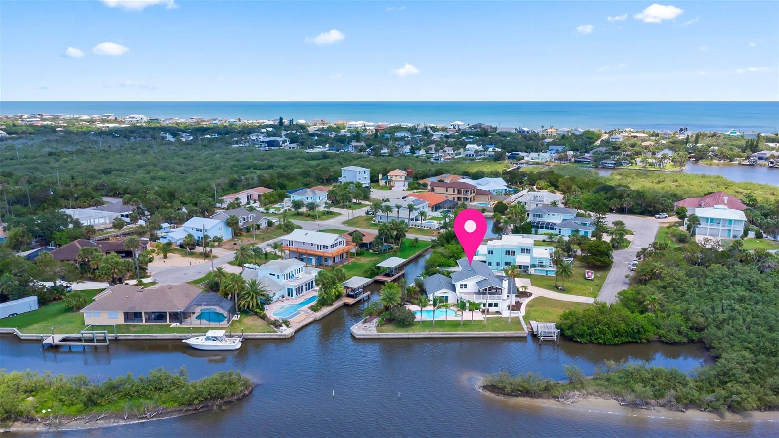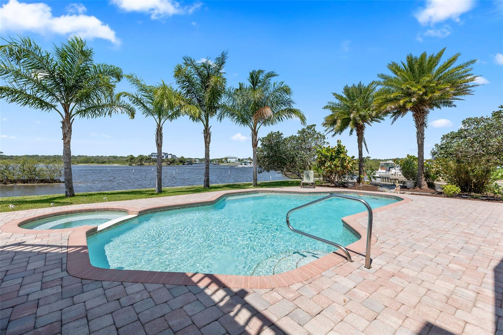 Experience the best of Florida living in this stunning two-story pool home, perfectly nestled on a spacious and private corner lot along a protected stretch of the Intracoastal Waterway. With your own boat lift and over 300 feet of waterfront, this home offers a rare blend of coastal charm, luxury, and convenience. From the moment you arrive, you’ll be drawn in by the exceptional curb appeal and thoughtfully designed interior. Step inside to find custom kitchen cabinetry that blends style and functionality, a dramatic open staircase that adds architectural flair, and a striking Moroccan chandelier in the living room for a touch of exotic elegance. The first-floor master suite serves as a peaceful retreat, featuring a beautifully updated en-suite bathroom with a freestanding soaking tub, dual vanities, and a spacious walk-in shower with elegant tile work, making it the perfect place to relax and recharge. Upstairs, two generously sized bedrooms provide comfort and privacy for family or guests. Step out onto the second-floor deck—partially covered and ideal for morning coffee or sunset cocktails—while enjoying breathtaking panoramic views of the Intracoastal, where dolphins play and sailboats glide by. Outside, the private pool invites you to unwind with stunning water views all around. Whether you’re entertaining or enjoying a quiet evening, this backyard oasis delivers unforgettable moments.