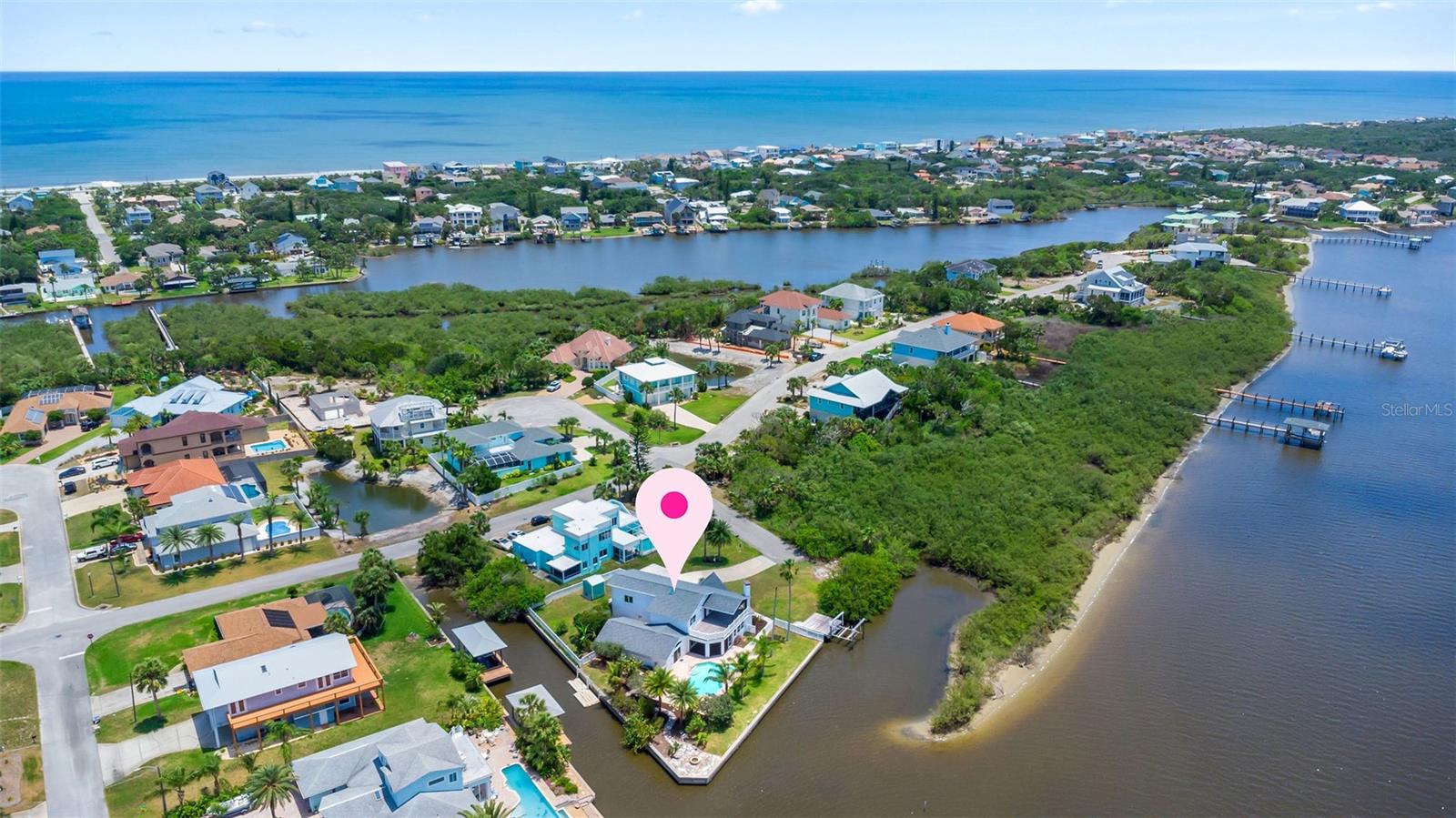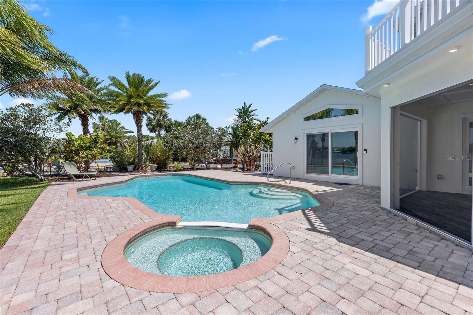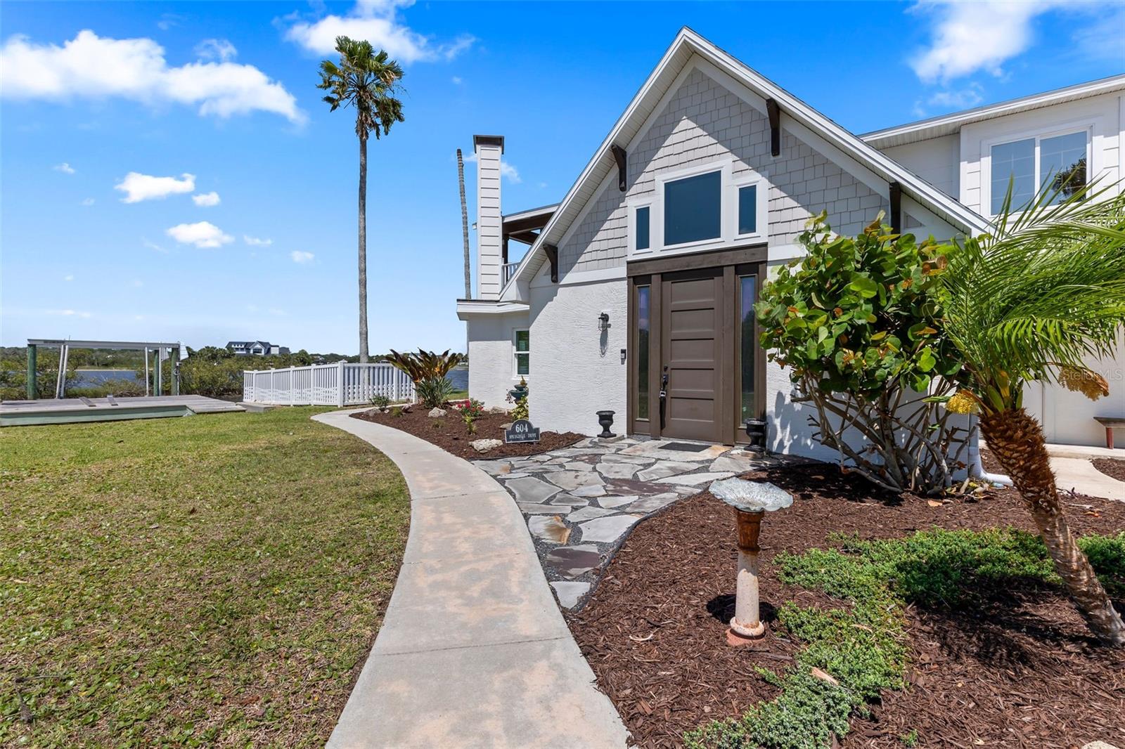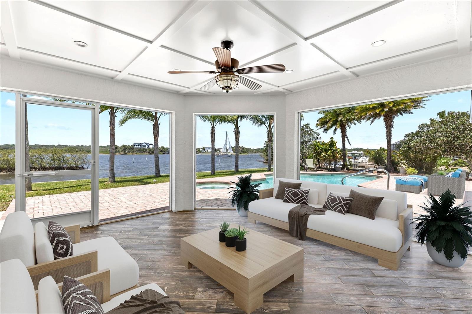 Experience the best of Florida living in this stunning two-story pool home, perfectly nestled on a spacious and private corner lot along a protected stretch of the Intracoastal Waterway. With your own boat lift and over 300 feet of waterfront, this home offers a rare blend of coastal charm, luxury, and convenience. From the moment you arrive, you’ll be drawn in by the exceptional curb appeal and thoughtfully designed interior. Step inside to find custom kitchen cabinetry that blends style and functionality, a dramatic open staircase that adds architectural flair, and a striking Moroccan chandelier in the living room for a touch of exotic elegance. The first-floor master suite serves as a peaceful retreat, featuring a beautifully updated en-suite bathroom with a freestanding soaking tub, dual vanities, and a spacious walk-in shower with elegant tile work, making it the perfect place to relax and recharge. Upstairs, two generously sized bedrooms provide comfort and privacy for family or guests. Step out onto the second-floor deck—partially covered and ideal for morning coffee or sunset cocktails—while enjoying breathtaking panoramic views of the Intracoastal, where dolphins play and sailboats glide by. Outside, the private pool invites you to unwind with stunning water views all around. Whether you’re entertaining or enjoying a quiet evening, this backyard oasis delivers unforgettable moments.