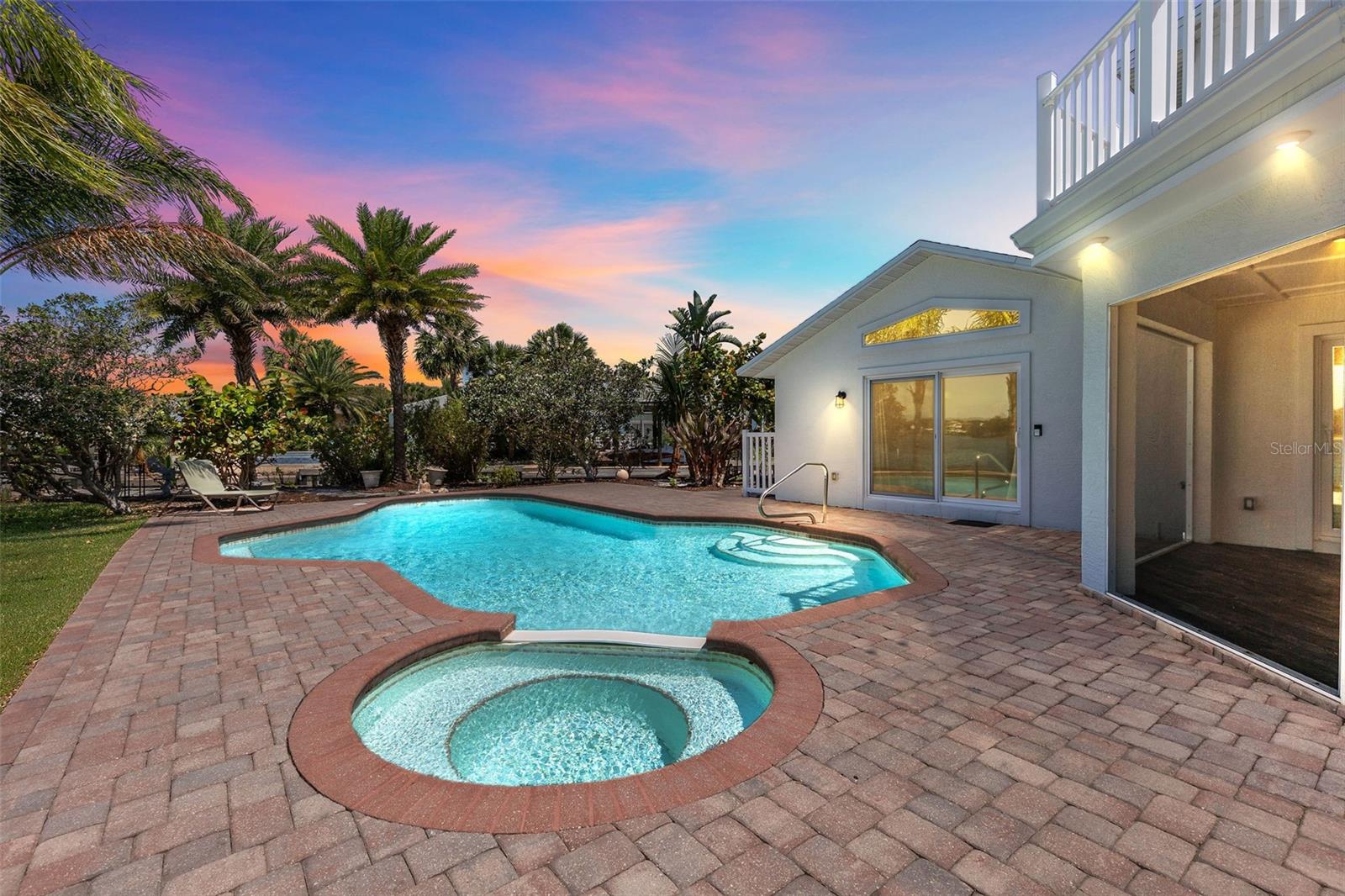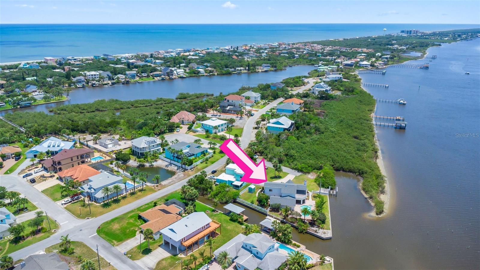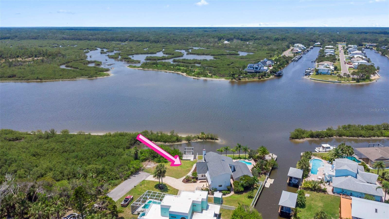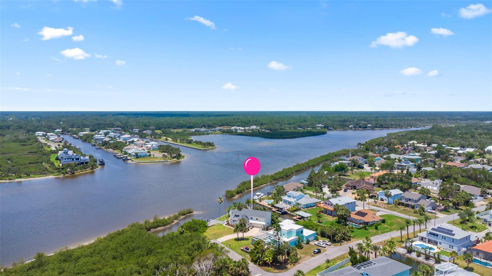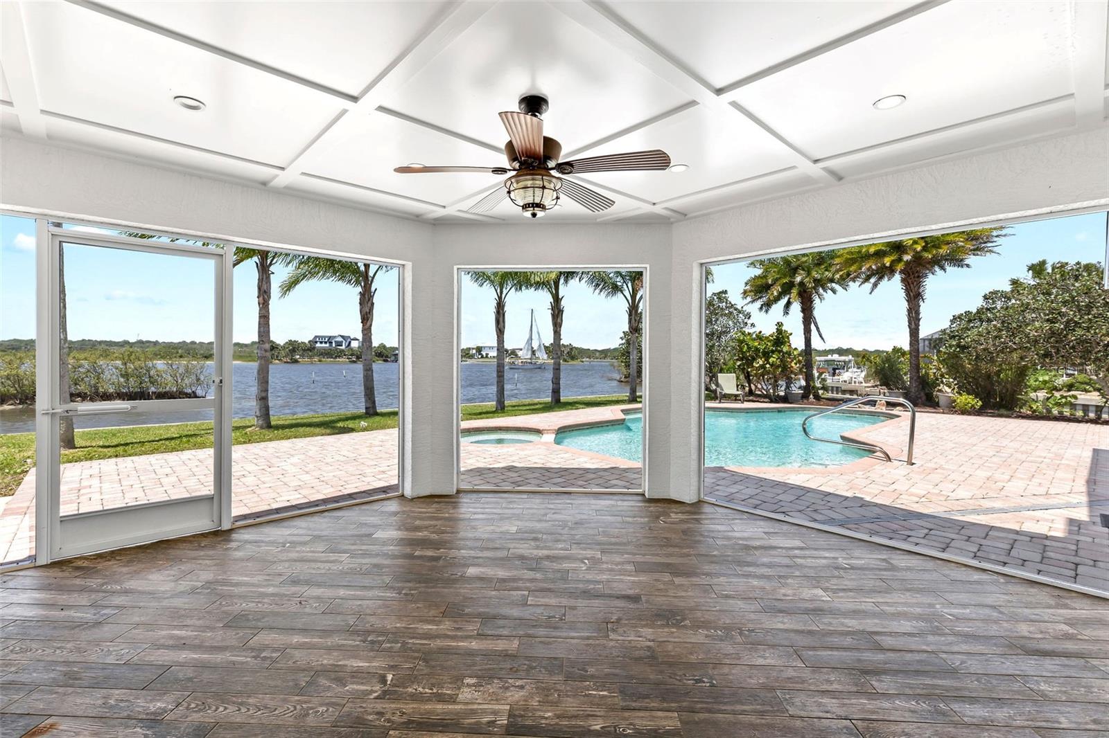 Experience the best of Florida living in this stunning two-story pool home, perfectly nestled on a spacious and private corner lot along a protected stretch of the Intracoastal Waterway. With your own boat lift and over 300 feet of waterfront, this home offers a rare blend of coastal charm, luxury, and convenience. From the moment you arrive, you’ll be drawn in by the exceptional curb appeal and thoughtfully designed interior. Step inside to find custom kitchen cabinetry that blends style and functionality, a dramatic open staircase that adds architectural flair, and a striking Moroccan chandelier in the living room for a touch of exotic elegance. The first-floor master suite serves as a peaceful retreat, featuring a beautifully updated en-suite bathroom with a freestanding soaking tub, dual vanities, and a spacious walk-in shower with elegant tile work, making it the perfect place to relax and recharge. Upstairs, two generously sized bedrooms provide comfort and privacy for family or guests. Step out onto the second-floor deck—partially covered and ideal for morning coffee or sunset cocktails—while enjoying breathtaking panoramic views of the Intracoastal, where dolphins play and sailboats glide by. Outside, the private pool invites you to unwind with stunning water views all around. Whether you’re entertaining or enjoying a quiet evening, this backyard oasis delivers unforgettable moments.