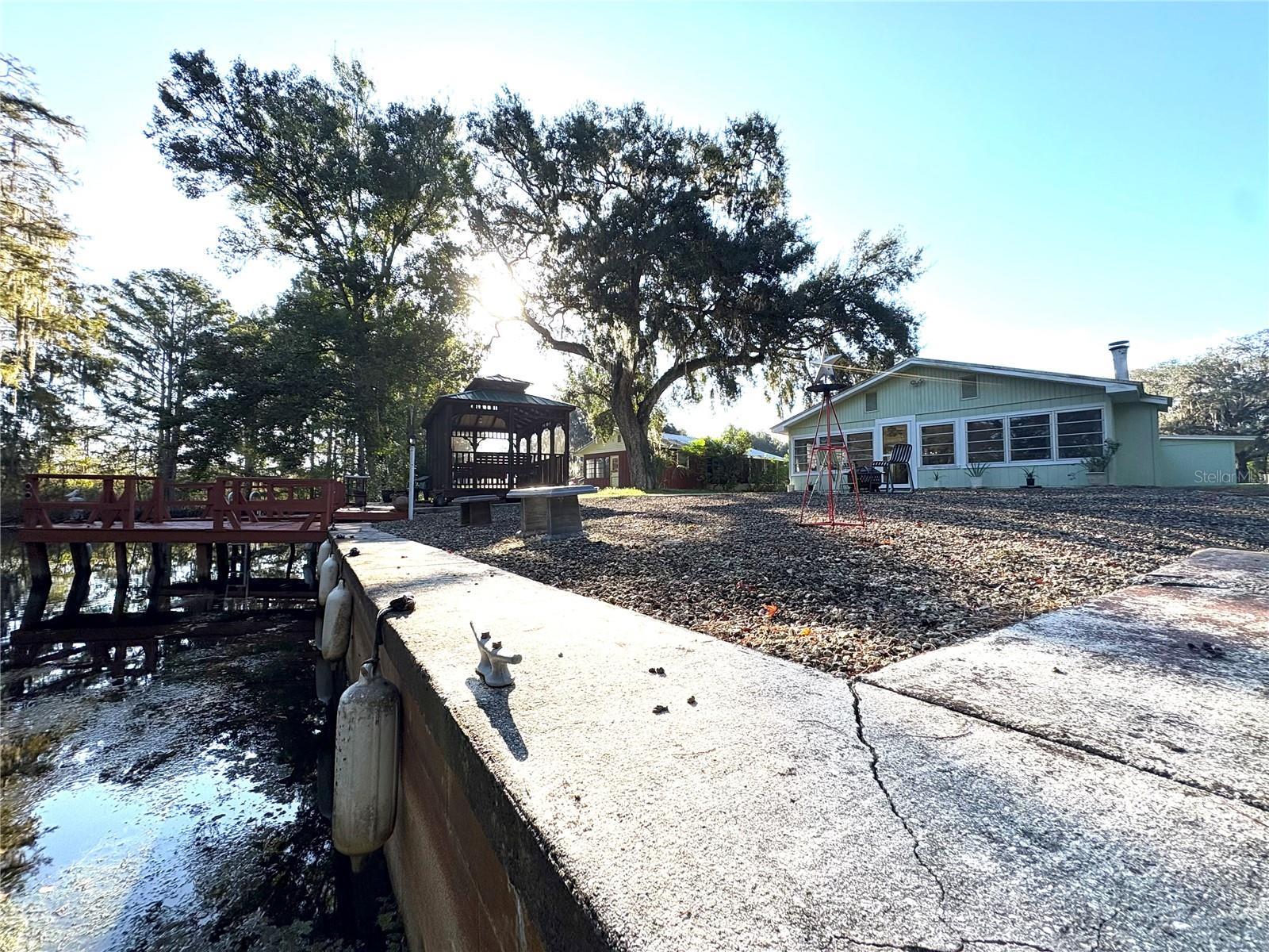 WATERFRONT! This .41 acre property includes 2 docks, a private boat ramp, & a CONCRETE BLOCK 3/2 home w/ concrete block garage. The home is large, w/ a living room & family room w/ wood burning fireplace overlooking the water. Each bedroom has a roomy closet, & there are multiple other rooms that can be offices, dens, playrooms, or even used as sleeping quarters. There’s a lanai the sellers used as a family game room, w/ split ductless AC, making it usable living space all year round! Watch the water from your swings in the gazebo while someone catches dinner. The roof is metal & this home has been lovingly cared for. The water here has a slow current(not stagnant), & there’s a fish cleaning sink on the dock. The canal, w/ 60 feet of concrete seawall, accesses the Chain of Lakes & the Withlacoochee River. There is an indoor spa as a bonus.