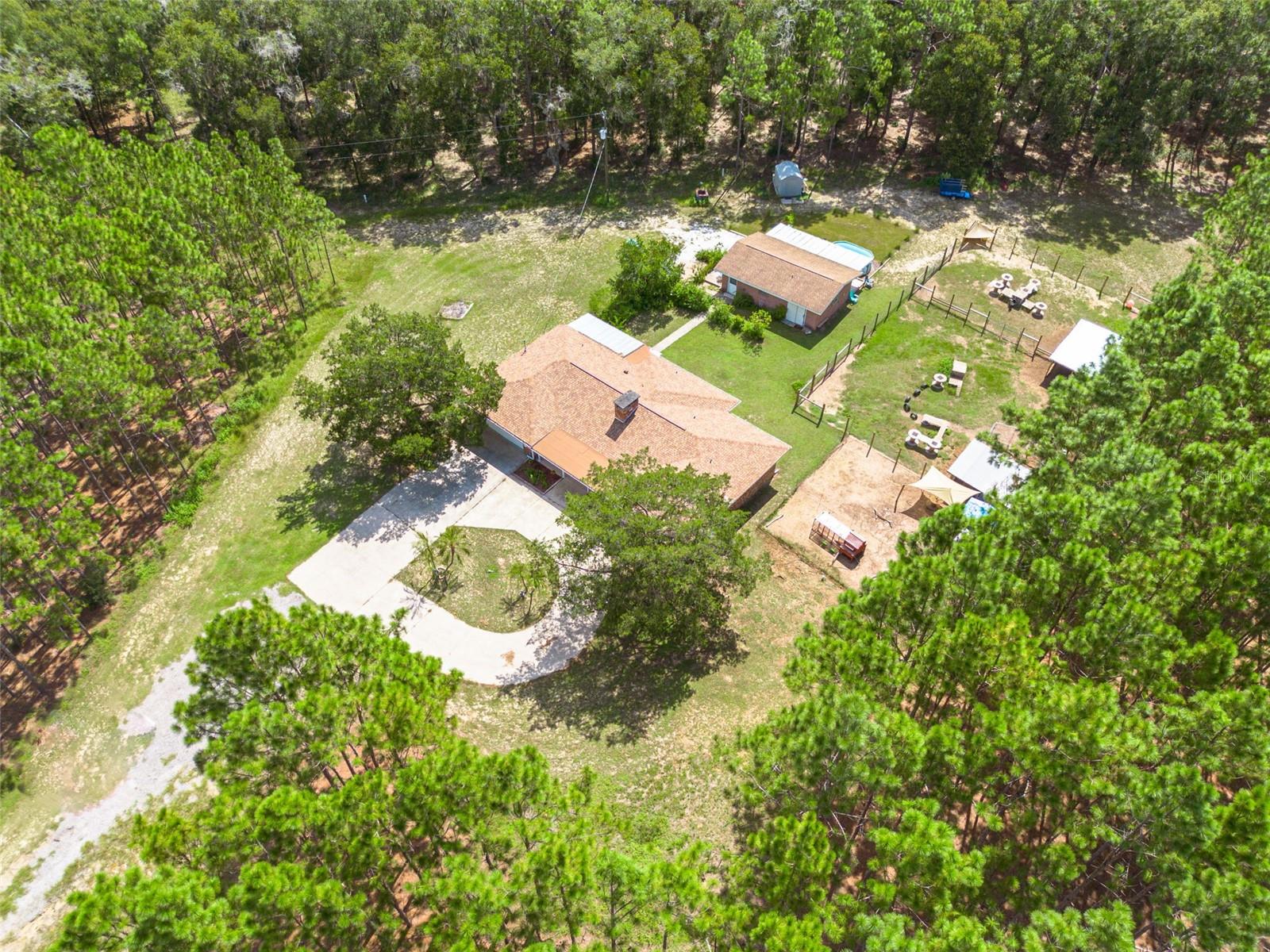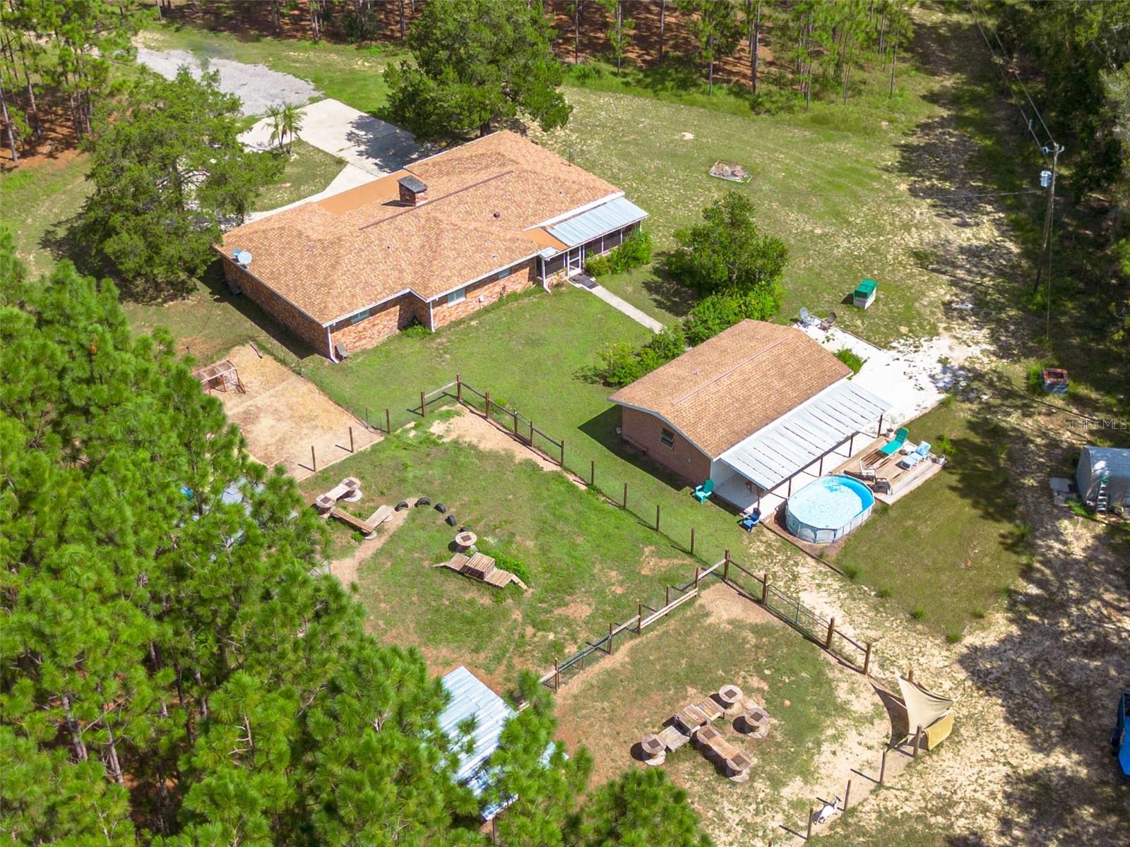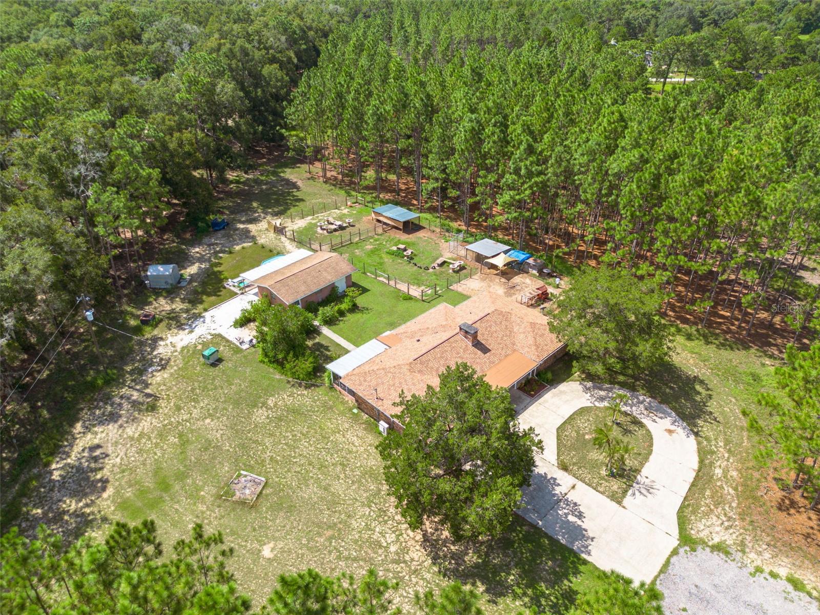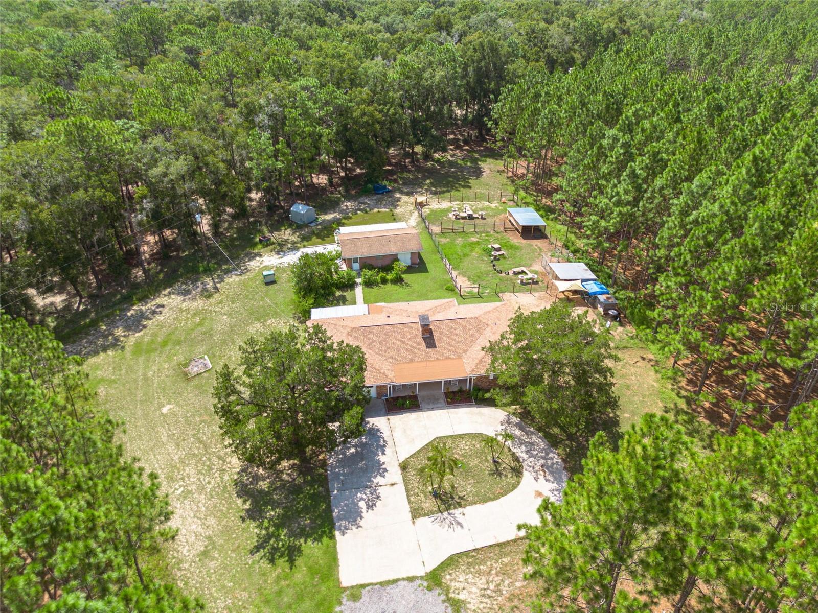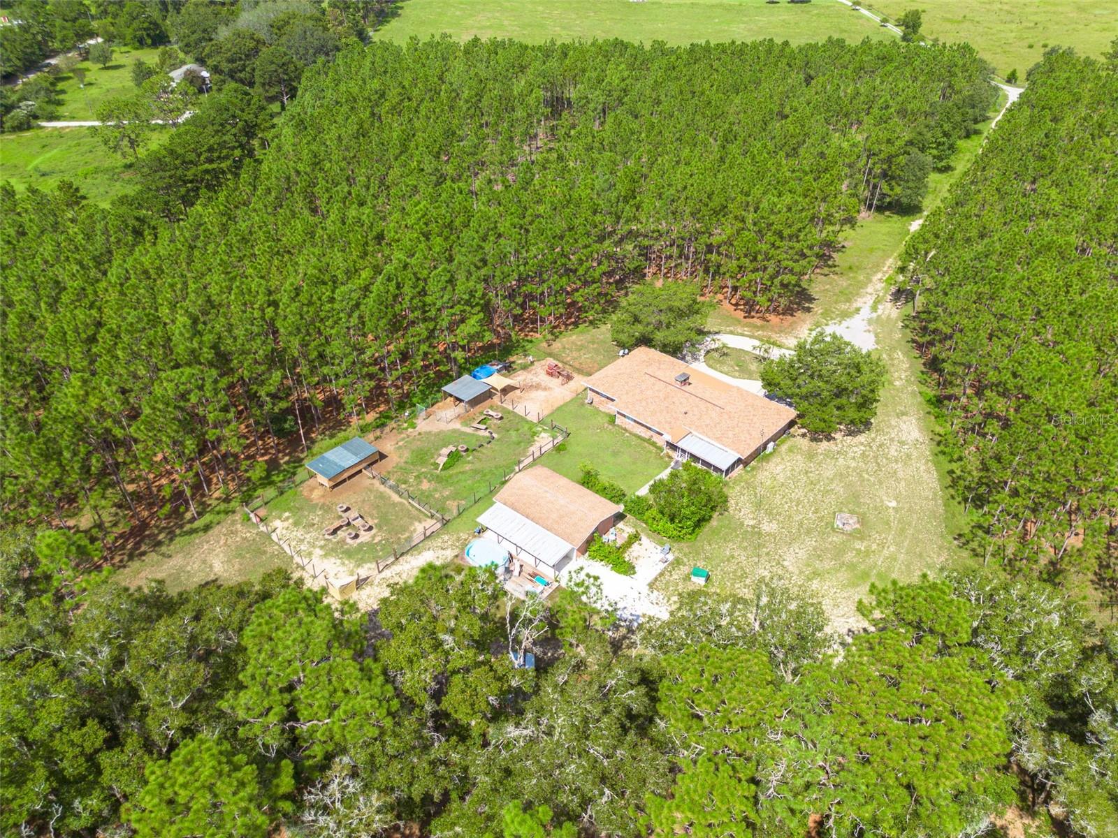 PRICE ADJUSTMENT!! HIGH & DRY!!! MOTIVATED SELLER!! Welcome to Peaceful Plantation, an idyllic retreat nestled on 10 lush, sprawling acres of long leaf pine trees that promises a serene escape from city life while offering ample space for your entire family and four- legged friends. This picturesque estate seamlessly blends modern comforts with rustic charm, creating a sanctuary designed for both relaxation and entertaining. The main residence appears at the end of a long uphill driveway featuring TWO generously sized bedrooms and TWO well-appointed bathrooms, one of which was recently upgraded. Other recent updates include a new roof, installed in June 2022, a new hot water heater added in May 2022, and in this past year modern enhancements such as a new, state of the art HVAC system, Spectrum high speed internet, septic drain field and large well water tank. The kitchen is a chef’s delight with white shaker solid wood cabinets, sleek quartz countertops, and an exquisite marble mosaic backsplash. High gloss, hickory flooring runs throughout the main living spaces, enhancing the home’s luxurious feel. The open living area is thoughtfully designed with dual fireplaces—one a built-in wood burning fireplace and the other a cast iron wood burning stove—providing warmth and ambiance. Large windows flood the home with natural light, while plantation shutters add a touch of elegance. The main house also includes a spacious 2 car garage, laundry room, pantry and a beautiful, screened lanai with new vinyl plank flooring surrounded by lush landscaping where hummingbirds and butterflies regularly visit. Step outside to discover expansive grounds perfect for gardening, recreation, or simply enjoying the tranquil scenery. Two wooden decks and above ground pool have been added in the past year. The property is equipped to accommodate animals, featuring two chicken coops and two fenced paddocks with sturdy well-built materials including shelters on each side, making it an ideal setting for horses, livestock or those yearning for a small farm lifestyle. Additionally, a charming separate dwelling on the property offers a versatile space that can serve as a mother-in-law suite, guest house, or rental unit. Current owner has used it as an Airbnb rental year-round. This secondary unit includes its own deck, driveway, kitchen, living area, bedroom, and bathroom, providing privacy and independence while keeping loved ones close. Other outdoor features include a versatile storage area or tack room attached to the separate dwelling and a sturdy metal shed for extra storage. This estate truly offers endless possibilities for peaceful living and entertaining. Don’t miss the chance to make this rare gem your own. Road leading up to the home has been updated as of 11/1/2024. PLEASE NOTE: THERE ARE 2 BEDROOMS, 2 BATHS IN THE MAIN HOME AND ONE BEDROOM AND ONE BATH IN THE COTTAGE.