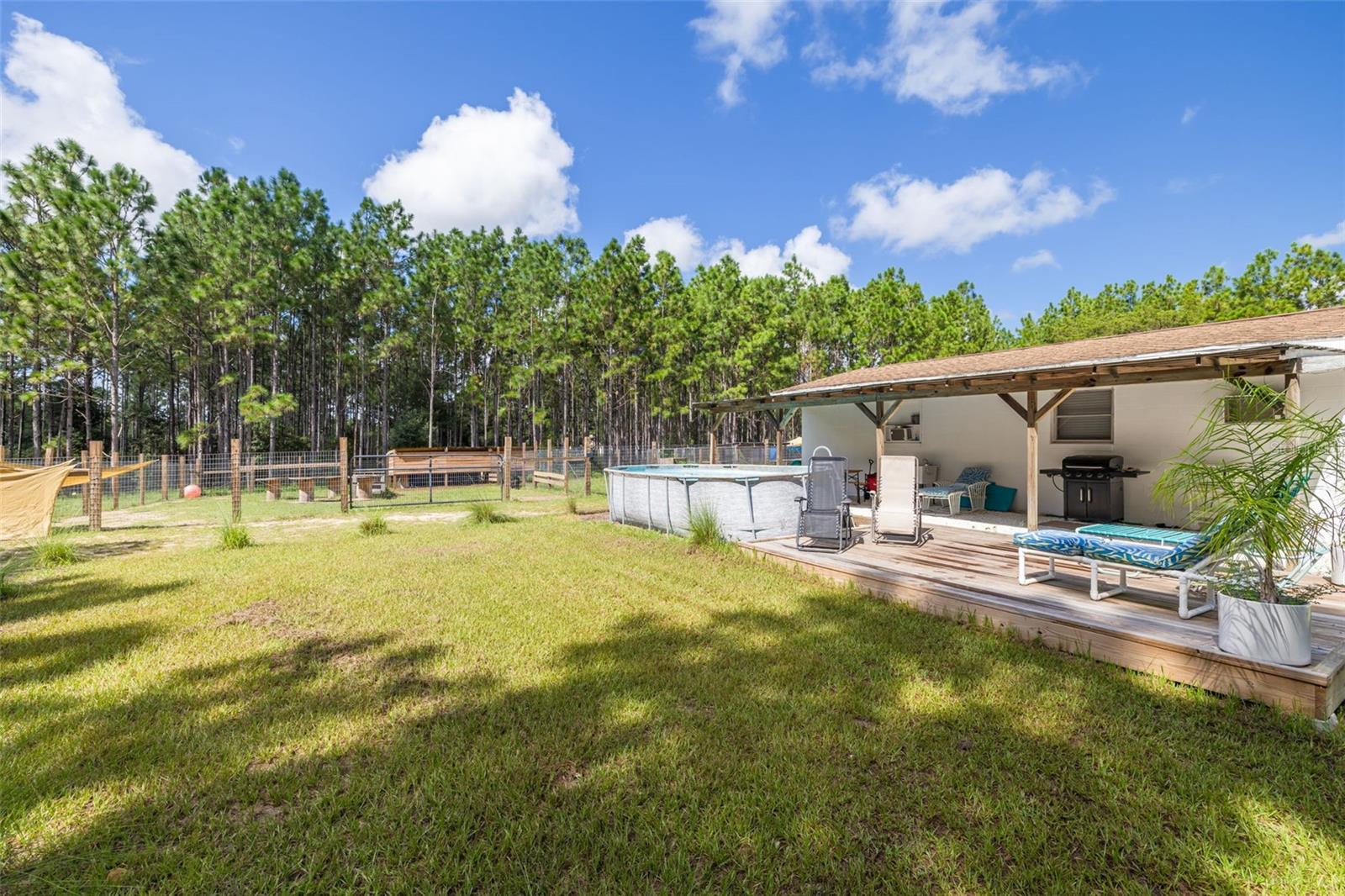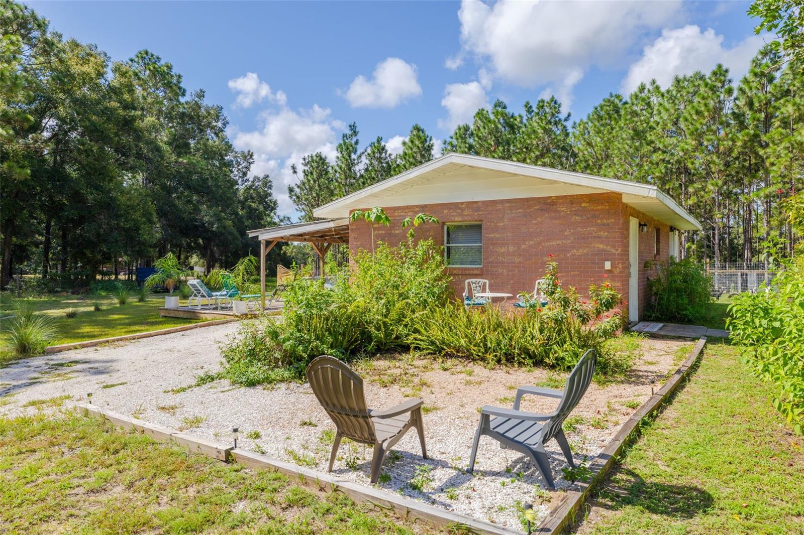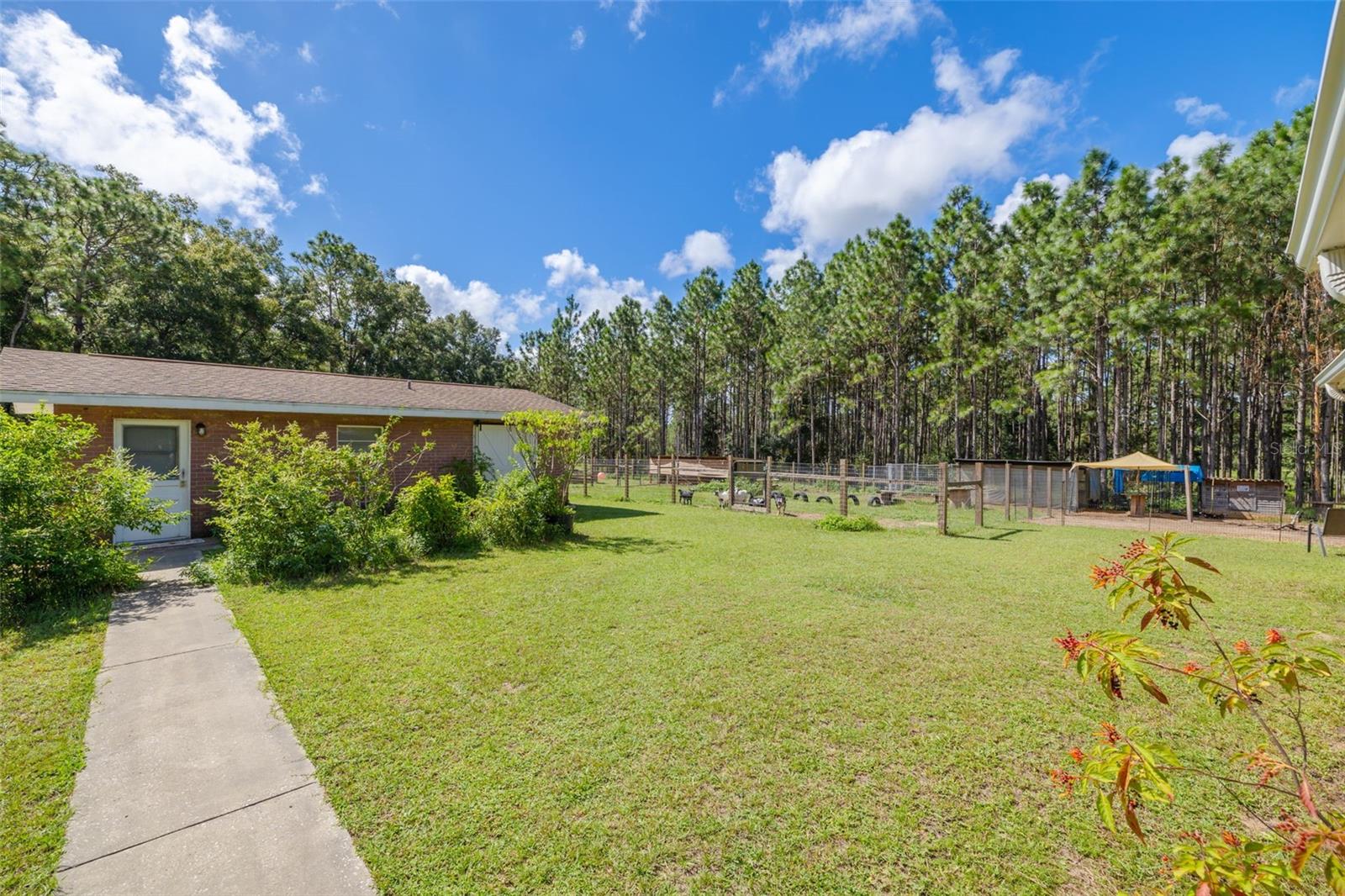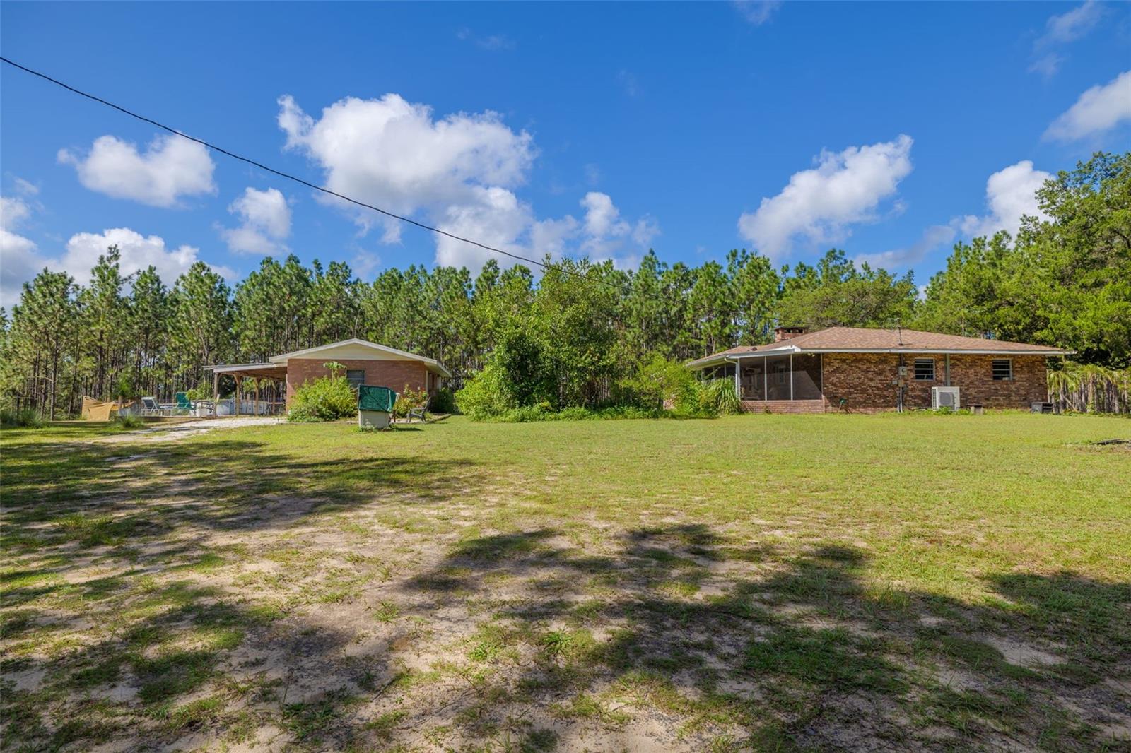 PRICE ADJUSTMENT!! HIGH & DRY!!! MOTIVATED SELLER!! Welcome to Peaceful Plantation, an idyllic retreat nestled on 10 lush, sprawling acres of long leaf pine trees that promises a serene escape from city life while offering ample space for your entire family and four- legged friends. This picturesque estate seamlessly blends modern comforts with rustic charm, creating a sanctuary designed for both relaxation and entertaining. The main residence appears at the end of a long uphill driveway featuring TWO generously sized bedrooms and TWO well-appointed bathrooms, one of which was recently upgraded. Other recent updates include a new roof, installed in June 2022, a new hot water heater added in May 2022, and in this past year modern enhancements such as a new, state of the art HVAC system, Spectrum high speed internet, septic drain field and large well water tank. The kitchen is a chef’s delight with white shaker solid wood cabinets, sleek quartz countertops, and an exquisite marble mosaic backsplash. High gloss, hickory flooring runs throughout the main living spaces, enhancing the home’s luxurious feel. The open living area is thoughtfully designed with dual fireplaces—one a built-in wood burning fireplace and the other a cast iron wood burning stove—providing warmth and ambiance. Large windows flood the home with natural light, while plantation shutters add a touch of elegance. The main house also includes a spacious 2 car garage, laundry room, pantry and a beautiful, screened lanai with new vinyl plank flooring surrounded by lush landscaping where hummingbirds and butterflies regularly visit. Step outside to discover expansive grounds perfect for gardening, recreation, or simply enjoying the tranquil scenery. Two wooden decks and above ground pool have been added in the past year. The property is equipped to accommodate animals, featuring two chicken coops and two fenced paddocks with sturdy well-built materials including shelters on each side, making it an ideal setting for horses, livestock or those yearning for a small farm lifestyle. Additionally, a charming separate dwelling on the property offers a versatile space that can serve as a mother-in-law suite, guest house, or rental unit. Current owner has used it as an Airbnb rental year-round. This secondary unit includes its own deck, driveway, kitchen, living area, bedroom, and bathroom, providing privacy and independence while keeping loved ones close. Other outdoor features include a versatile storage area or tack room attached to the separate dwelling and a sturdy metal shed for extra storage. This estate truly offers endless possibilities for peaceful living and entertaining. Don’t miss the chance to make this rare gem your own. Road leading up to the home has been updated as of 11/1/2024. PLEASE NOTE: THERE ARE 2 BEDROOMS, 2 BATHS IN THE MAIN HOME AND ONE BEDROOM AND ONE BATH IN THE COTTAGE.