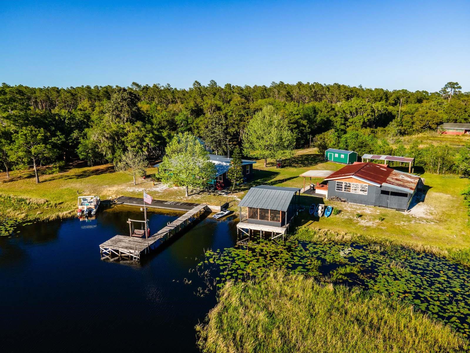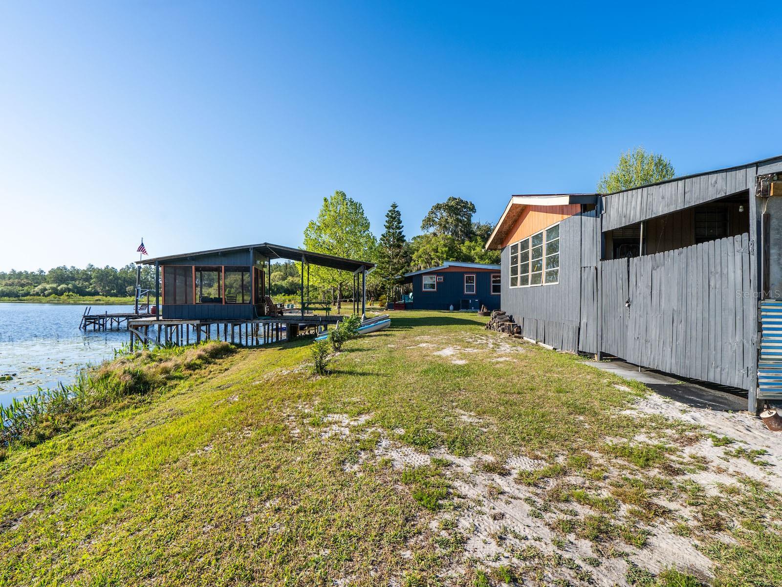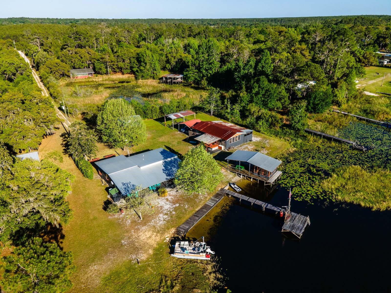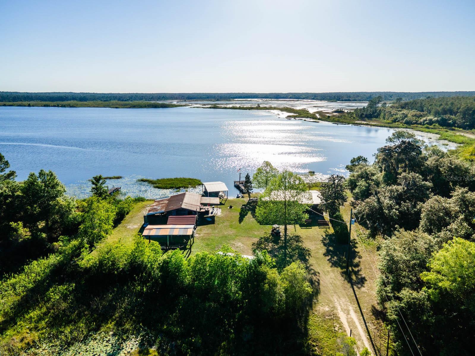 "Lake Delancy Delight" is the perfect description for this beautiful waterfront home on 1.81 acres. Lake front is approximately 200' with canal and pond approx. .80 acres. Waterfront included 2 docks, one is fishing pier and one is covered with open area and 14x14' screen room with power. Arriving at the home you are welcomed by spacious lot size with main home including 3 bedrooms, 2 bathrooms and 1519 living square feet. There is also 966 square foot lakeside building with open floor plan hang out room, kitchen area, half bath, workshop and storage(seller calls it the "The Dog House"). Entering the main home you will see open living room and dining room floor plan with french door and lots of windows inviting bright natural light and stunning lake views. Kitchen is nice size with solid wood cabinets, lots of counter space and includes range, microwave and refrigerator. Main bedroom is oversized with lots of windows, natural light and stunning lake views. Main bathroom is cozy with tiled shower, updated vanity with marble top. Guest bedrooms are cozy in size and guest bathroom includes steel tub/shower combo with subway tile, pedestal sink and single vanity. Rear covered porch is full length with lovely seating and wonderful sunset views overlooking lake. Property also includes several covered parking area and 14'x42' lean to for storage and bigger toys. There is also a metal storage shed which is perfect for your 4 wheelers and lawn equipment. Also, hand water pump just in case power ever goes out. Located in the heart of the Ocala National Forest w/ beautiful Salt Springs swim area, boat launch and short ride to Lake George and the St. Johns River. Close to local shopping including grocery store, Dollar General, hardware, gas station, great restaurants, entertainment and more. Salt Springs is also home to miles and miles of ATV/SxS, Horseback and hiking trails. If you’re a fisherman, or hunter or simply love hiking, canoeing or kayaking you are in luck! Minutes to Ocklawaha River, Ocala National Forest, and many natural springs(Salt Springs, Silver Glen Springs, Juniper Springs), horseback and walking trails, and off-road vehicle trails await your explorations. One-of-a-kind property and location! Ready for new owners! Deer, turkey, sandhill cranes and more will be your new neighbors and visit regularly.