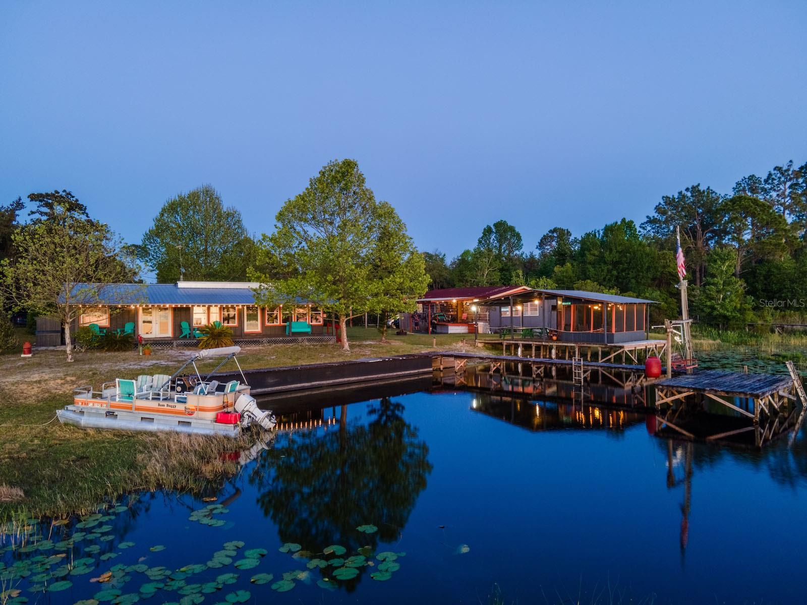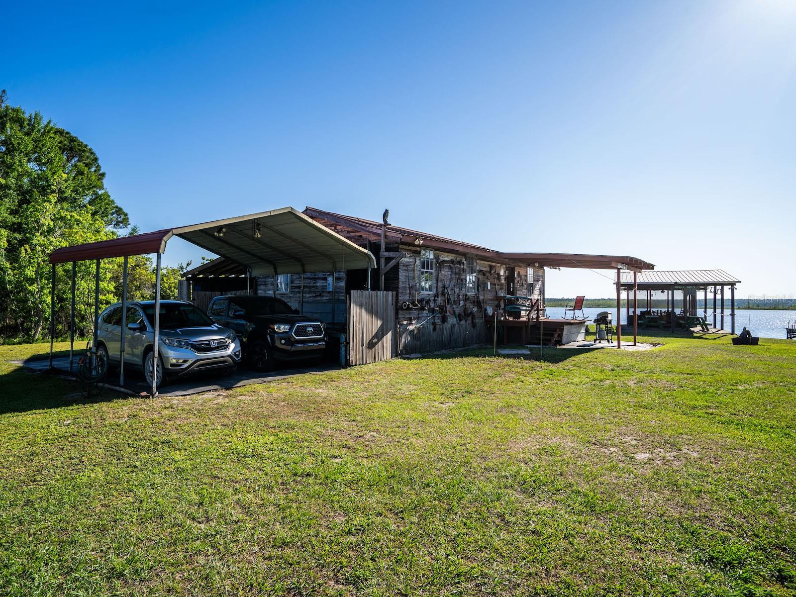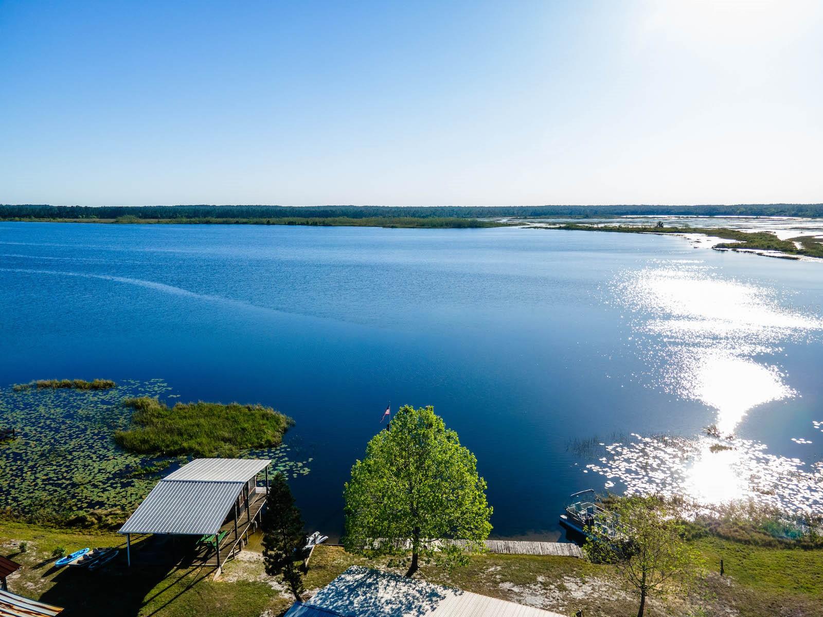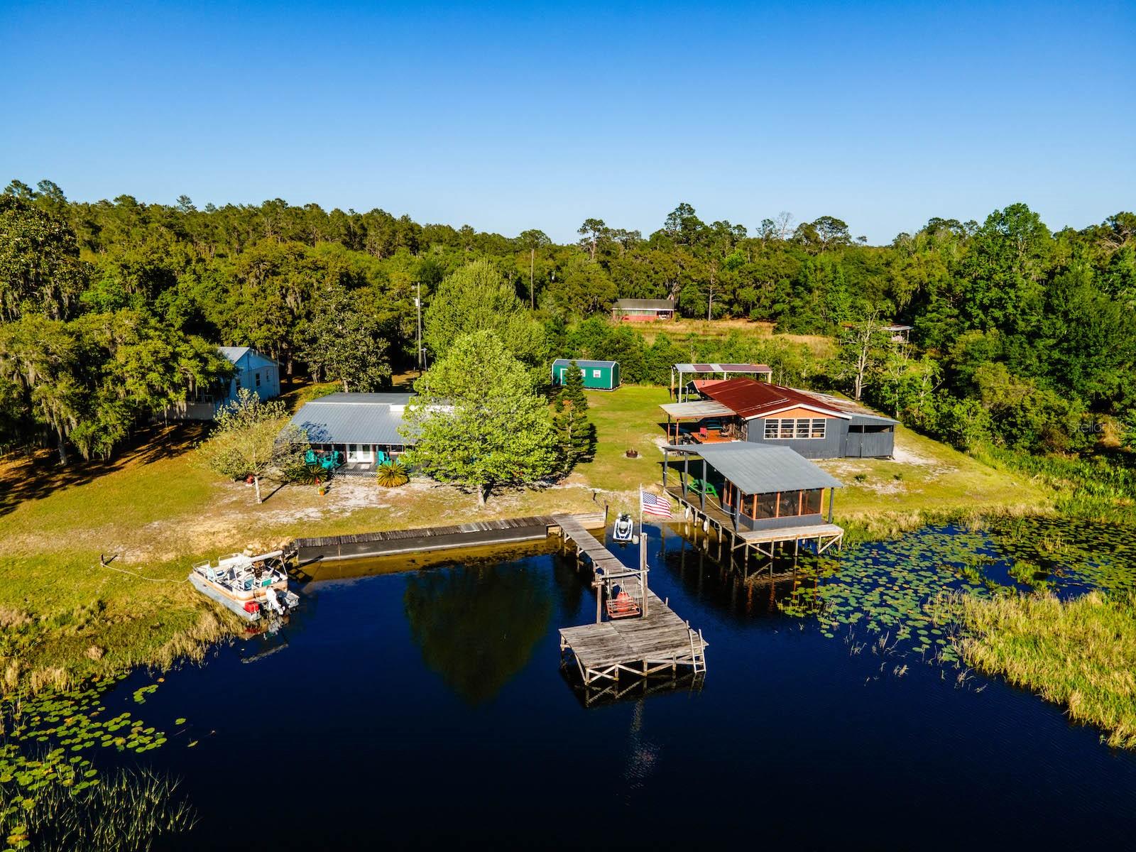 "Lake Delancy Delight" is the perfect description for this beautiful waterfront home on 1.81 acres. Lake front is approximately 200' with canal and pond approx. .80 acres. Waterfront included 2 docks, one is fishing pier and one is covered with open area and 14x14' screen room with power. Arriving at the home you are welcomed by spacious lot size with main home including 3 bedrooms, 2 bathrooms and 1519 living square feet. There is also 966 square foot lakeside building with open floor plan hang out room, kitchen area, half bath, workshop and storage(seller calls it the "The Dog House"). Entering the main home you will see open living room and dining room floor plan with french door and lots of windows inviting bright natural light and stunning lake views. Kitchen is nice size with solid wood cabinets, lots of counter space and includes range, microwave and refrigerator. Main bedroom is oversized with lots of windows, natural light and stunning lake views. Main bathroom is cozy with tiled shower, updated vanity with marble top. Guest bedrooms are cozy in size and guest bathroom includes steel tub/shower combo with subway tile, pedestal sink and single vanity. Rear covered porch is full length with lovely seating and wonderful sunset views overlooking lake. Property also includes several covered parking area and 14'x42' lean to for storage and bigger toys. There is also a metal storage shed which is perfect for your 4 wheelers and lawn equipment. Also, hand water pump just in case power ever goes out. Located in the heart of the Ocala National Forest w/ beautiful Salt Springs swim area, boat launch and short ride to Lake George and the St. Johns River. Close to local shopping including grocery store, Dollar General, hardware, gas station, great restaurants, entertainment and more. Salt Springs is also home to miles and miles of ATV/SxS, Horseback and hiking trails. If you’re a fisherman, or hunter or simply love hiking, canoeing or kayaking you are in luck! Minutes to Ocklawaha River, Ocala National Forest, and many natural springs(Salt Springs, Silver Glen Springs, Juniper Springs), horseback and walking trails, and off-road vehicle trails await your explorations. One-of-a-kind property and location! Ready for new owners! Deer, turkey, sandhill cranes and more will be your new neighbors and visit regularly.