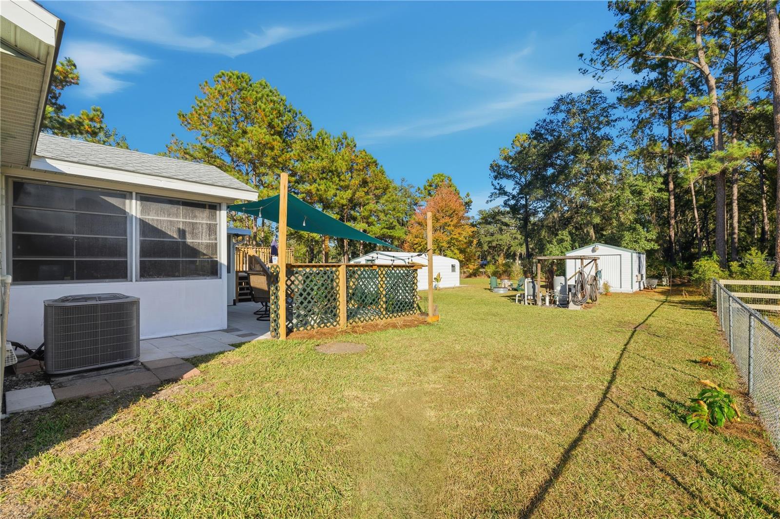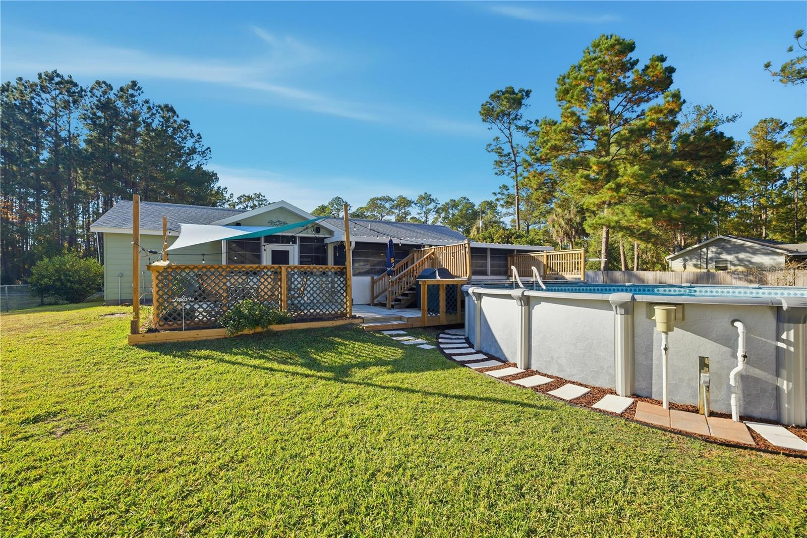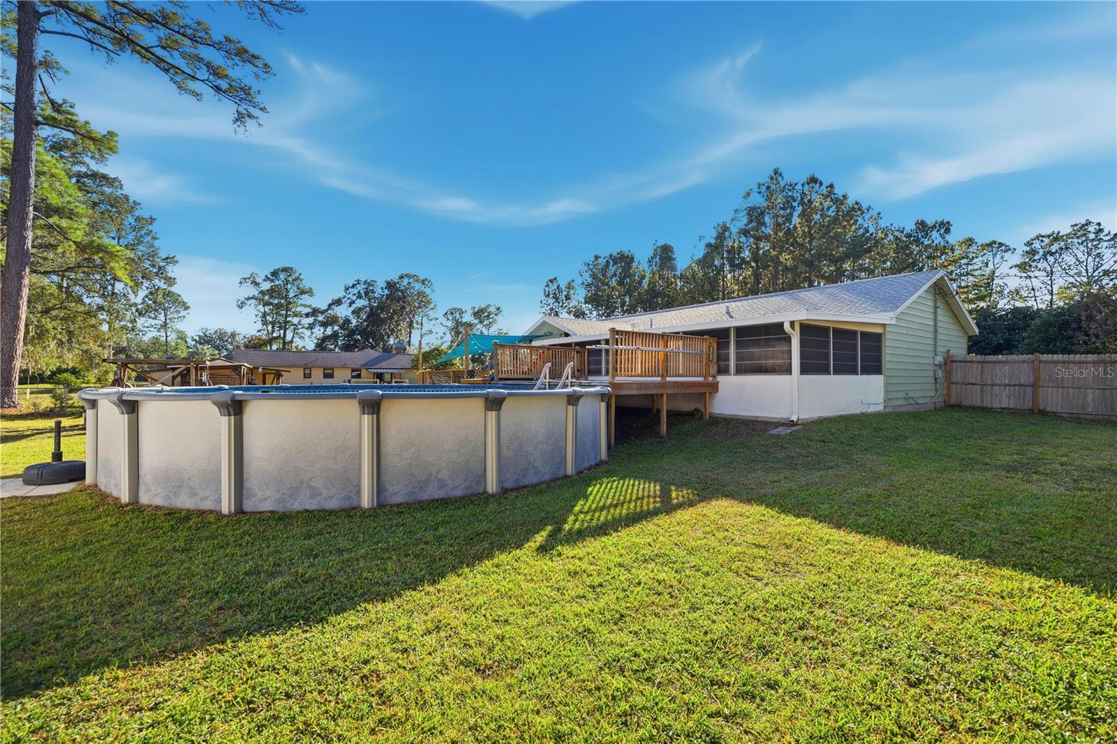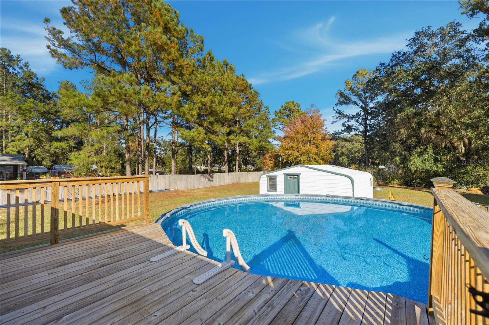 HALF ACRE LOT! WORKSHOP! 27' ABOVE GROUND POOL! CUL DE SAC! FRESH EXTERIOR PAINT! This charming 3-bedroom, 2-bathroom home offers 1,008 sq ft of living space on a spacious 0.51-acre lot. A welcoming 5' x 18' screened front porch leads into a bright, open living area. The kitchen features abundant cabinets, plenty of countertop space, and stainless-steel appliances. The primary bedroom includes an ensuite bath with a marble-top vanity and tiled tub/shower. Guest bedrooms are bright with generous closets, and the guest bathroom has a tile surround with fiberglass shower. Luxury vinyl plank flooring (2019) flows throughout. A rear slider opens to an over 550 sq ft Florida room with insulated metal roof, vinyl windows, and window HVAC, overlooking the above-ground pool with 12' x 16' wood deck. The fully fenced backyard also offers an extended brick paver patio with sail cover, perfect for relaxing or entertaining. A standout feature is the 20' x 20' workshop with full power, LED lighting, and solar ventilation fans, ideal for hobbies, storage, or projects. Additional storage includes a shed. Recent updates: 2019 (interior paint, flooring, outlets & switches), approximate 2020 pool and deck, 2021 (HVAC), 2023 (roof). Located minutes from downtown Fort McCoy with groceries, medical offices, hardware, gas, and dining nearby. Outdoor enthusiasts will enjoy a quick 5-minute drive to the Ocala National Forest, 3-minute drive to the Ocklawaha River, 3-minute drive to the Ocklawaha Canoe Outpost and Resort. Silver Springs State Park, Rodman Reservoir, and nearby natural springs—perfect for boating, fishing, hiking, and kayaking. All furniture is negotiable. Call and make your appointment to see today!