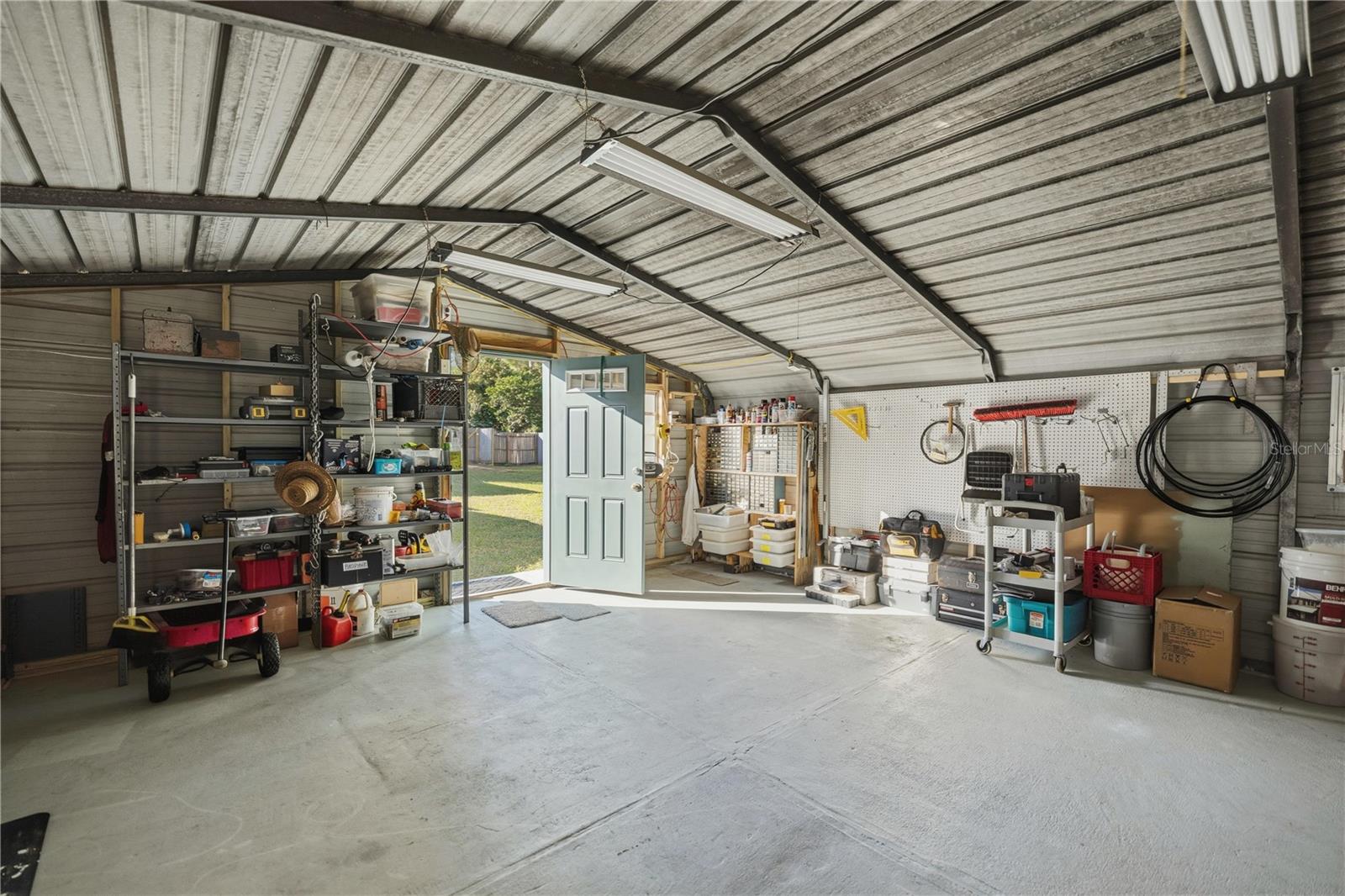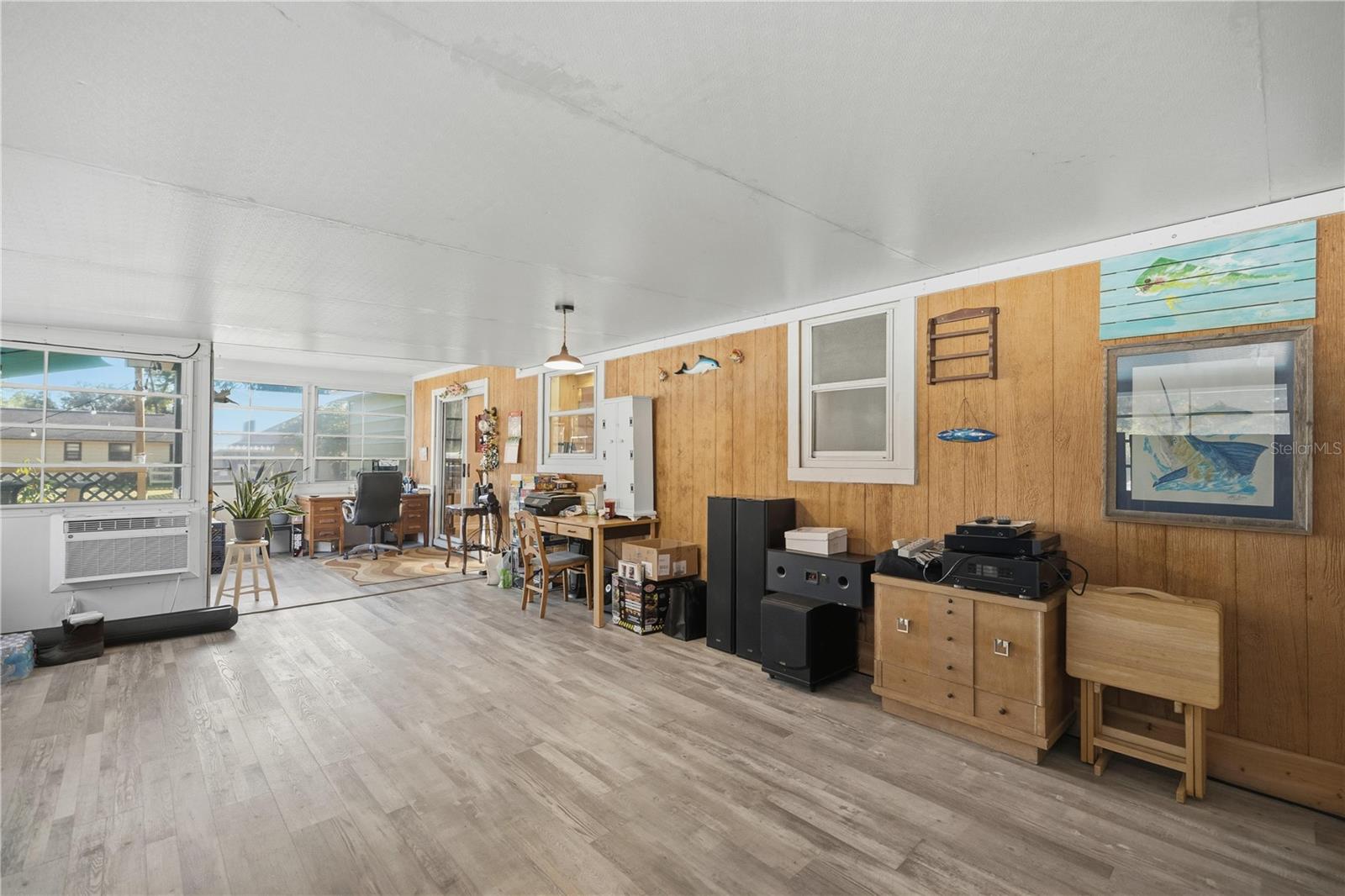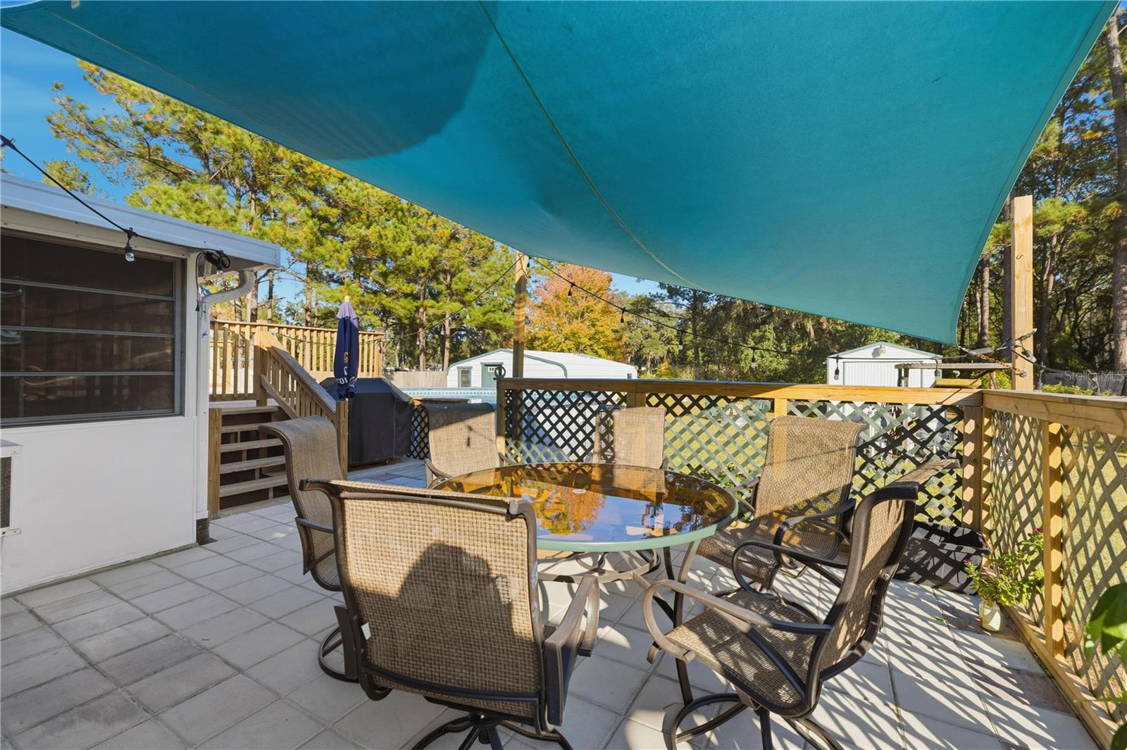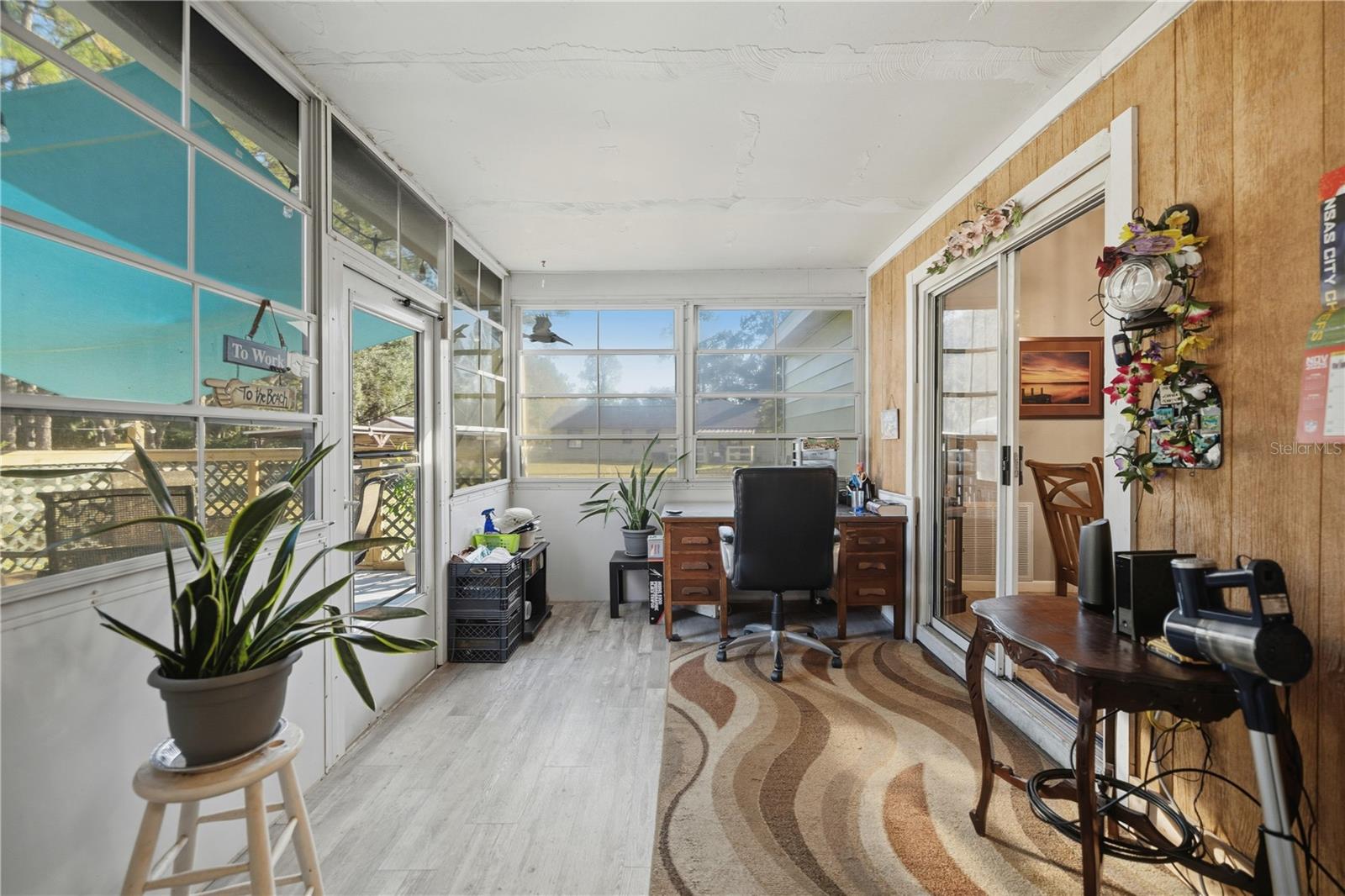 HALF ACRE LOT! WORKSHOP! 27' ABOVE GROUND POOL! CUL DE SAC! FRESH EXTERIOR PAINT! This charming 3-bedroom, 2-bathroom home offers 1,008 sq ft of living space on a spacious 0.51-acre lot. A welcoming 5' x 18' screened front porch leads into a bright, open living area. The kitchen features abundant cabinets, plenty of countertop space, and stainless-steel appliances. The primary bedroom includes an ensuite bath with a marble-top vanity and tiled tub/shower. Guest bedrooms are bright with generous closets, and the guest bathroom has a tile surround with fiberglass shower. Luxury vinyl plank flooring (2019) flows throughout. A rear slider opens to an over 550 sq ft Florida room with insulated metal roof, vinyl windows, and window HVAC, overlooking the above-ground pool with 12' x 16' wood deck. The fully fenced backyard also offers an extended brick paver patio with sail cover, perfect for relaxing or entertaining. A standout feature is the 20' x 20' workshop with full power, LED lighting, and solar ventilation fans, ideal for hobbies, storage, or projects. Additional storage includes a shed. Recent updates: 2019 (interior paint, flooring, outlets & switches), approximate 2020 pool and deck, 2021 (HVAC), 2023 (roof). Located minutes from downtown Fort McCoy with groceries, medical offices, hardware, gas, and dining nearby. Outdoor enthusiasts will enjoy a quick 5-minute drive to the Ocala National Forest, 3-minute drive to the Ocklawaha River, 3-minute drive to the Ocklawaha Canoe Outpost and Resort. Silver Springs State Park, Rodman Reservoir, and nearby natural springs—perfect for boating, fishing, hiking, and kayaking. All furniture is negotiable. Call and make your appointment to see today!