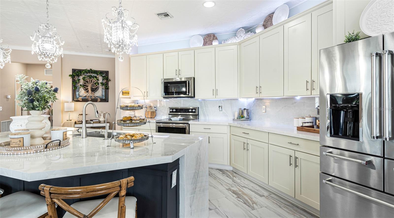 LOWEST PRICED UNIT ON THIS COMMUNITY WITH LAKE VIEWS*****MOTIVATED SELLER*** PRICE REDUCTION**THIS IS THE ONE**** GREAT AMAZING LAKE VIEWS Second Foor Unit With 3 BEDROOMS 2 BATHS ****Updates Galore, starting with Pet Resistant Plush Stair Carpet (grey) The rest of the home has LUXURY Vinyl Plank Tile Throughout it, an open floor plan, and split bedrooms, THE CHEF in the family will love this kitchen, wood cabinets, Marbleized stone countertops with matching backsplash, great lake views from the living room, and dining room a Crystal Chandelier, ALL flow to the Designer Ceramic Stone tile in the lanai floor and walls, Storm Smart Hurricane wind abatement Electric Roll Down Screens, impact windows, Decorative Ceiling Tile, great/living room, dining, kitchen, and foyer. Large Master bedroom with a huge walking closet, double sink marbleized stone countertops, walk-in tiled shower invisible shower glass door with soap Ledge and decorative Medicine Cabinets, second bathroom with tub and tiled shower with designer Listelos, Den with French doors. Inside the Laundry room plenty of storage, and wainscoting. and more upgrades are listed in the attached list in the MLS