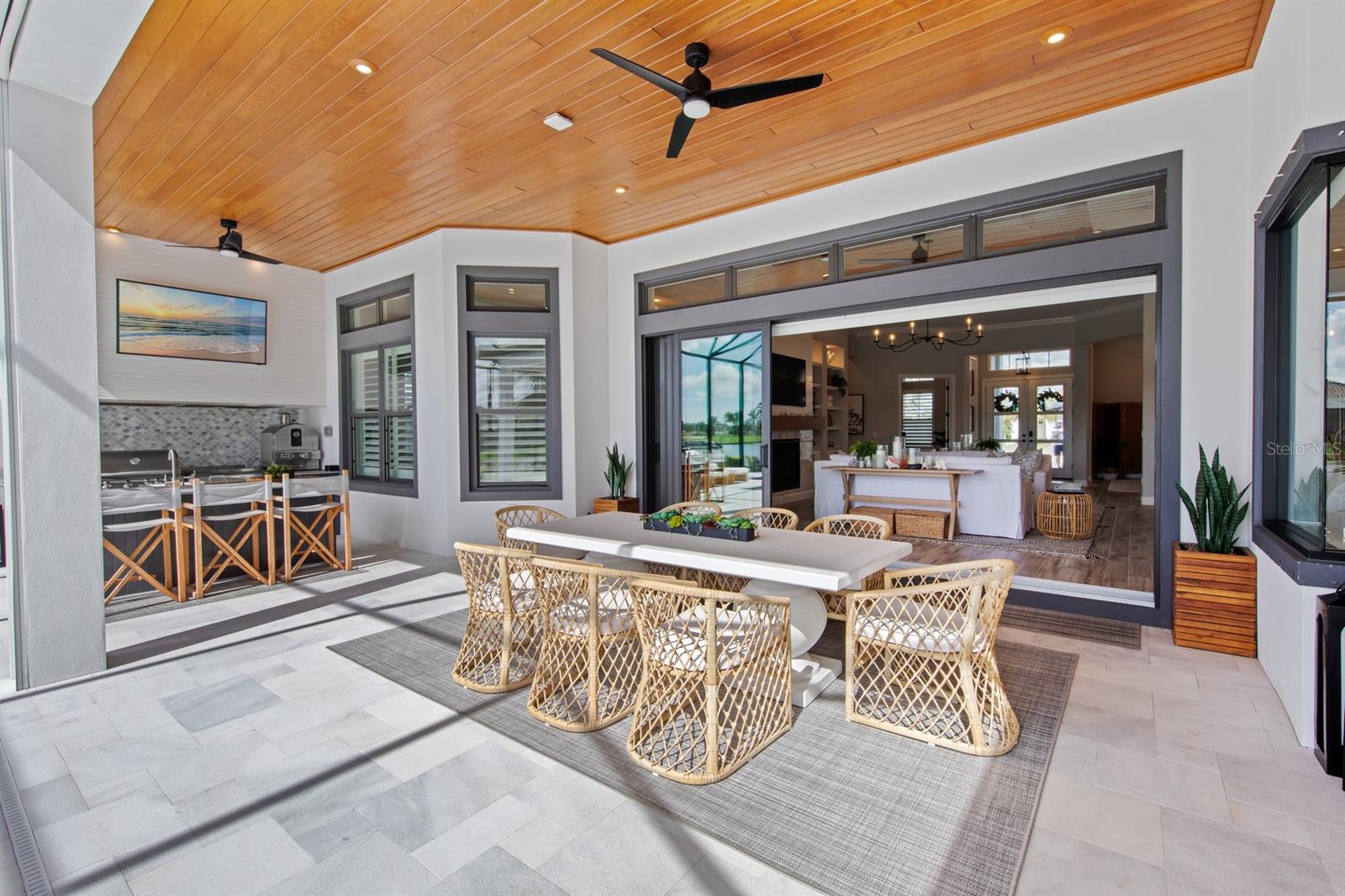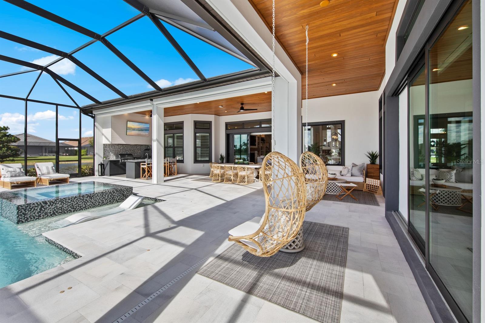 Welcome to the pinnacle of waterfront living in Esplanade Lake Club, where refined elegance meets exceptional design. Nestled on a rare and coveted cul-de-sac lot, this Southern-facing estate offers unmatched privacy, tranquility, and panoramic water views. With an expansive lake view and a private boat dock, this home is a true sanctuary. Every detail evokes the sophistication of a luxury model home, with curated upgrades and premium finishes that look as though they belong in the pages of a design magazine. The open-concept layout features 5 bedrooms plus a den, 4 full baths, 2 half baths, and a 3-car garage. The great room captivates with custom ceiling details, a natural gas fireplace, and serene water views. The first-floor master suite is a private retreat with a spa-like en-suite bathroom and generous walk-in closets. A chef’s kitchen shines with GE Café appliances, quartz countertops, a reverse-osmosis water system, and a large walk-in pantry. Upstairs, a bonus room with a kitchenette and a guest suite with custom built-ins complete the versatile design. The outdoor living space is an entertainer’s dream, with a heated custom pool, infinity-edge spa, sun-shelf, and custom putting green. The fully equipped outdoor kitchen features a Blaze gas grill, Summerset pizza oven, refrigerator, and more, all beneath a Cypress wood ceiling with electric roll-down screens for added comfort. Additional highlights include impact-resistant windows and doors, a 26kW Generac Guardian Natural Gas generator, and meticulous designer details throughout. Situated in Esplanade Lake Club, a 352-acre gated lakefront community centered around Lake Como, this home offers resort-style amenities, including a lakefront beach, Bahama Bar & Grille, fitness center, tennis, pickleball, bocce courts, a dog park, and more. Its location also provides convenient access to RSW Airport, Gulf Coast Town Center, Hertz Arena, and world-class shopping and dining. This is a rare opportunity to own a move-in-ready estate home in one of Southwest Florida’s most sought-after communities. Schedule your private tour today!