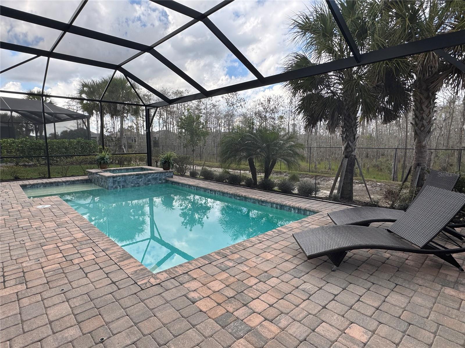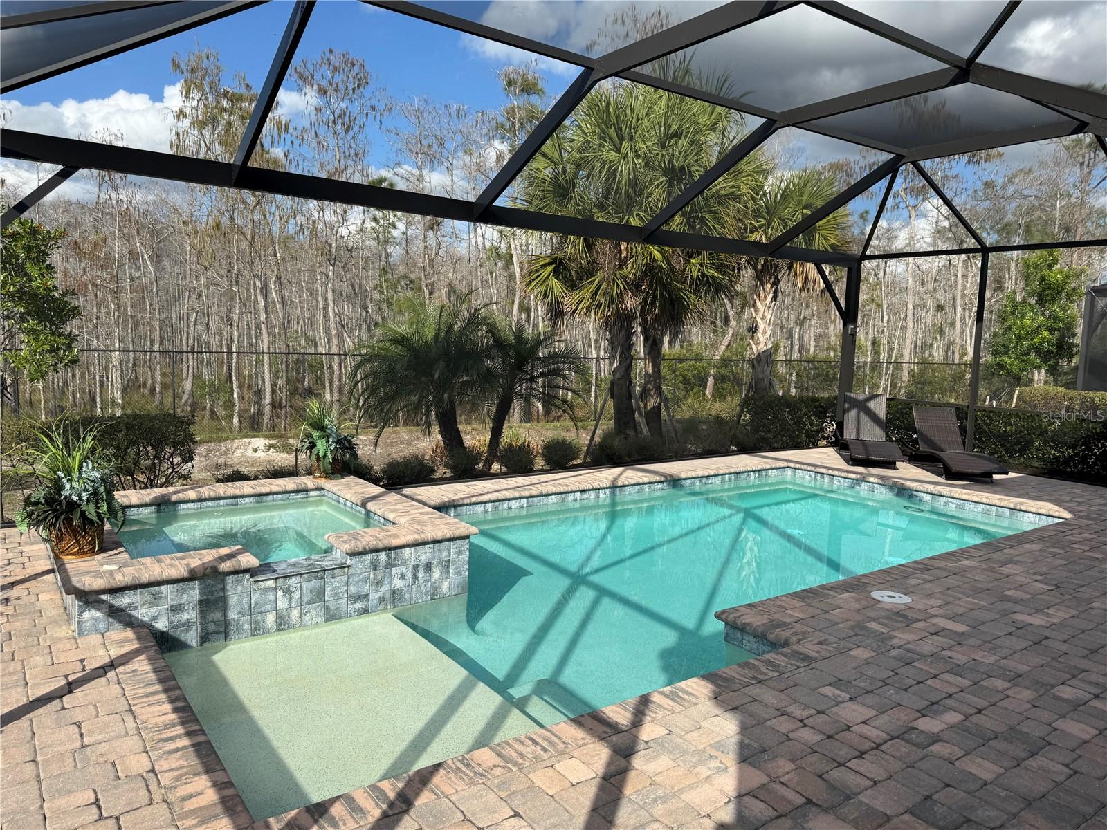 360 TOUR: Lennar MARIA Model: Inspired by coastal design and thoughtfully appointed, this stunning residence offers 4 bedrooms (flex:den/office), 3 full baths, 2-car garage, and deluxe pool/hot tub set on a beautifully landscaped homesite backing to a tranquil wooded preserve. The open, light-filled floor plan is complemented by soaring 10–12 foot ceilings, tray ceiling details, hurricane-impact windows, sliding glass doors in an X No Flood Zone with low insurance. Designed for both everyday comfort and entertaining, the home features a deluxe panoramic screened-in lanai with natural gas outdoor kitchen, a resort-style heated pool with hot tub, creating a serene outdoor retreat with peaceful wooded preserve views. Lush landscaping enhances privacy and curb appeal. There is an exceptional level of luxury that features ultra-modern light fixtures, decorative walls, modern window coverings, wood cabinetry, quartz countertops, GE stainless steel appliances, under-cabinet lighting, soft-close cabinetry, pull-out shelving, exterior-vented range hood and GE washer and dryer. The open-concept living area is the perfect place to entertain friends and family. Cook up your favorite recipe in the bright kitchen, which has plenty of counter and cabinet space along with a walk-in pantry. The dining area seats 8 or more comfortably under ultra-modern lighting and surrounded by exceptional artwork. The living area has plenty of space to watch your favorite shows comfortably as you enjoy the backyard view. The primary luxurious bedroom suite is relaxing and bright with a large glass shower, dual sink quartz vanity, walk-in closet, plank tile flooring and sliders that lead to the lanai. The front bedroom suite is just as nice with it’s modern lighting and coastal feel along with the other bedrooms. The fourth bedroom also serves as a den/study with sliding doors that lead to the living area. Additional highlights include: a tankless water heater, natural gas appliances, smart home technology with Wi-Fi CERTIFIED Home Design and Amazon Alexa integration, RING doorbell, smart thermostat, epoxy-finished garage floor, paver driveway and lanai, in-wall pest control system, and window treatments. Vista WildBlue is a gated, amenity-rich, master-planned residential community located in Fort Myers/Estero off Corkscrew Road. It’s part of the larger WildBlue development, known for lakefront living, boating access, gated security, and resort-style amenities such as tennis/pickleball courts, clubhouse, pools, fitness center, restaurant, and boating facilities. Homes here range from luxury lakefront estates to standard single-family residences. Residents enjoy convenient access to I-75, major east and west roadways, Miromar Outlet, Hertz Center, shopping, dining, beaches, and Southwest Florida International Airport—just minutes away. This home seamlessly blends luxury, technology, and natural surroundings in one exceptional offering.