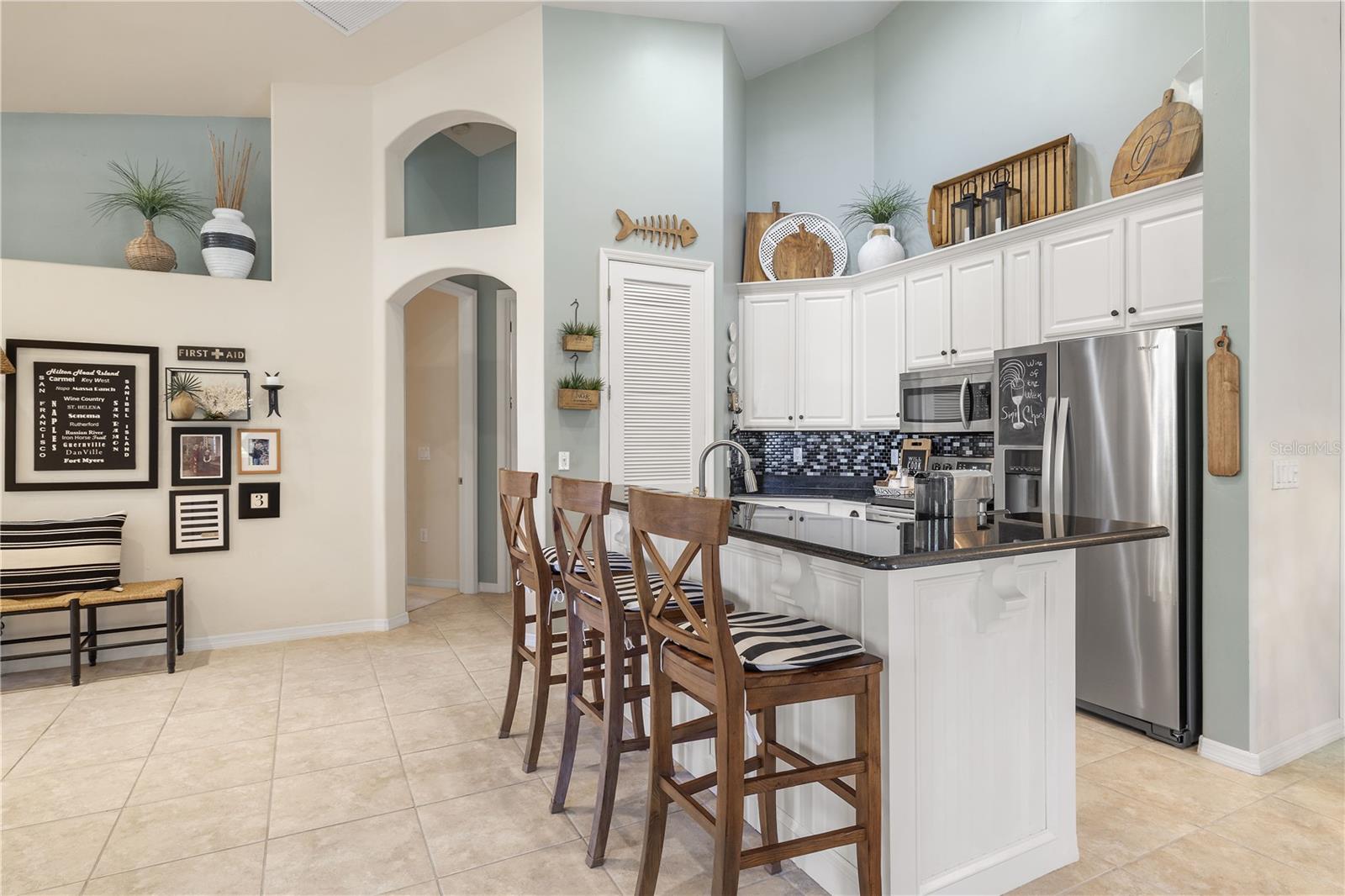 Welcome to an exceptional coastal neighborhood, a true boating community set along the Caloosahatchee River with direct Gulf access, where waterfront living meets everyday comfort. This beautiful 3-bedroom, 2-bath home offers a charming covered front patio, perfect for catching river breezes, watching boats pass by, and enjoying Florida mornings. Through the double entry doors, you’re greeted by a grand foyer with soaring 14-foot ceilings and sun-filled spaces that set the tone for the home’s light, airy coastal feel. The open-concept layout is ideal for entertaining, highlighted by an updated kitchen with 42-inch cabinets, stainless steel appliances, and a beadboard island, flowing seamlessly into a shiplap-accented dining area. The primary suite is a peaceful coastal retreat, complete with a bamboo wood tray ceiling, spa-inspired en-suite bath with granite countertops, and a generous walk-in closet. Step outside to an enclosed lanai with brick pavers, opening to an additional paver patio—your own private tropical oasis, surrounded by lush greenery and designed for relaxed outdoor living. Additional features include a laundry room and a 2-car garage with epoxy flooring. As part of this active boating community, residents enjoy two pools, tennis and pickleball courts, a covered riverside pavilion and park area for monthly gatherings, a private beach, and a 600-foot pier scheduled for replacement in 2026—perfect for dockside entertaining or launching your boat. This truly exceptional home offers the perfect blend of coastal charm, waterfront living, and resort-style amenities, making it an ideal haven for boating enthusiasts and anyone who loves a lifestyle where leisure and comfort seamlessly meet.