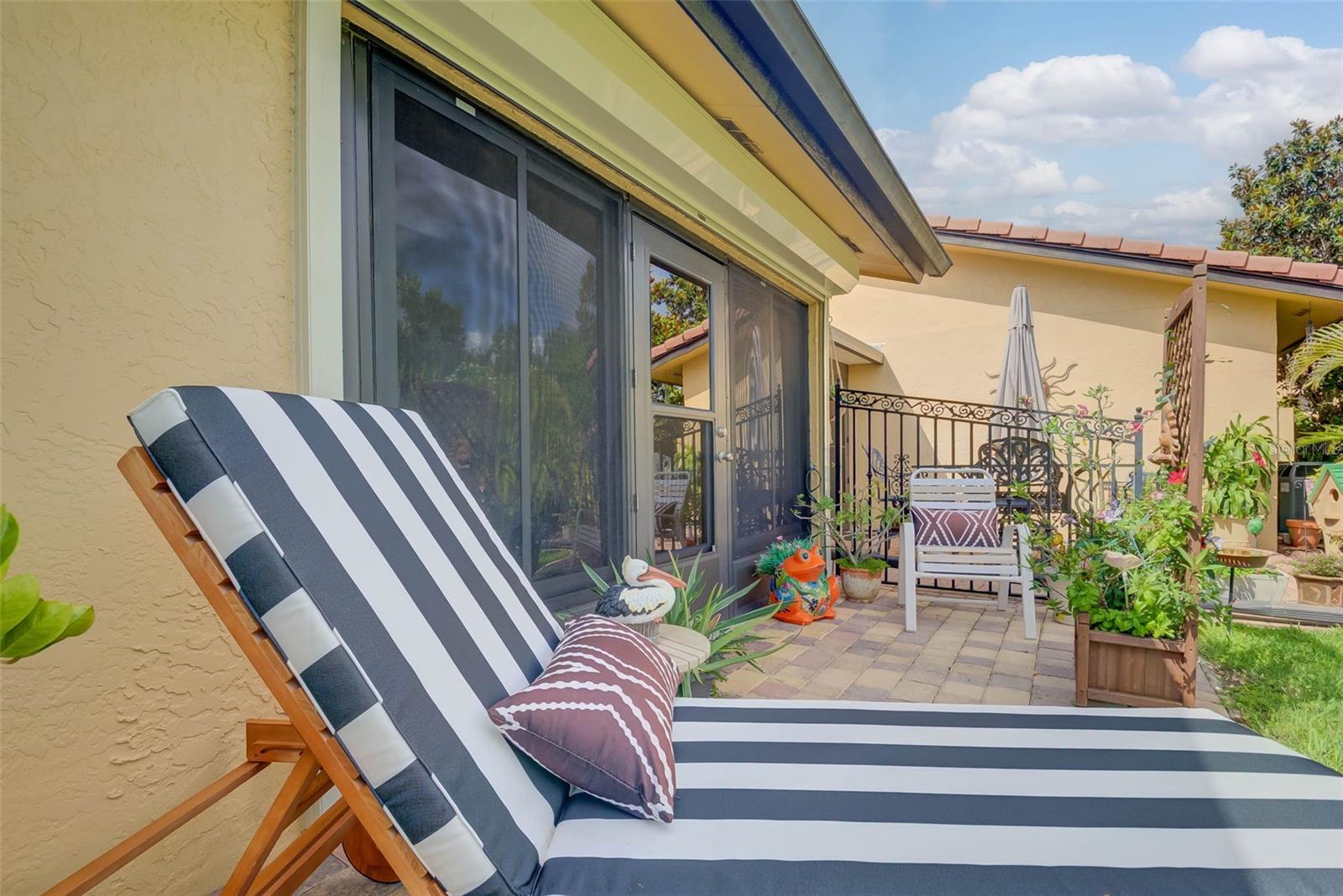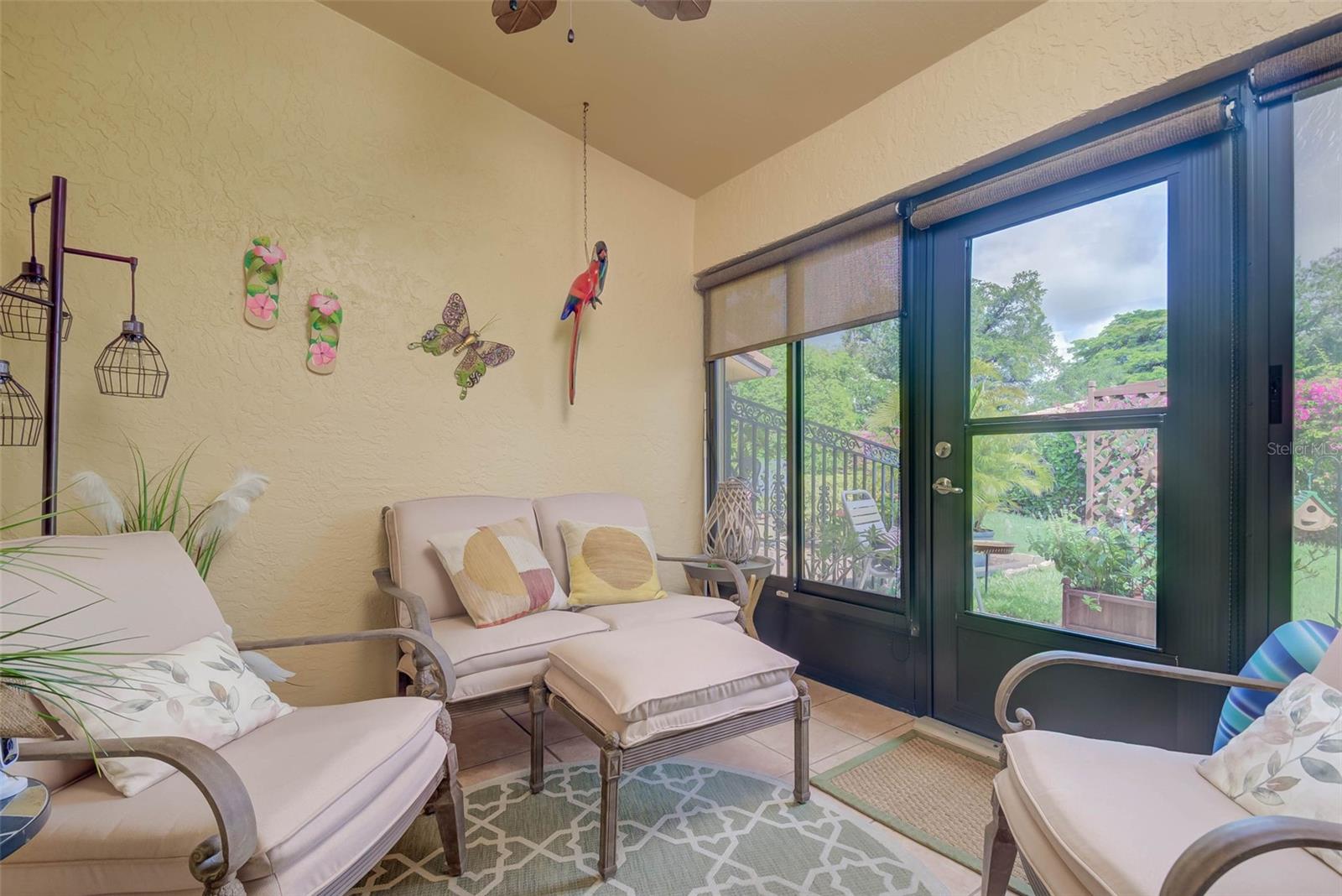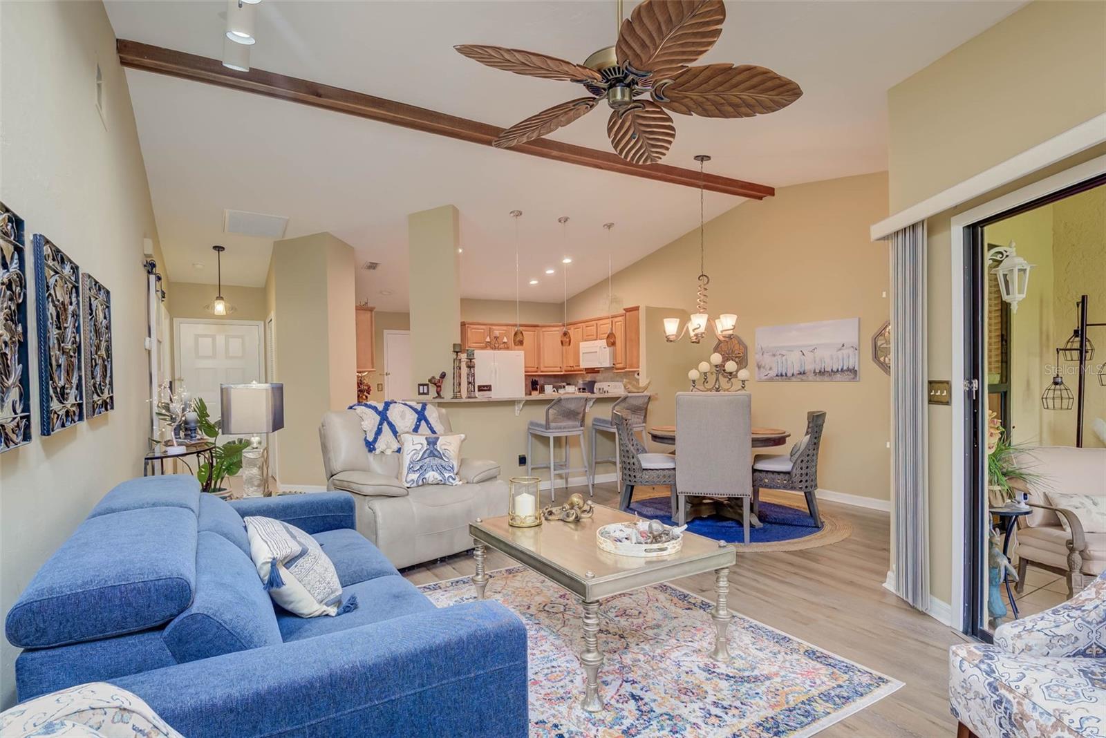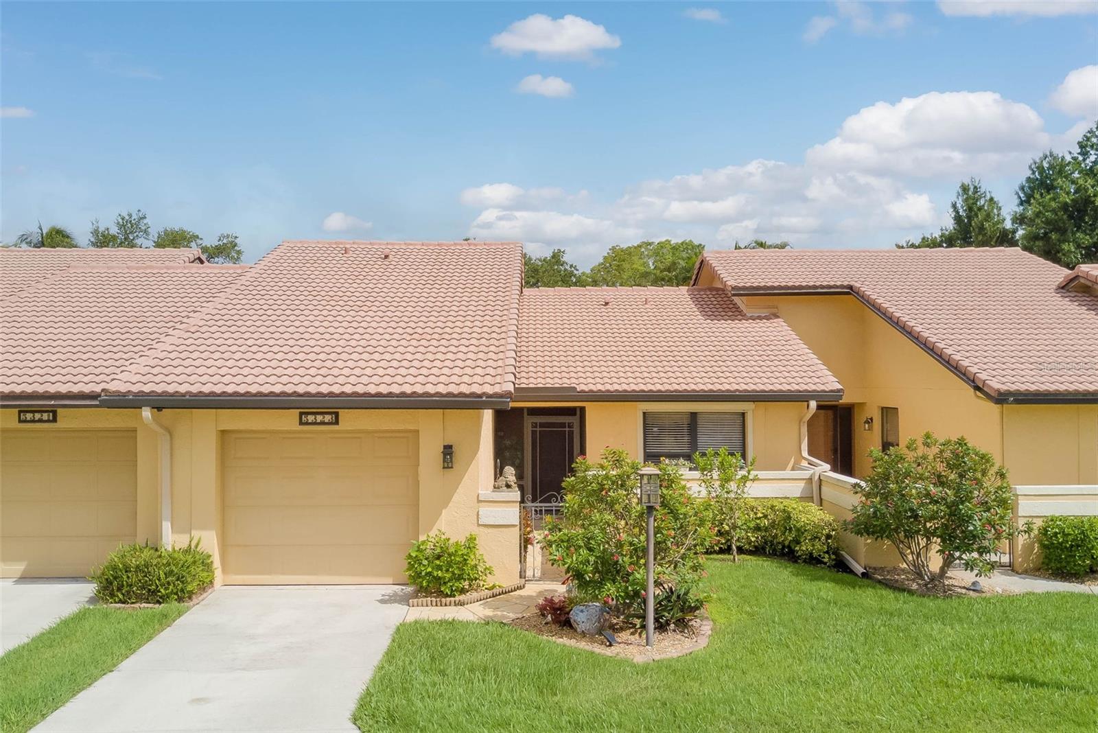 NO FLOOD ZONE – STEPS TO POOL – DUAL ENSUITES! Updated 2BR/2BA villa in gated Governors Island, just steps from the community pool. Rare layout with two ensuite bedrooms, ideal for guests or multigenerational living. Vaulted ceilings with exposed beams, granite kitchen with wood cabinetry, and LVT/tile throughout. Enclosed, air-conditioned lanai adds flex space for office or den. Enjoy a gated front courtyard plus a private backyard patio for grilling and outdoor dining. Prime location behind Bell Tower Shops—minutes to shopping, dining, airport, beaches, and spring training. Low HOA covers exterior insurance, roof, cable, Wi-Fi, lawn care, pest control, and more.