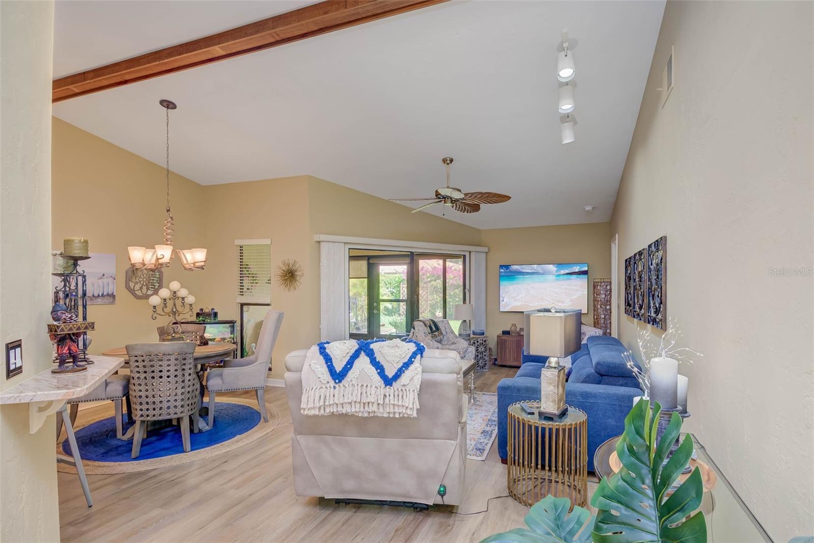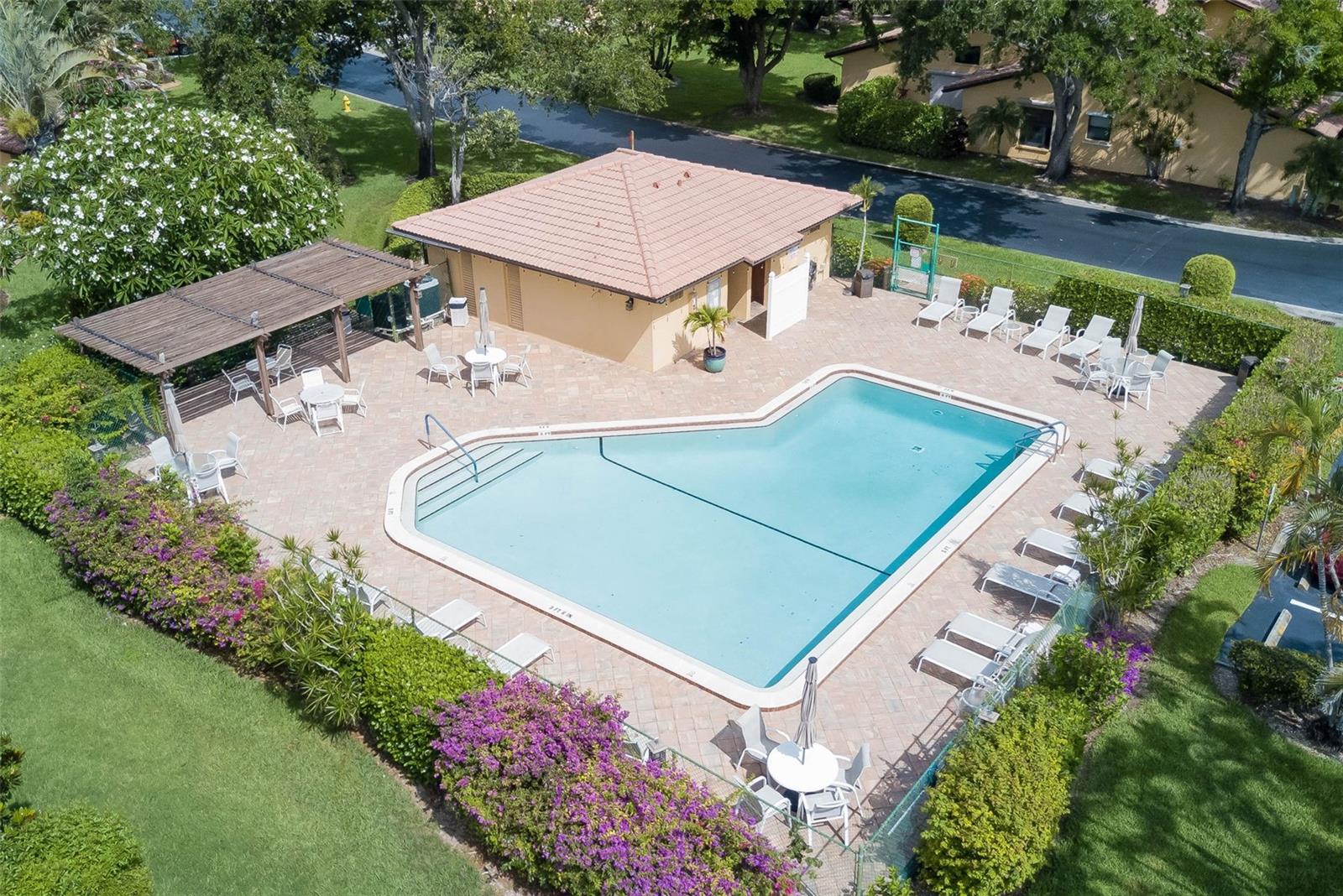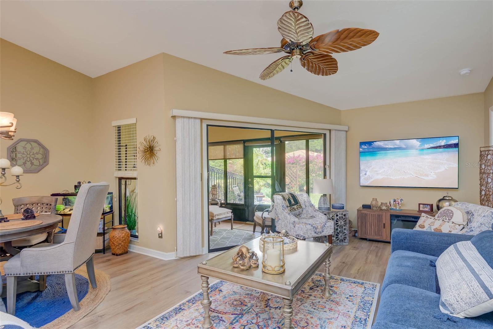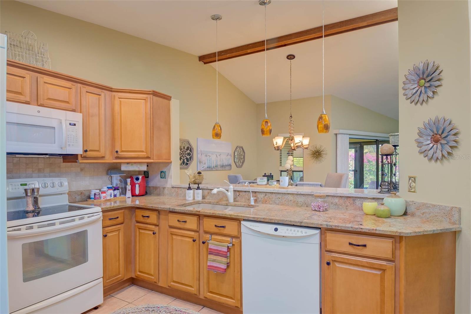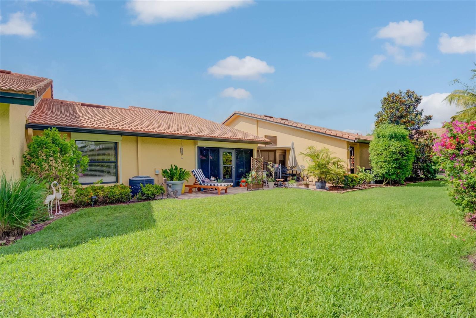 NO FLOOD ZONE – STEPS TO POOL – DUAL ENSUITES! Updated 2BR/2BA villa in gated Governors Island, just steps from the community pool. Rare layout with two ensuite bedrooms, ideal for guests or multigenerational living. Vaulted ceilings with exposed beams, granite kitchen with wood cabinetry, and LVT/tile throughout. Enclosed, air-conditioned lanai adds flex space for office or den. Enjoy a gated front courtyard plus a private backyard patio for grilling and outdoor dining. Prime location behind Bell Tower Shops—minutes to shopping, dining, airport, beaches, and spring training. Low HOA covers exterior insurance, roof, cable, Wi-Fi, lawn care, pest control, and more.