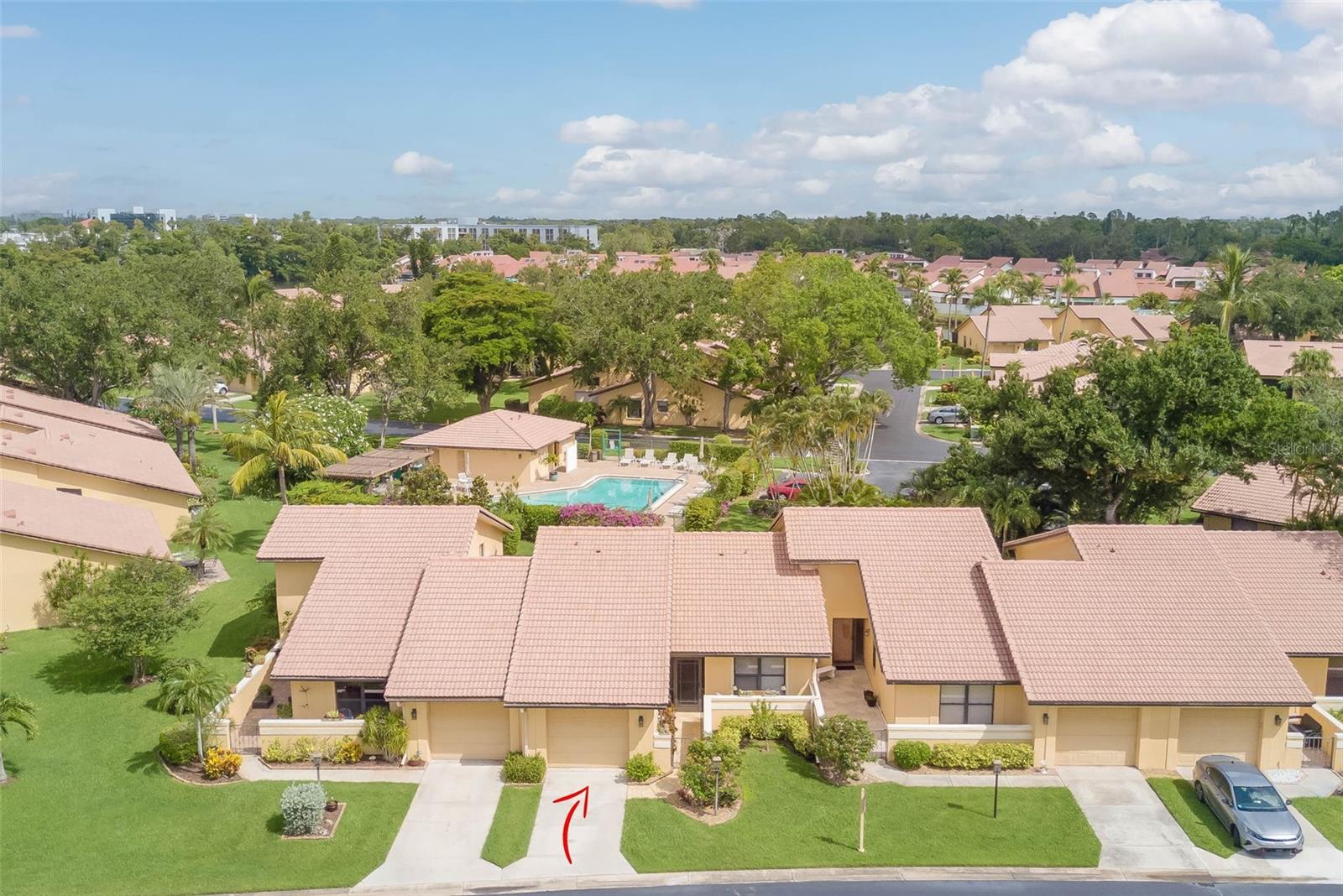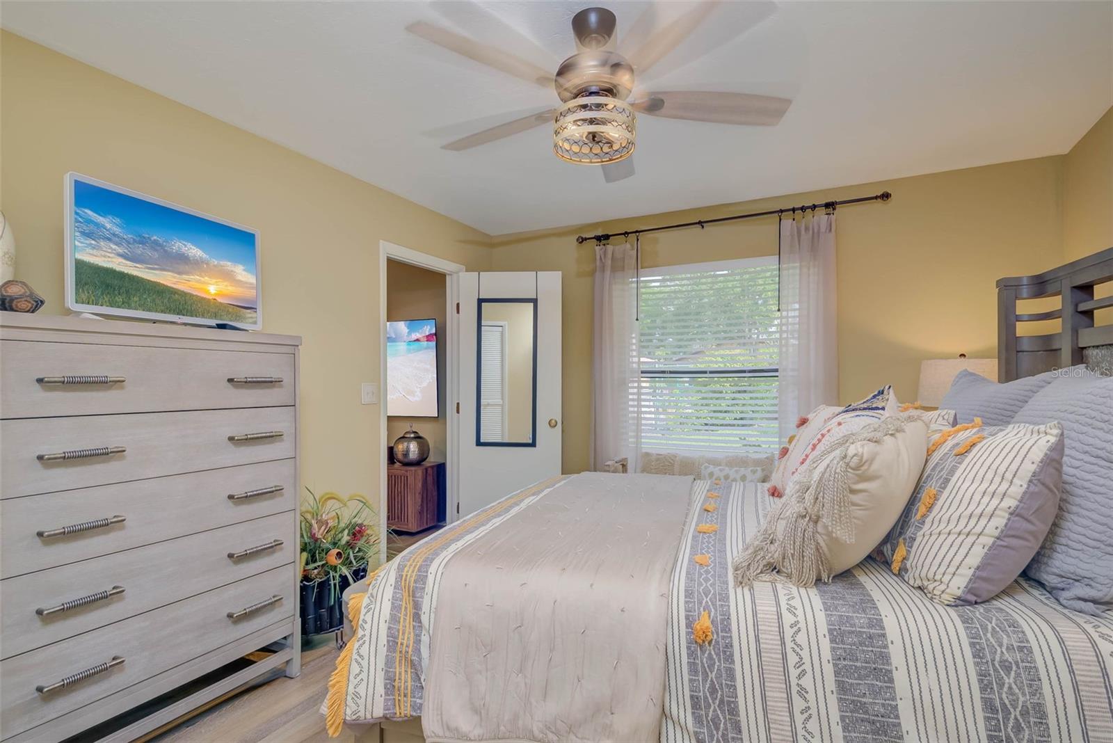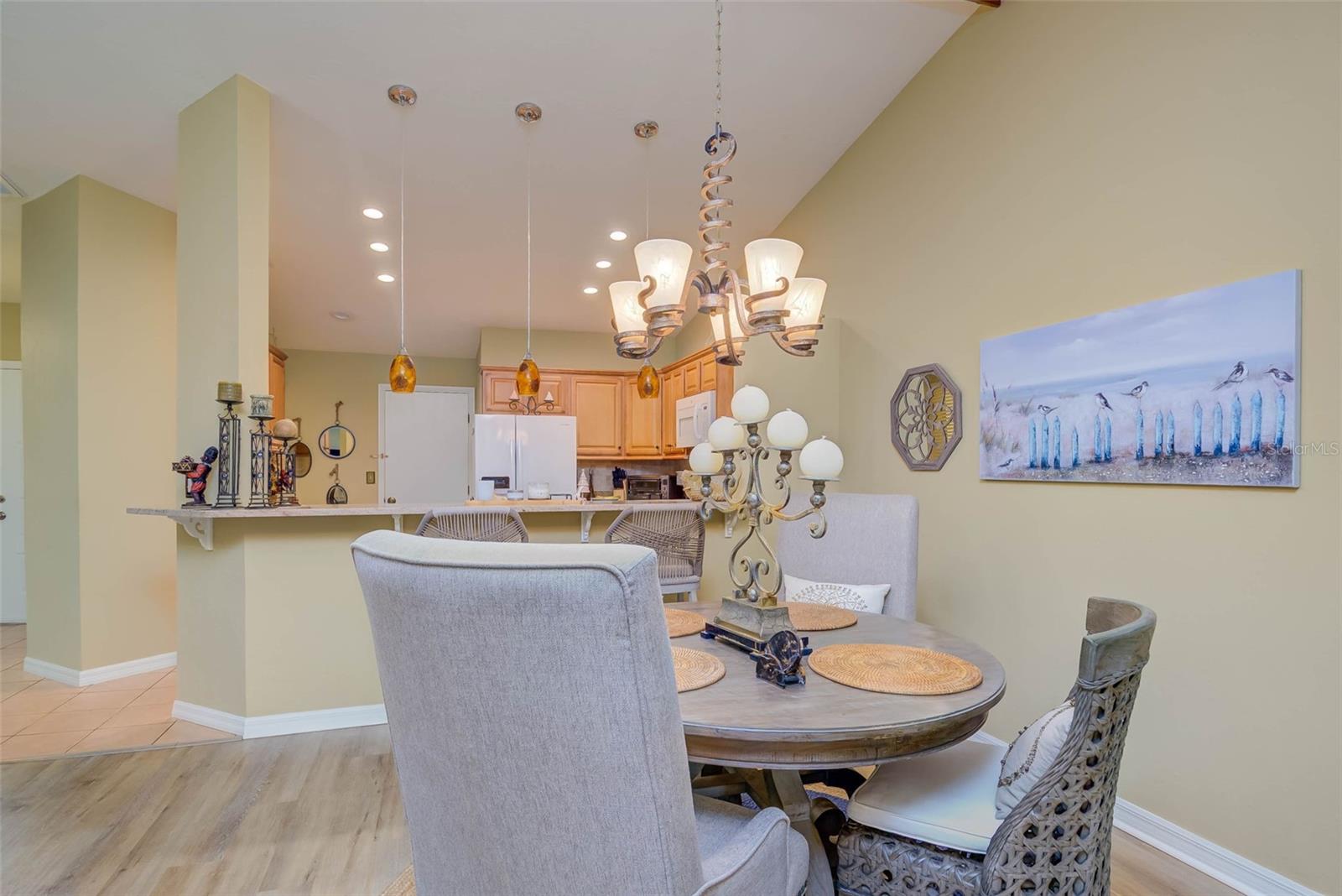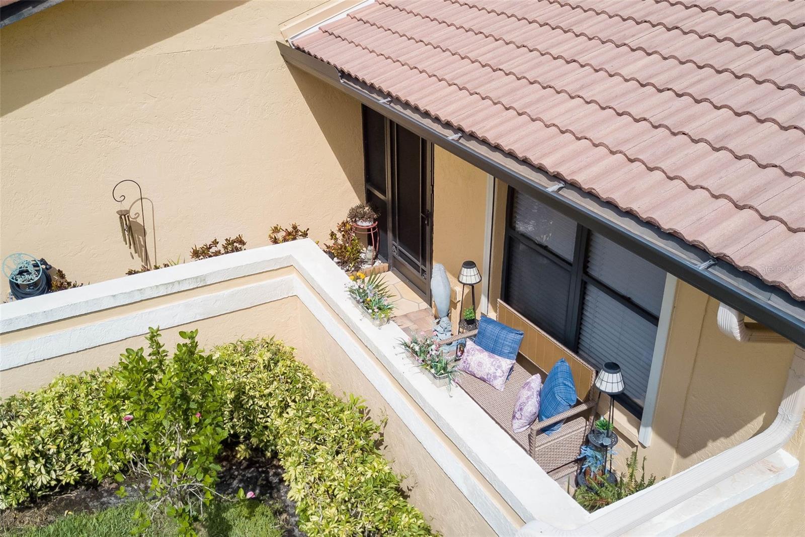 NO FLOOD ZONE – STEPS TO POOL – DUAL ENSUITES! Updated 2BR/2BA villa in gated Governors Island, just steps from the community pool. Rare layout with two ensuite bedrooms, ideal for guests or multigenerational living. Vaulted ceilings with exposed beams, granite kitchen with wood cabinetry, and LVT/tile throughout. Enclosed, air-conditioned lanai adds flex space for office or den. Enjoy a gated front courtyard plus a private backyard patio for grilling and outdoor dining. Prime location behind Bell Tower Shops—minutes to shopping, dining, airport, beaches, and spring training. Low HOA covers exterior insurance, roof, cable, Wi-Fi, lawn care, pest control, and more.