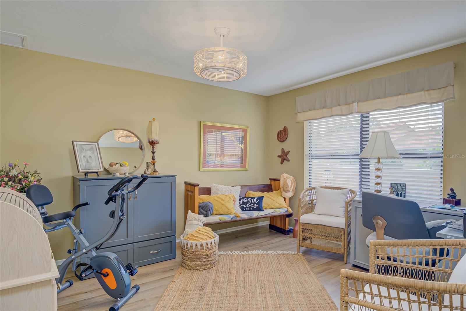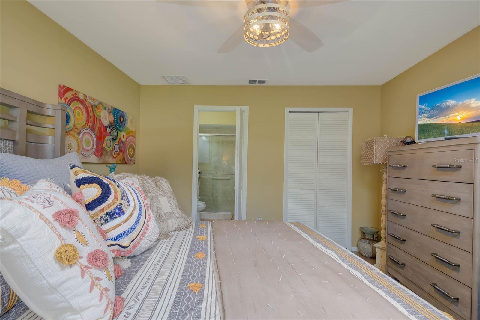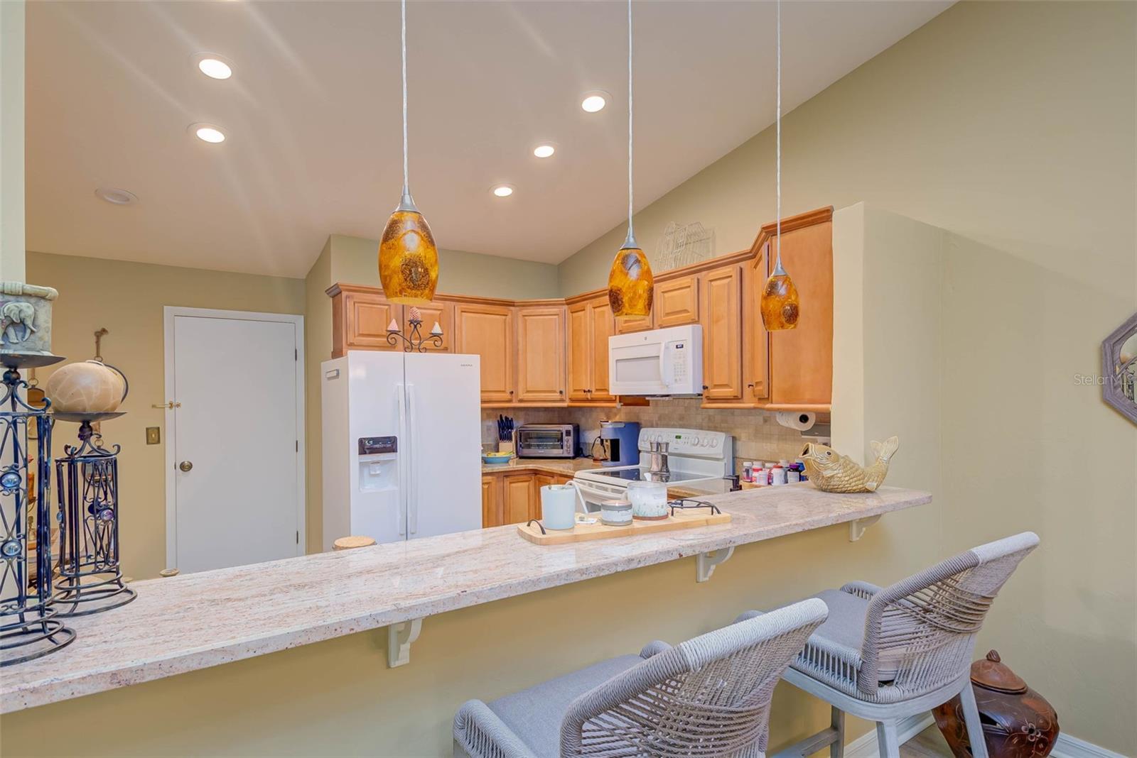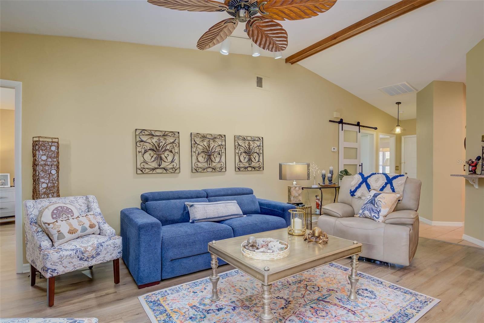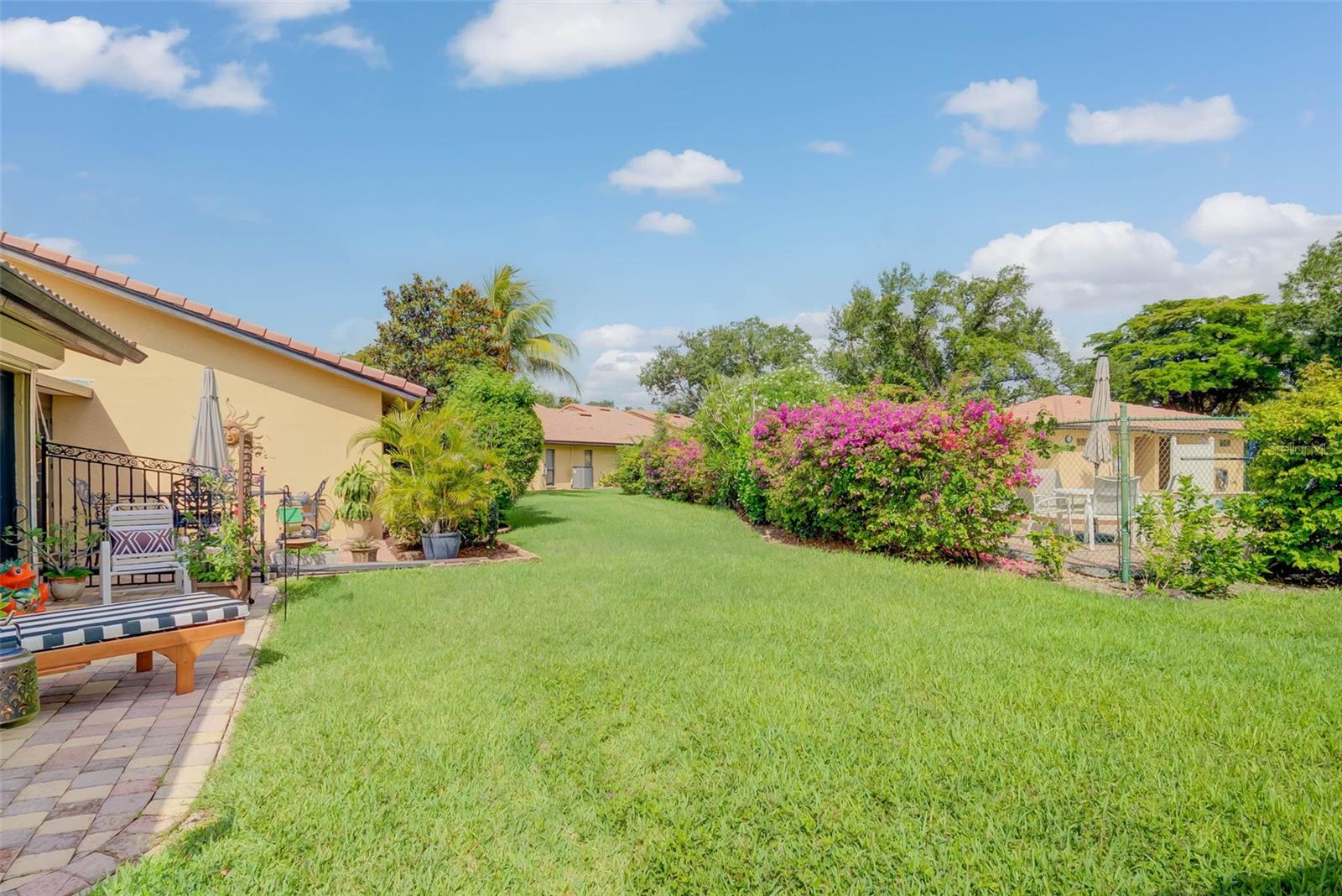 NO FLOOD ZONE – STEPS TO POOL – DUAL ENSUITES! Updated 2BR/2BA villa in gated Governors Island, just steps from the community pool. Rare layout with two ensuite bedrooms, ideal for guests or multigenerational living. Vaulted ceilings with exposed beams, granite kitchen with wood cabinetry, and LVT/tile throughout. Enclosed, air-conditioned lanai adds flex space for office or den. Enjoy a gated front courtyard plus a private backyard patio for grilling and outdoor dining. Prime location behind Bell Tower Shops—minutes to shopping, dining, airport, beaches, and spring training. Low HOA covers exterior insurance, roof, cable, Wi-Fi, lawn care, pest control, and more.