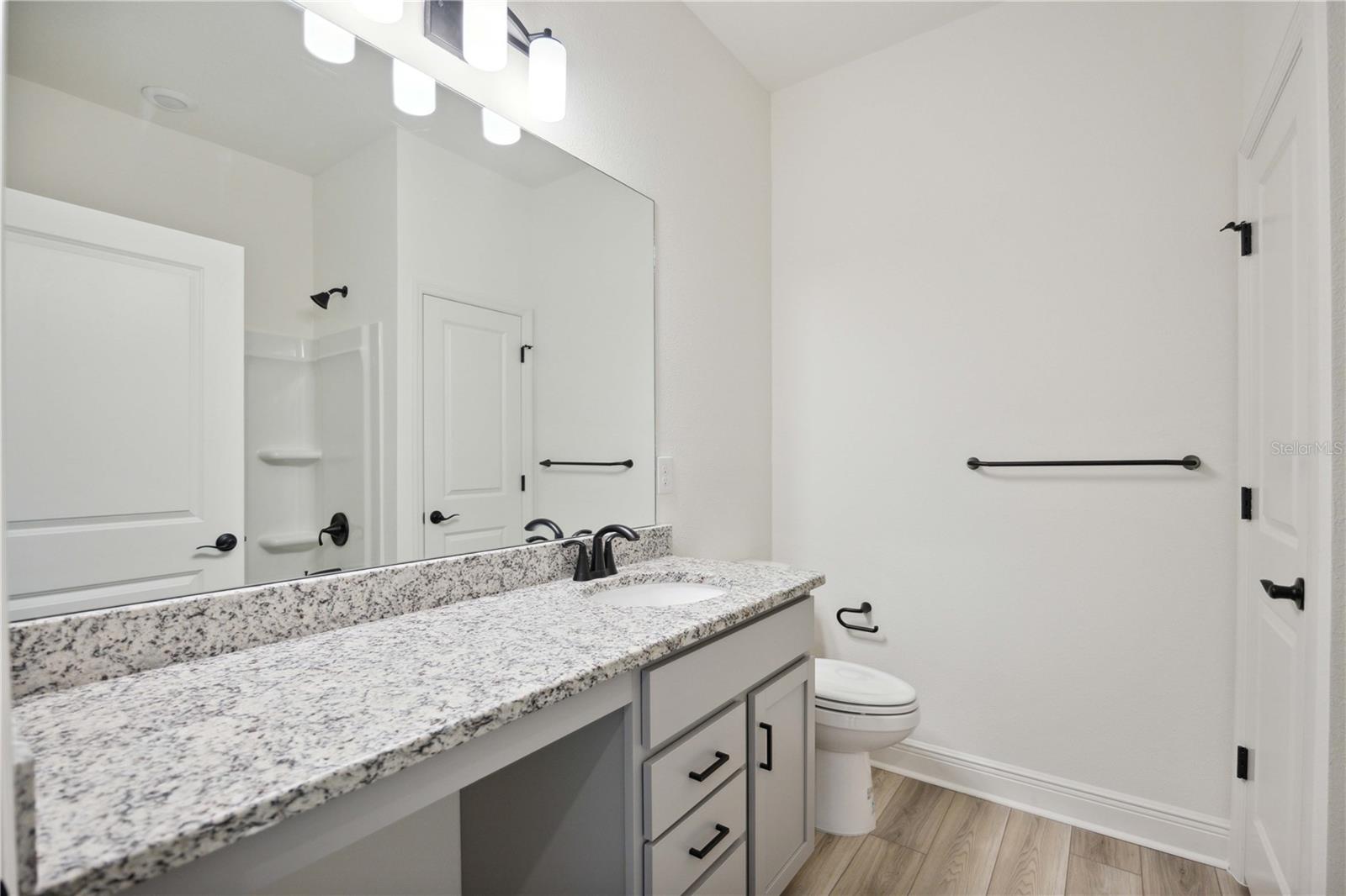 This charming single-story home will be sure to captivate you the moment you walk in, showcasing vinyl plank flooring throughout the common and wet areas. Featured at the front of the house is a split-bedroom layout, with secondary bedrooms each complete with a sizeable closet. As you continue down the entryway you will encounter the expansive great room and kitchen, all leading you out the covered patio. The kitchen comes equipped with 42-in. upper cabinets with crown molding, granite countertops, a large pantry, an at-eat island, and a stainless-steel Whirlpool® appliance package. The primary bedroom with connecting bath includes a walk-in closet, an extended dual sink vanity with granite countertops, a linen closet, and a walk-in shower with seat and title surround. Community offers no CDD, and lawn maintenance isincluded