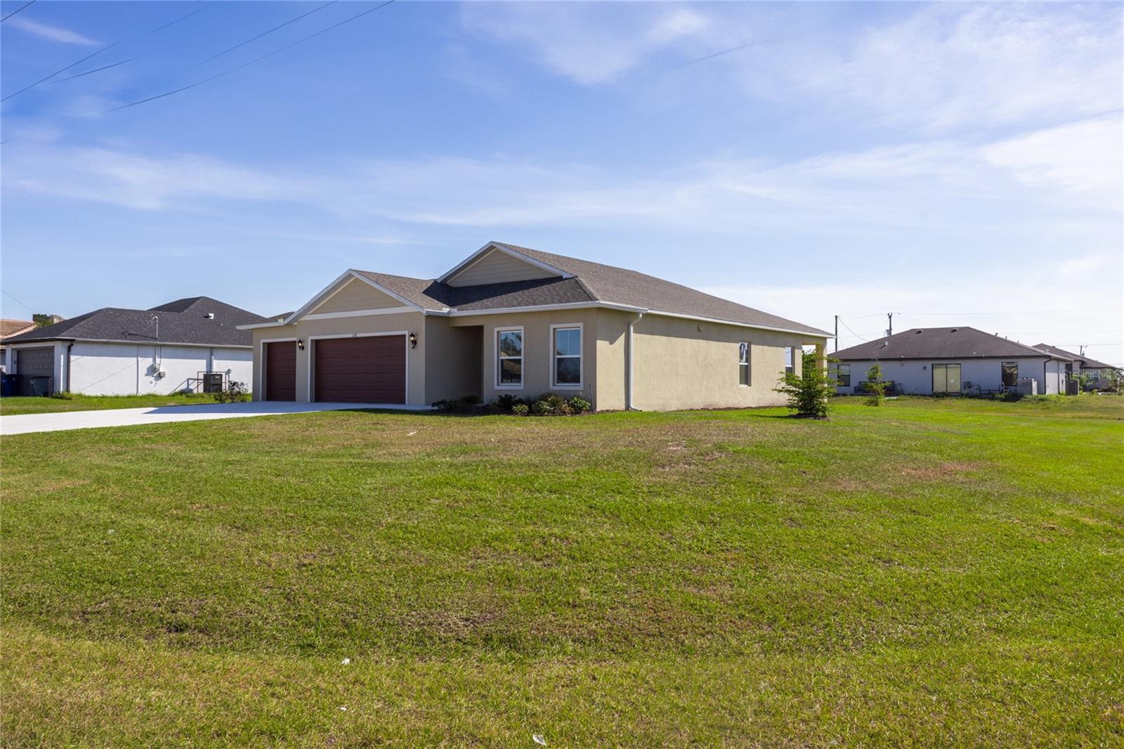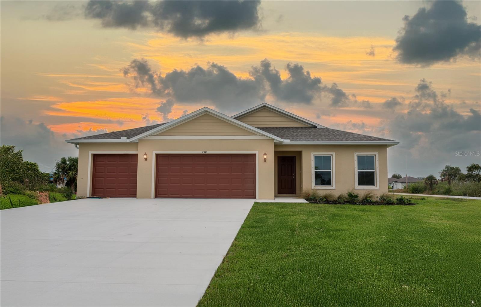 ***NEW CONSTRUCTION, NO WAIT, MOVE IN READY!*** Elevate your lifestyle with the opulence of the Sanibel I floorplan presented by Carpenter Homes—a masterpiece within the Florida Living Series, certified by the Florida Green Building Coalition (FGBC). This home features 4 bedrooms and 2 full bathrooms. This dream home is designed and built to immerse you in luxury. As you enter, a beautiful kitchen welcomes you, with an expansive, oversized bar that seamlessly flows into the living and dining area. The finesse of soft-close, Shaker Stained 36" cabinets and upgraded Santa Cecilia granite countertops add a functional touch of luxury to the kitchen. Kitchen upgrades include a Moen Integra chrome kitchen faucet, garbage disposal, and sleek stainless steel energy efficient appliances. This home exudes sophistication with a vaulted ceiling that unveils a spacious lanai, creating an indoor-outdoor haven. Additionally, Carpenter Homes provides an upgraded lighting package including Kemal Bronze pendants over the kitchen bar, and Oslo brushed nickel vanity fixtures in both bathrooms, accenting the overall lighting design. Brushed nickel finish ceiling fans in each bedroom, as well as the great room, helps to circulate air flow and keep you cool in the Florida weather. Complimenting the expansive living area is Magnisi 6x26” ceramic tile flooring. The Owner's suite is a sanctuary of indulgence, showcasing dual sinks, impeccably tiled Magnisi 8x12” beige walls in the shower, and a generously sized walk-in closet. The home boasts Magnisi 8x12” beige upgraded tiled walls in in the second bath/shower, a Santa Cecilia granite vanity top, and Moen Chateau chrome faucets and shower/tub trim kits. The ampleness of this home continues with a utility room, and additions such as energy-efficient R-4.1 insulation on concrete exterior walls, Taexx tubes for pest control, and fabric hurricane shutters for every window. The Florida friendly landscaped yard is complemented by an irrigation system with a rain sensor to help maximize efficiency. The expansive 3-car garage, complete with garage door opener and four remotes, not only provides ample space for your everyday needs but also ensures the utmost convenience and versatility for all your storage and parking requirements. Step into a world where extravagance meets eco-conscious living—your forever home awaits you, a testament to timeless elegance and modern sustainability! Available to view anytime!