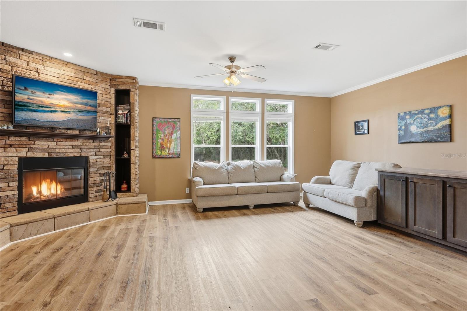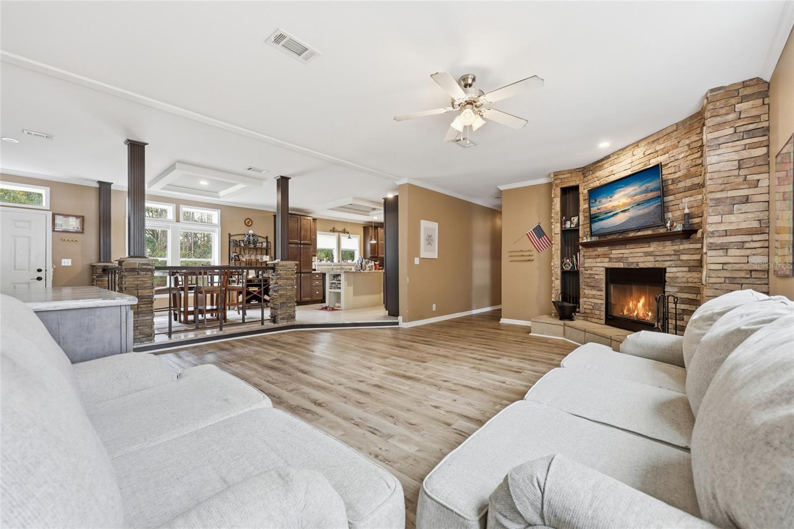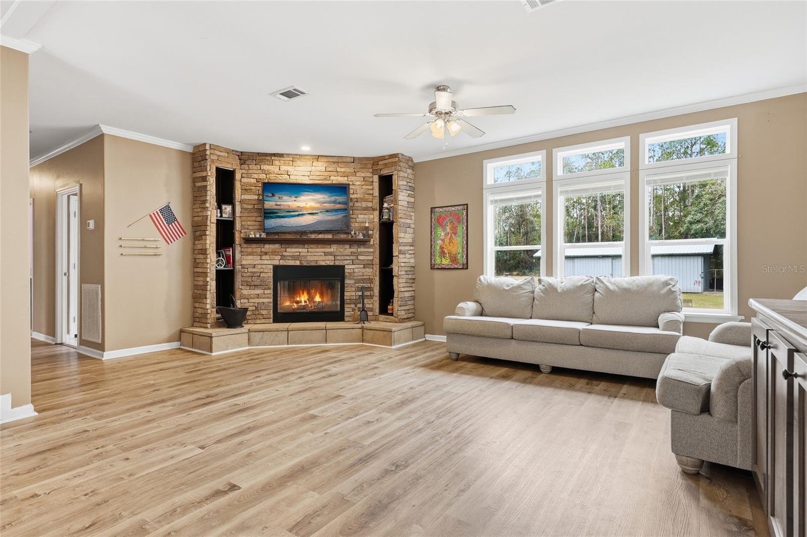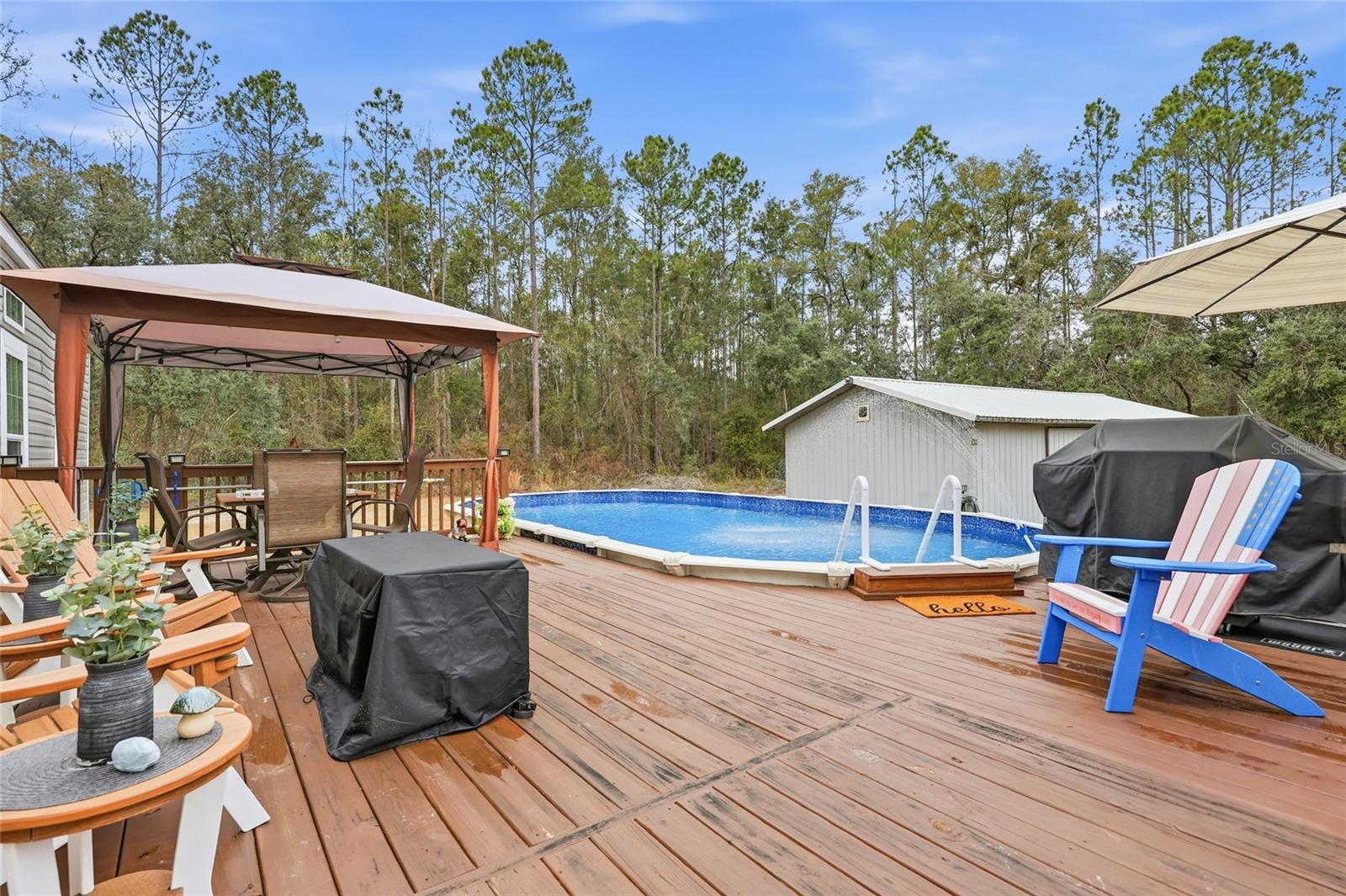Beautifully manicured 5-acre property on a paved road featuring TWO newer homes, a pool, and room to truly spread out. The land around the homes is cleared and park-like, offering open space for recreation, animals, or future additions, while a wooded portion in the back provides privacy and a natural Florida backdrop. The first home is a 2023 build offering 2,356 sq ft with 4 bedrooms and 2 bathrooms. Inside you’ll find an open-concept layout, a cozy wood-burning fireplace, oversized closets, and a spacious primary suite with a large master bathroom. Impeccably maintained and move-in ready, this home also overlooks the sparkling 18x32 pool and a large front deck perfect for relaxing or entertaining. The second residence, built in 2017, features 2,280 sq ft, 4 bedrooms, and 2 bathrooms with a chef’s kitchen, open great room, generous walk-in closets, and a well-appointed primary bath. Both homes include separate fenced backyard areas perfect for dogs. Additional improvements include a 20x40 workshop and a 12x32 shed, giving you excellent storage, workspace, or hobby options. Located just a short drive to the area’s famous springs and rivers, you’ll enjoy easy access to swimming, tubing, boating, and the best of North Florida’s outdoor lifestyle — all while having the flexibility and opportunity that two homes on 5 acres provide.