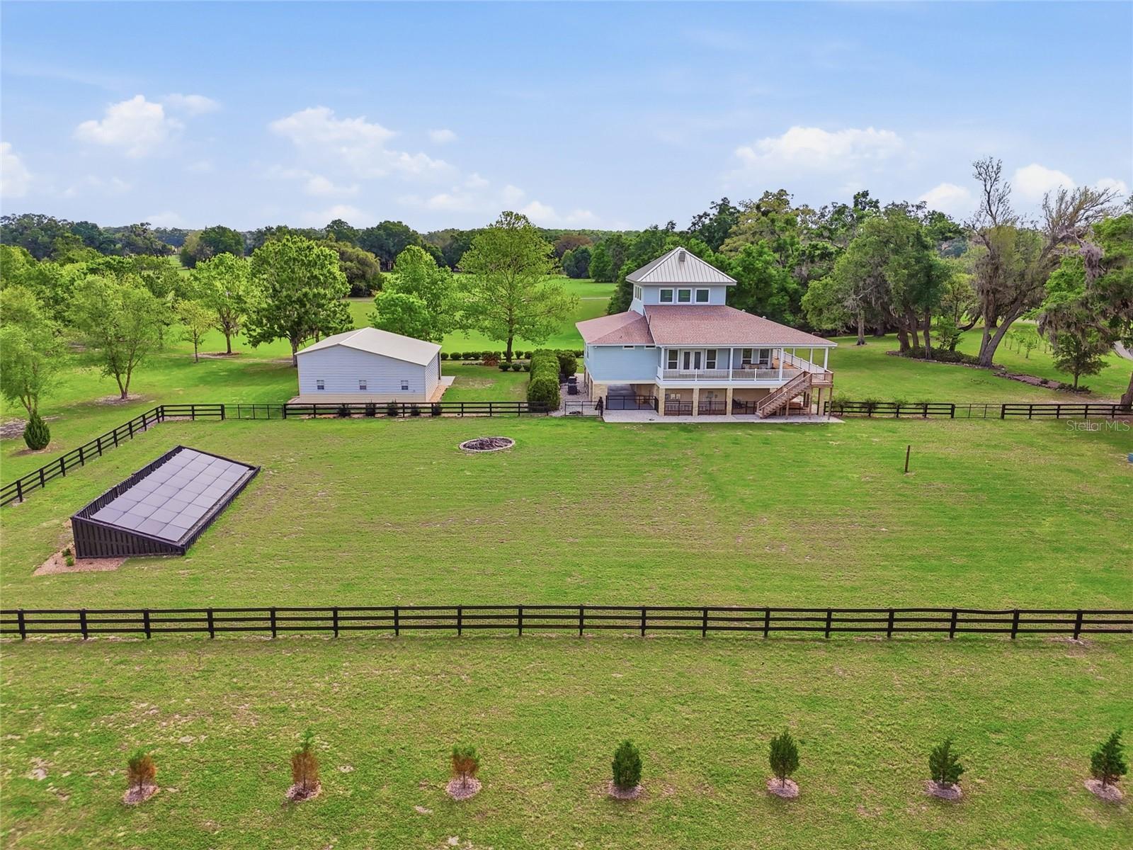 Architecturally significant estate in the private gated community of Bluebird Landing. Set on 10 rolling acres of manicured grass and mature oak clusters, this thoughtfully designed 4BR/2.5BA 3,482 sq ft home positions every living area and bedroom along the periphery — panoramic views from every room. Located in one of the area's most sought-after equestrian communities, residents enjoy private Santa Fe River access with a boat ramp, pavilion, and a reservable cabin for gatherings. Inside, the home showcases quality craftsmanship and intentional design throughout. The loft, highlighted by a wood beam ceiling and cupola of windows, offers a bright and inspiring space for an office, studio, or hobby room. The kitchen is built for both everyday living and entertaining, featuring a Wolf 5-burner gas range and double convection ovens. An in-home elevator makes grocery transport effortless. The master suite features French doors to the wrap-around porch, double sinks, a walk-in closet, and a generous walk-in shower. Guest rooms share a Jack and Jill bathroom. Outside, a built-in FireMagic grill with exhaust hood anchors the massive three-sided wrap-around porch — perfect for entertaining with panoramic views across the property. The ground level offers over 1,300 square feet of garage space with a 3-car garage, workshop area, half bath, soundproof air-conditioned media room, and additional covered parking and storage. Major system upgrades include a newer shingle roof, LED lighting throughout, dual 200-amp panels, a 15kW Generac generator, and a 500-gallon buried propane tank servicing the generator, grill, and cooktop. A 32-panel earth anchor installation solar array helps offset energy costs. A separate 36'×45' metal outbuilding is fully equipped with power, UFO LED lighting, a 30-amp RV hookup, spray foam insulation, and three roll-up doors. While the property is not currently set up for horses, the acreage and layout make it an easy conversion for equestrian use—perfectly aligning with the community’s character. A rare opportunity to own a high-quality, architecturally designed home on acreage in a gated river community—where privacy, function, and lifestyle come together seamlessly. Located just outside of High Springs and easy 30 minute drive to Gainesville.
