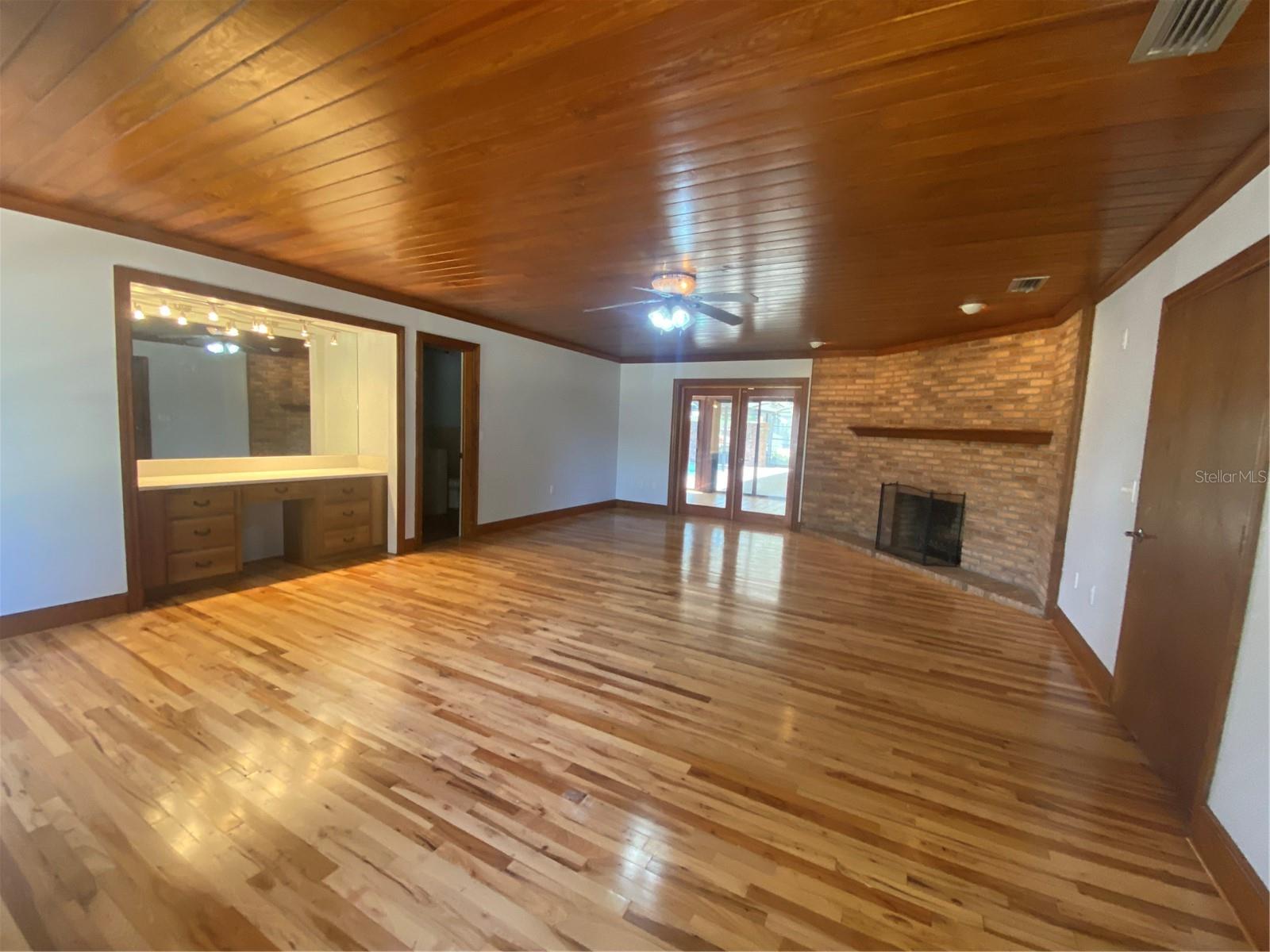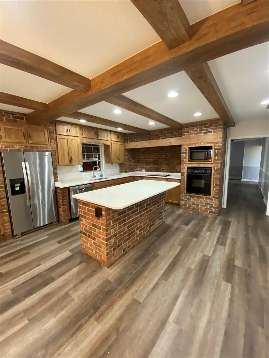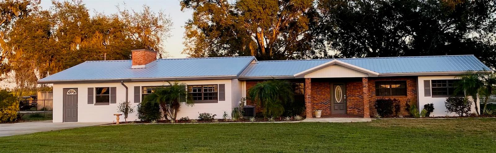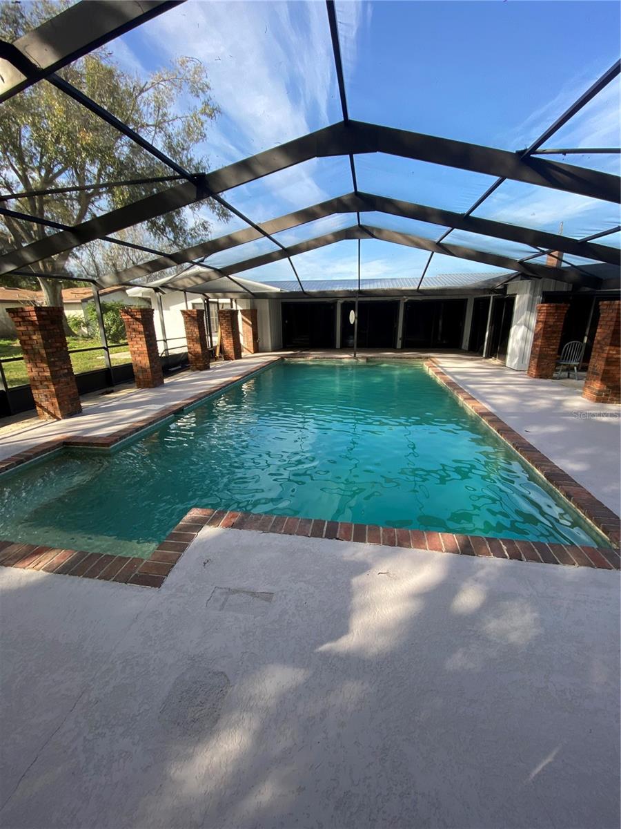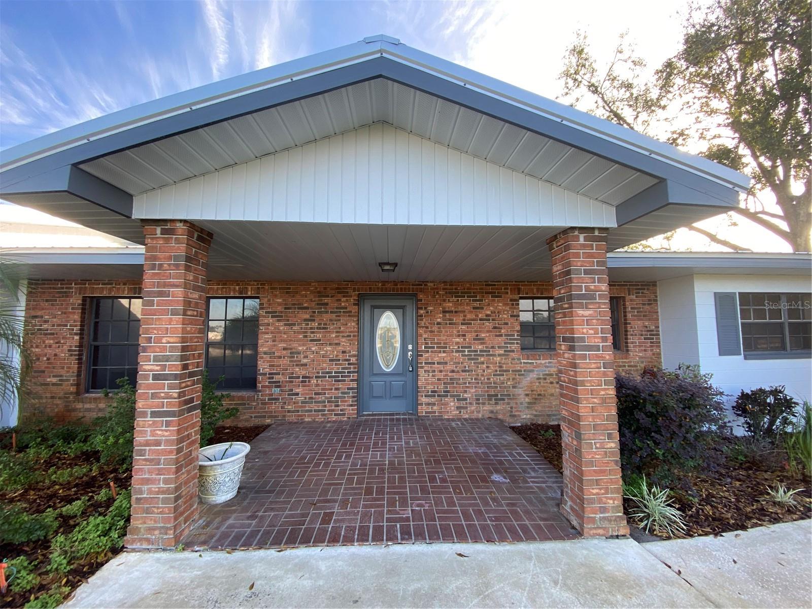 You will enjoy this exceptional home built for entertainment and large families. There is a wonderful opportunity to have an in’law suite apartment complete with a spacious kitchenette with private entrances. Newly renovated extremely large concrete block with brick home. Upon entering the front door there is a formal living room with built in Oak cabinets with glass doors, wood laminate floors, that flows into the family room featuring a beautiful brick fireplace. The foyer also flows into the guest bedroom side with 4 bedrooms and 2 full baths, a huge formal dining room complete with sliders going towards the great entertainment area complete with a custom built corner round brick bar w/new quartz top and bar sink. The exquisite kitchen has a custom beamed ceiling, center island, wall oven with new cooktop and new quartz countertop. New modern farm house light fixture is a focal point for a convenient family nook table. This room gives access to the hall leading to a considerable size bonus room with a private entrance that could easily convert to an apartment with access to an oversized laundry room with a large kitchenette. Tucked in the rear corner is the primary bedroom. Designed as a retreat of it’s own that Boast beautiful hard wood floors, corner fireplace and an elegant dressing table, primary bathroom complete with new dual vanity, separate shower, jetted soaking tub, a walk-in in closet, ample room for a sitting area inside and out the French doors trailing to the entertainment and pool area. On the backside of the property is a large 39x63’ metal storage barn for your gear and toys. A couple of storage sheds and a riser for filling tanks. This area is in the county which allows for farm animals. This site is close to large recreational lakes, private and public airstrips, and centrally located just over an hours drive to east and west coast of Central Florida. Easy driving distance to most major theme parks.