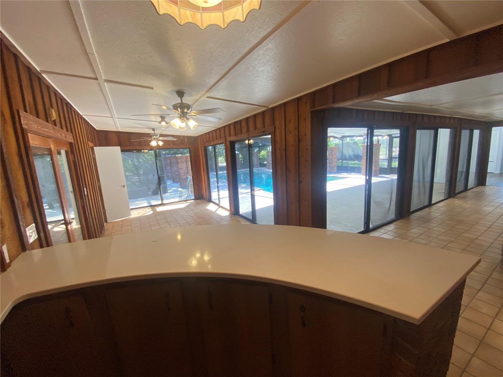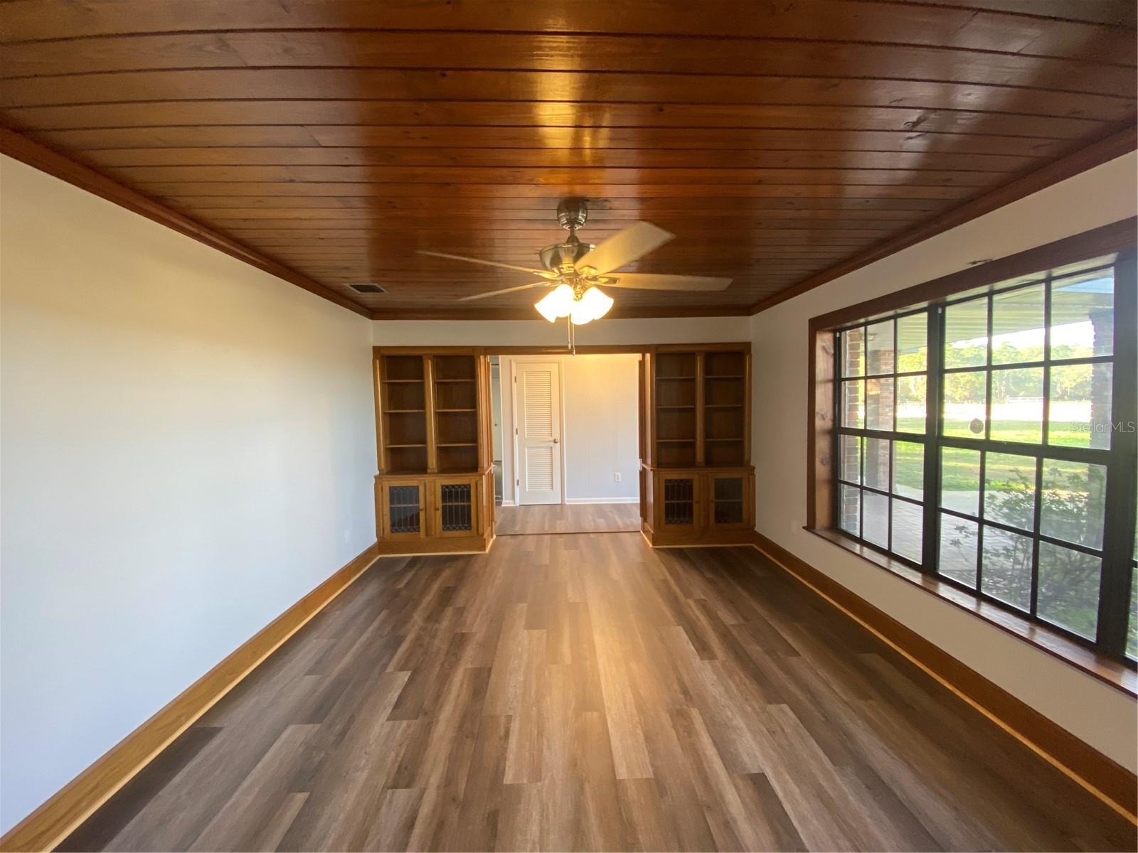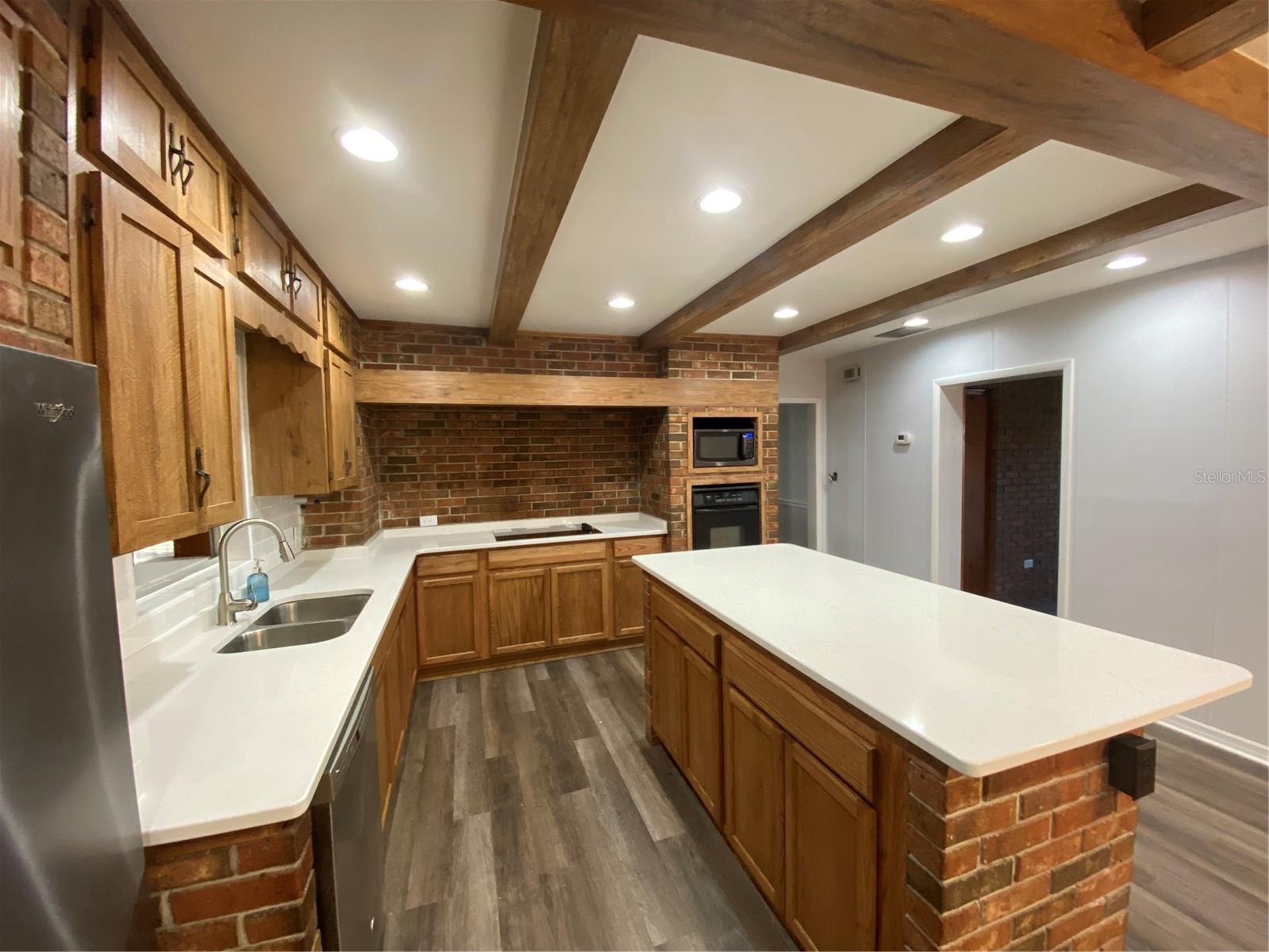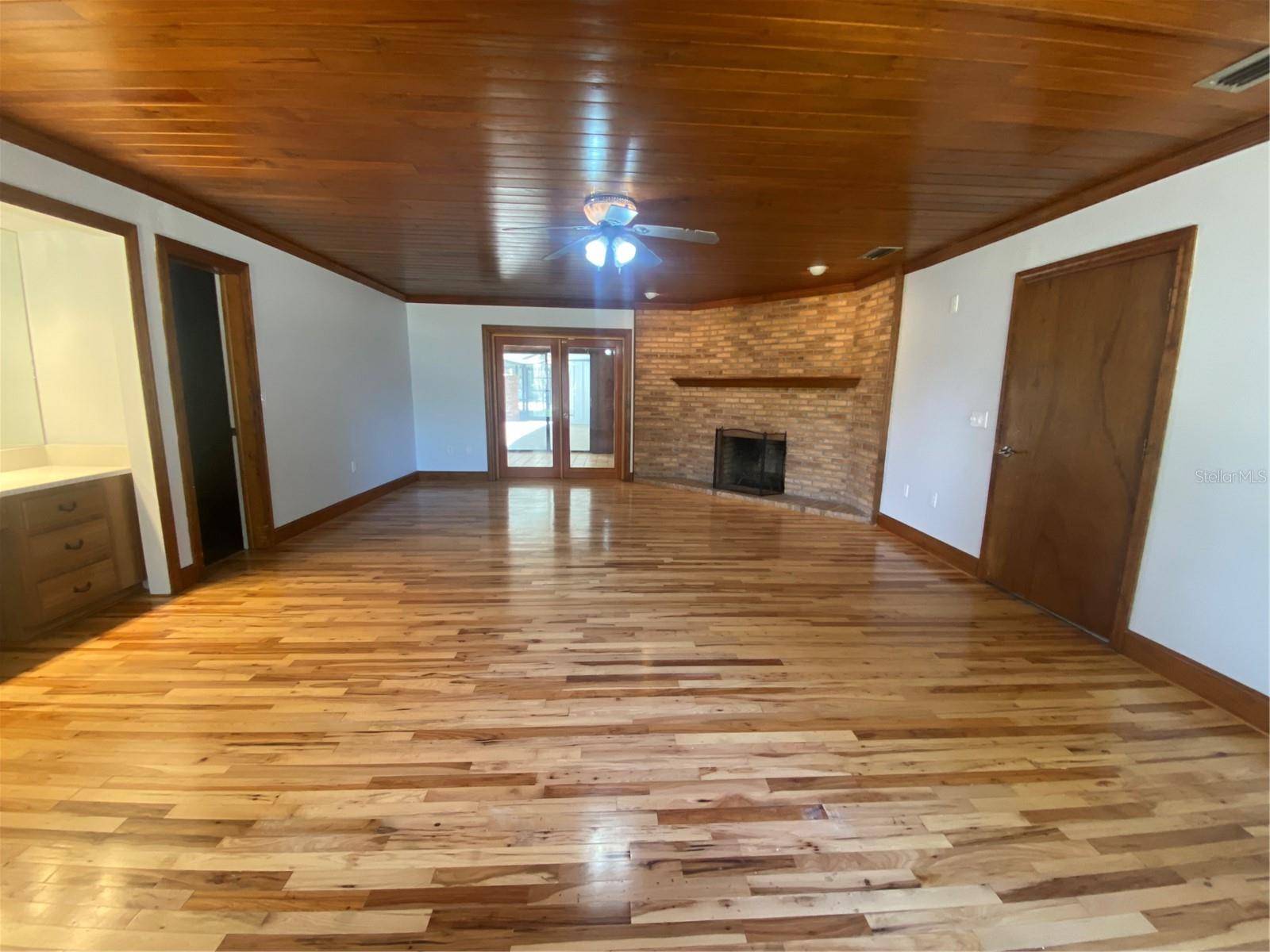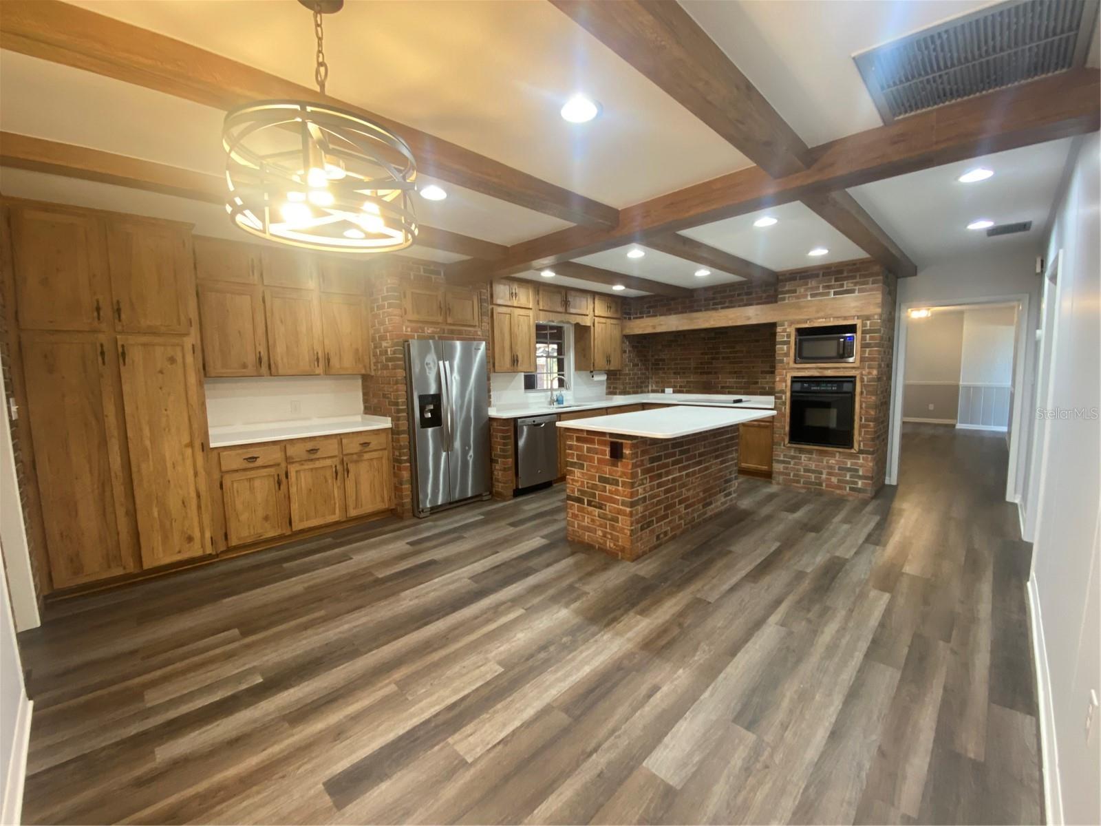 You will enjoy this exceptional home built for entertainment and large families. There is a wonderful opportunity to have an in’law suite apartment complete with a spacious kitchenette with private entrances. Newly renovated extremely large concrete block with brick home. Upon entering the front door there is a formal living room with built in Oak cabinets with glass doors, wood laminate floors, that flows into the family room featuring a beautiful brick fireplace. The foyer also flows into the guest bedroom side with 4 bedrooms and 2 full baths, a huge formal dining room complete with sliders going towards the great entertainment area complete with a custom built corner round brick bar w/new quartz top and bar sink. The exquisite kitchen has a custom beamed ceiling, center island, wall oven with new cooktop and new quartz countertop. New modern farm house light fixture is a focal point for a convenient family nook table. This room gives access to the hall leading to a considerable size bonus room with a private entrance that could easily convert to an apartment with access to an oversized laundry room with a large kitchenette. Tucked in the rear corner is the primary bedroom. Designed as a retreat of it’s own that Boast beautiful hard wood floors, corner fireplace and an elegant dressing table, primary bathroom complete with new dual vanity, separate shower, jetted soaking tub, a walk-in in closet, ample room for a sitting area inside and out the French doors trailing to the entertainment and pool area. On the backside of the property is a large 39x63’ metal storage barn for your gear and toys. A couple of storage sheds and a riser for filling tanks. This area is in the county which allows for farm animals. This site is close to large recreational lakes, private and public airstrips, and centrally located just over an hours drive to east and west coast of Central Florida. Easy driving distance to most major theme parks.