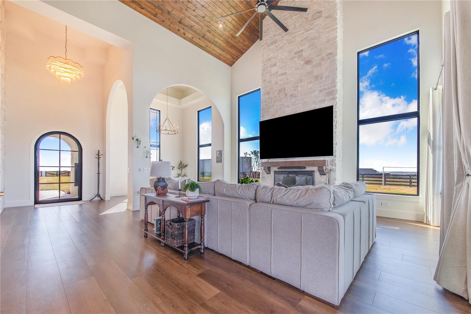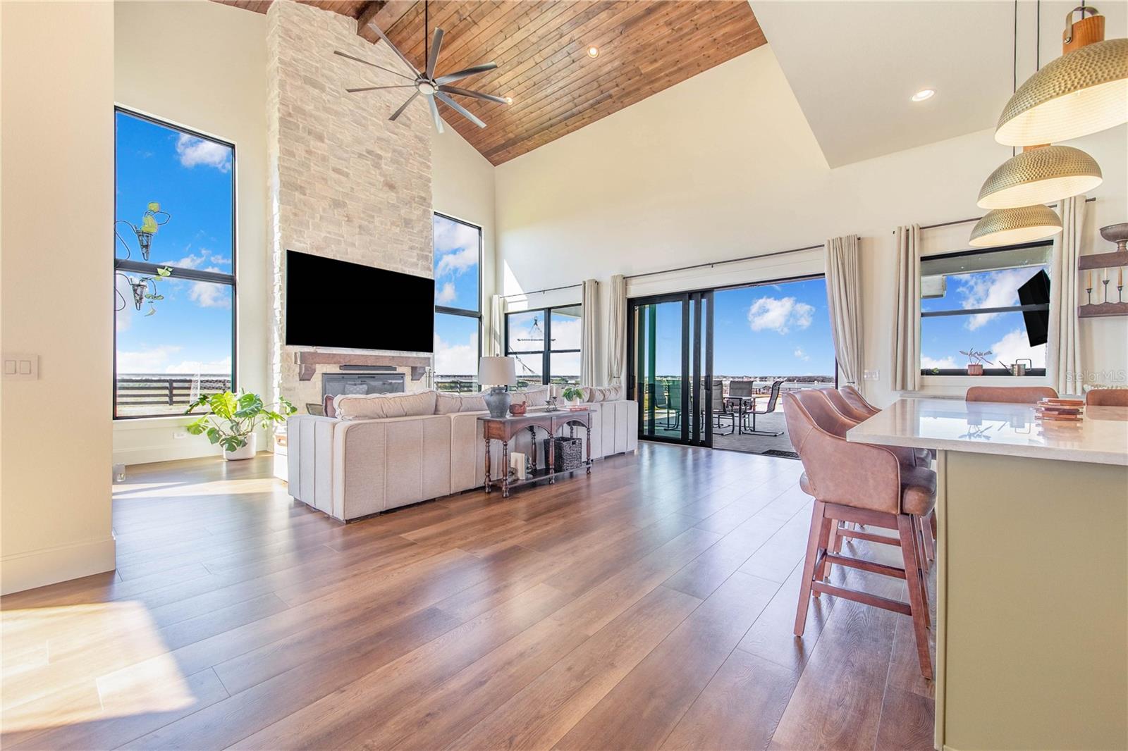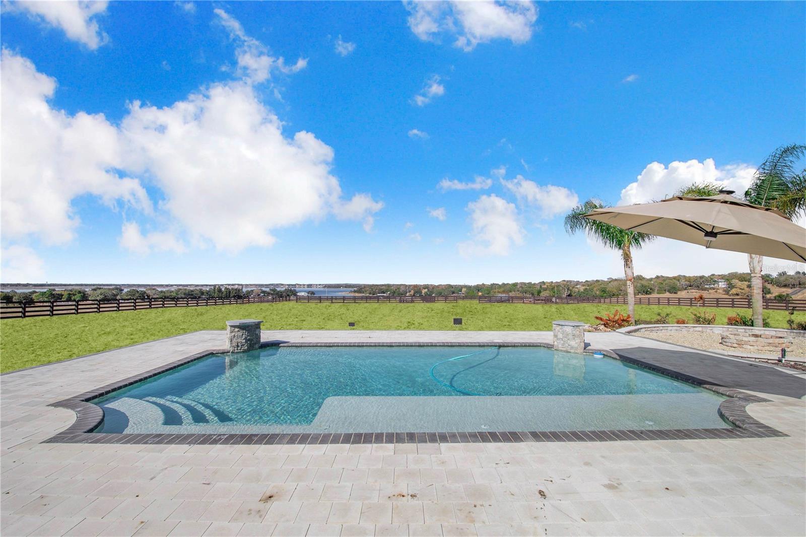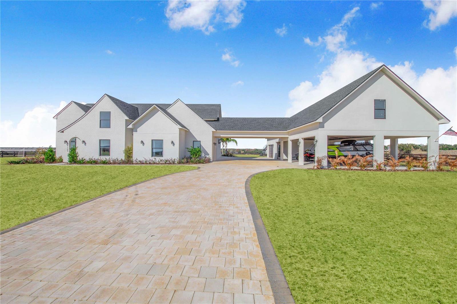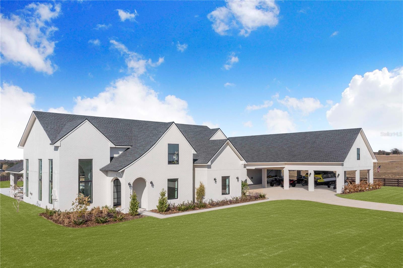 Experience refined lakefront living in this stunning modern French Colonial estate, custom built in 2025 and perfectly situated on 2 private acres overlooking beautiful Crooked Lake. Thoughtfully designed with exceptional craftsmanship and luxury finishes throughout, this property offers approximately 4,000 square feet of total living space, including a beautifully appointed main residence and a spacious private guest suite above the garage, total under roof is 6880 sq ft. Main Residence – 3 Bedrooms | 2 Bathrooms From the moment you arrive, the architectural details set this home apart. Enter through a solid iron front door with glass panes into an elegant foyer featuring a decorative ceiling, stone accent wall, and graceful arched doorways. Living Areas Expansive living room with breathtaking lake views through oversized, tall windows 10-foot ceilings with exposed wood beams 18-foot tongue-and-groove ceiling detail Electric fireplace with floor-to-ceiling stone feature wall Open-concept design connecting the living room and kitchen Dining room with an elegant tray ceiling Chef’s Kitchen (21' x 13') Oversized 9' x 5.5' island with Taj Mahal quartz countertops Countertop cooktop with built-in oven and custom vent hood Under-cabinet lighting throughout Floating upper shelves for a modern touch Spacious walk-in pantry (7' x 10.5') with built-in cabinetry Primary Suite (19' x 14') Tongue-and-groove ceilings with recessed lighting Electric fireplace with stone accent wall Spa-inspired en-suite bath featuring: Large walk-in shower with dual benches Separate makeup vanity Walk-in closet constructed with solid poured concrete, designed as a hurricane-safe room Additional Interior Features Wide-plank laminate flooring throughout Two guest bedrooms with walk-in closets Spacious laundry room (10' x 14') with upper and lower cabinetry and designer tile flooring Foam insulation throughout the entire home for enhanced energy efficiency and lower utility costs Outdoor Living & Entertaining Designed to embrace Florida’s natural beauty, the home seamlessly blends indoor and outdoor living. Sliding glass doors leading to a covered patio 18' x 30' Roman-style heated pool with tanning shelf Fire pit area perfect for enjoying sunset views over Crooked Lake Brick paver driveway, breezeway, and carport Permanent outdoor track lighting surrounding the entire home Professionally landscaped grounds Garage, Carport & Guest Quarters This property offers exceptional flexibility and storage. Four-car carport connected by a covered brick-paver breezeway Attached two-car garage with epoxy flooring Private 1,200 sq. ft. upstairs suite featuring: One bedroom plus office (optional second bedroom) Spacious living room and kitchenette combination Full bathroom Bonus room ideal for recreation, gym, or media space A True Custom Lakefront Estate Every detail of this home reflects thoughtful design, quality craftsmanship, and timeless elegance. From the architectural character and high-end finishes to the expansive lake views and resort-style outdoor living, this is a rare opportunity to own a truly custom-built retreat created with care and intention. A one-of-a-kind property where luxury, comfort, and scenic beauty come together seamlessly. The apartment will be completed within 30 days and pictures to follow upon completion.
