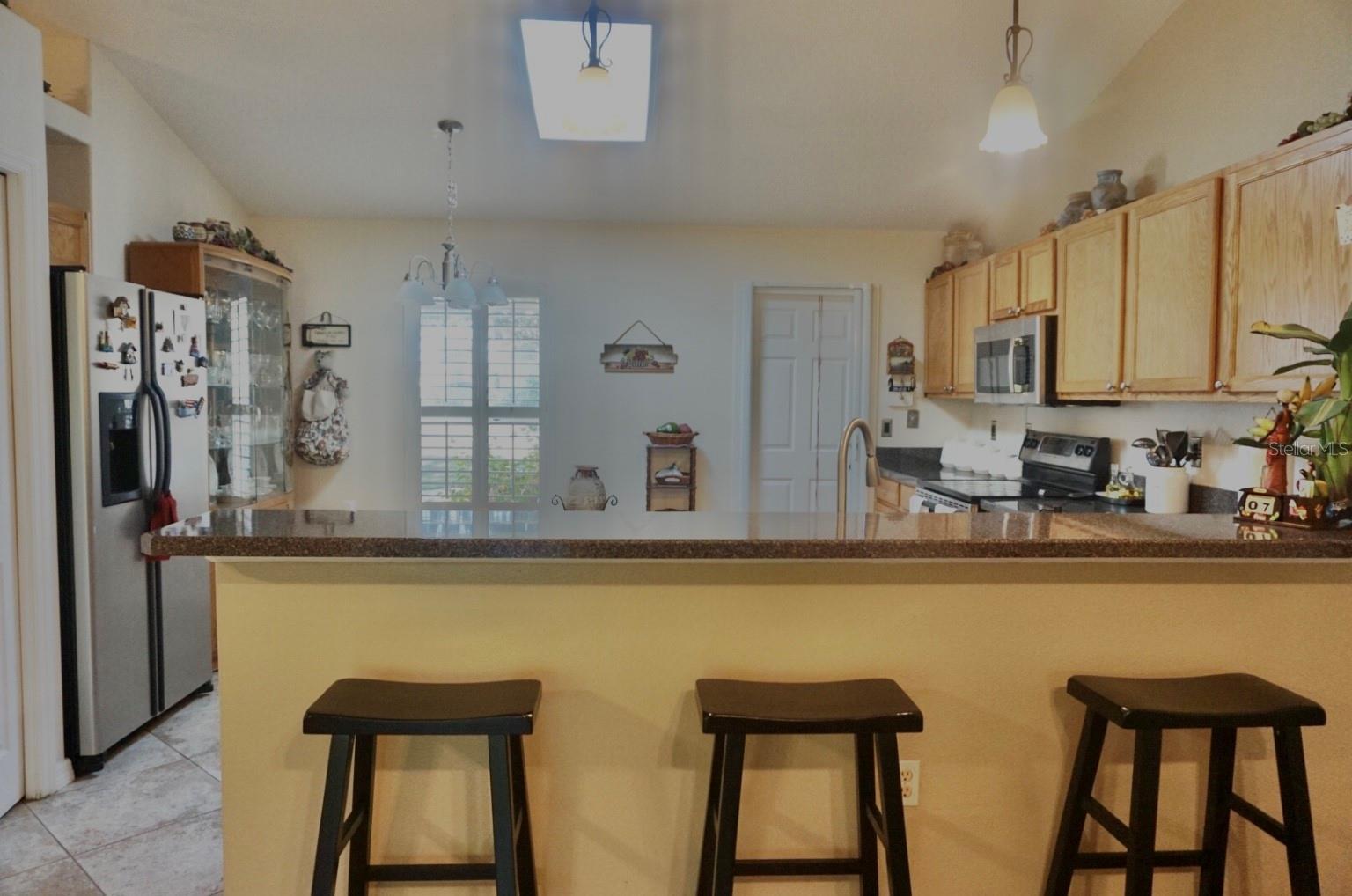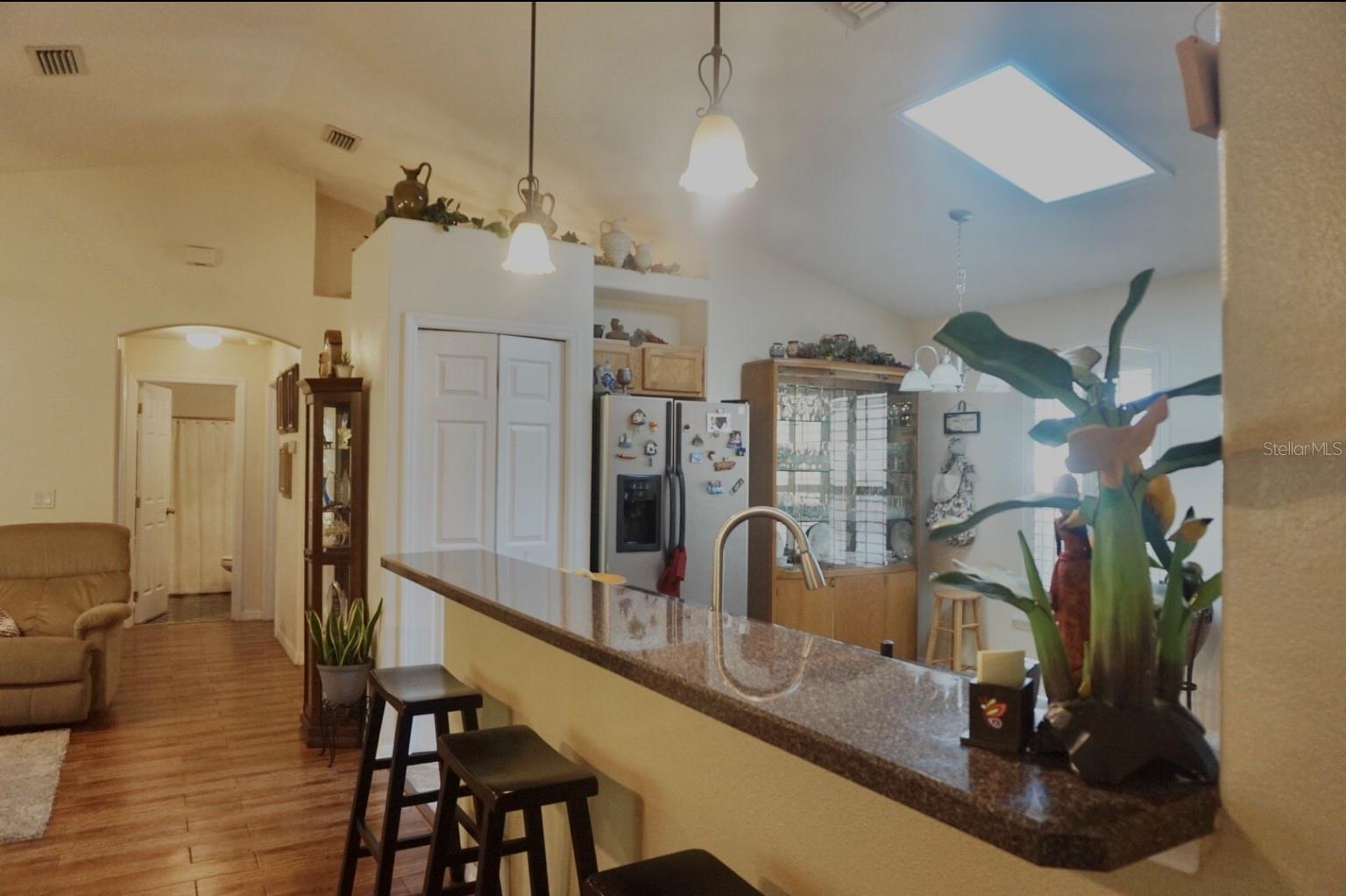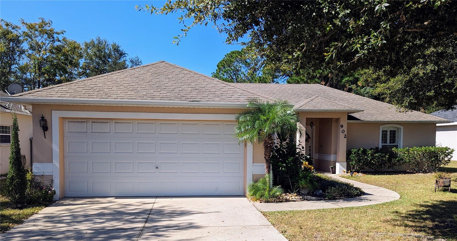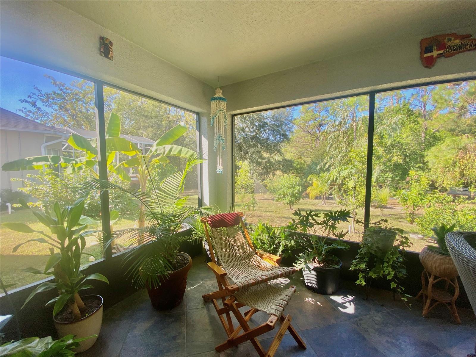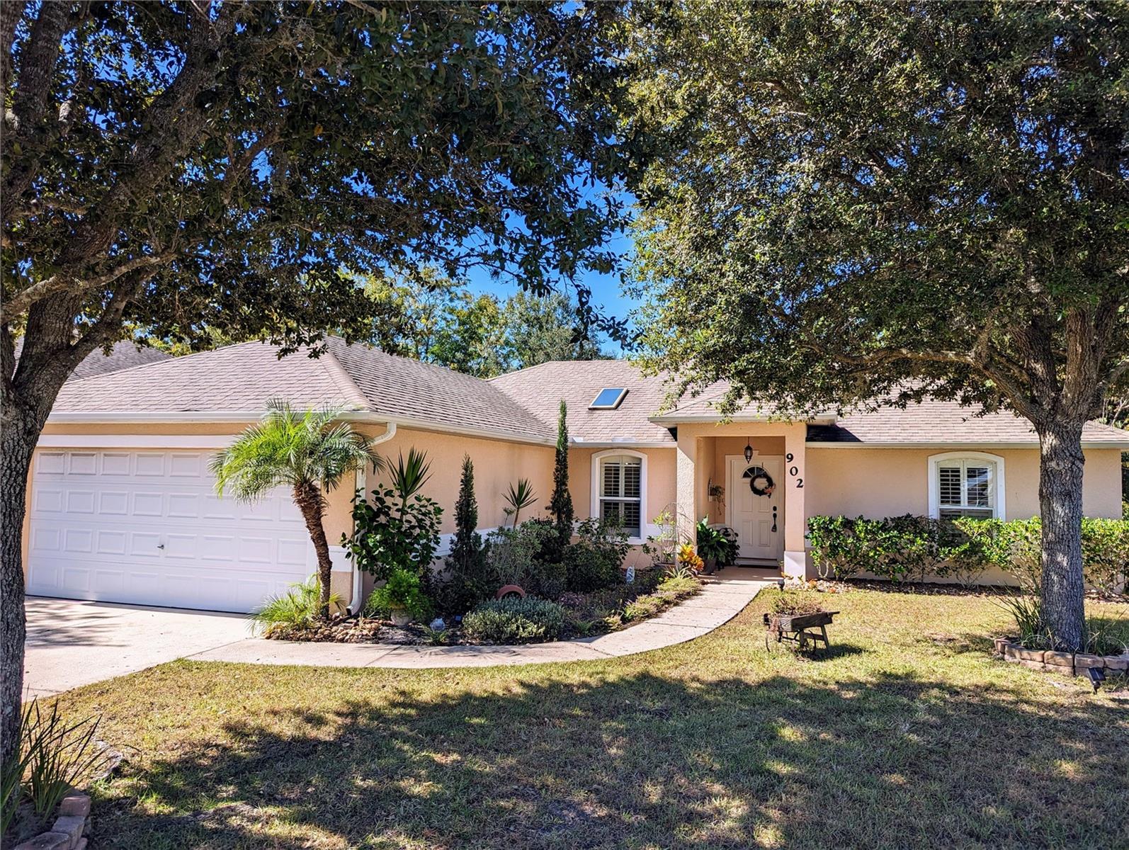 In a small community tucked away near Lake Griffin with very easy access to highway 27, you are welcomed to this lovely home with a large driveway that leads the way to a two car garage and charmingly landscaped entry way. Walking inside you are greeted by a full closet to hang your coat and tiled floors leading into the main living area. Heading from the foyer to the right of this beautifully maintained home you have twin bedrooms hugging a full bathroom between them. The open concept provides a smooth flow from the bedrooms back into the living space, dining area and to the kitchen where the sky light highlights the room and reduces the need for additional light. Further on you have the main bedroom with a walk-in closet and large bathroom. This bedroom and the closet are the only sections carpeted in this home, ceramic and porcelain tile fill the rest. As you exit the back door you are greeted by the view of fruit trees and built-in sandbox sitting just outside the screened porch. The established trees on this property include Mangos, Avocado, Lime, Guava, Papaya, Eucalyptus, Dates, Passion Fruit and Persimmon! The gutter system around the home helps maintain the exterior and the included washer and dryer truly make this a move-in ready home! In order to ensure the Buyer is aware of the new law restricting certain real estate purchases by certain Foreign Buyers, we request Buyer signatures on the Foreign Buyer Notice (available in the attachments), to accompany all offers.”
