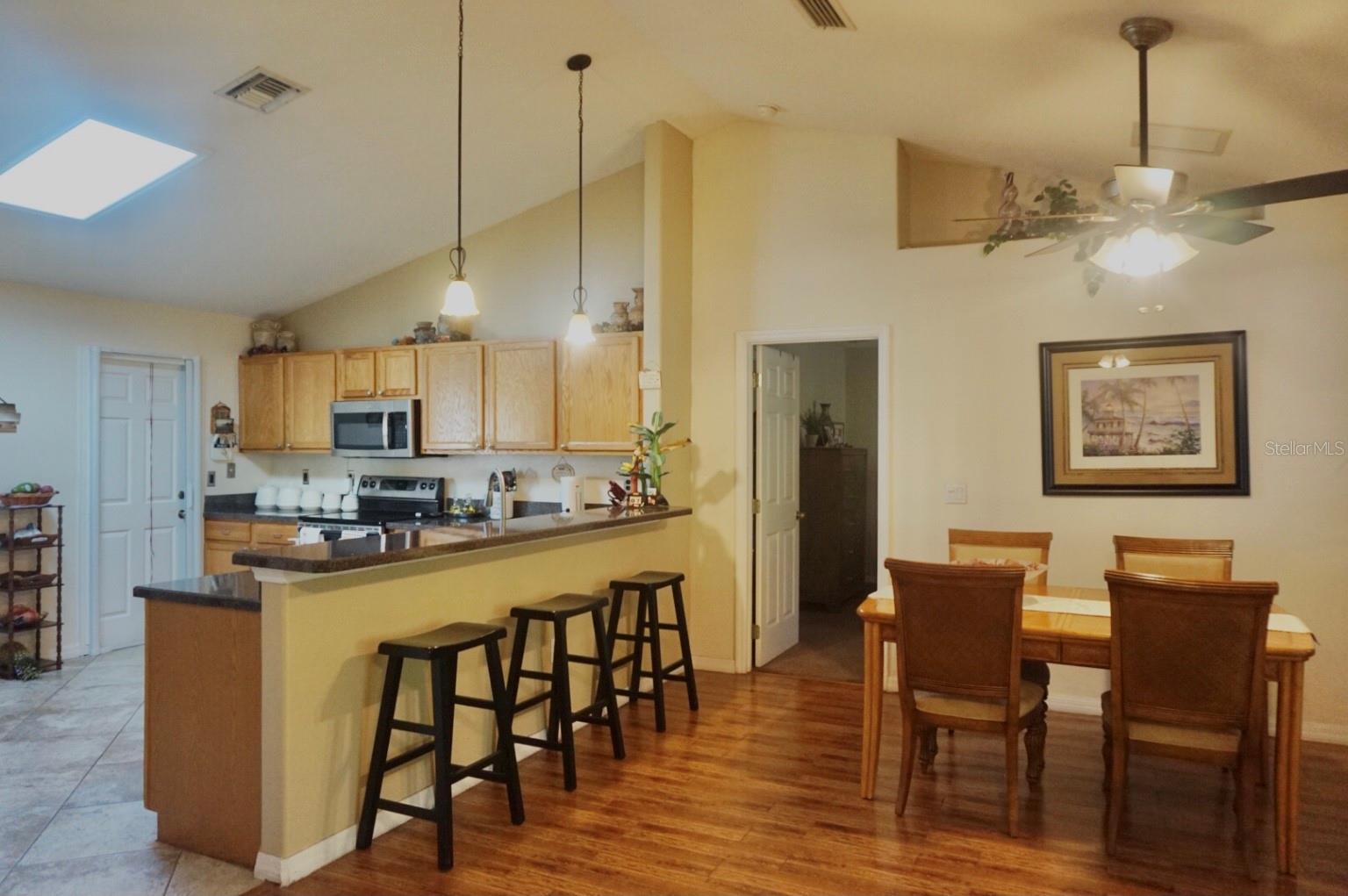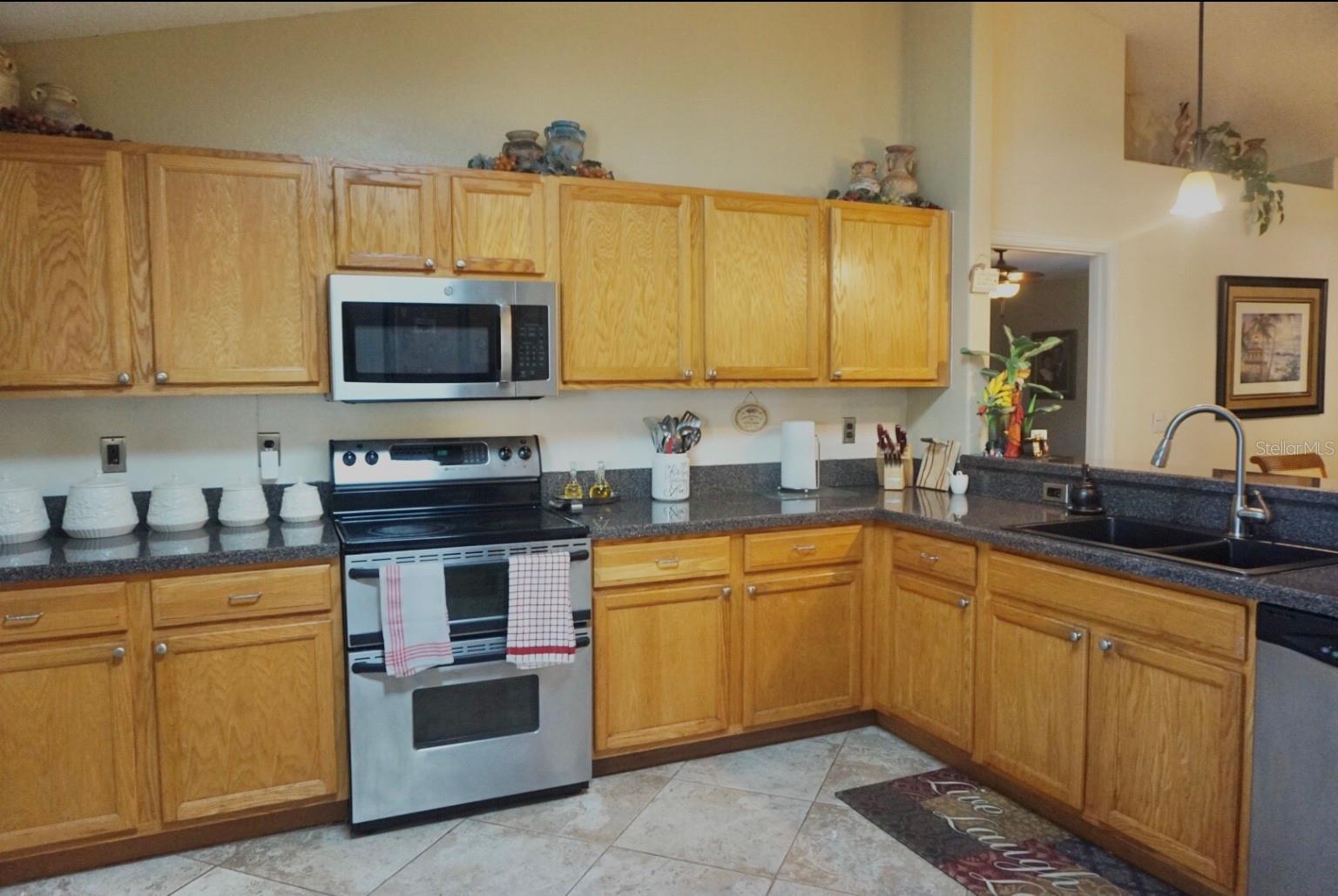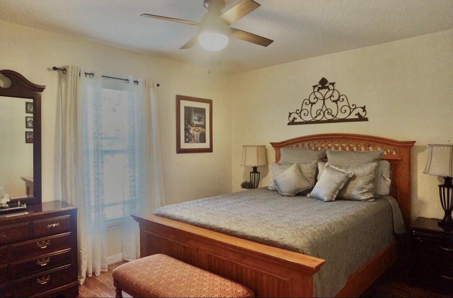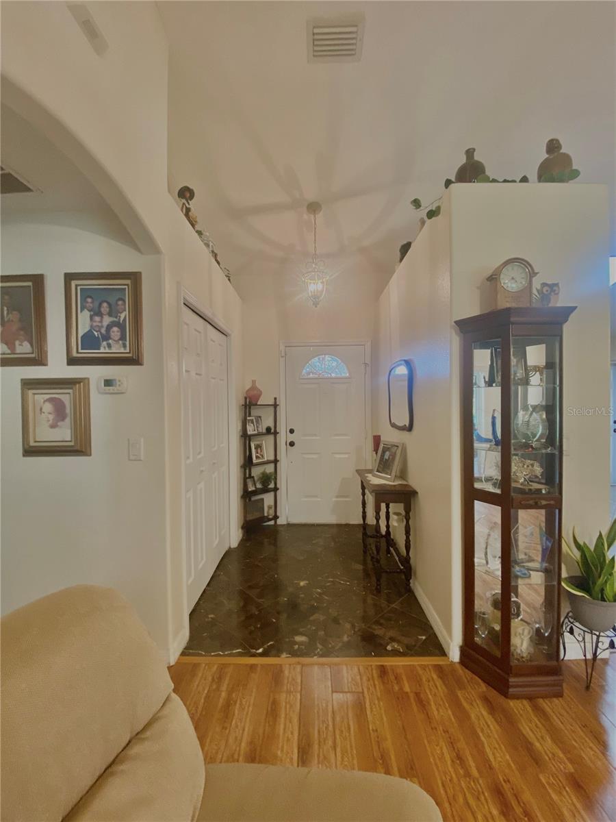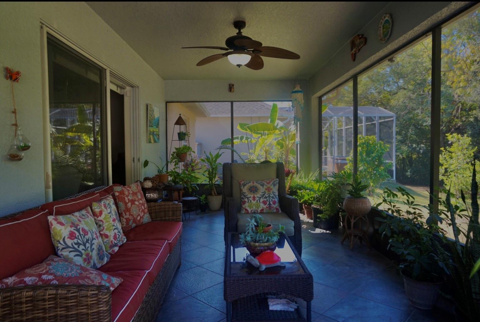 In a small community tucked away near Lake Griffin with very easy access to highway 27, you are welcomed to this lovely home with a large driveway that leads the way to a two car garage and charmingly landscaped entry way. Walking inside you are greeted by a full closet to hang your coat and tiled floors leading into the main living area. Heading from the foyer to the right of this beautifully maintained home you have twin bedrooms hugging a full bathroom between them. The open concept provides a smooth flow from the bedrooms back into the living space, dining area and to the kitchen where the sky light highlights the room and reduces the need for additional light. Further on you have the main bedroom with a walk-in closet and large bathroom. This bedroom and the closet are the only sections carpeted in this home, ceramic and porcelain tile fill the rest. As you exit the back door you are greeted by the view of fruit trees and built-in sandbox sitting just outside the screened porch. The established trees on this property include Mangos, Avocado, Lime, Guava, Papaya, Eucalyptus, Dates, Passion Fruit and Persimmon! The gutter system around the home helps maintain the exterior and the included washer and dryer truly make this a move-in ready home! In order to ensure the Buyer is aware of the new law restricting certain real estate purchases by certain Foreign Buyers, we request Buyer signatures on the Foreign Buyer Notice (available in the attachments), to accompany all offers.”