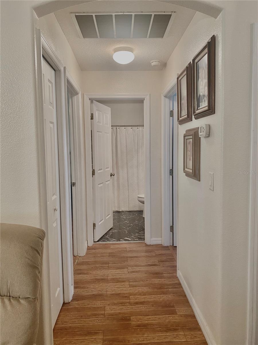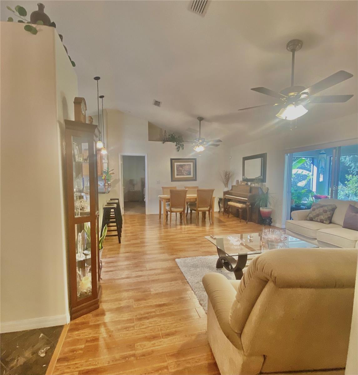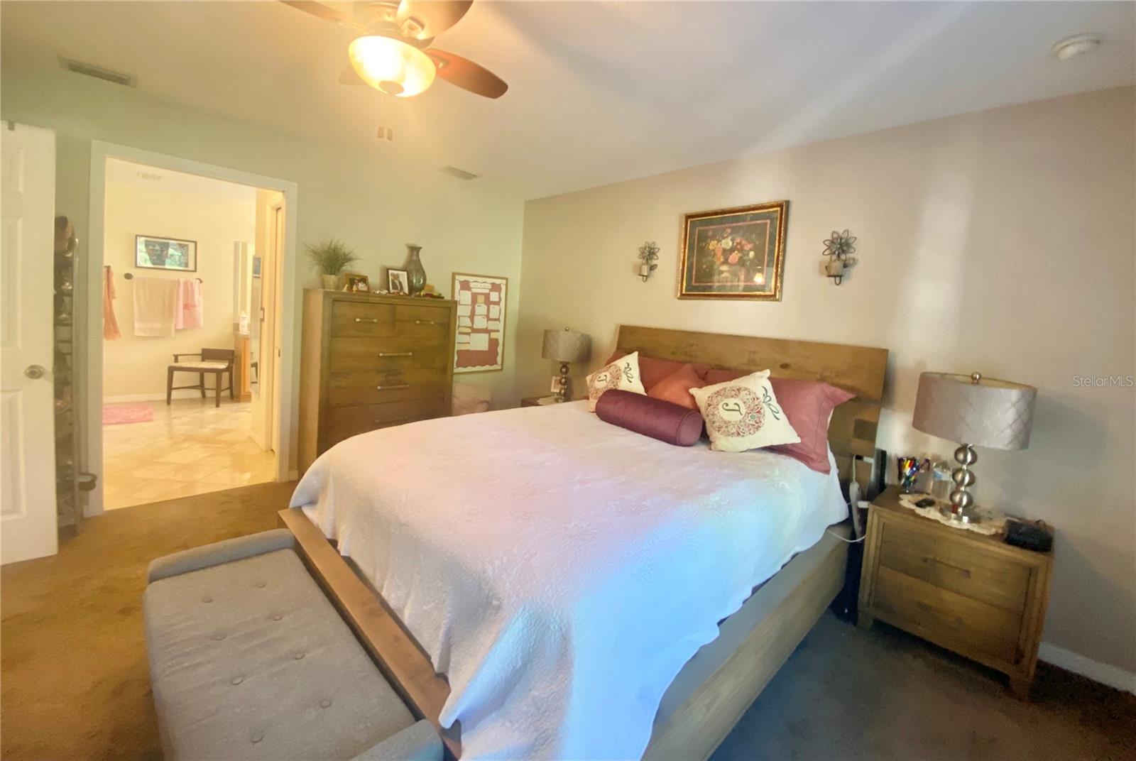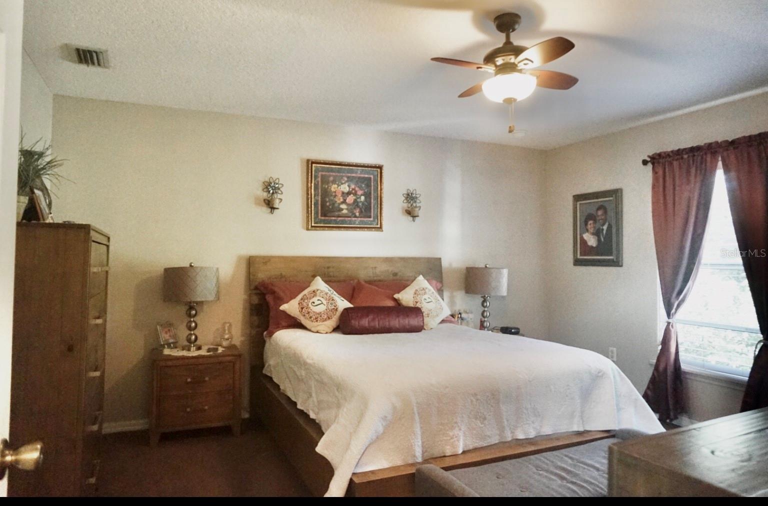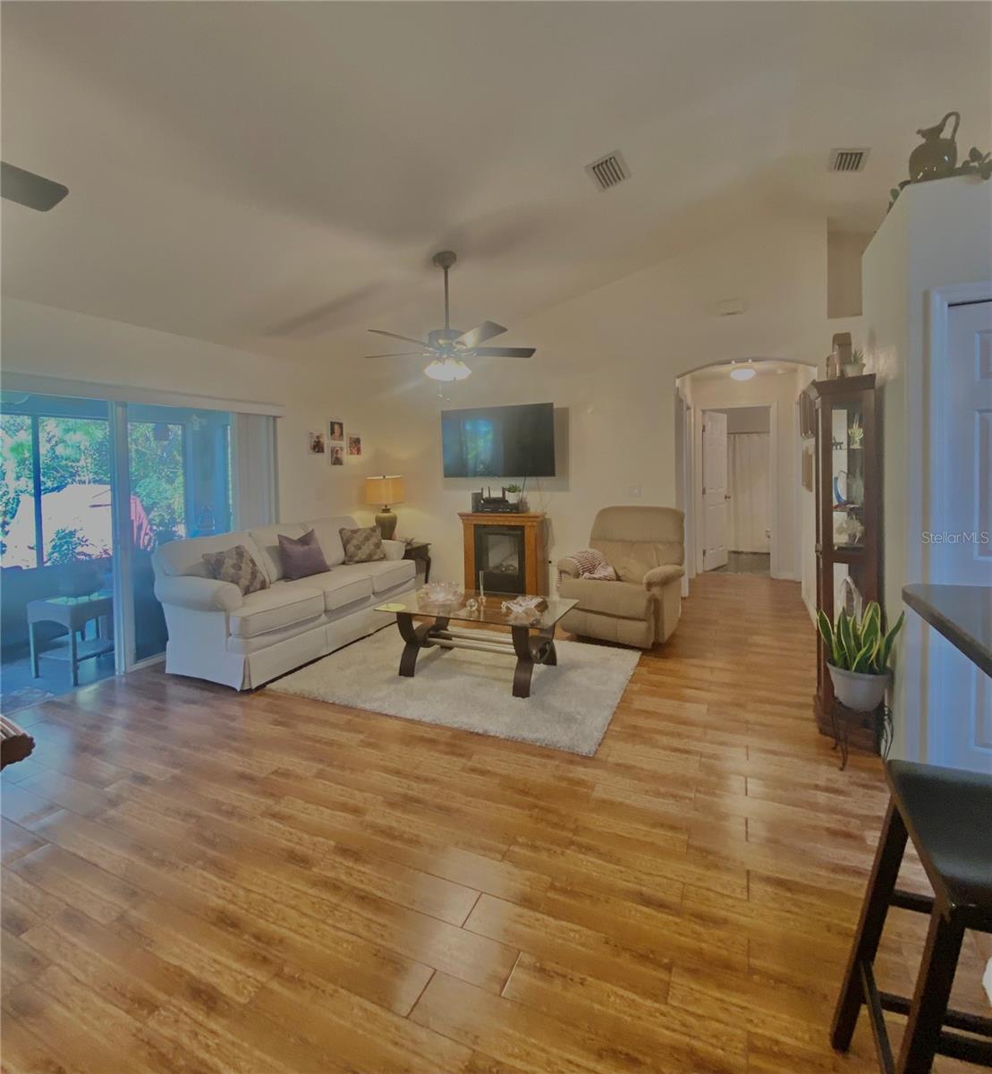 In a small community tucked away near Lake Griffin with very easy access to highway 27, you are welcomed to this lovely home with a large driveway that leads the way to a two car garage and charmingly landscaped entry way. Walking inside you are greeted by a full closet to hang your coat and tiled floors leading into the main living area. Heading from the foyer to the right of this beautifully maintained home you have twin bedrooms hugging a full bathroom between them. The open concept provides a smooth flow from the bedrooms back into the living space, dining area and to the kitchen where the sky light highlights the room and reduces the need for additional light. Further on you have the main bedroom with a walk-in closet and large bathroom. This bedroom and the closet are the only sections carpeted in this home, ceramic and porcelain tile fill the rest. As you exit the back door you are greeted by the view of fruit trees and built-in sandbox sitting just outside the screened porch. The established trees on this property include Mangos, Avocado, Lime, Guava, Papaya, Eucalyptus, Dates, Passion Fruit and Persimmon! The gutter system around the home helps maintain the exterior and the included washer and dryer truly make this a move-in ready home! In order to ensure the Buyer is aware of the new law restricting certain real estate purchases by certain Foreign Buyers, we request Buyer signatures on the Foreign Buyer Notice (available in the attachments), to accompany all offers.”