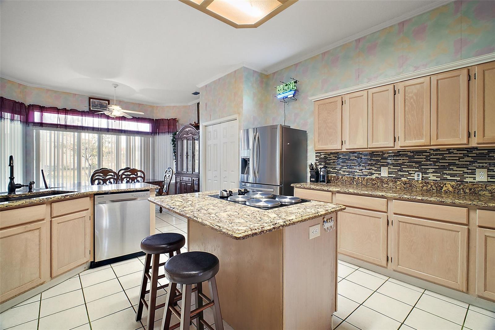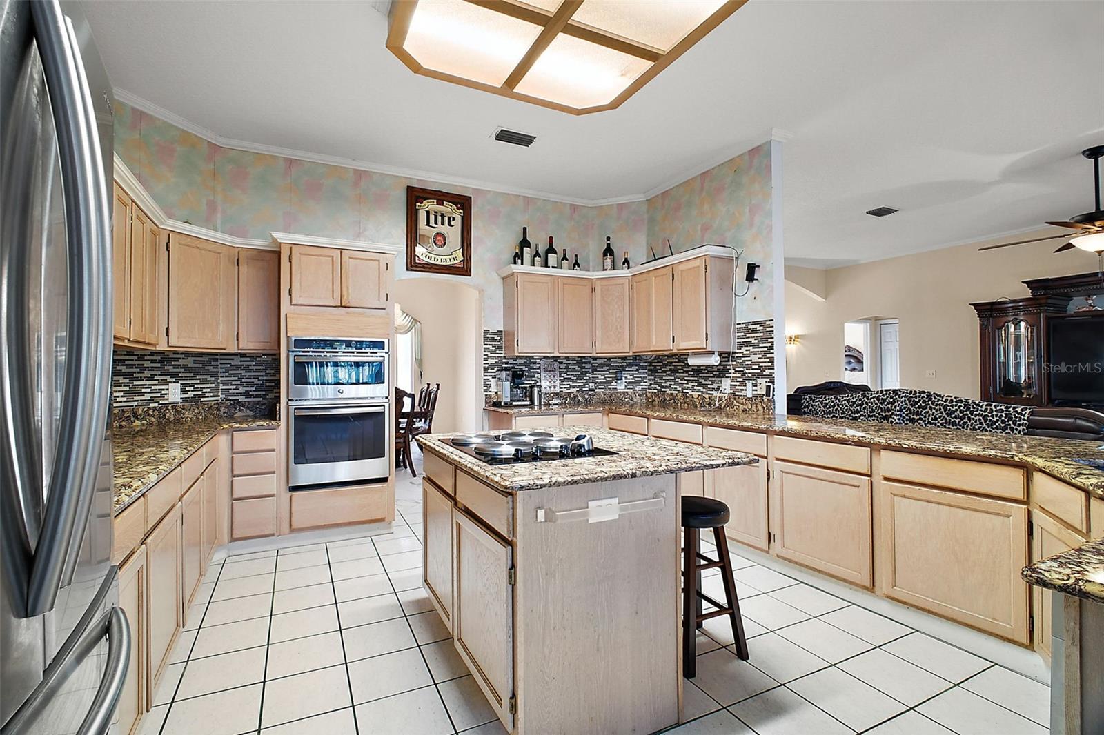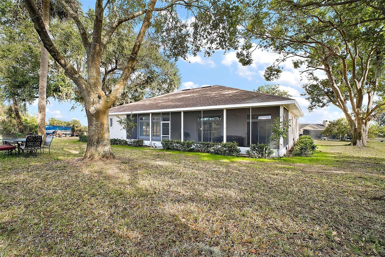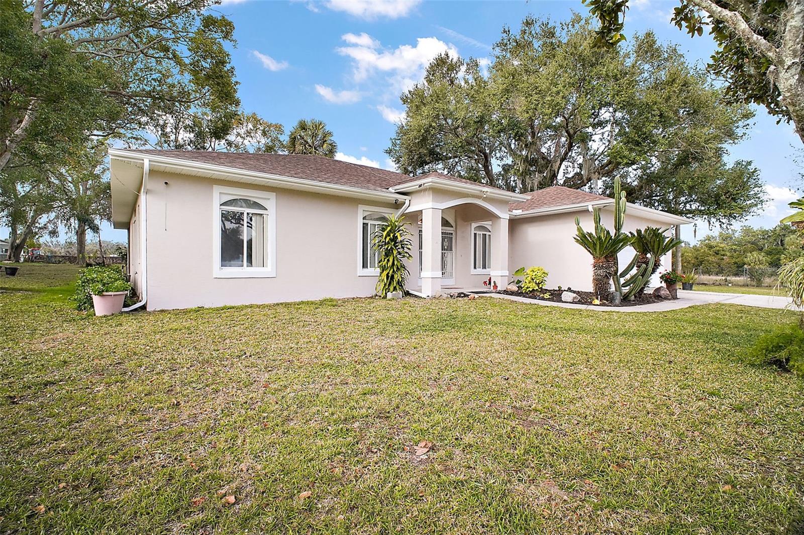 Discover this 3/2 concrete block home nestled at the end of a quiet cul-de-sac. Situated on a sprawling 0.67-acre lot with beautiful Lake Griffin views from your front porch. The generous 2,371 sq ft floor plan features an inviting open concept design, with the living room flowing seamlessly into the updated kitchen. Recent improvements include new kitchen countertops, fresh tile flooring, exterior paint, and a 2022 roof. Kitchen comes equipped with built-in oven and range, plus washer and dryer included. The attached 2-car garage provides ample storage, while the large lot features a storage shed for additional space. Enjoy the best of both worlds with city water for household use and well irrigation for landscaping, plus private septic. Conveniently located near The Villages for endless shopping, dining, and entertainment options. NO HOA/CDD fees. Furnishings are optional.