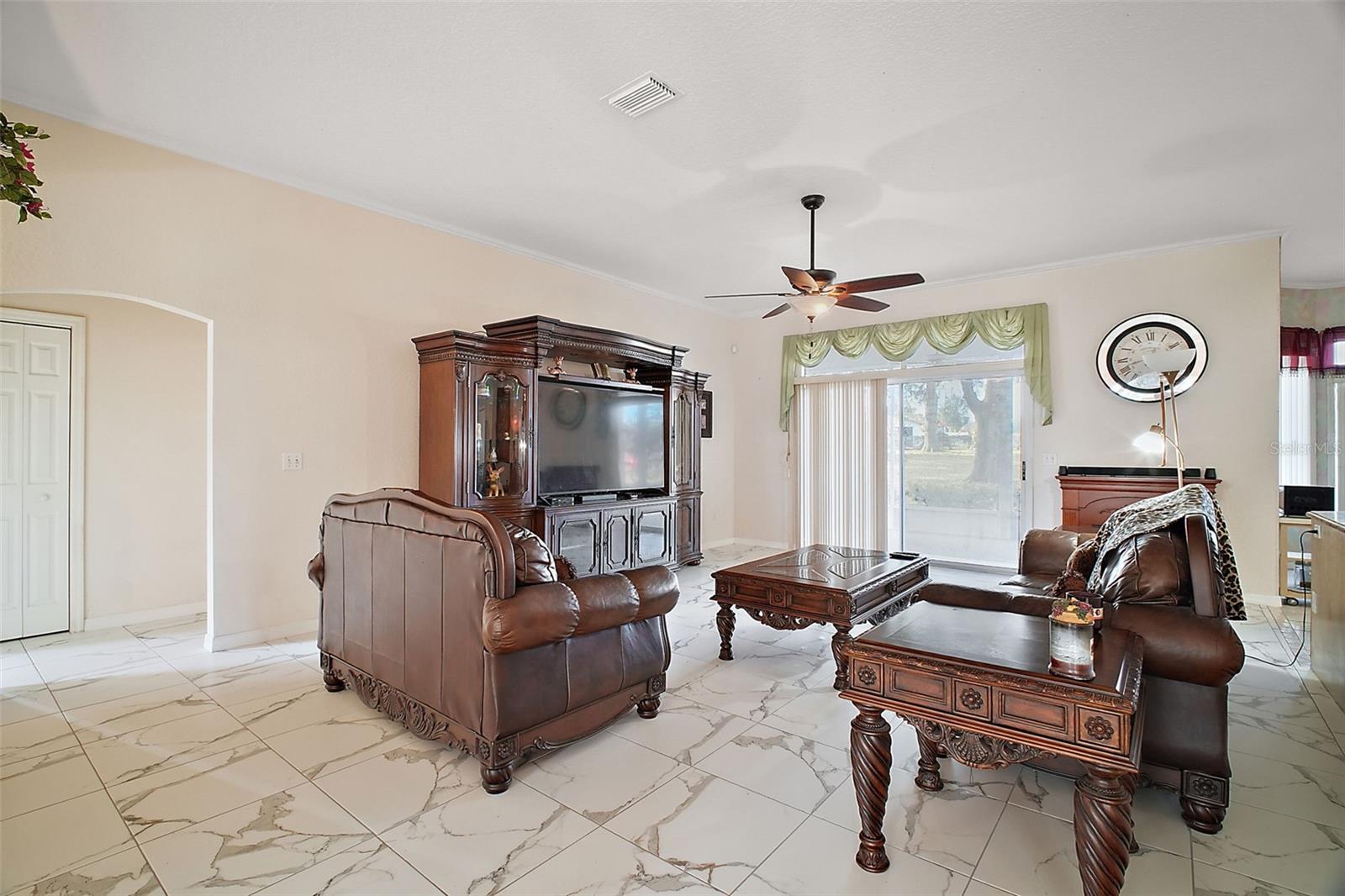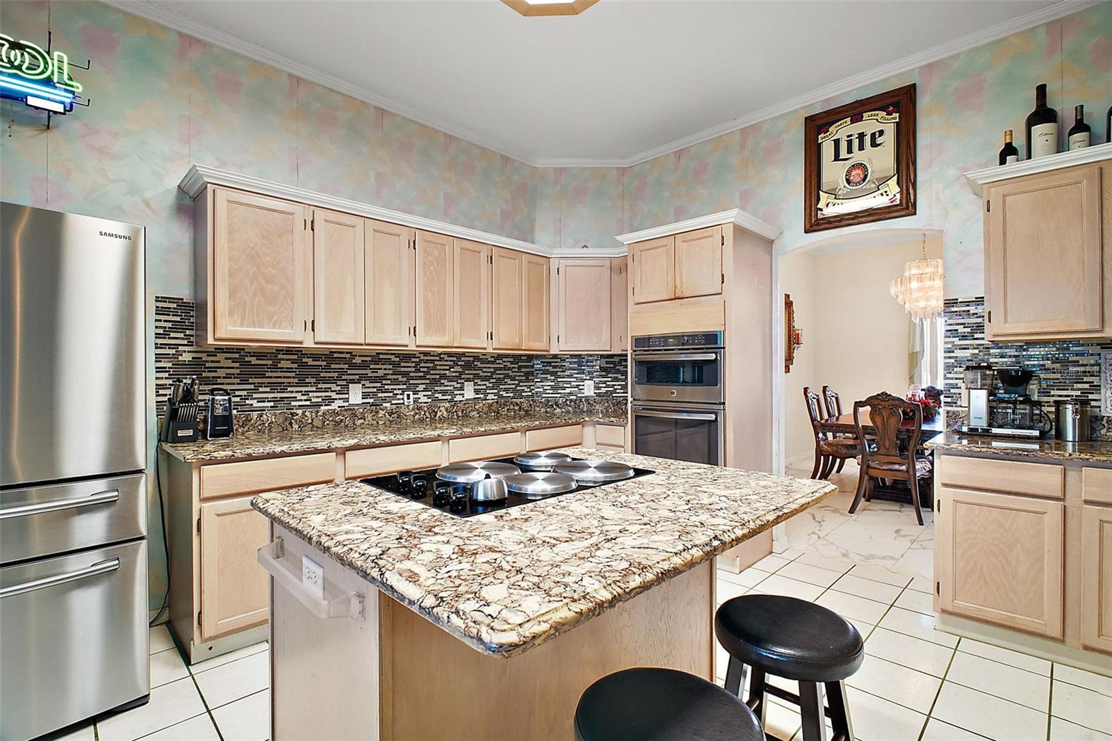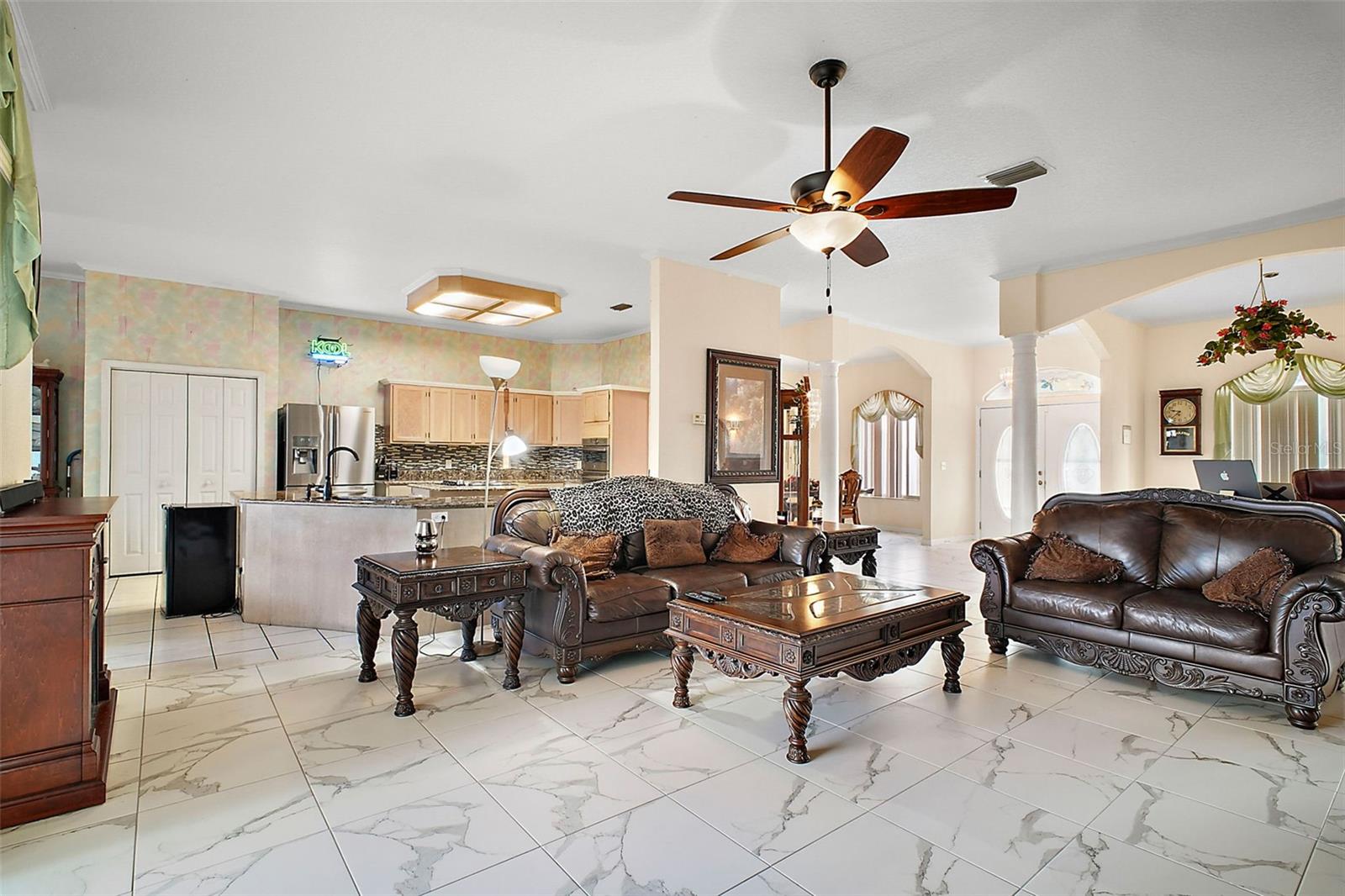 Discover this 3/2 concrete block home nestled at the end of a quiet cul-de-sac. Situated on a sprawling 0.67-acre lot with beautiful Lake Griffin views from your front porch. The generous 2,371 sq ft floor plan features an inviting open concept design, with the living room flowing seamlessly into the updated kitchen. Recent improvements include new kitchen countertops, fresh tile flooring, exterior paint, and a 2022 roof. Kitchen comes equipped with built-in oven and range, plus washer and dryer included. The attached 2-car garage provides ample storage, while the large lot features a storage shed for additional space. Enjoy the best of both worlds with city water for household use and well irrigation for landscaping, plus private septic. Conveniently located near The Villages for endless shopping, dining, and entertainment options. NO HOA/CDD fees. Furnishings are optional.