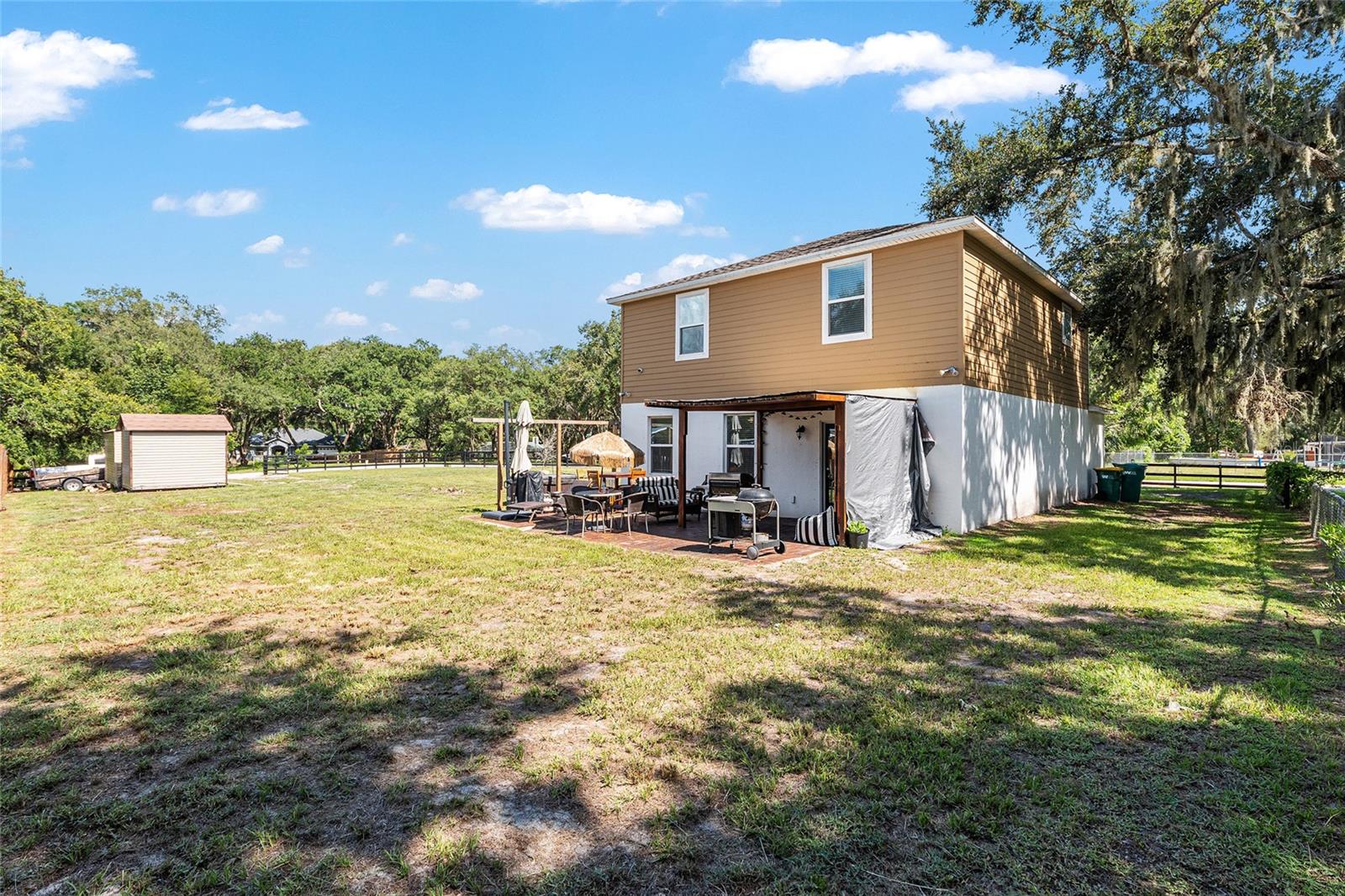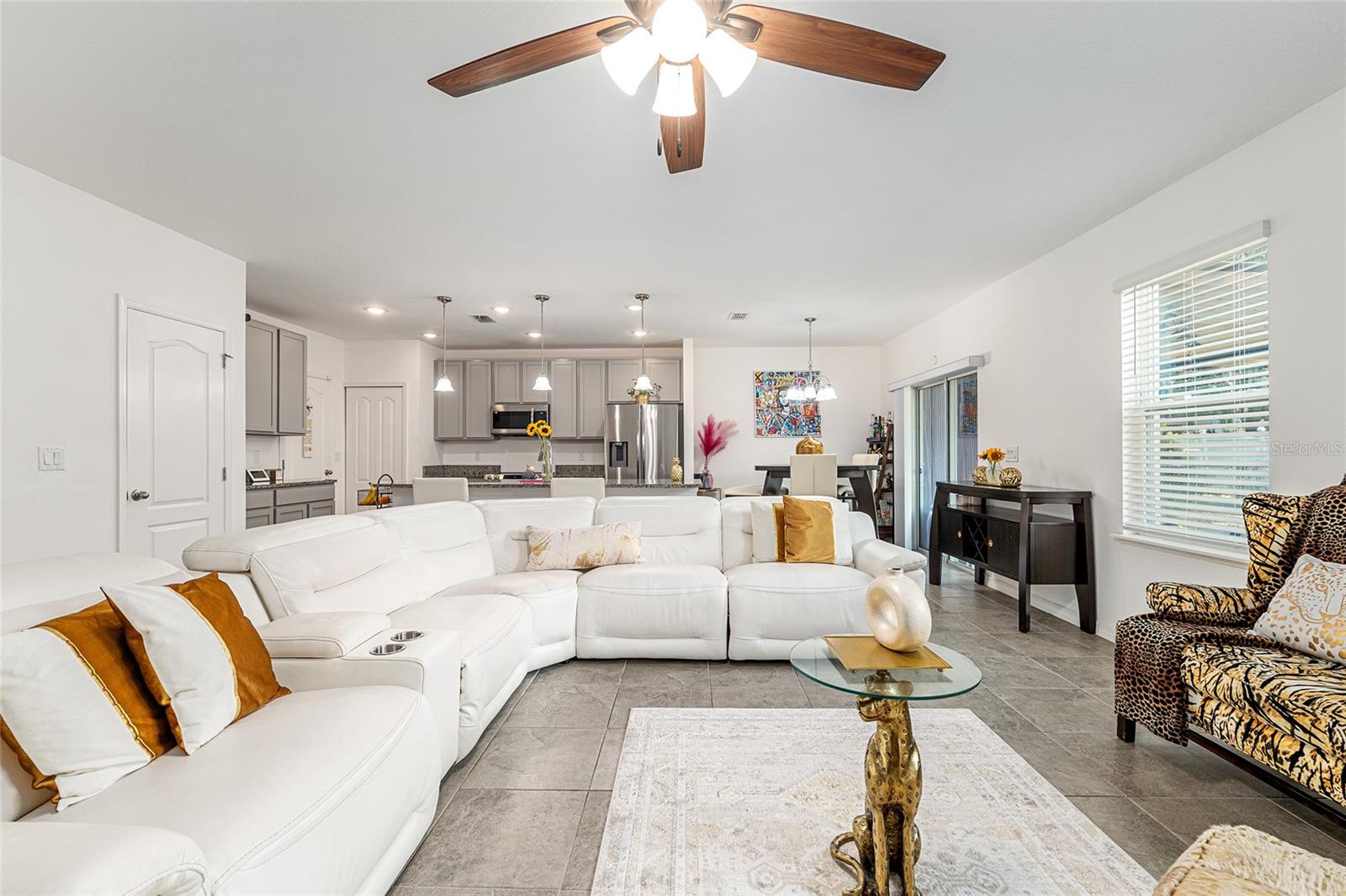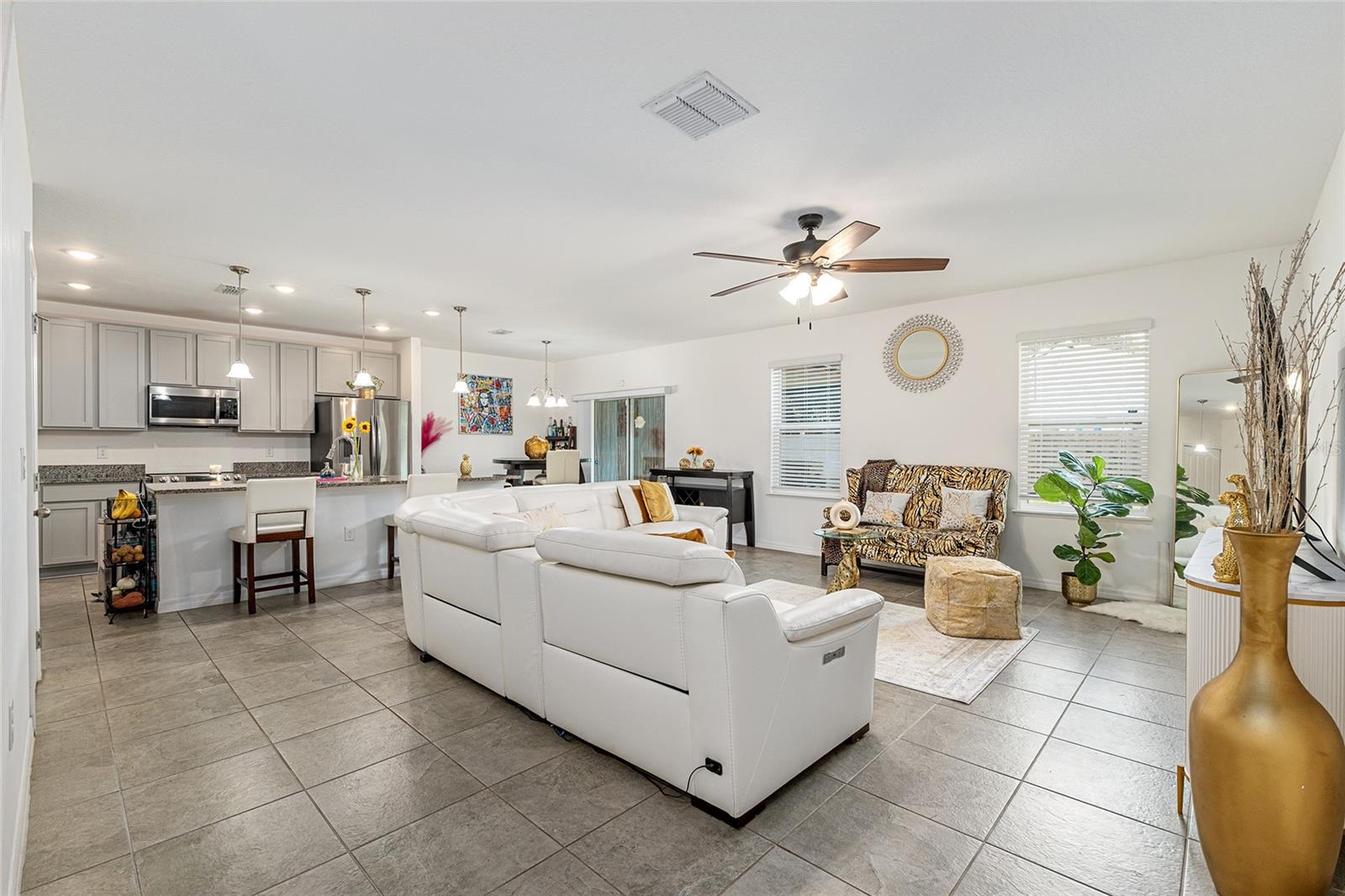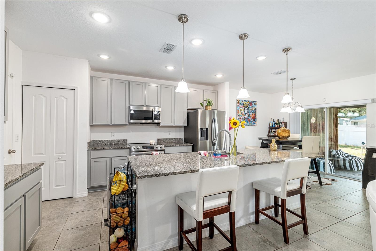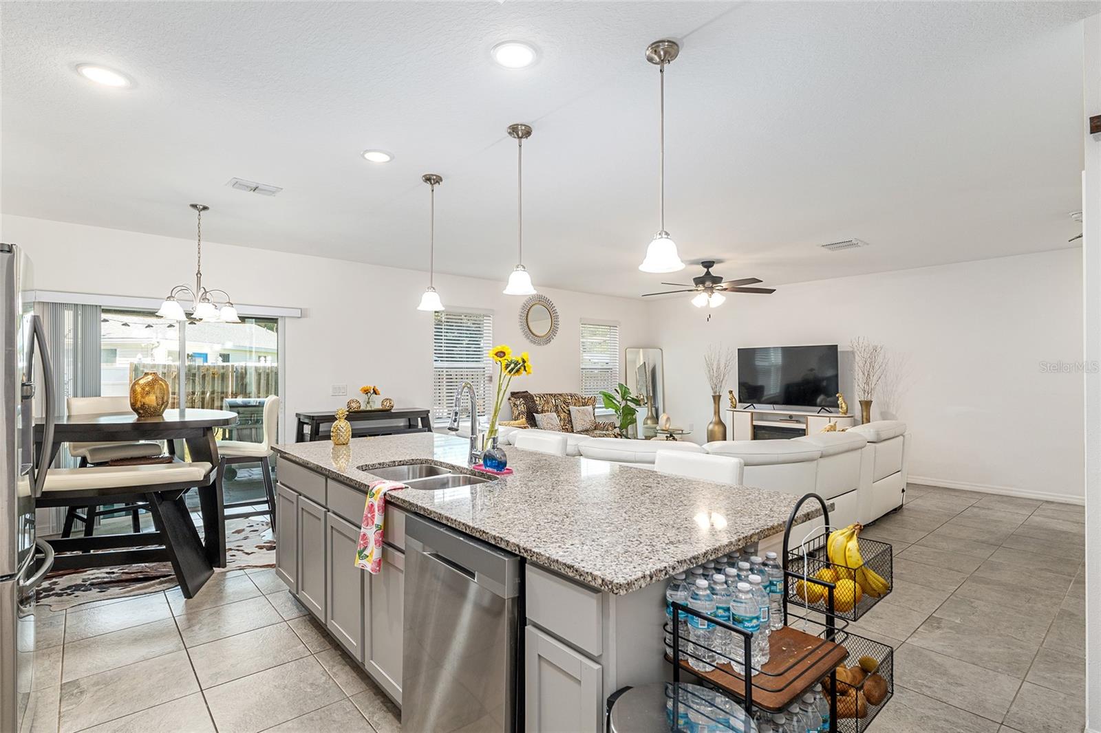 This stylish 4-bedroom, 2.5-bathroom home was built in 2023 and sits on nearly half an acre (0.44 acres), offering the perfect blend of space, comfort, and convenience. Step inside to discover an open-concept floor plan with sleek tile flooring, neutral color palette, and a spacious living area ideal for relaxing or entertaining. The kitchen is a standout, featuring gray cabinetry, granite countertops, stainless steel appliances, a closet pantry, and a large center island with seating—perfect for casual meals or gatherings. A convenient half bath is located on the main floor. Upstairs, you'll find the generous primary suite complete with a walk-in shower, dual sinks, and granite vanity. Three additional bedrooms share a guest bathroom, also featuring dual sinks and granite counters. Enjoy outdoor living on the covered back patio overlooking the expansive backyard—offering plenty of room for recreation, gardening, or even a future pool. Located close to shopping, dining, grocery stores, The Villages and medical facilities, this home offers both modern living and everyday convenience.