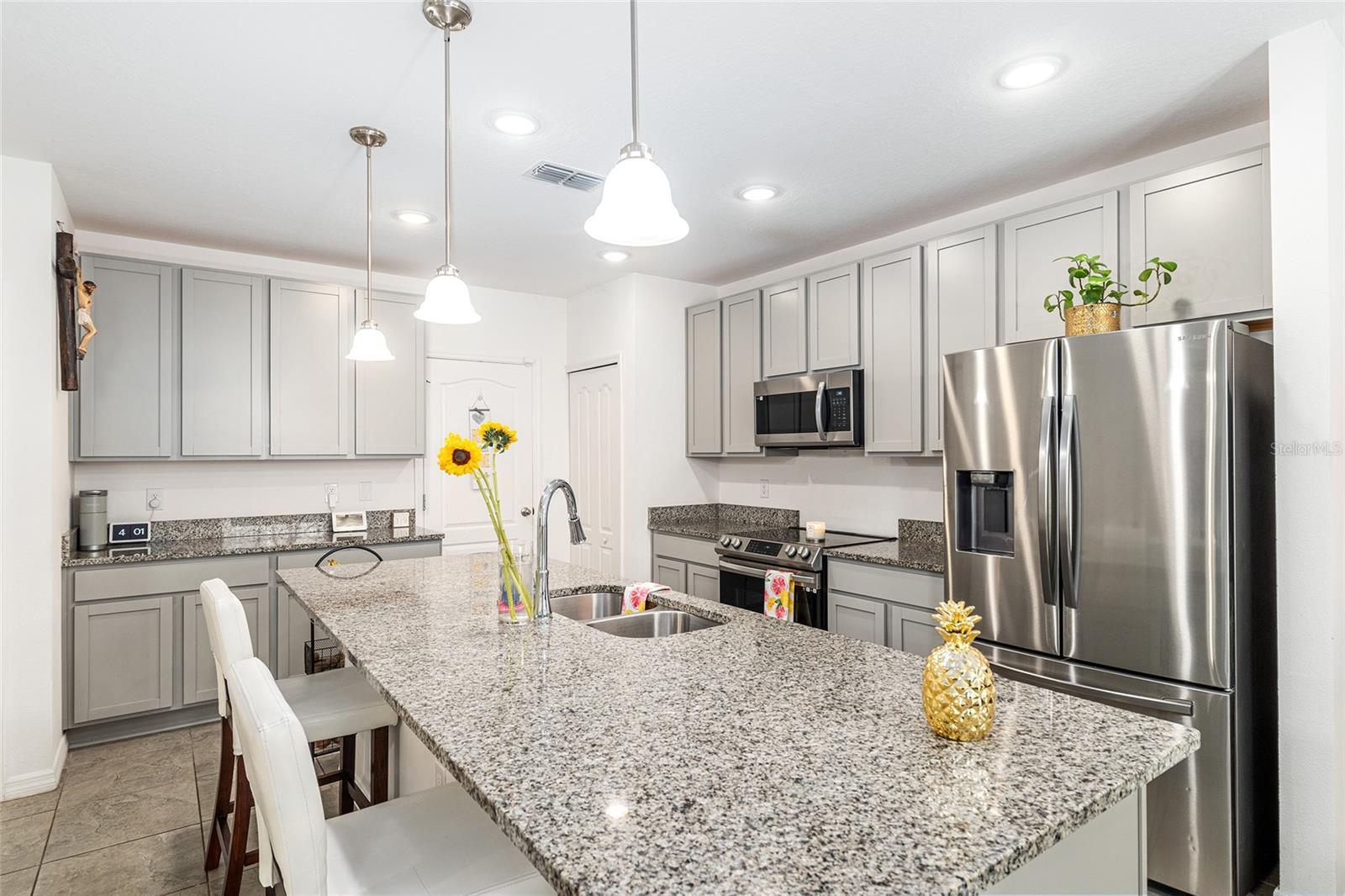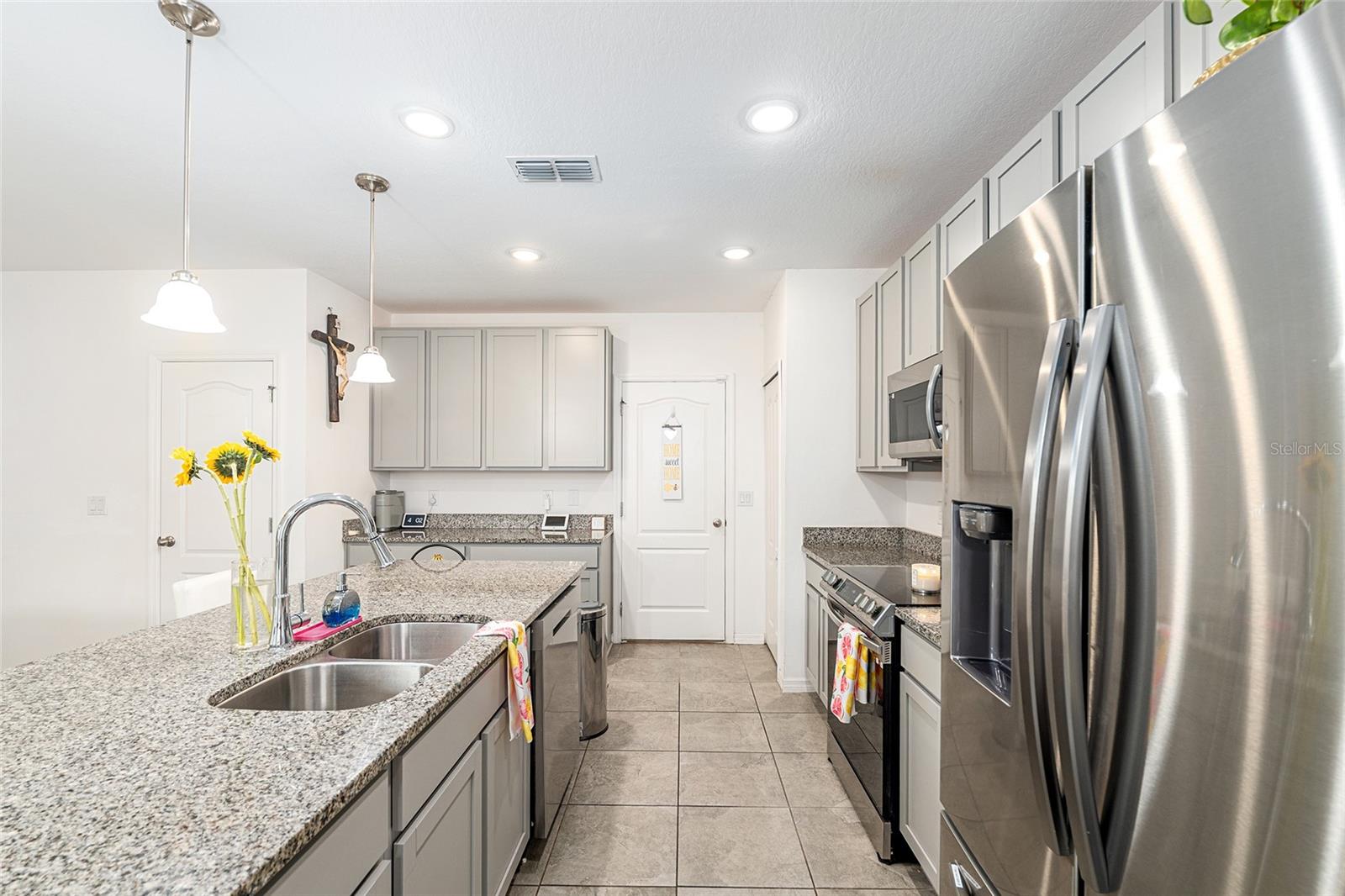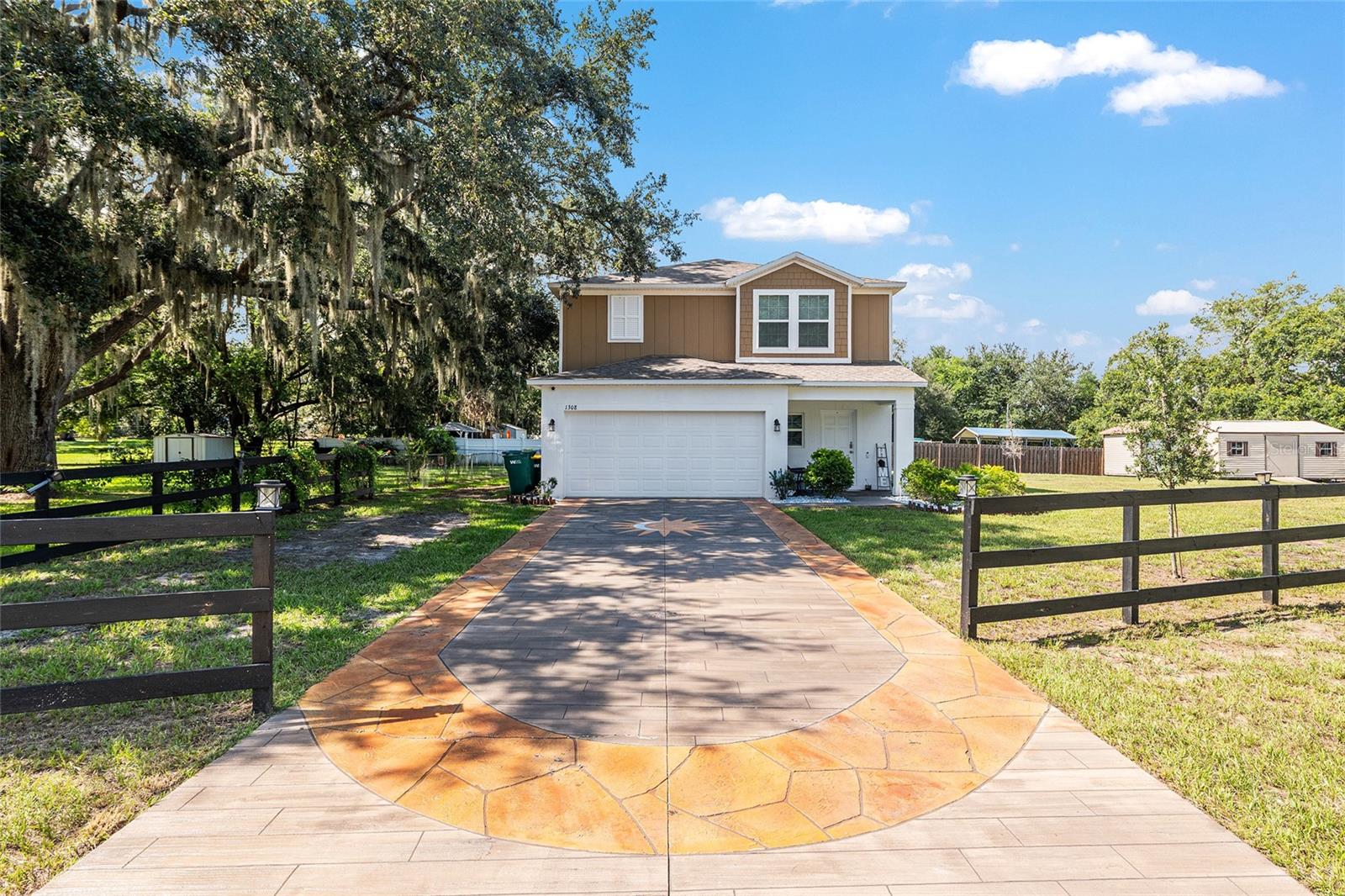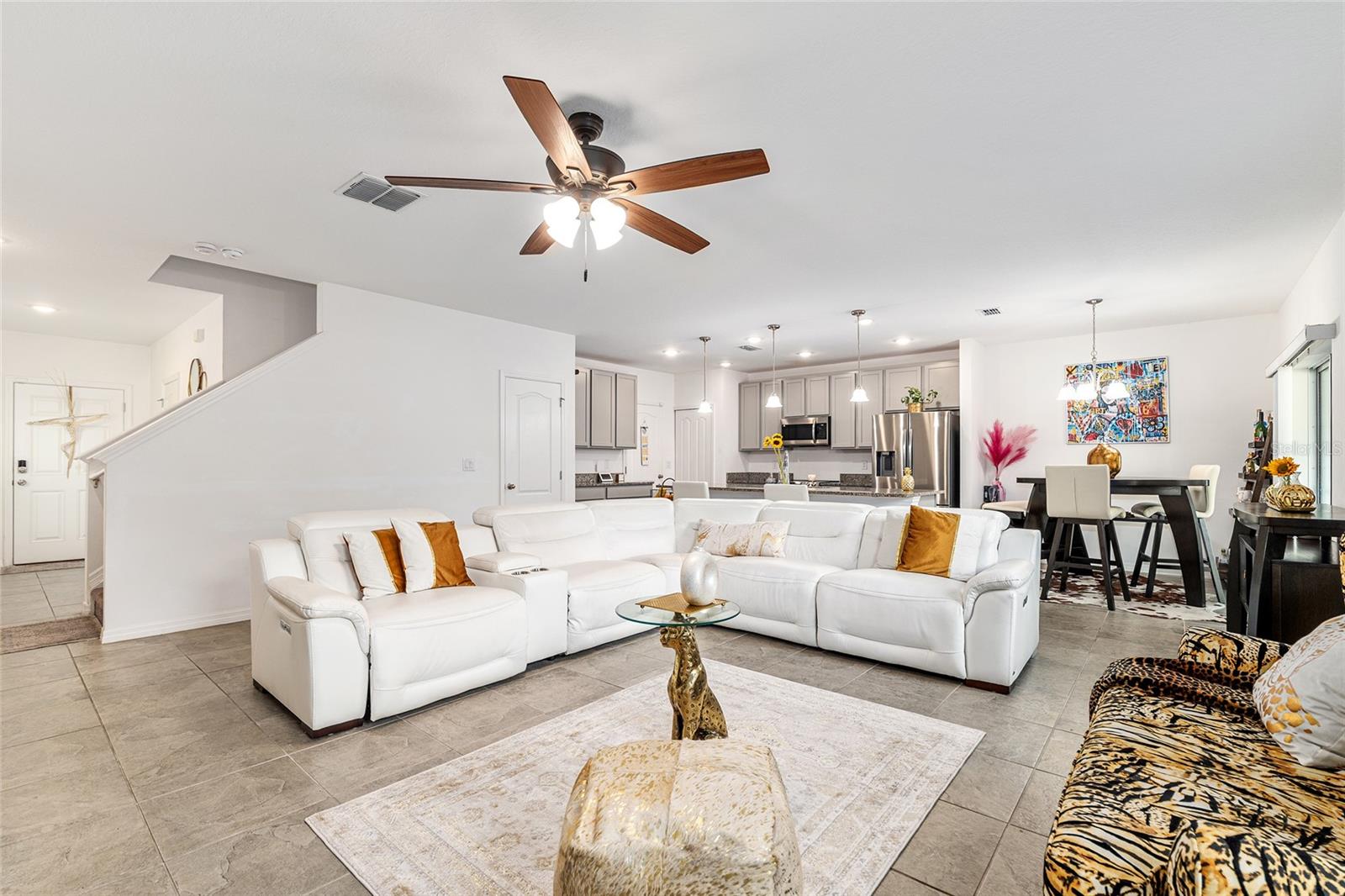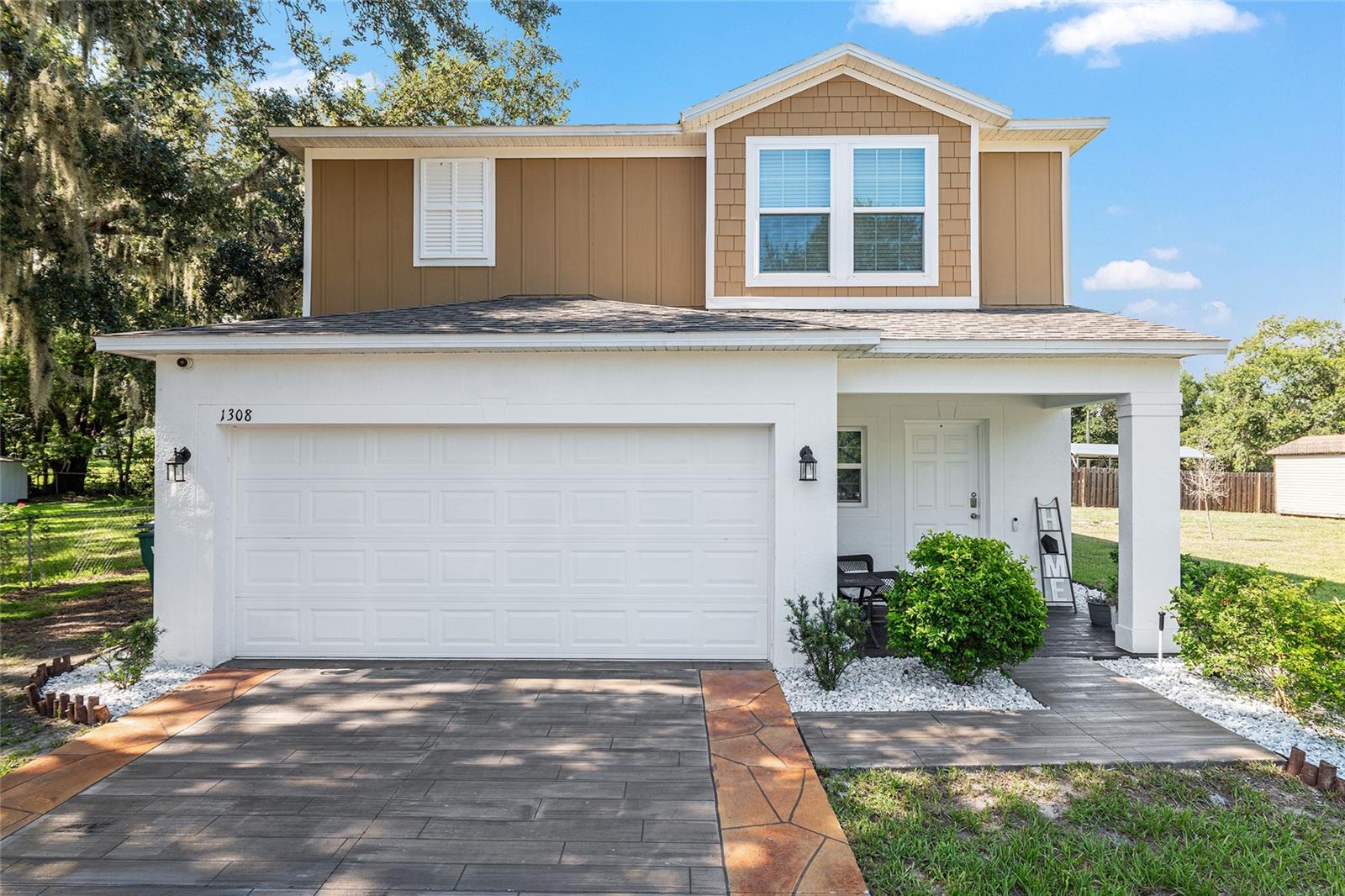 This stylish 4-bedroom, 2.5-bathroom home was built in 2023 and sits on nearly half an acre (0.44 acres), offering the perfect blend of space, comfort, and convenience. Step inside to discover an open-concept floor plan with sleek tile flooring, neutral color palette, and a spacious living area ideal for relaxing or entertaining. The kitchen is a standout, featuring gray cabinetry, granite countertops, stainless steel appliances, a closet pantry, and a large center island with seating—perfect for casual meals or gatherings. A convenient half bath is located on the main floor. Upstairs, you'll find the generous primary suite complete with a walk-in shower, dual sinks, and granite vanity. Three additional bedrooms share a guest bathroom, also featuring dual sinks and granite counters. Enjoy outdoor living on the covered back patio overlooking the expansive backyard—offering plenty of room for recreation, gardening, or even a future pool. Located close to shopping, dining, grocery stores, The Villages and medical facilities, this home offers both modern living and everyday convenience.