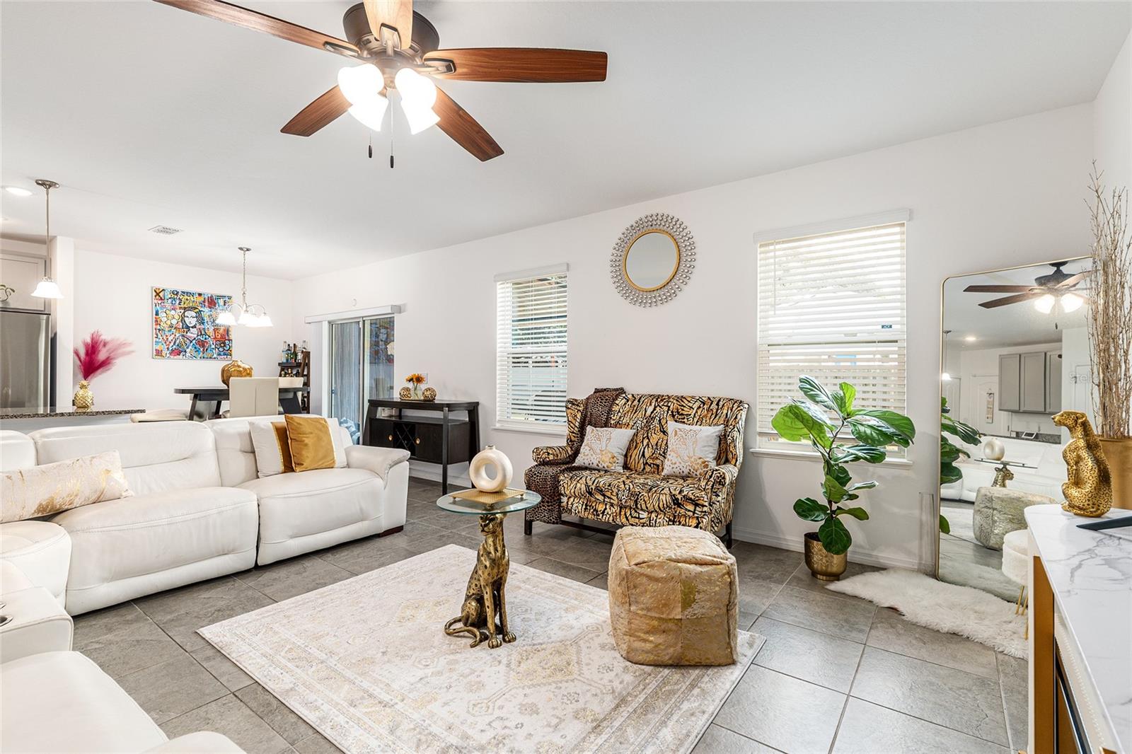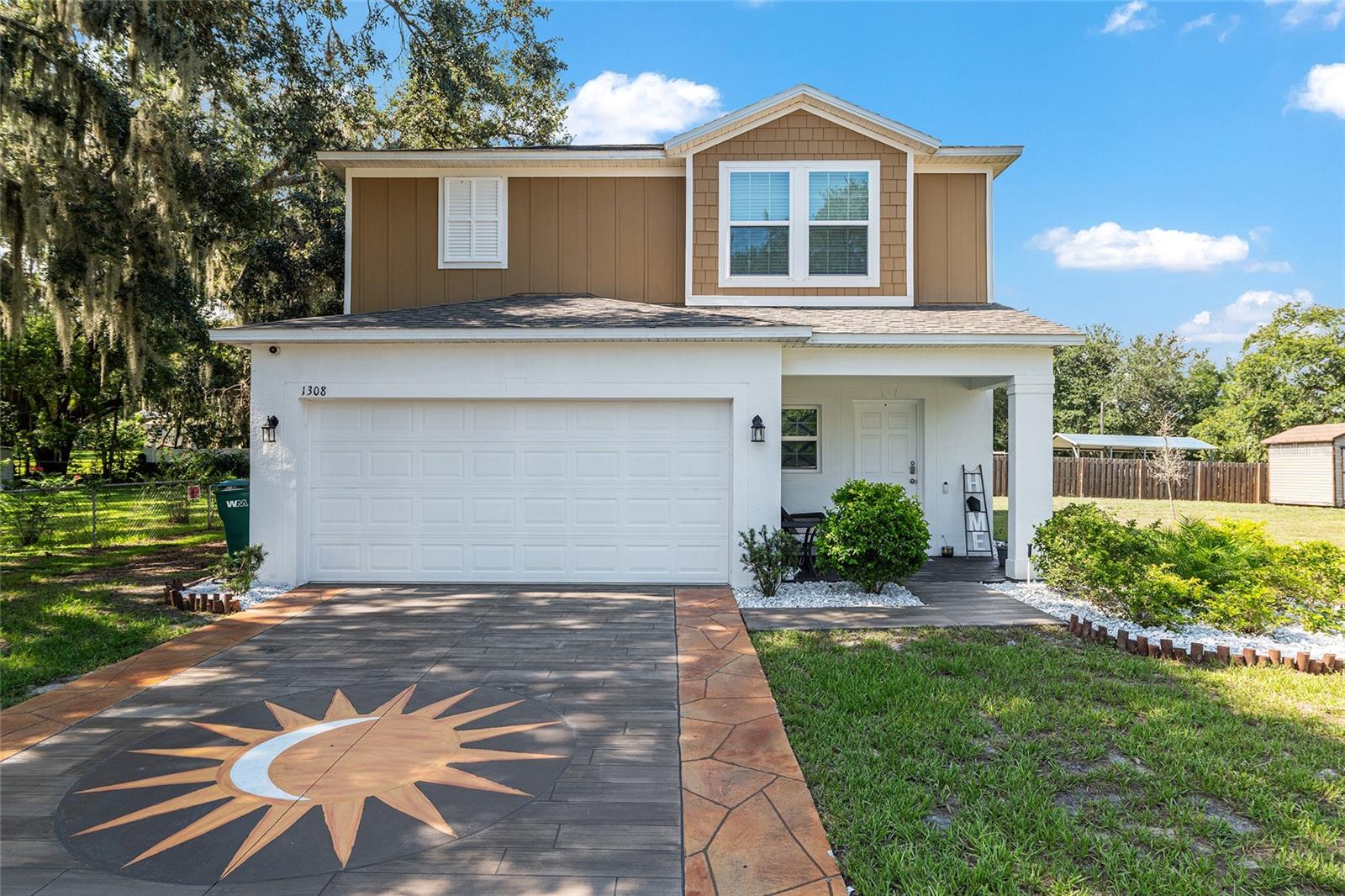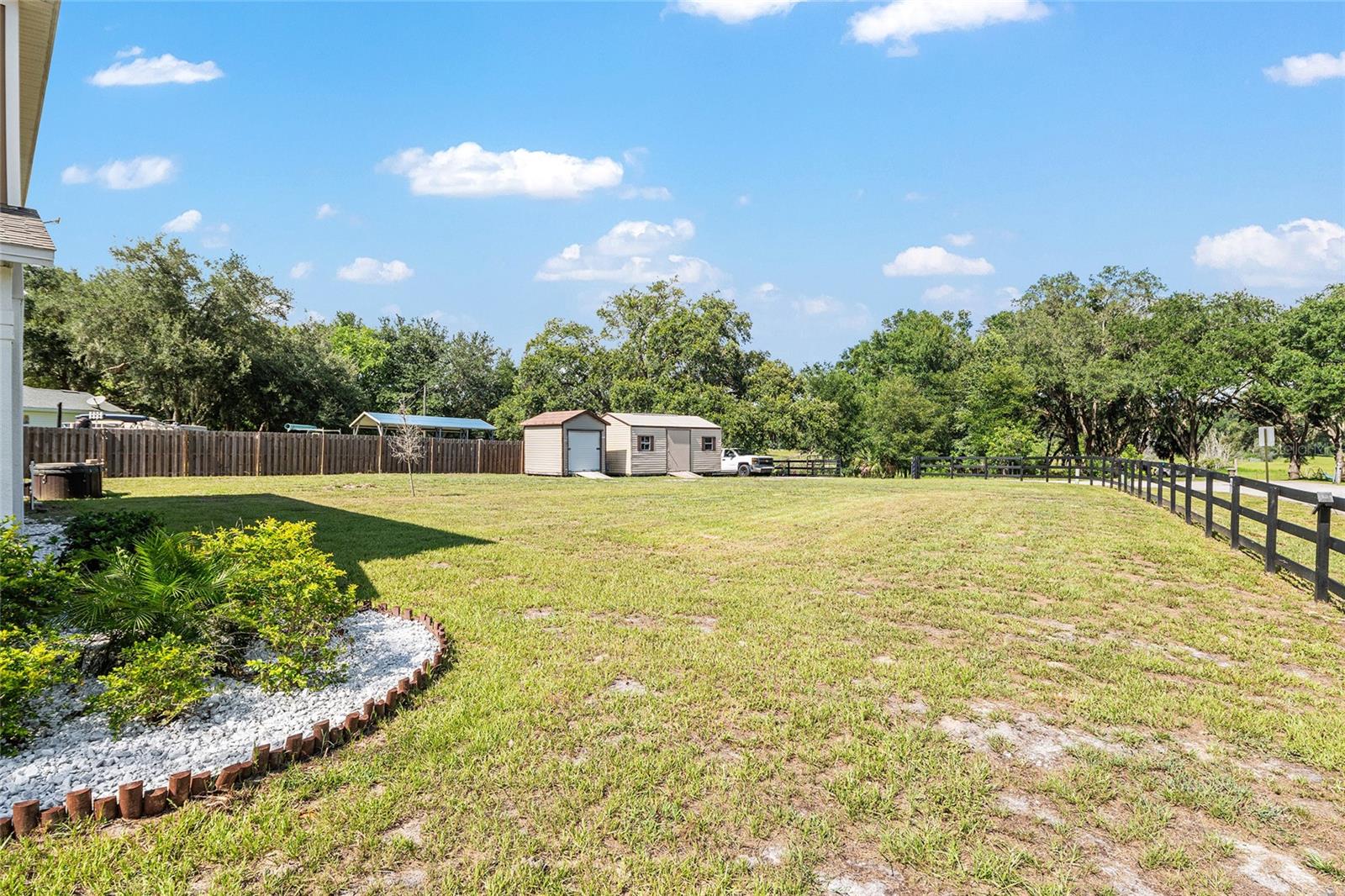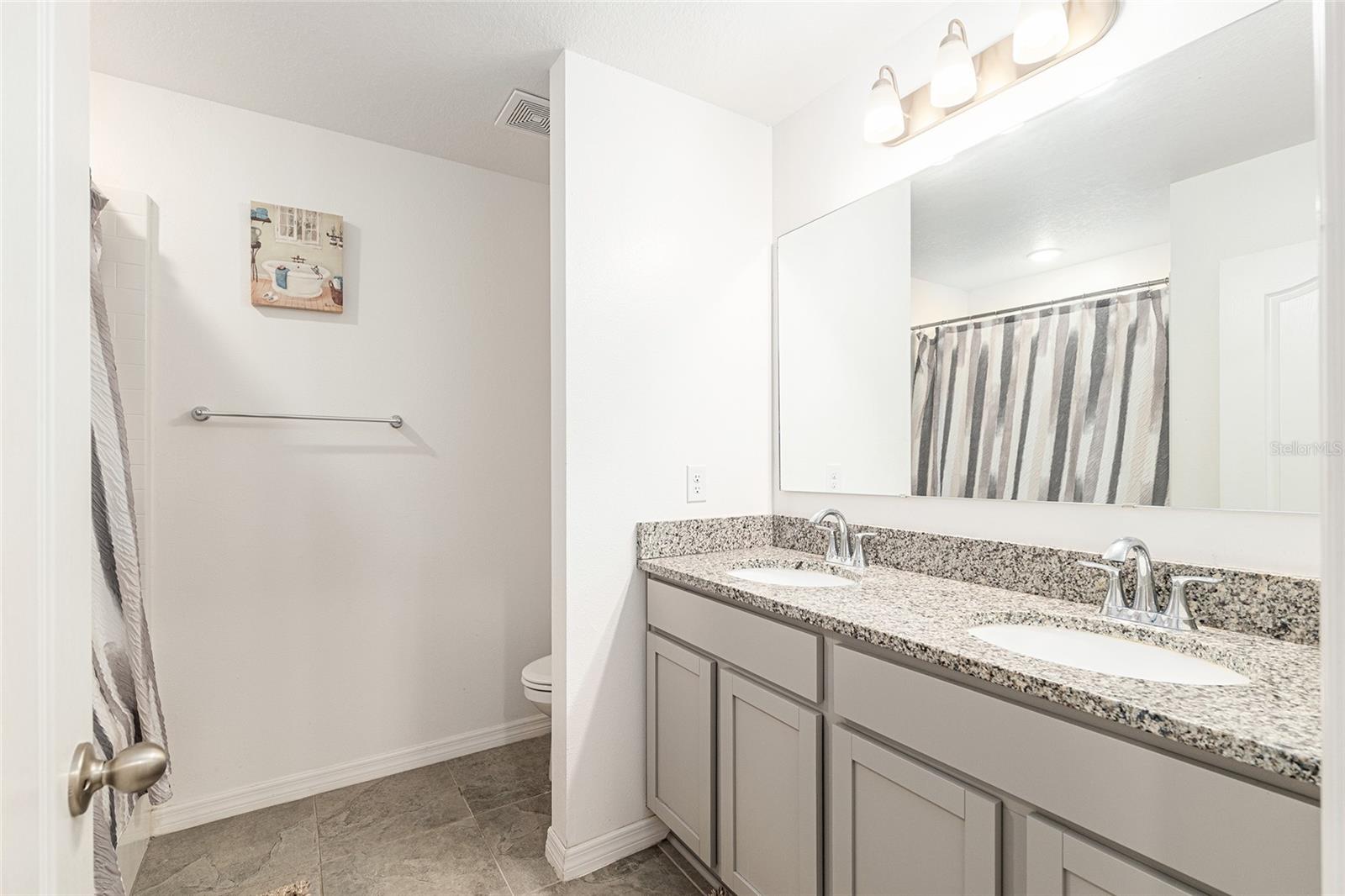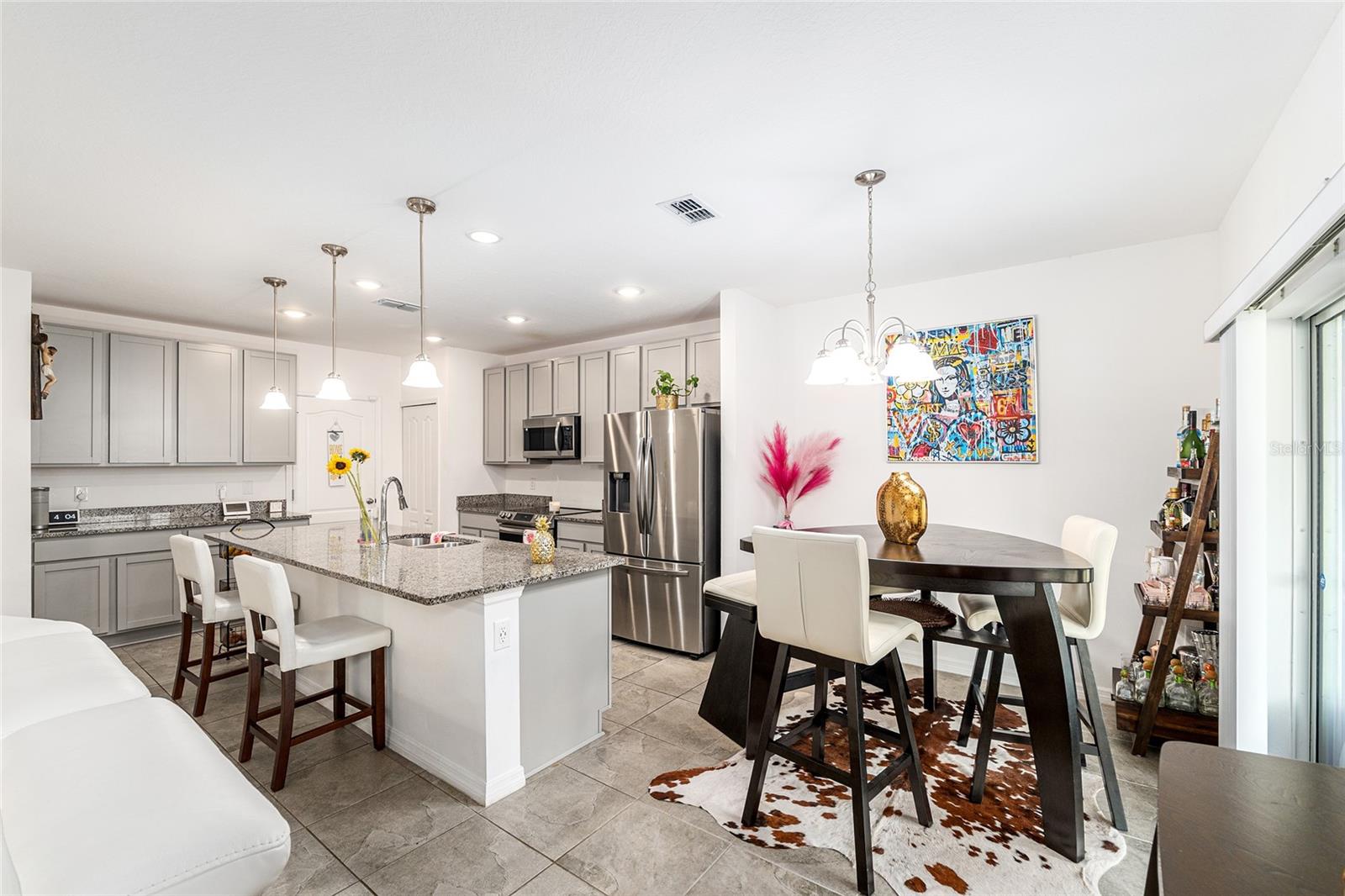 This stylish 4-bedroom, 2.5-bathroom home was built in 2023 and sits on nearly half an acre (0.44 acres), offering the perfect blend of space, comfort, and convenience. Step inside to discover an open-concept floor plan with sleek tile flooring, neutral color palette, and a spacious living area ideal for relaxing or entertaining. The kitchen is a standout, featuring gray cabinetry, granite countertops, stainless steel appliances, a closet pantry, and a large center island with seating—perfect for casual meals or gatherings. A convenient half bath is located on the main floor. Upstairs, you'll find the generous primary suite complete with a walk-in shower, dual sinks, and granite vanity. Three additional bedrooms share a guest bathroom, also featuring dual sinks and granite counters. Enjoy outdoor living on the covered back patio overlooking the expansive backyard—offering plenty of room for recreation, gardening, or even a future pool. Located close to shopping, dining, grocery stores, The Villages and medical facilities, this home offers both modern living and everyday convenience.