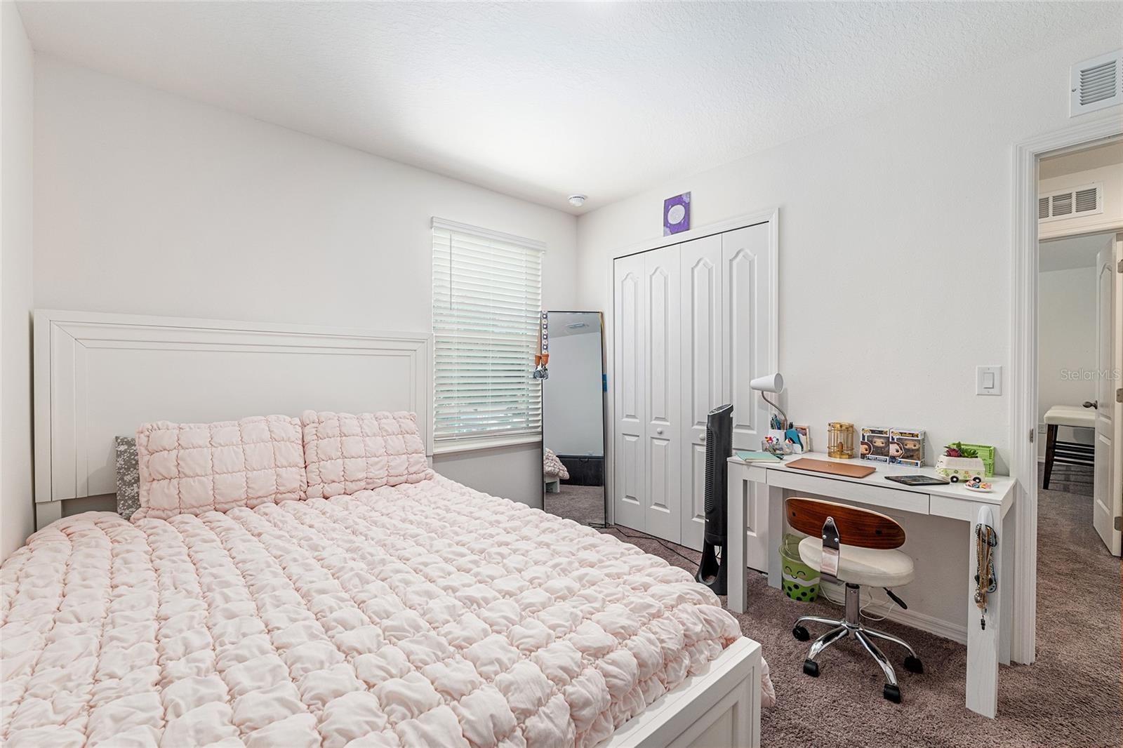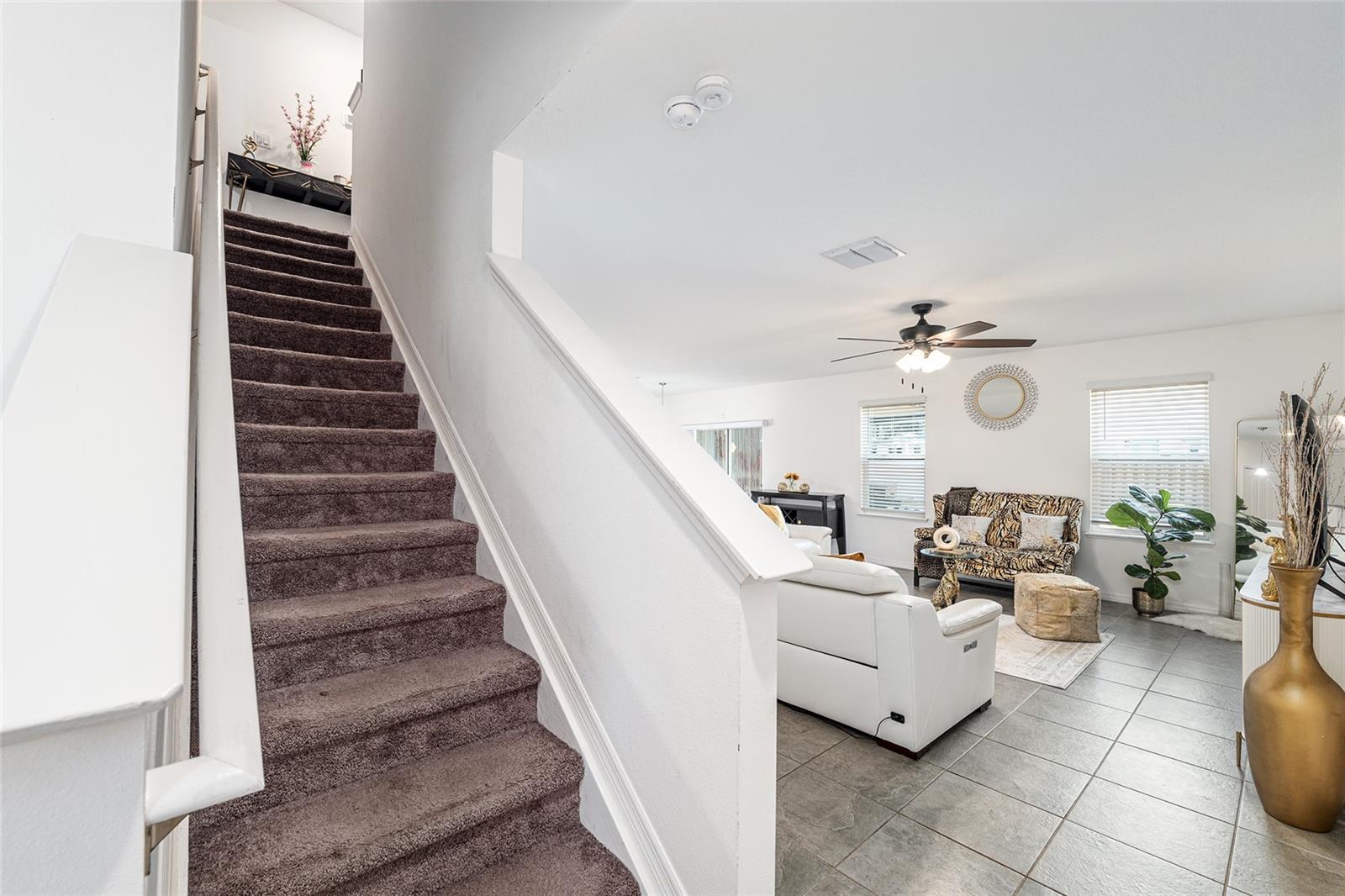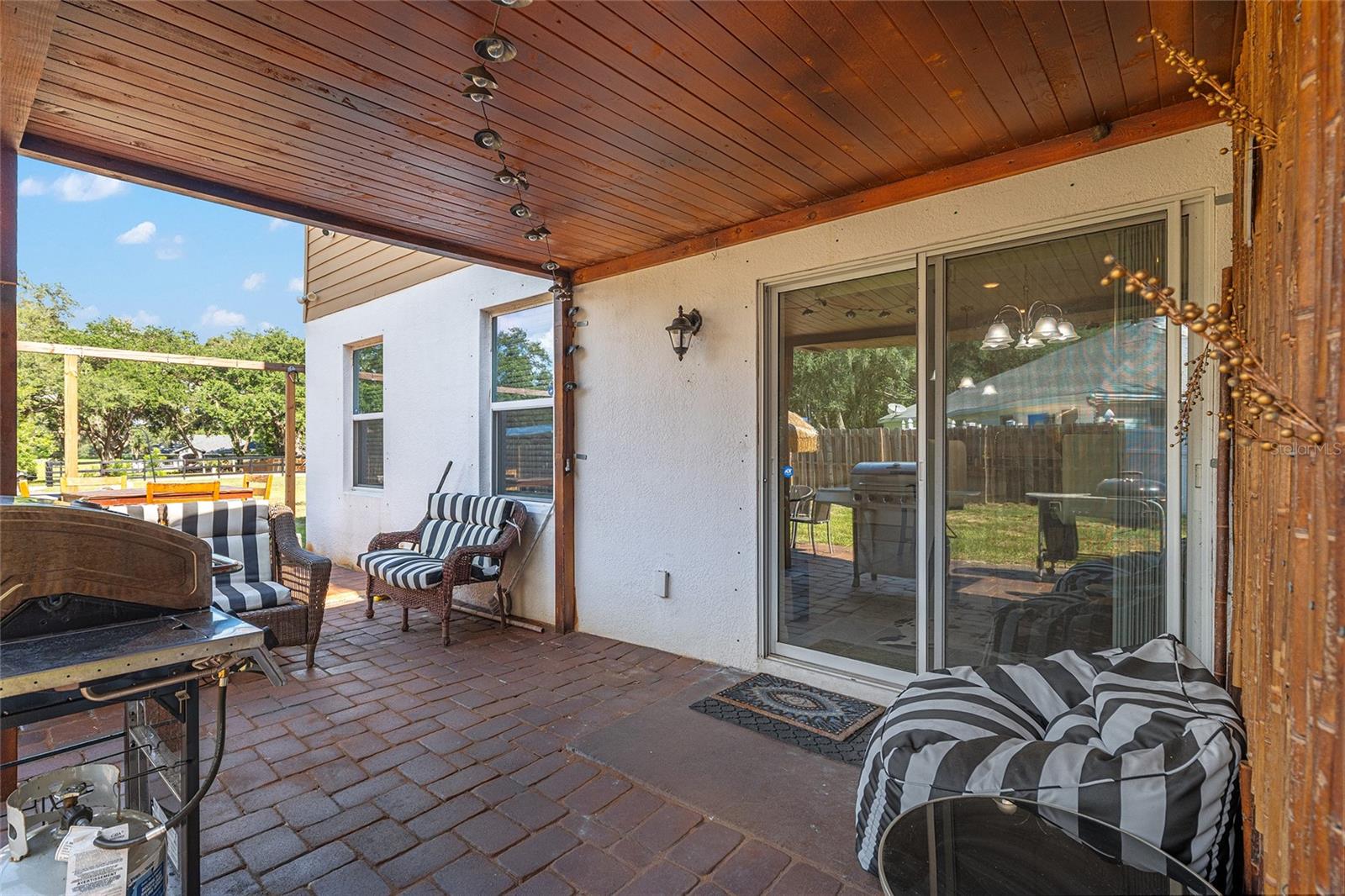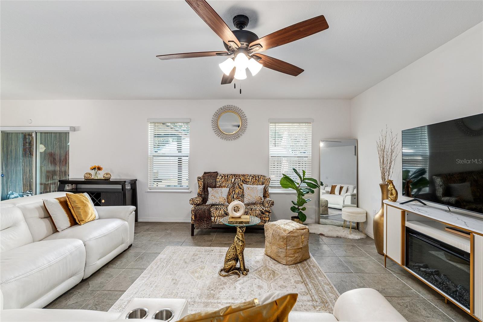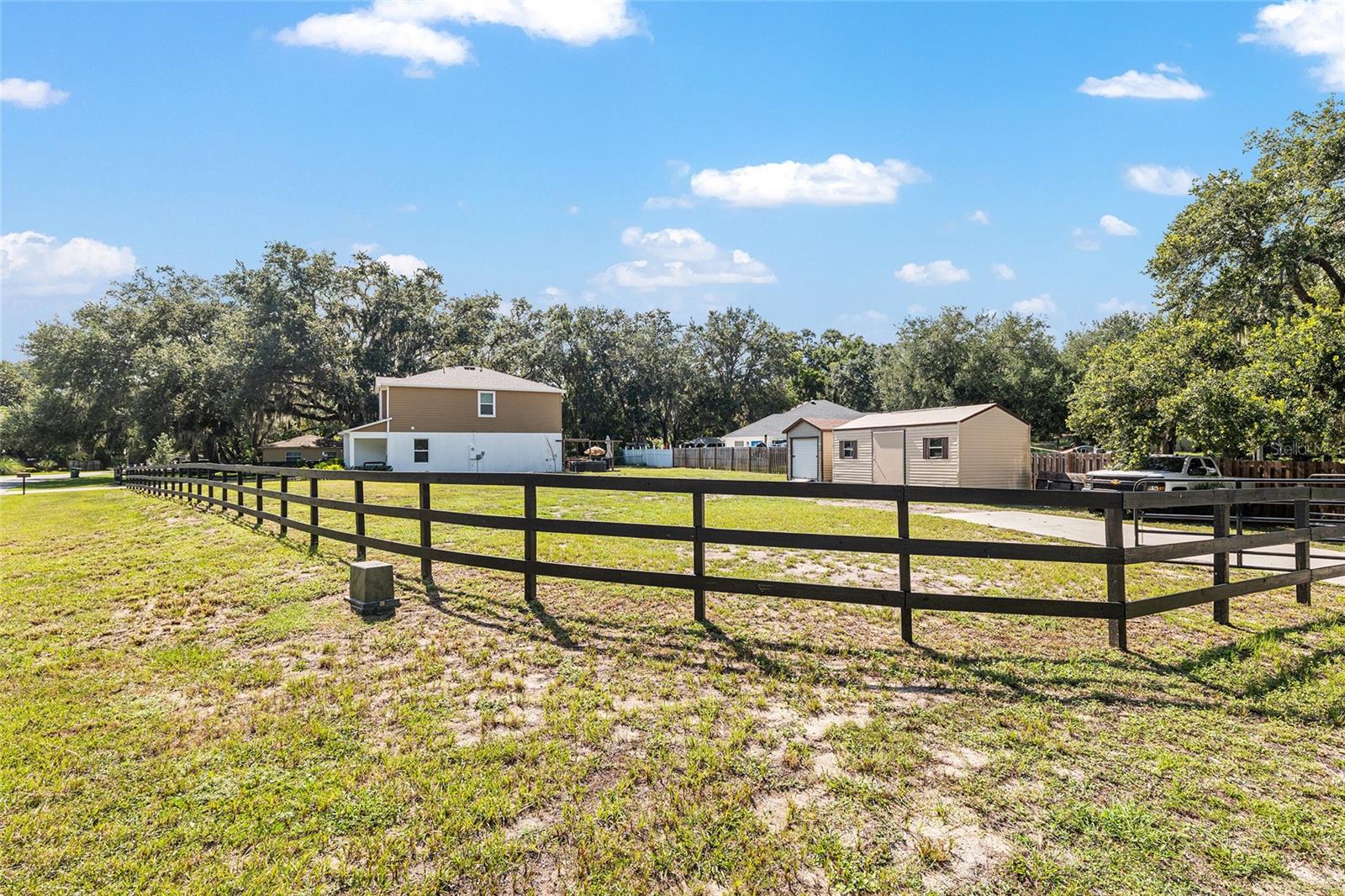 This stylish 4-bedroom, 2.5-bathroom home was built in 2023 and sits on nearly half an acre (0.44 acres), offering the perfect blend of space, comfort, and convenience. Step inside to discover an open-concept floor plan with sleek tile flooring, neutral color palette, and a spacious living area ideal for relaxing or entertaining. The kitchen is a standout, featuring gray cabinetry, granite countertops, stainless steel appliances, a closet pantry, and a large center island with seating—perfect for casual meals or gatherings. A convenient half bath is located on the main floor. Upstairs, you'll find the generous primary suite complete with a walk-in shower, dual sinks, and granite vanity. Three additional bedrooms share a guest bathroom, also featuring dual sinks and granite counters. Enjoy outdoor living on the covered back patio overlooking the expansive backyard—offering plenty of room for recreation, gardening, or even a future pool. Located close to shopping, dining, grocery stores, The Villages and medical facilities, this home offers both modern living and everyday convenience.