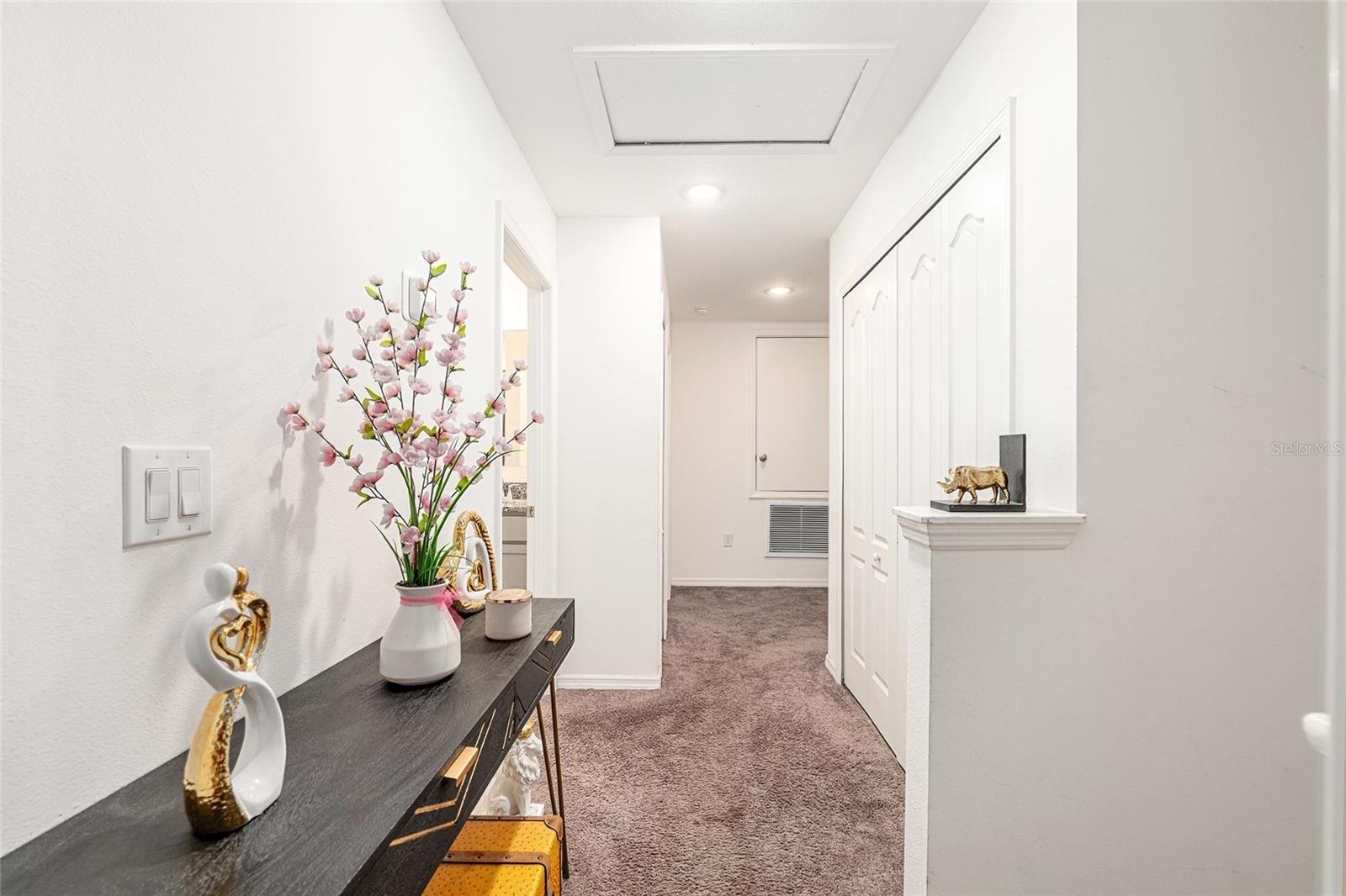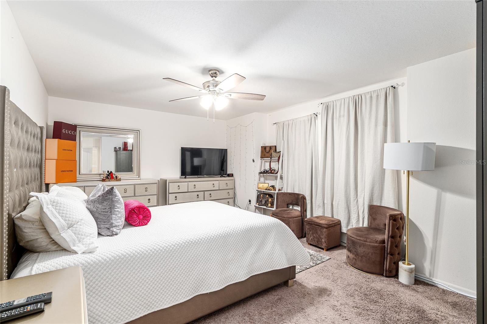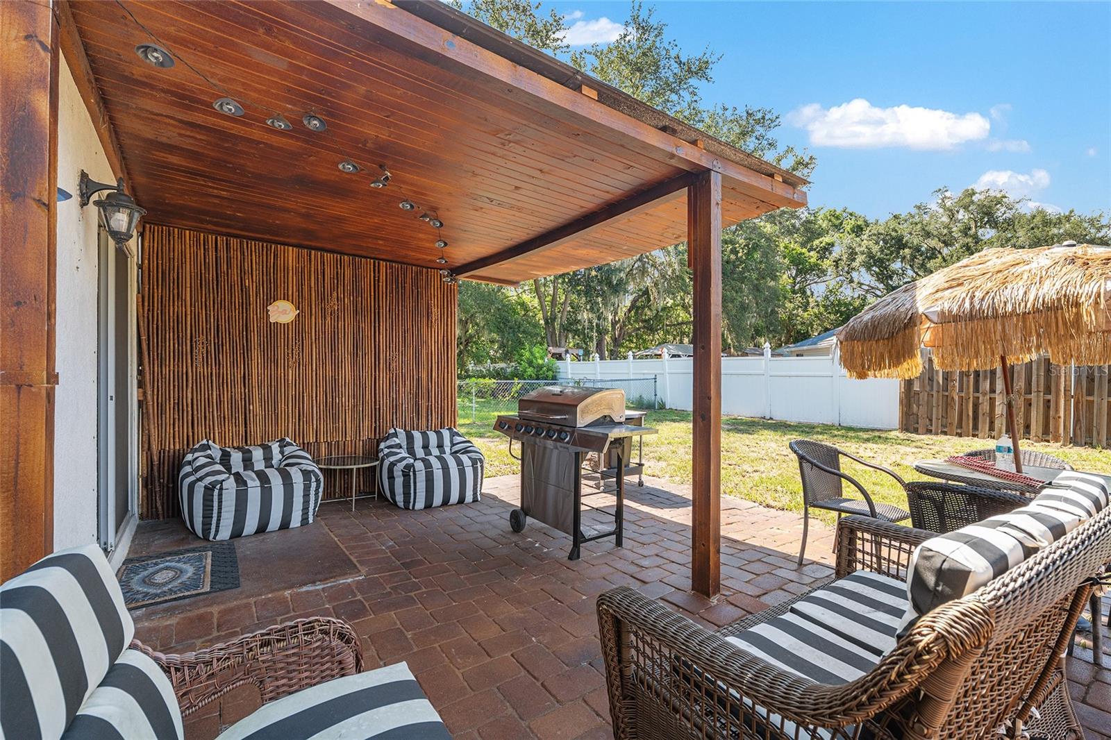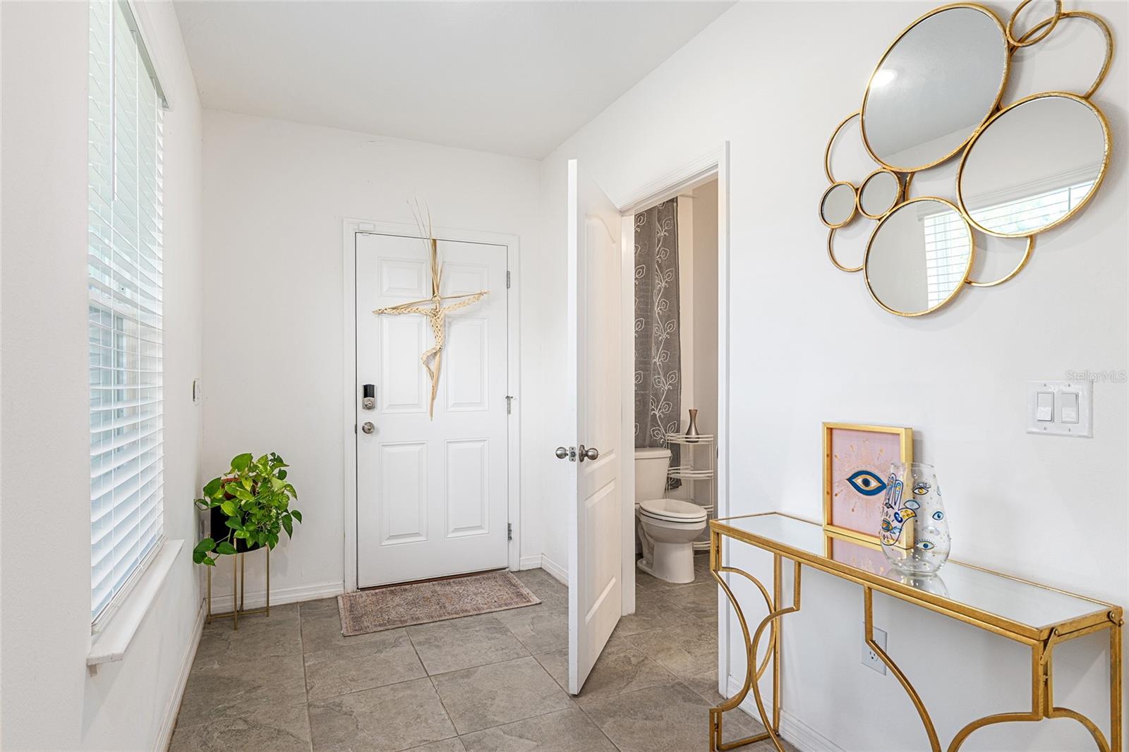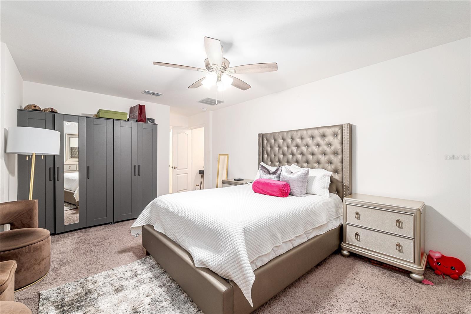 This stylish 4-bedroom, 2.5-bathroom home was built in 2023 and sits on nearly half an acre (0.44 acres), offering the perfect blend of space, comfort, and convenience. Step inside to discover an open-concept floor plan with sleek tile flooring, neutral color palette, and a spacious living area ideal for relaxing or entertaining. The kitchen is a standout, featuring gray cabinetry, granite countertops, stainless steel appliances, a closet pantry, and a large center island with seating—perfect for casual meals or gatherings. A convenient half bath is located on the main floor. Upstairs, you'll find the generous primary suite complete with a walk-in shower, dual sinks, and granite vanity. Three additional bedrooms share a guest bathroom, also featuring dual sinks and granite counters. Enjoy outdoor living on the covered back patio overlooking the expansive backyard—offering plenty of room for recreation, gardening, or even a future pool. Located close to shopping, dining, grocery stores, The Villages and medical facilities, this home offers both modern living and everyday convenience.