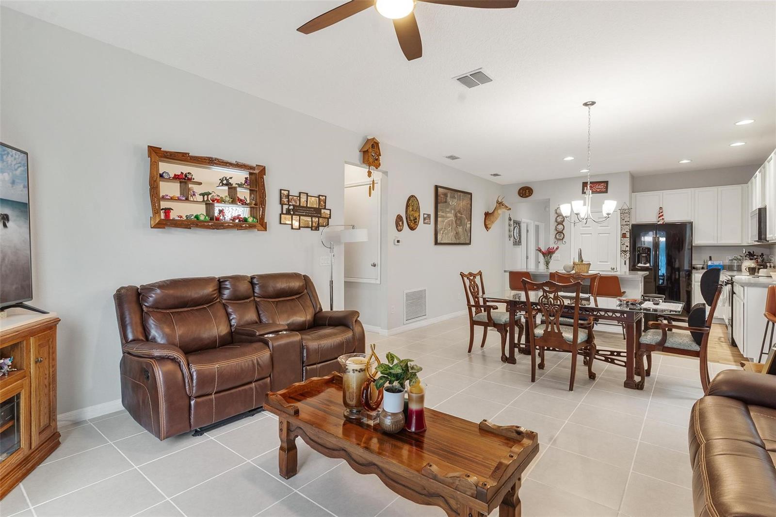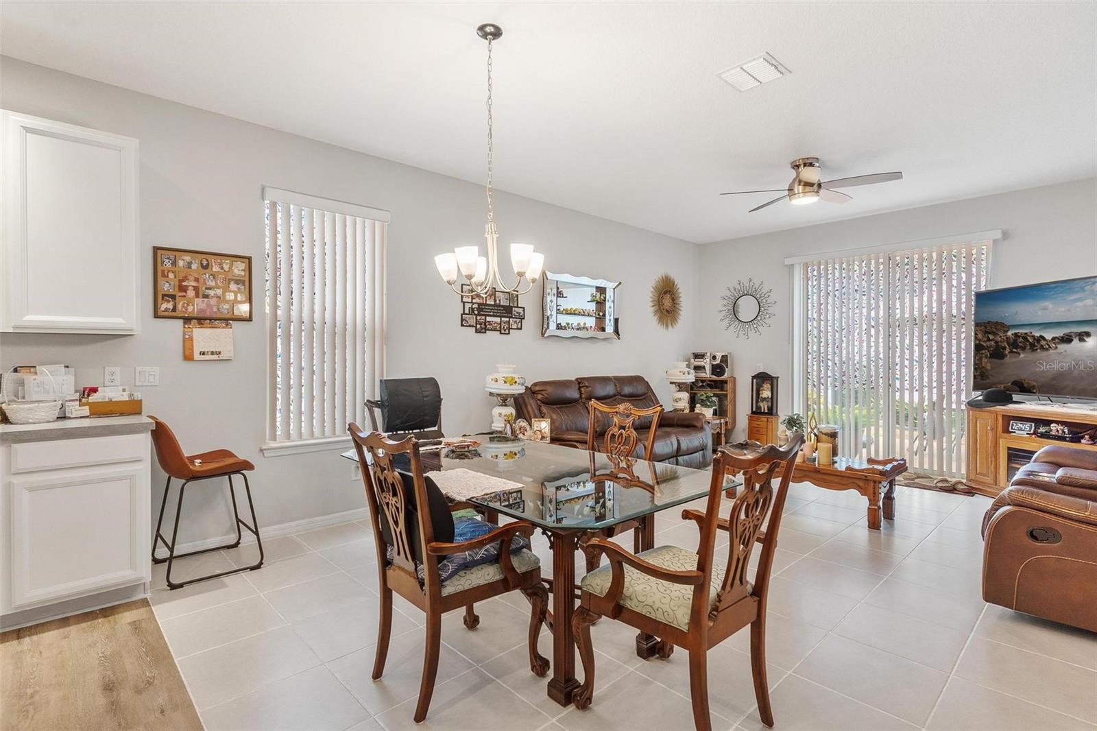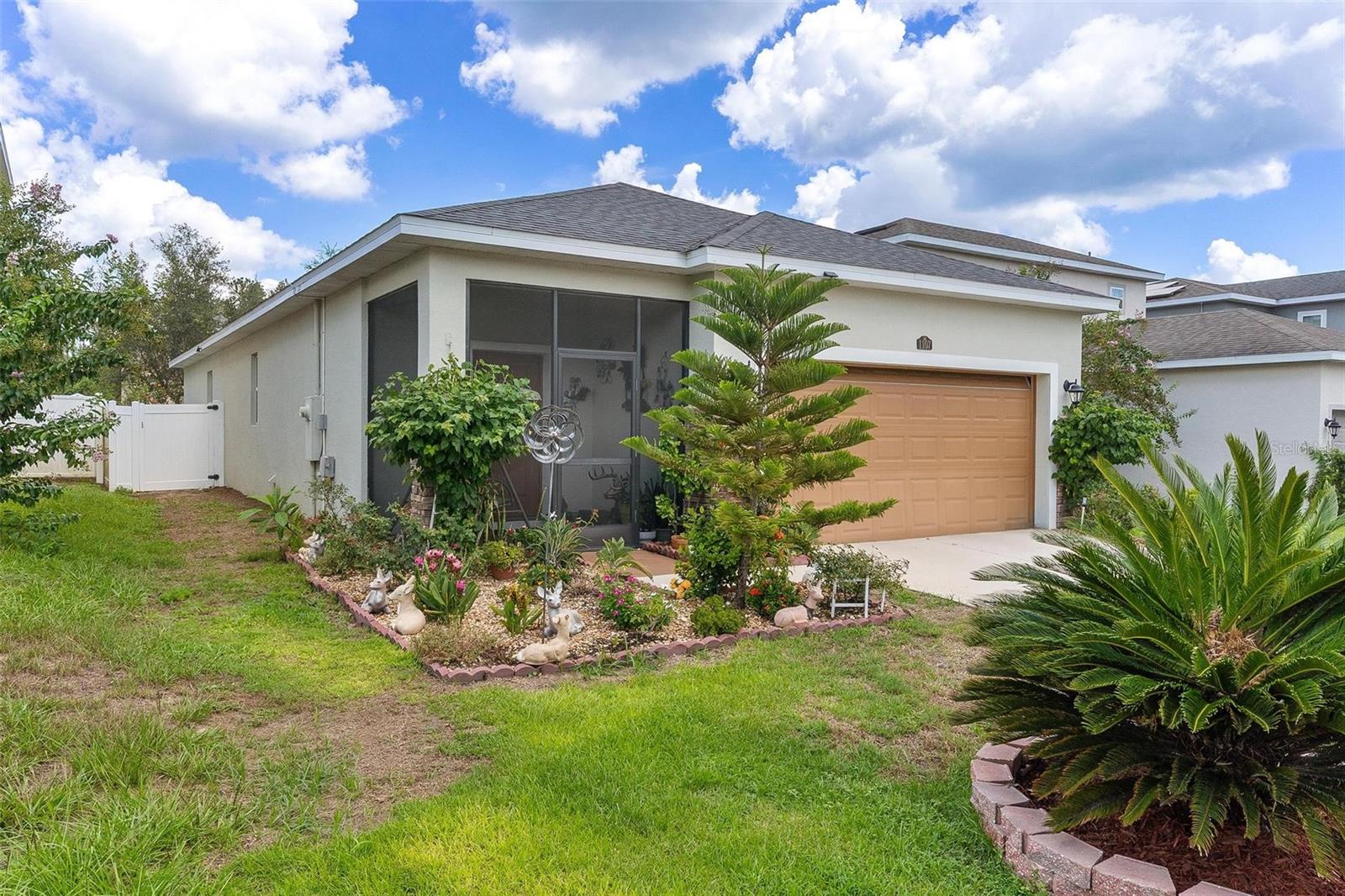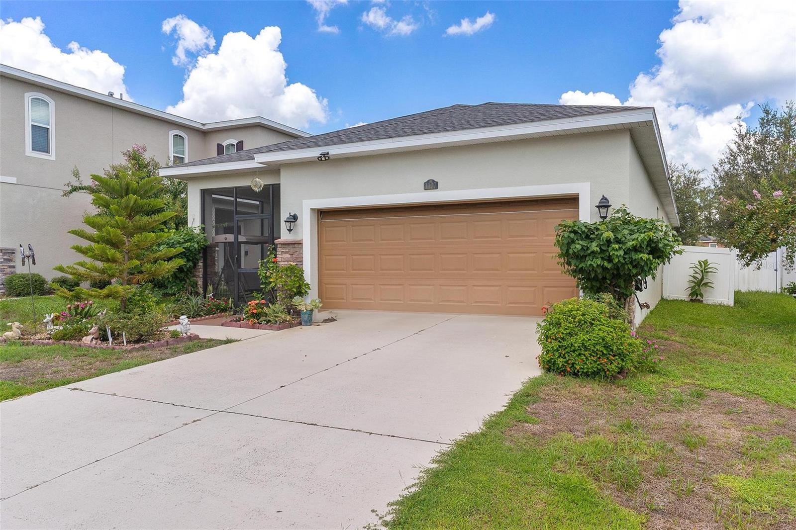 Welcome to Mirror Lake Village! This beautiful, like-new home is centrally located in the heart of Fruitland Park and offers an open floor plan with soaring ceilings. The kitchen features a spacious island with an eat-in bar, plenty of cabinet space, a closet pantry, and a sleek glass cooktop—all overlooking the living area with sliding doors leading to the backyard patio. The primary suite includes a large walk-in closet and an en suite bath with double vanities, a tiled walk-in shower, and a private water closet. Additional highlights include an inside laundry room, a versatile 12x9 tiled foyer that can double as a home office or study area, and a two-car garage with electric opener. Outside, you’ll find a nicely landscaped yard, perfect for enjoying Florida living.